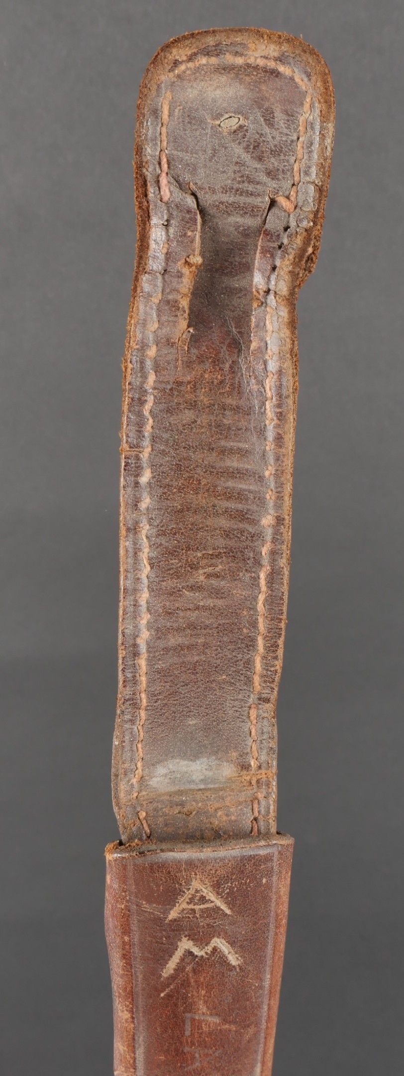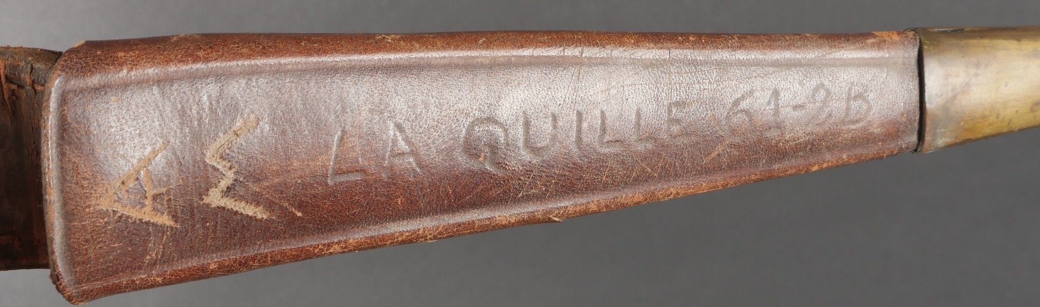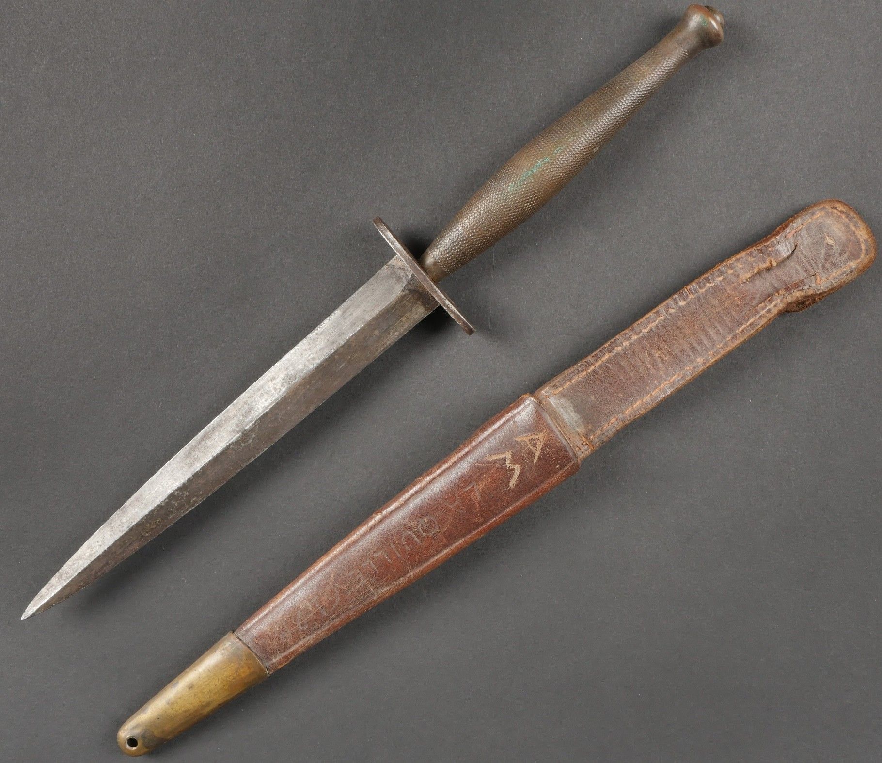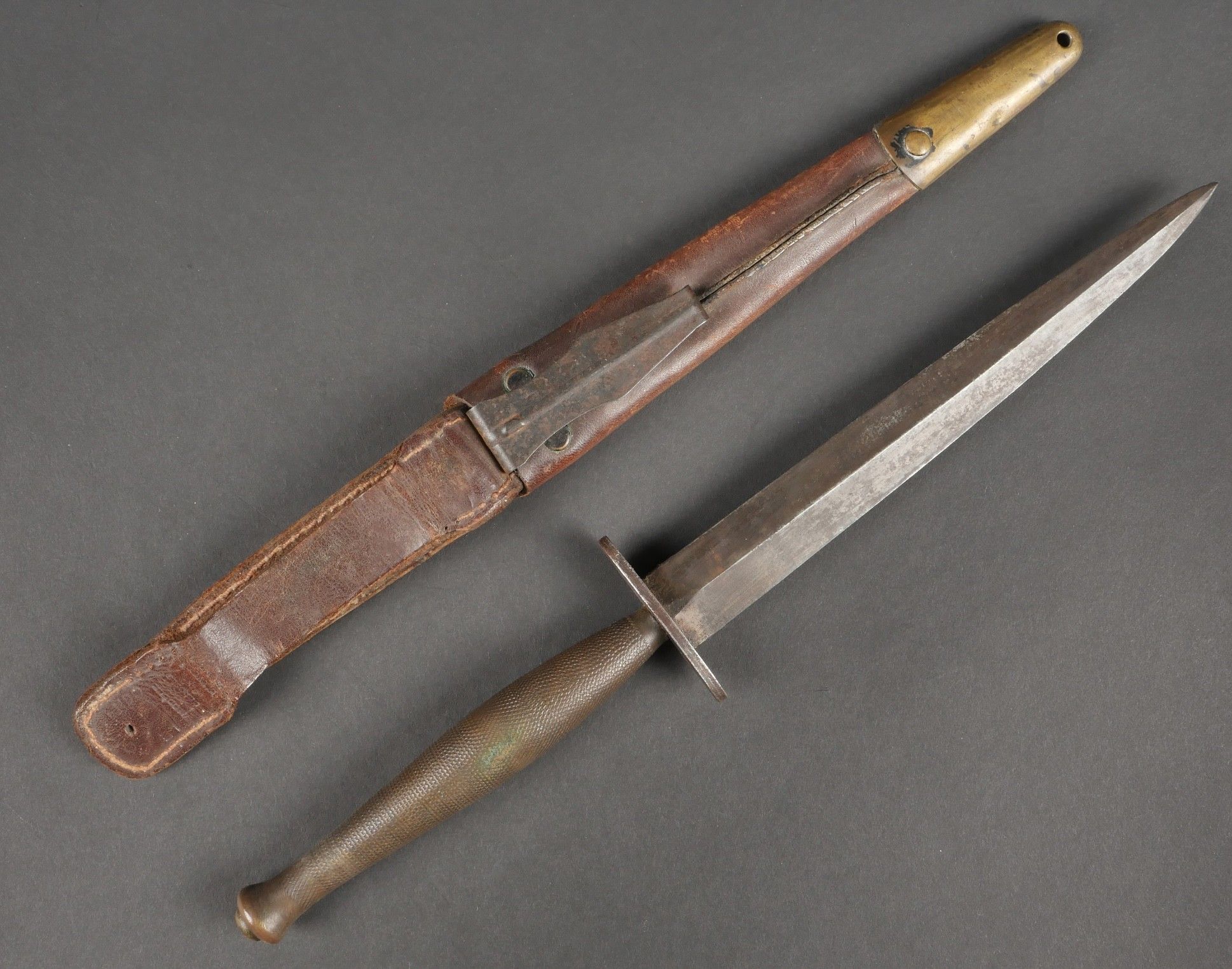French made dagger, copied from the British SAS dagger. Brass checkered handle, iron hilt, blade in its original length of 18.2cm. Le Commando type scabbard, entirely made of leather, original spring still attached, brass tip pierced to receive the leather lace. The leather tab to hold the dagger was removed at the time. Marked on the reverse side Le commando Modèle Déposé Breveté SGDG The soldier embossed the front of the scabbard with his initials AM and the words La Quille 612B. Frenchmade dagger copied from the British SAS pattern. Brass checkered grip steel guard blade full original length 18.2 cm. Scabbard of Le Commando type entirely of leather with intact spring brass tip pierced for thong. Leather retaining strap removed period. Reverse marked Le Commando Modèle Déposé Breveté SGDG. The soldier engraved his initials "AM" and the phrase "La Quille 612B" on the front.