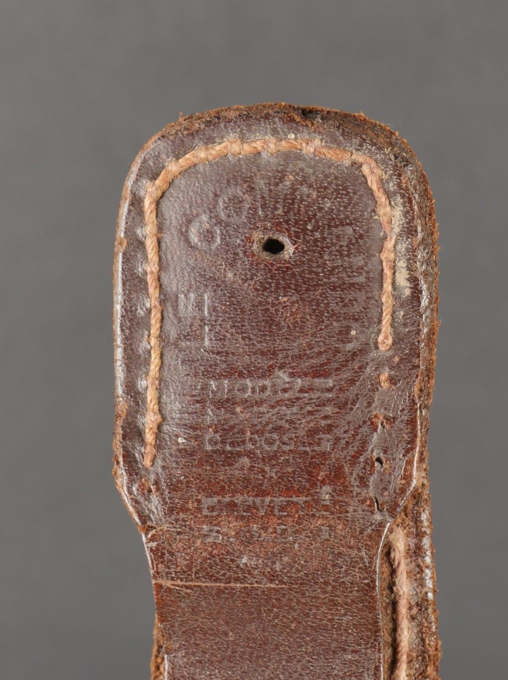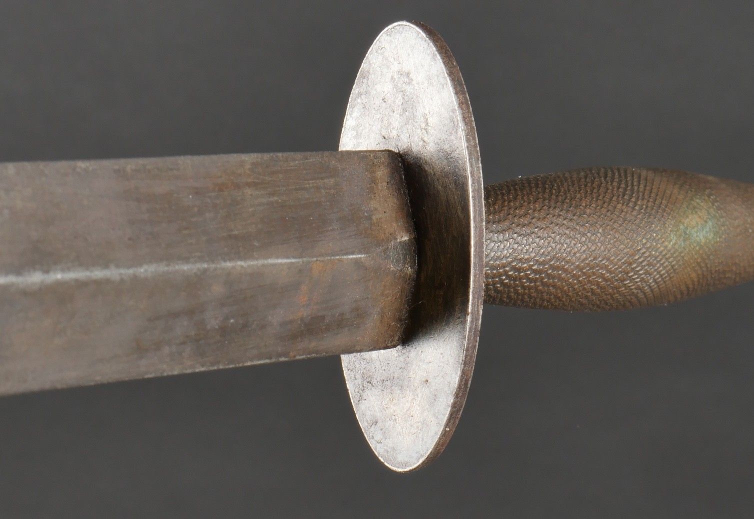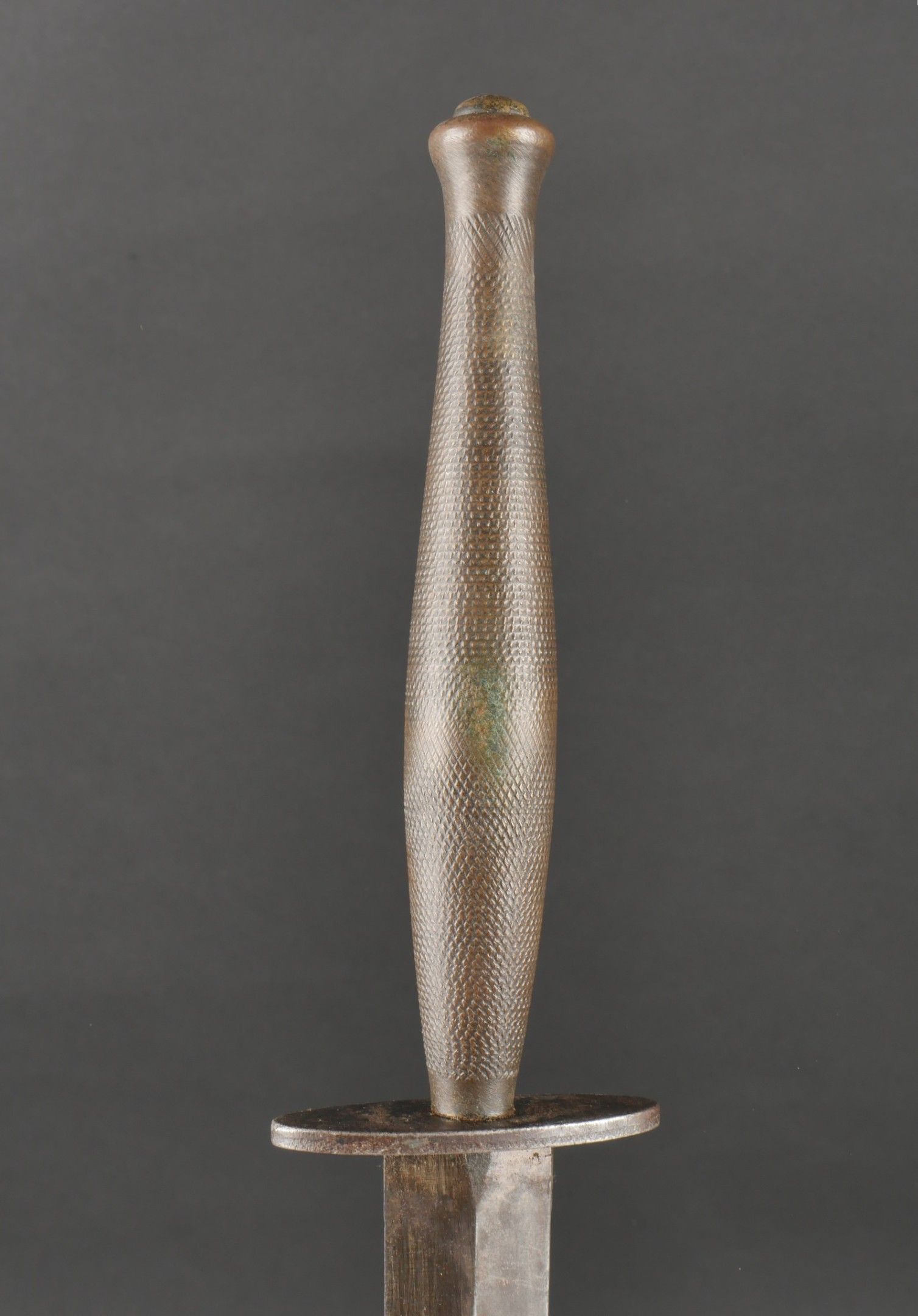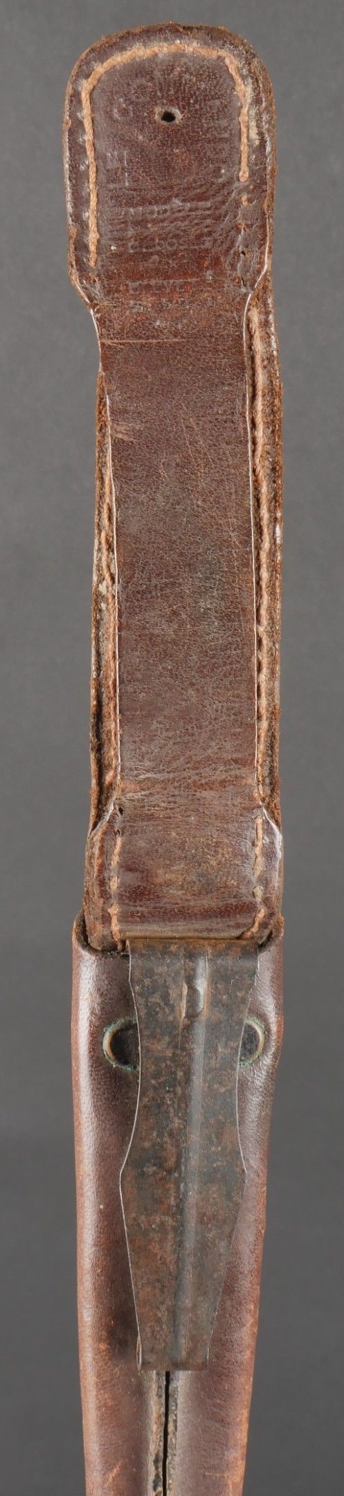 French made dagger, copied from the British SAS dagger. Brass checkered handle, iron hilt, blade in its original length of 18.2cm. Le Commando type scabbard, entirely made of leather, original spring still attached, brass tip pierced to receive the leather lace. The leather tab to hold the dagger was removed at the time. Marked on the reverse side Le commando Modèle Déposé Breveté SGDG The soldier embossed the front of the scabbard with his initials AM and the words La Quille 612B. Frenchmade dagger copied from the British SAS pattern. Brass checkered grip steel guard blade full original length 18.2 cm. Scabbard of Le Commando type entirely of leather with intact spring brass tip pierced for thong. Leather retaining strap removed period. Reverse marked Le Commando Modèle Déposé Breveté SGDG. The soldier engraved his initials "AM" and the phrase "La Quille 612B" on the front.