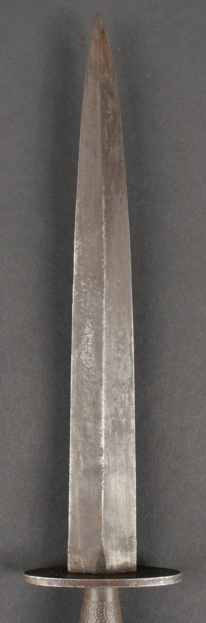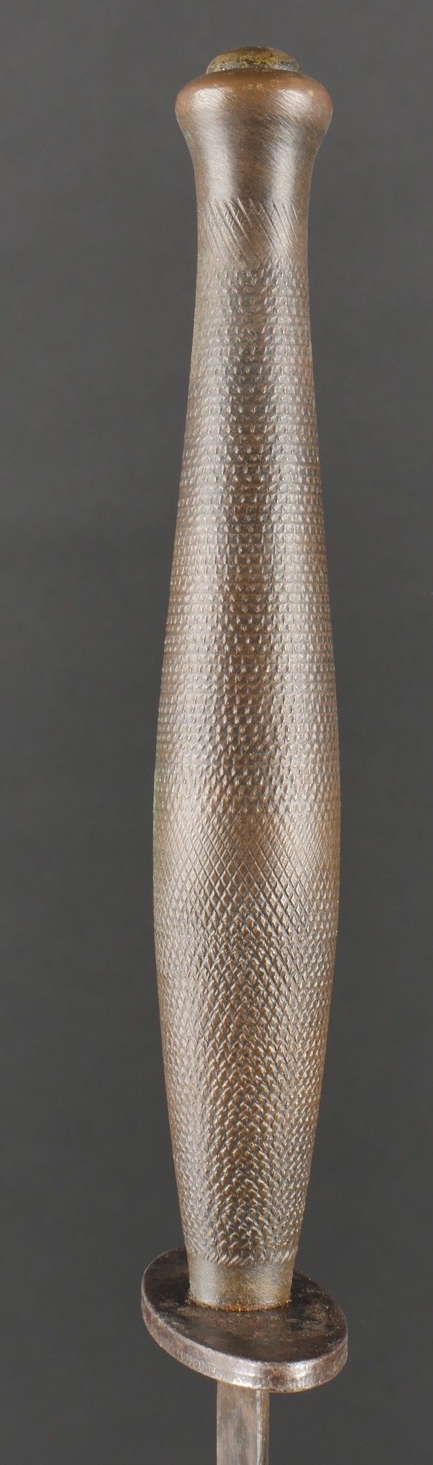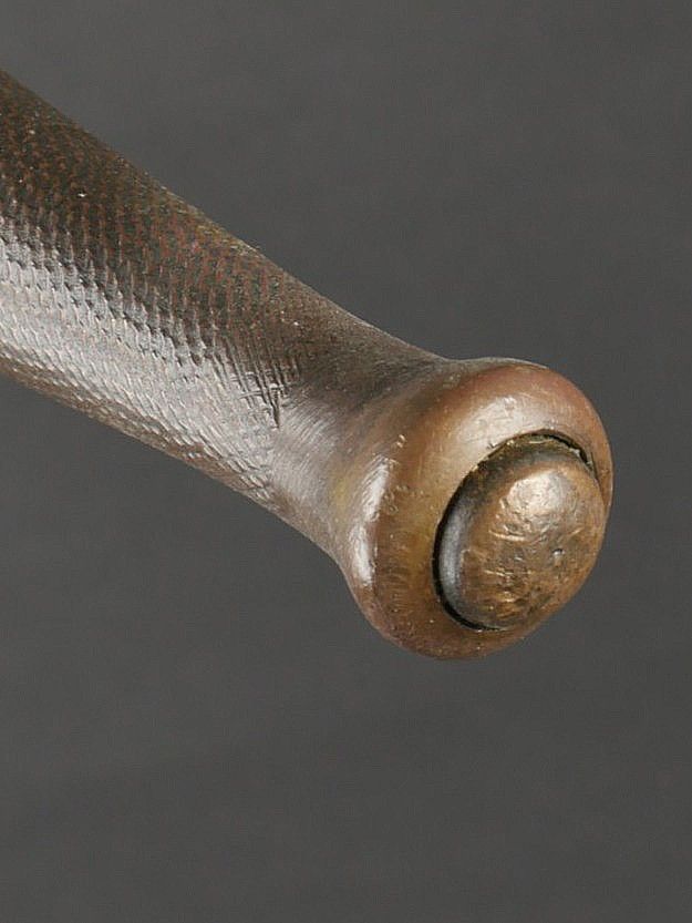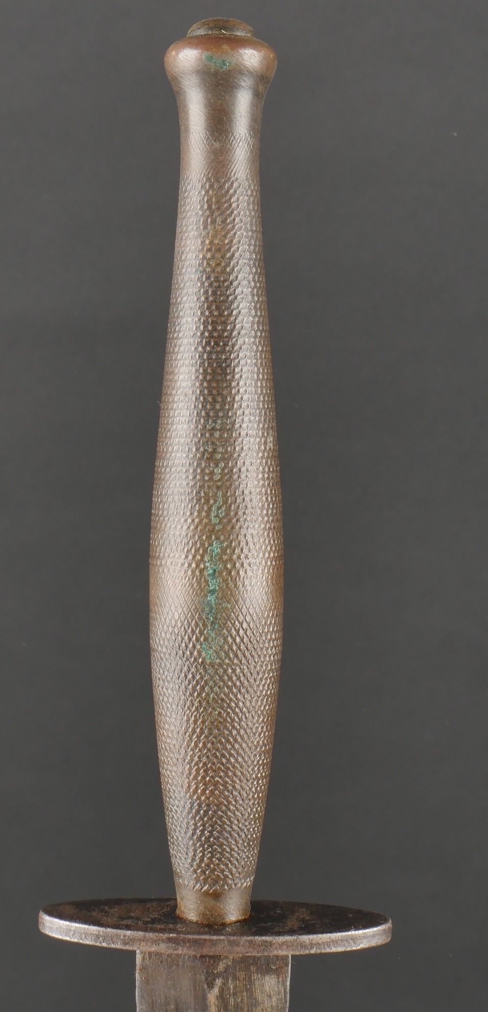 French made dagger, copied from the British SAS dagger. Brass checkered handle, iron hilt, blade in its original length of 18.2cm. Le Commando type scabbard, entirely made of leather, original spring still attached, brass tip pierced to receive the leather lace. The leather tab to hold the dagger was removed at the time. Marked on the reverse side Le commando Modèle Déposé Breveté SGDG The soldier embossed the front of the scabbard with his initials AM and the words La Quille 612B. Frenchmade dagger copied from the British SAS pattern. Brass checkered grip steel guard blade full original length 18.2 cm. Scabbard of Le Commando type entirely of leather with intact spring brass tip pierced for thong. Leather retaining strap removed period. Reverse marked Le Commando Modèle Déposé Breveté SGDG. The soldier engraved his initials "AM" and the phrase "La Quille 612B" on the front.