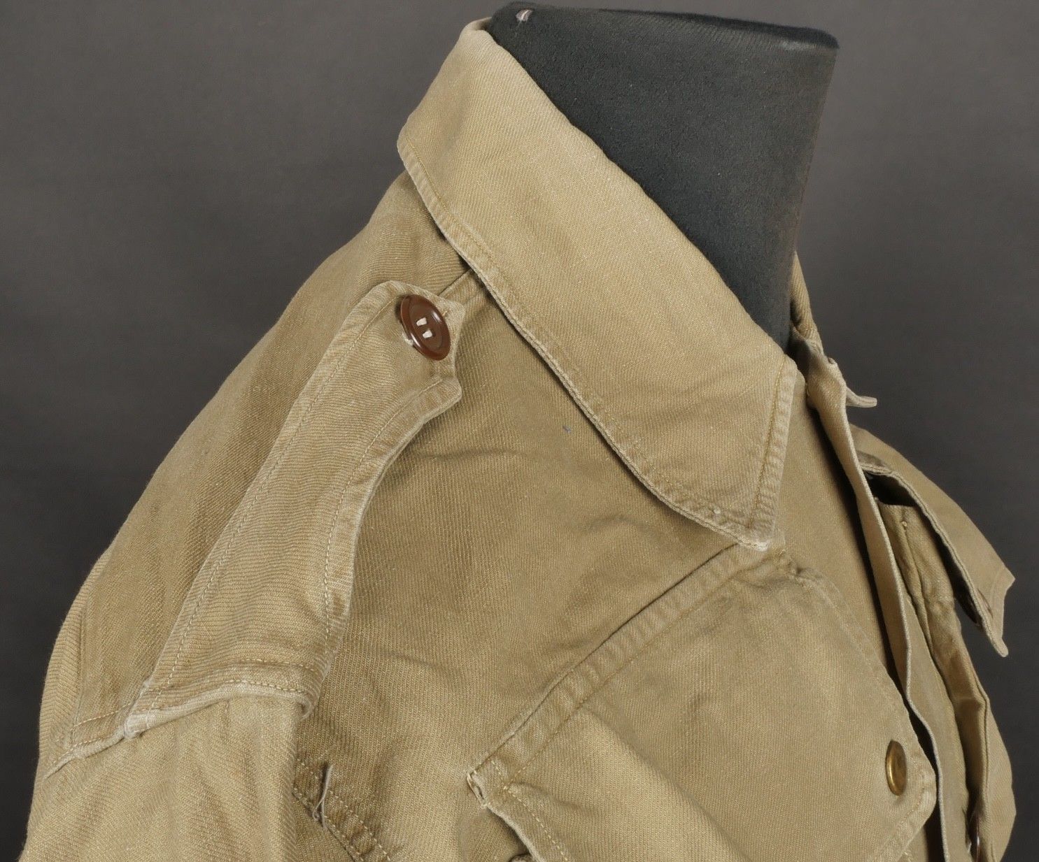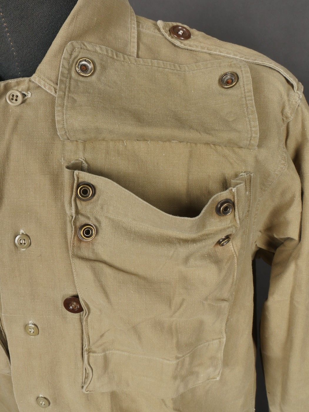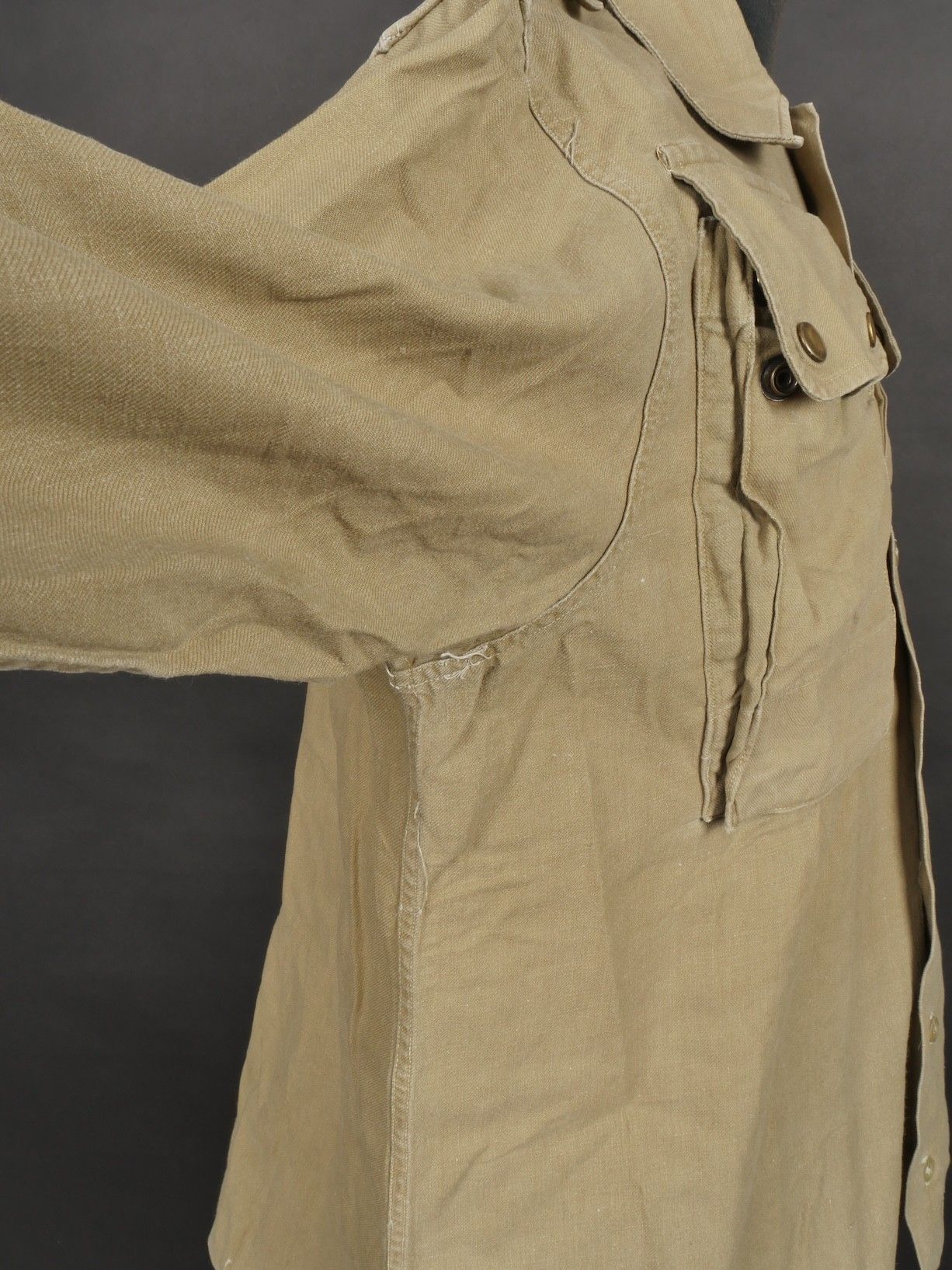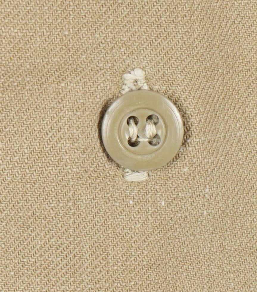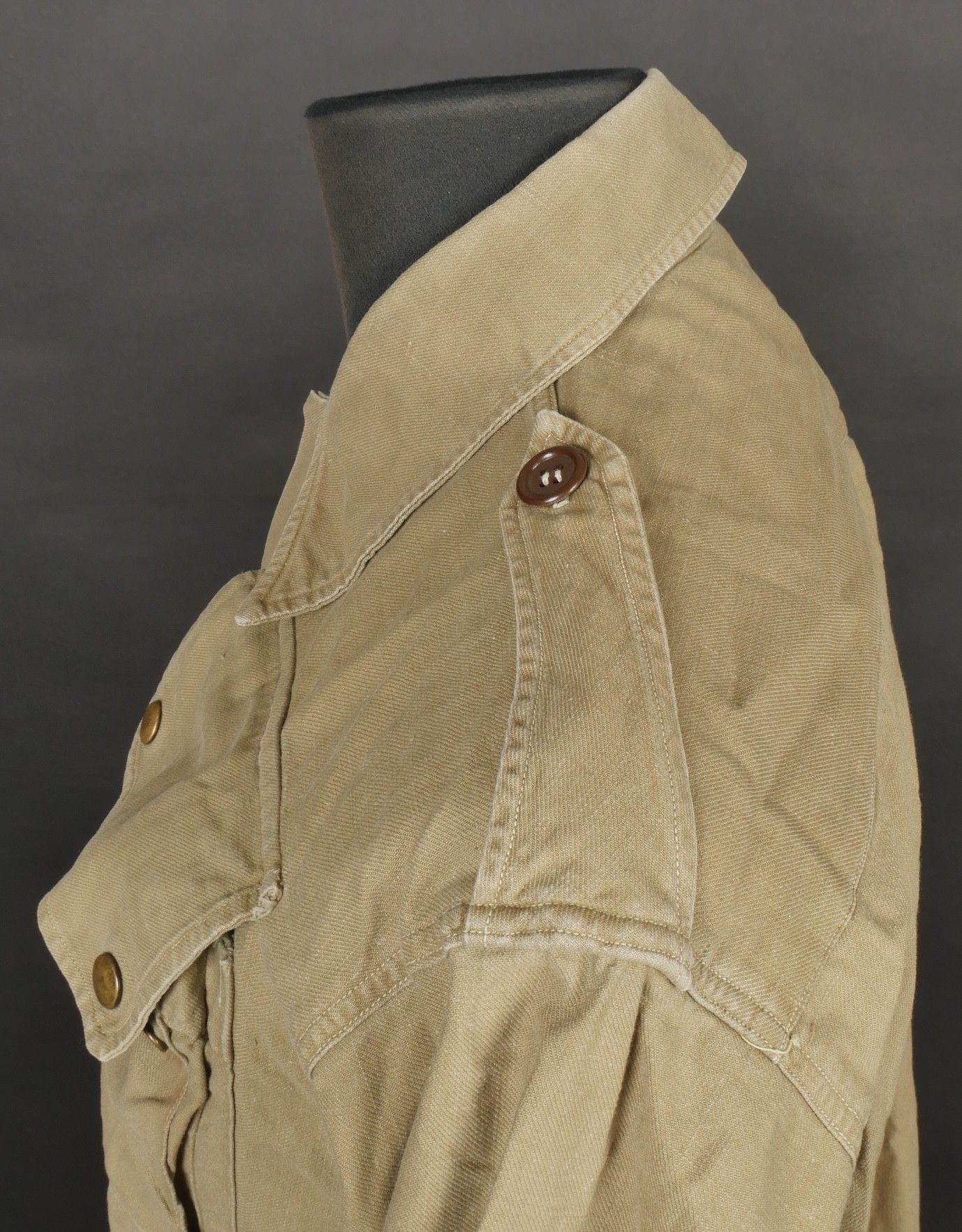 Jump shirt. Made of khaki canvas, with two breast pockets that close with press studs. The paratrooper has sewn a button next to the left breast pocket, which was designed to hold a rank. This shirt belonged to Warrant Officer Pichard. Jump shirt. Khaki cotton shirt with two chest pockets closed by snaps additional button sewn beside left pocket to attach rank. Belonged to Adjutant Pichard.