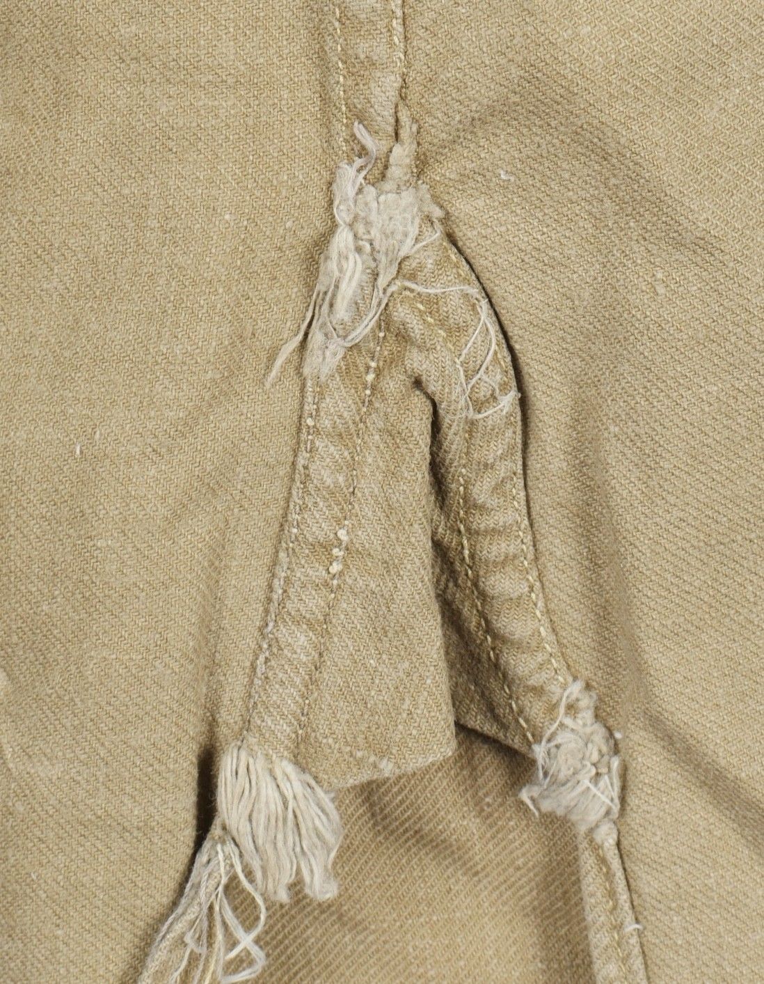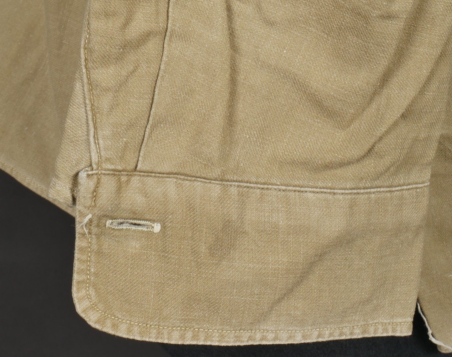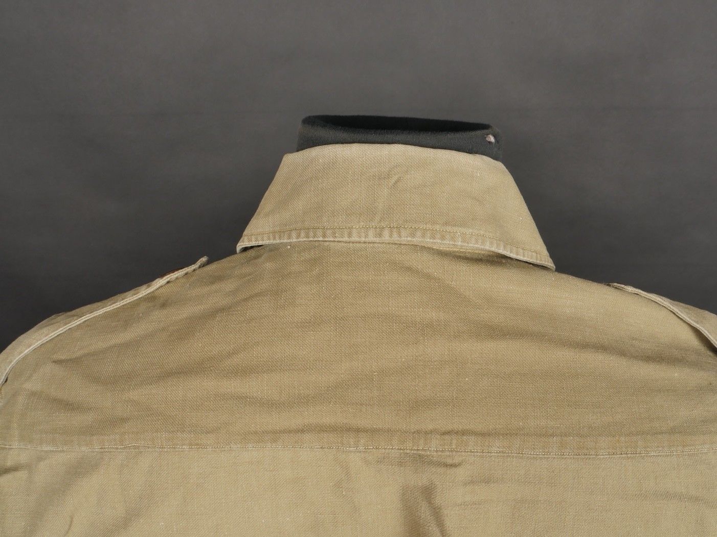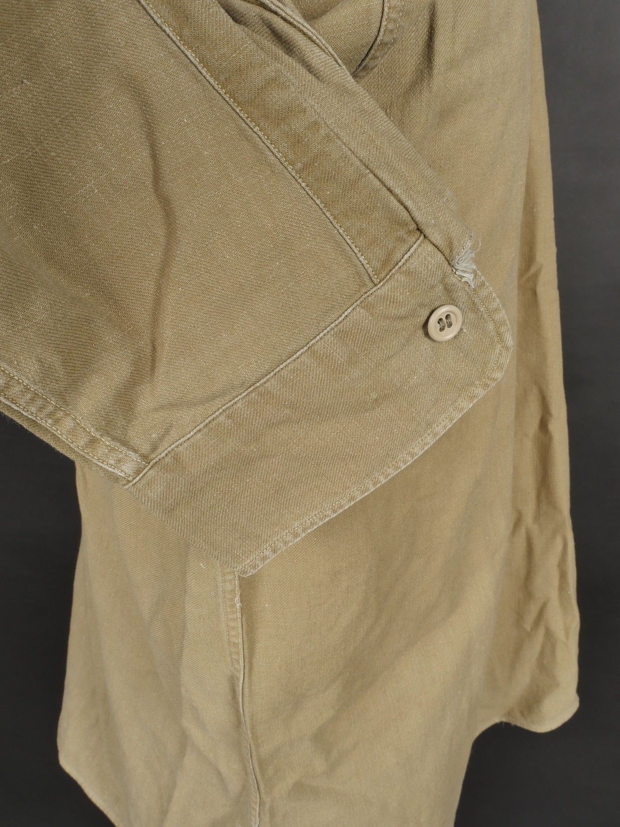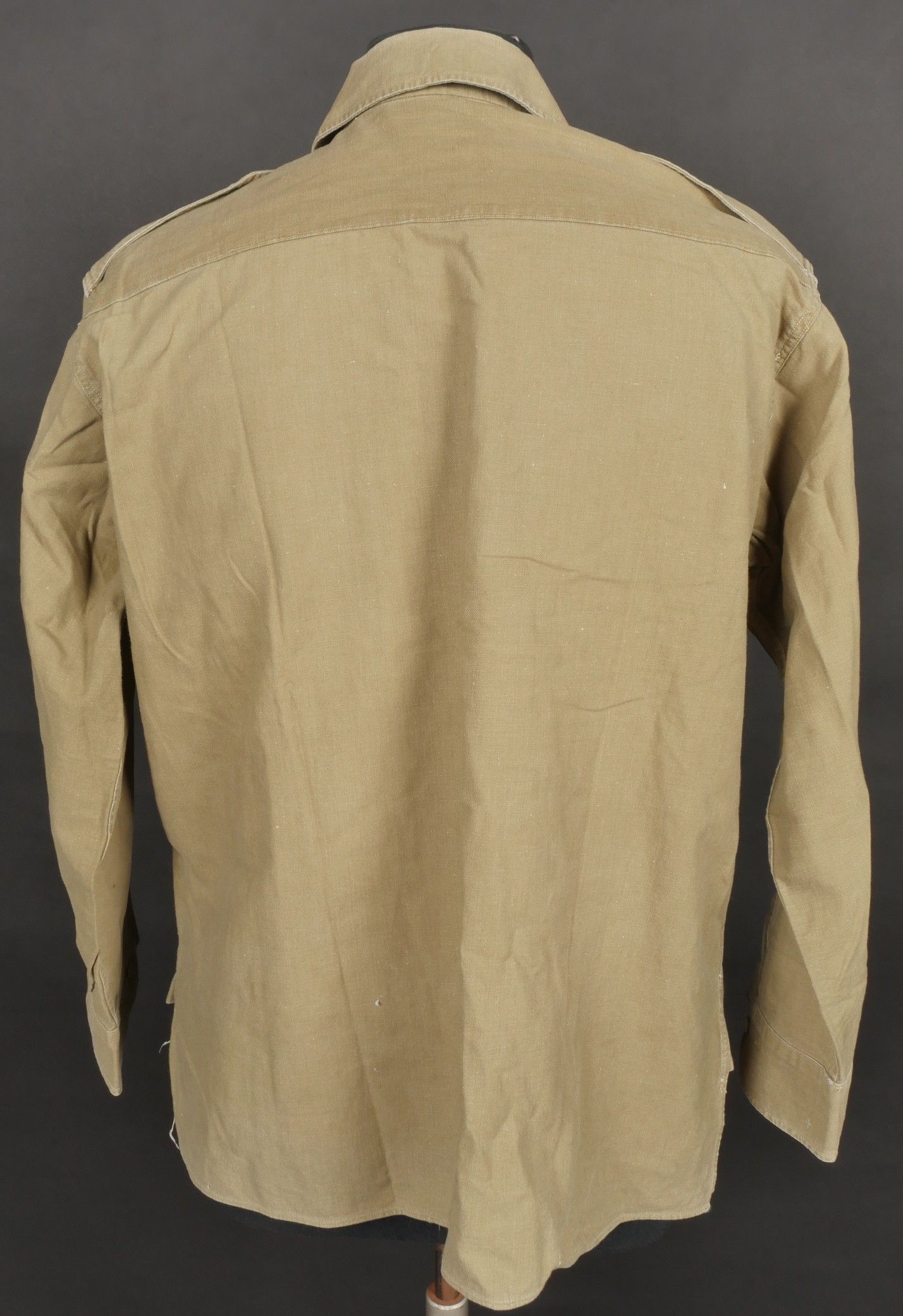 Jump shirt. Made of khaki canvas, with two breast pockets that close with press studs. The paratrooper has sewn a button next to the left breast pocket, which was designed to hold a rank. This shirt belonged to Warrant Officer Pichard. Jump shirt. Khaki cotton shirt with two chest pockets closed by snaps additional button sewn beside left pocket to attach rank. Belonged to Adjutant Pichard.