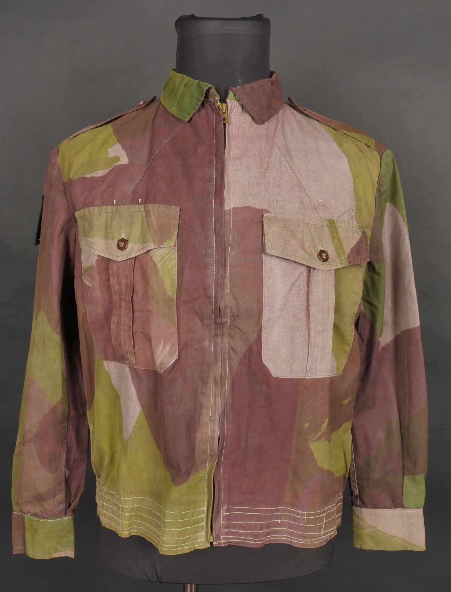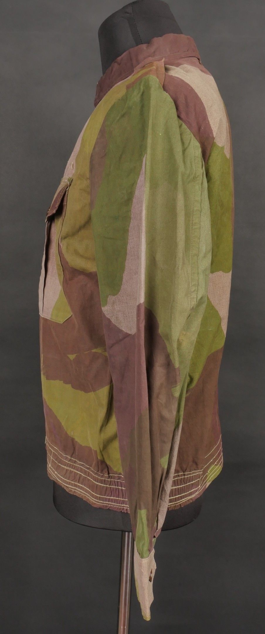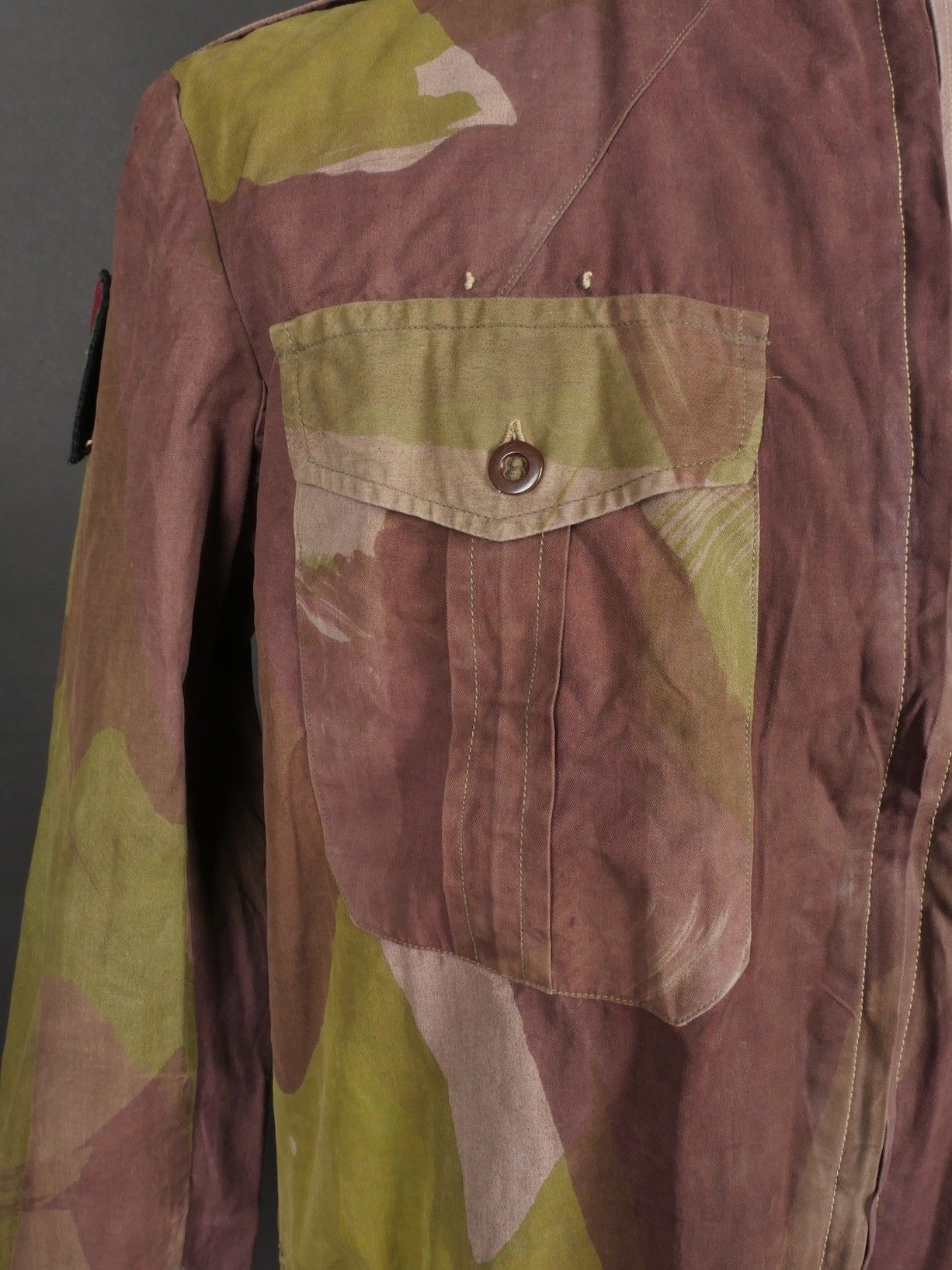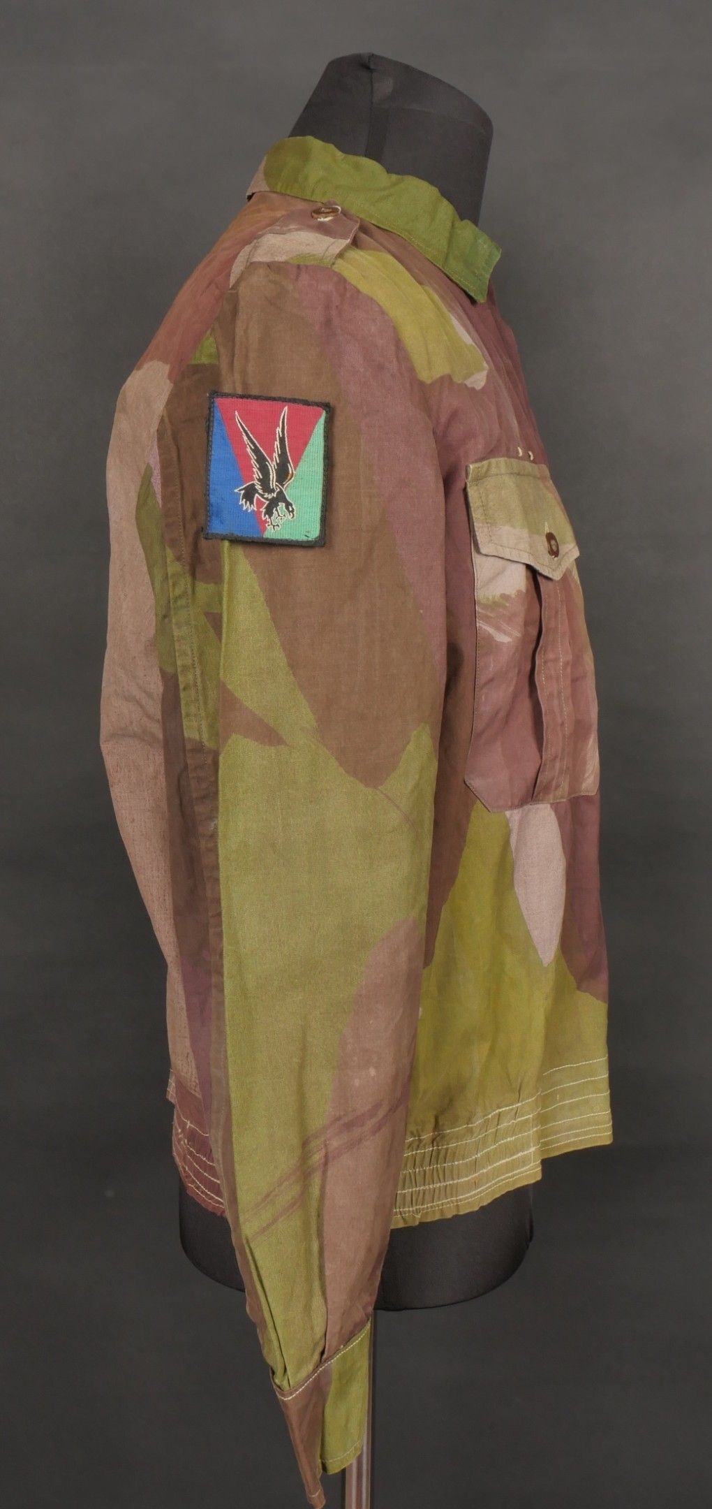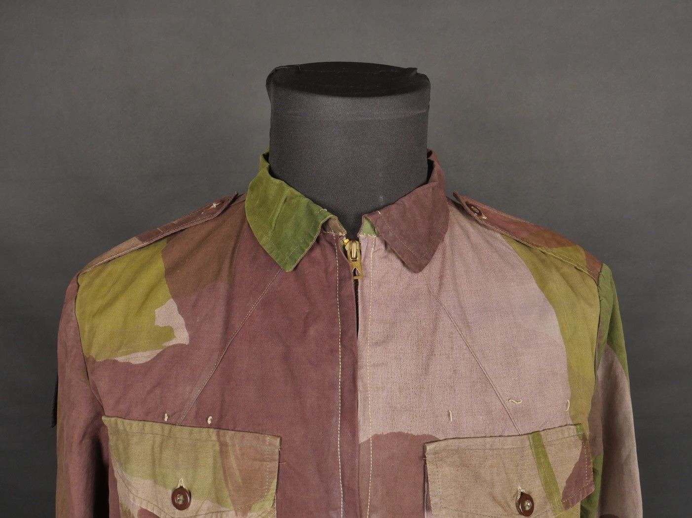 Parachutist jacket made from English windproof fabric, functional branded zip. Two chest pockets, small tab at bottom of sleeves. On the upper right sleeve is the insignia of the 10th parachute division held in place by 4 hooks. Above the right pocket there are holes for attaching the parachutist's brevet, and above the left pocket there are holes for attaching decoration reminders. This jacket belonged to Chief Warrant Officer Drapeau. Parachutist windproof jacket in British fabric functional Eclair zipper two chest pockets small wrist tabs. On right sleeve the 10th Parachute Division badge fixed with four hooks loops above pockets for parachute wings and decorations. Belonged to AdjutantChef Drapeau.