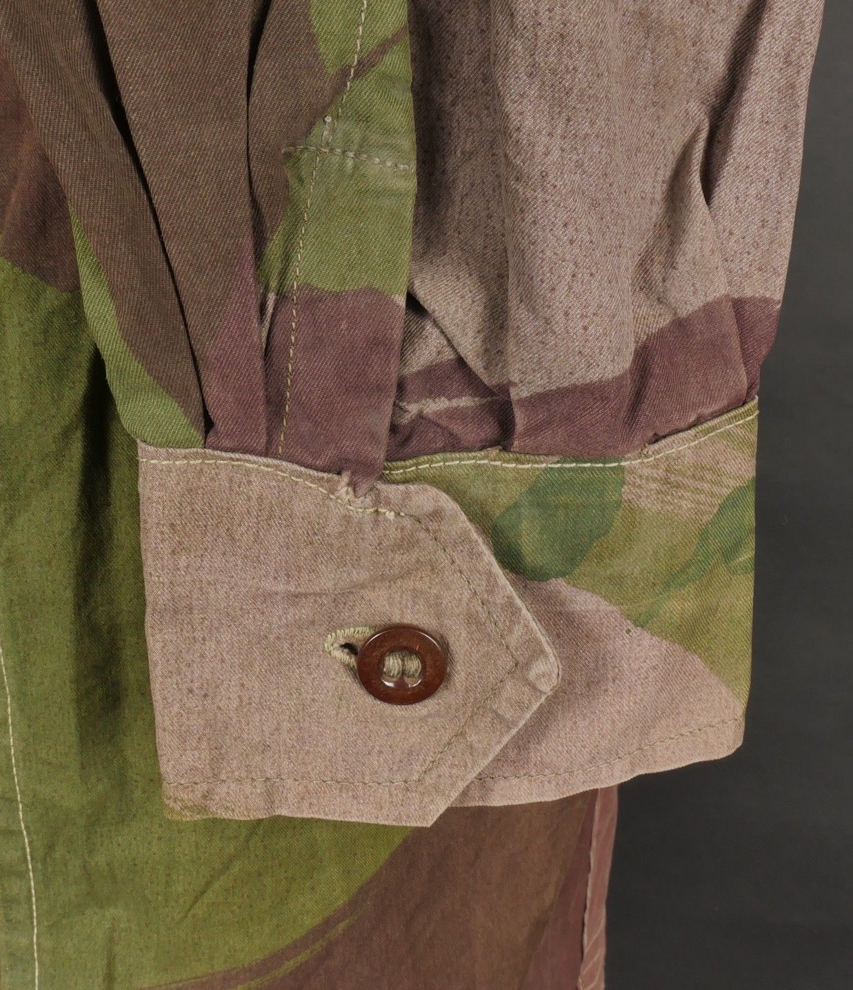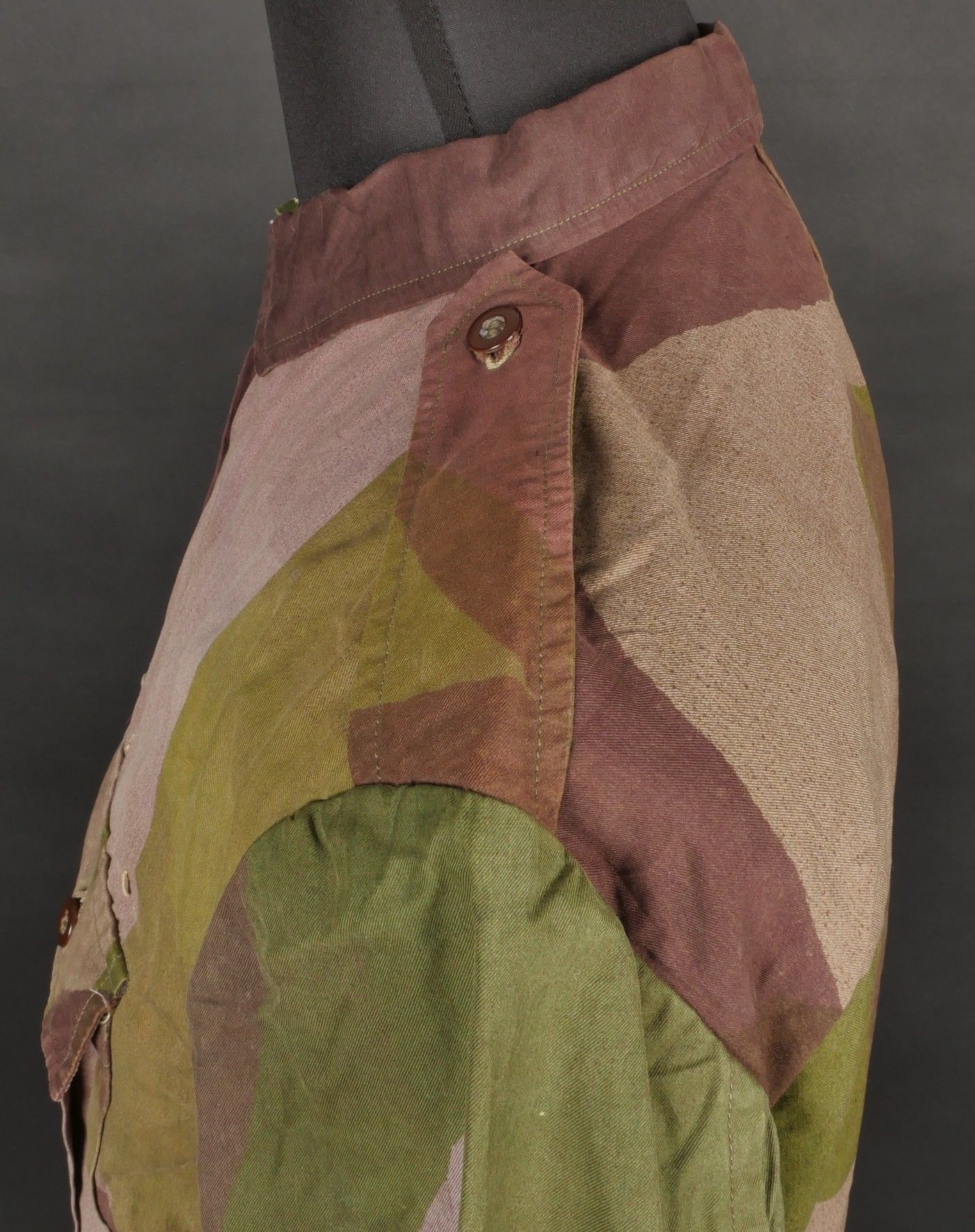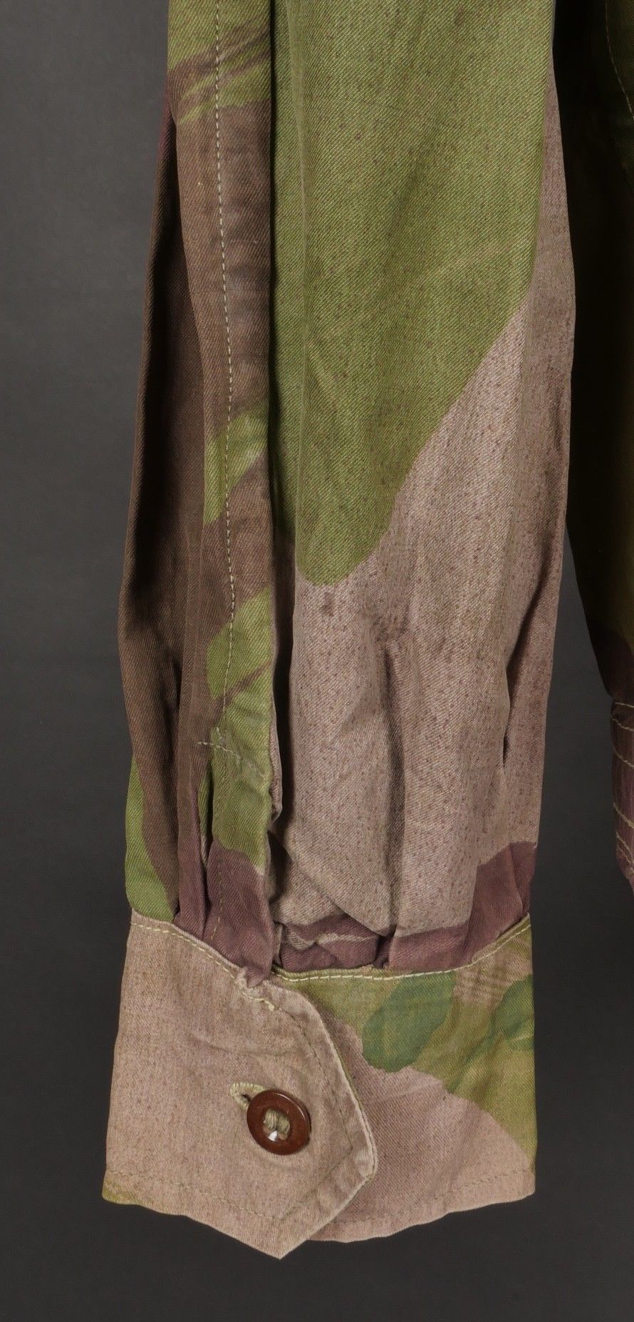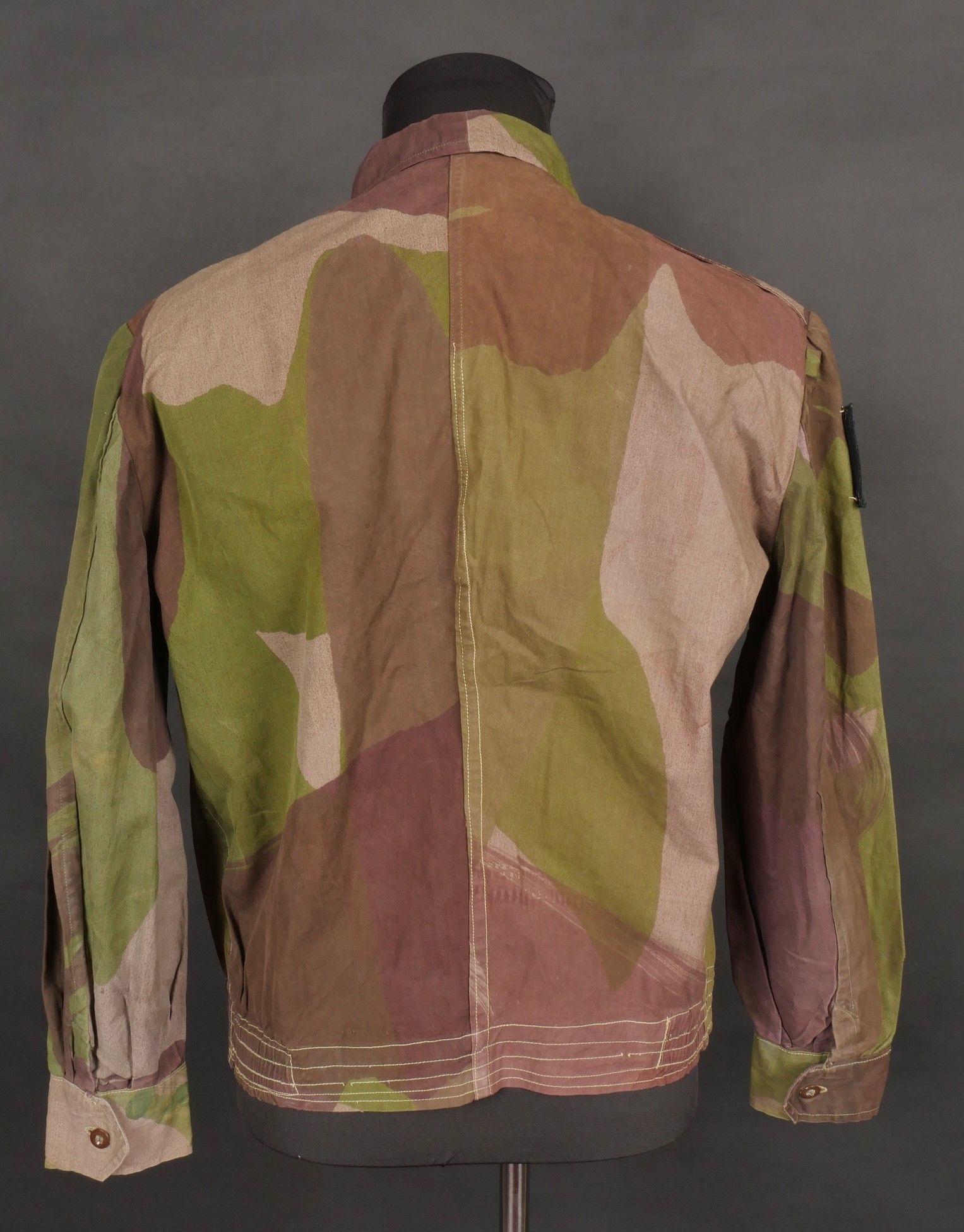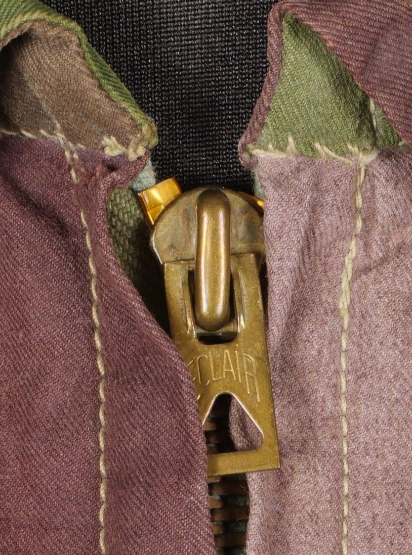 Parachutist jacket made from English windproof fabric, functional branded zip. Two chest pockets, small tab at bottom of sleeves. On the upper right sleeve is the insignia of the 10th parachute division held in place by 4 hooks. Above the right pocket there are holes for attaching the parachutist's brevet, and above the left pocket there are holes for attaching decoration reminders. This jacket belonged to Chief Warrant Officer Drapeau. Parachutist windproof jacket in British fabric functional Eclair zipper two chest pockets small wrist tabs. On right sleeve the 10th Parachute Division badge fixed with four hooks loops above pockets for parachute wings and decorations. Belonged to AdjutantChef Drapeau.