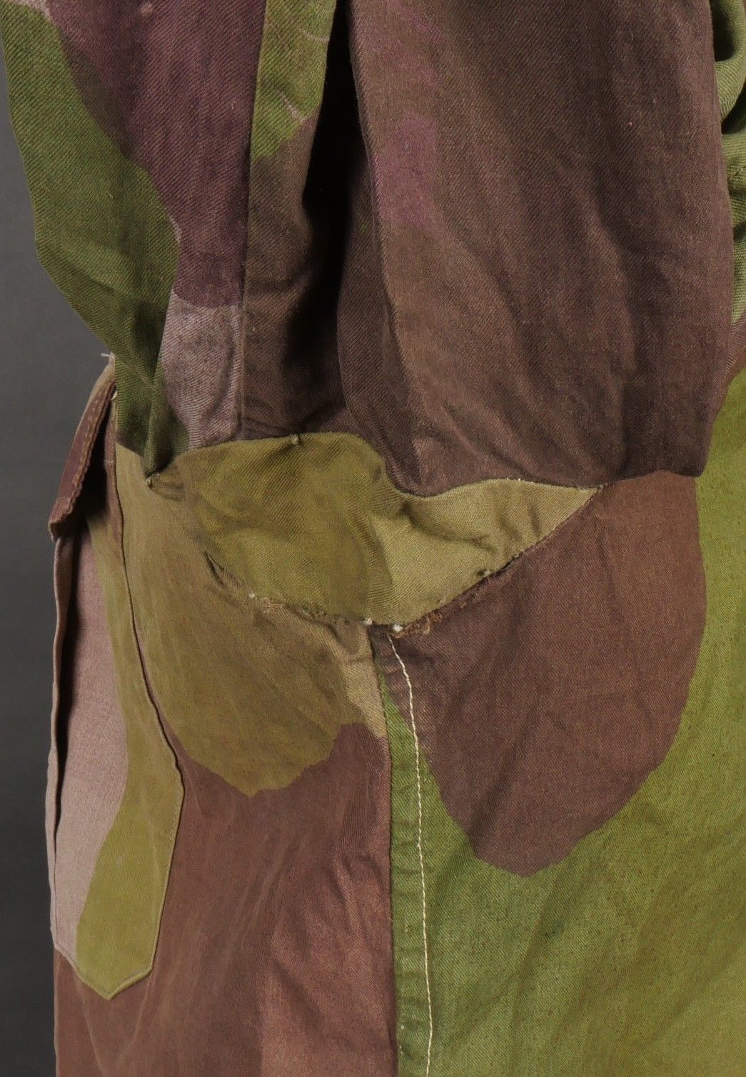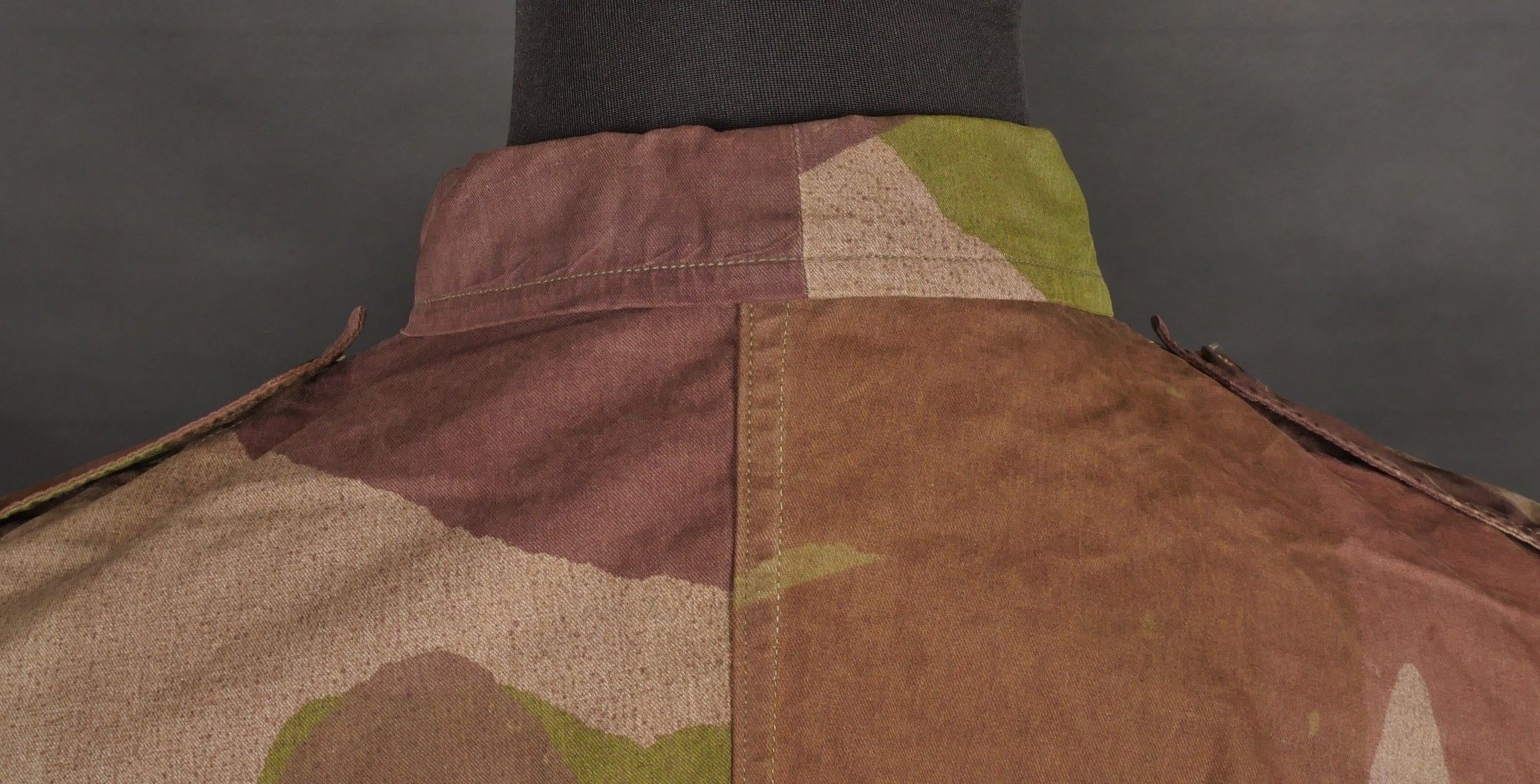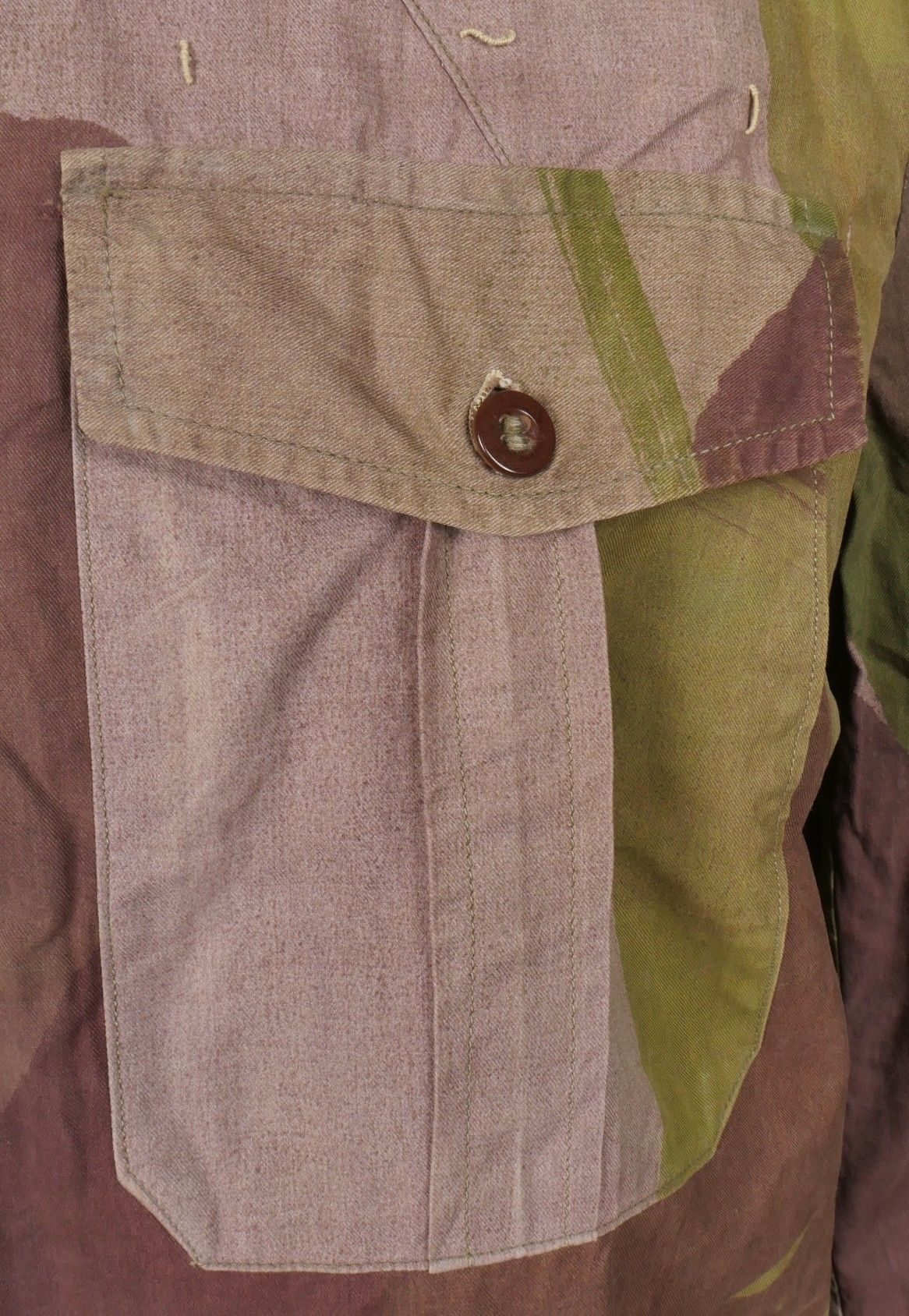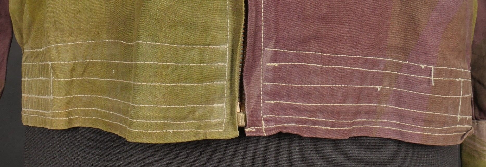 Parachutist jacket made from English windproof fabric, functional branded zip. Two chest pockets, small tab at bottom of sleeves. On the upper right sleeve is the insignia of the 10th parachute division held in place by 4 hooks. Above the right pocket there are holes for attaching the parachutist's brevet, and above the left pocket there are holes for attaching decoration reminders. This jacket belonged to Chief Warrant Officer Drapeau. Parachutist windproof jacket in British fabric functional Eclair zipper two chest pockets small wrist tabs. On right sleeve the 10th Parachute Division badge fixed with four hooks loops above pockets for parachute wings and decorations. Belonged to AdjutantChef Drapeau.