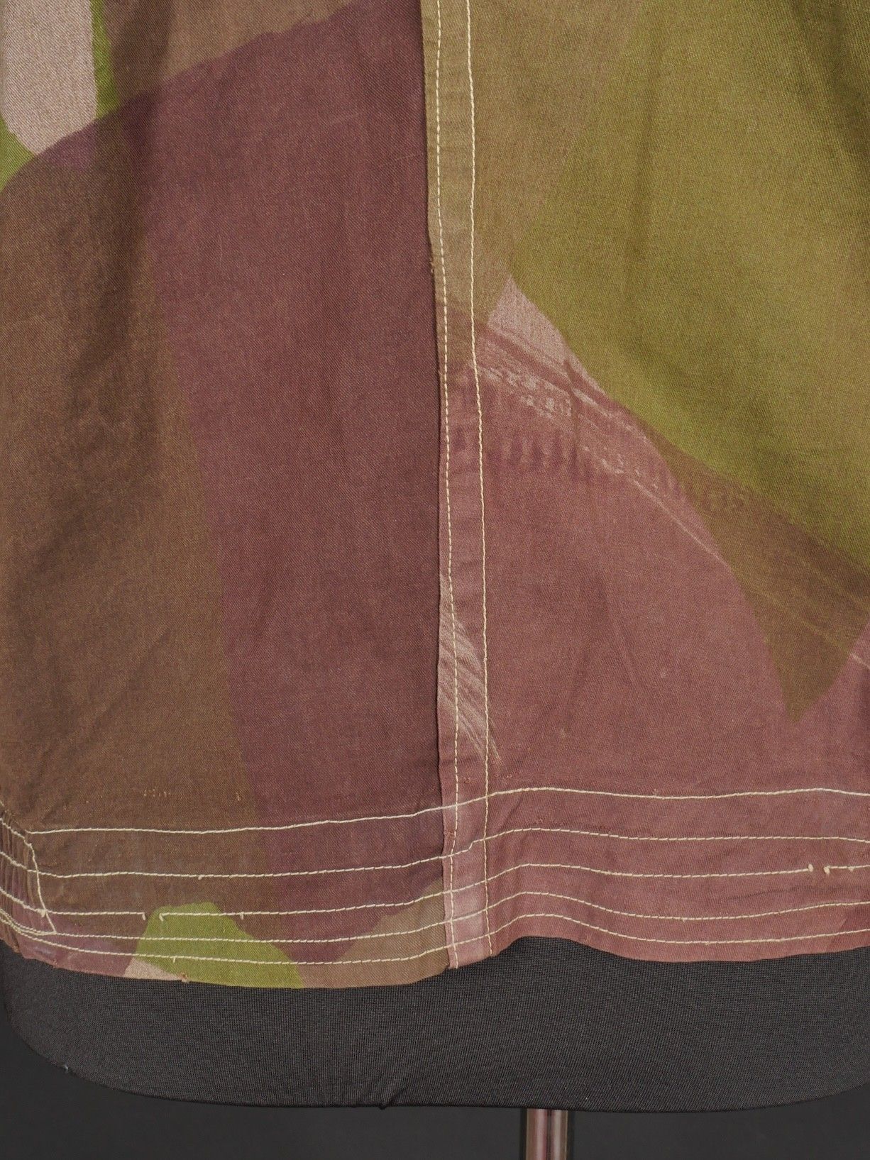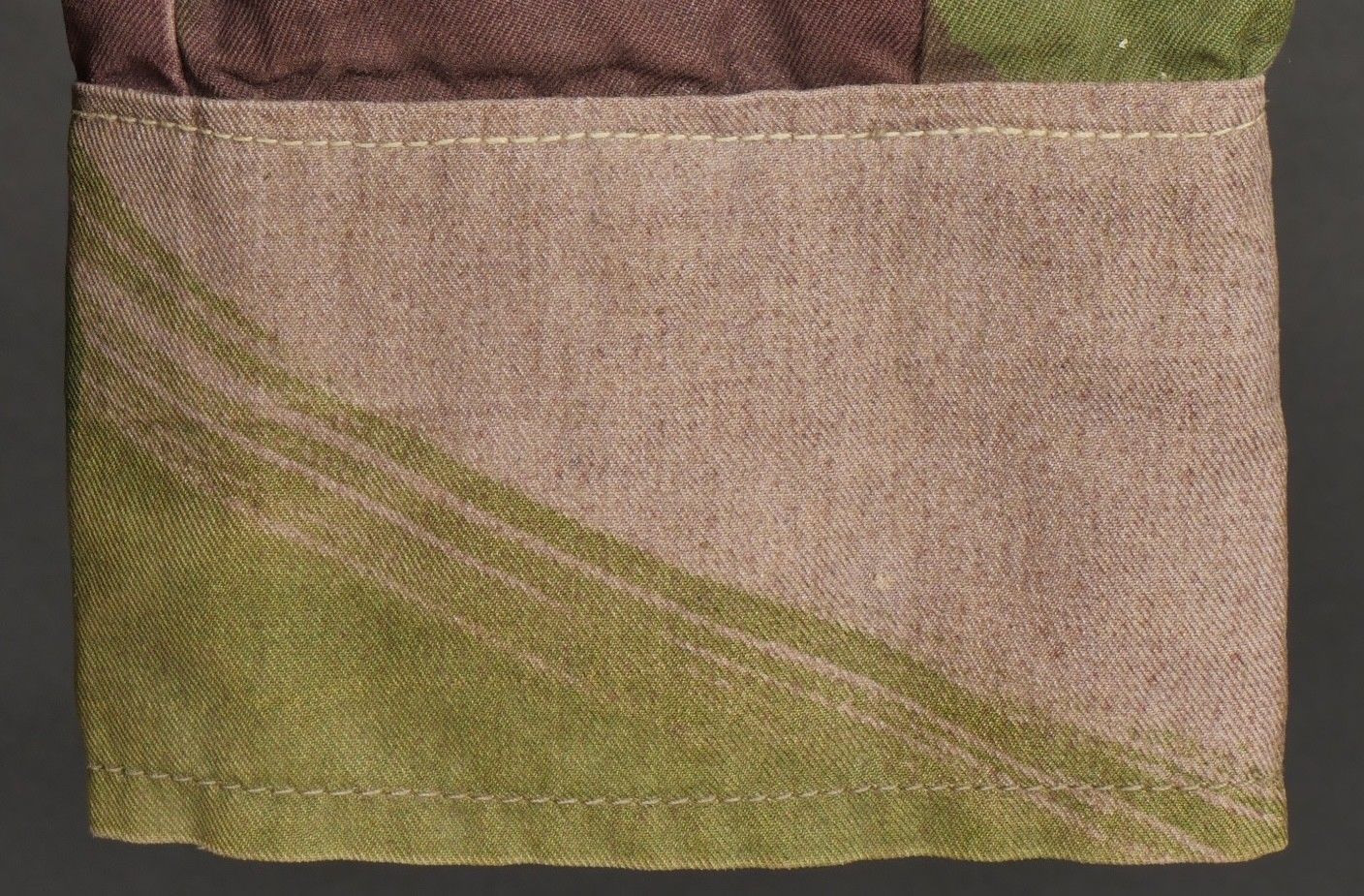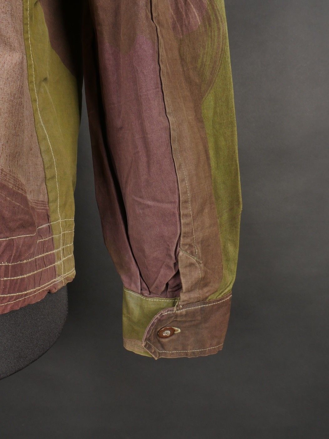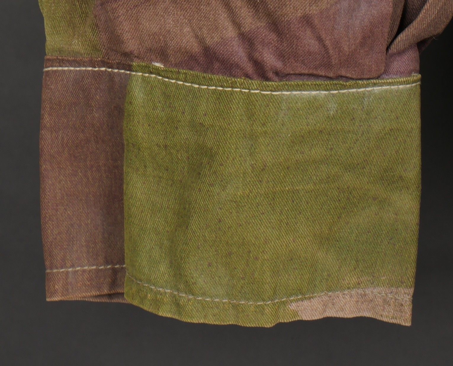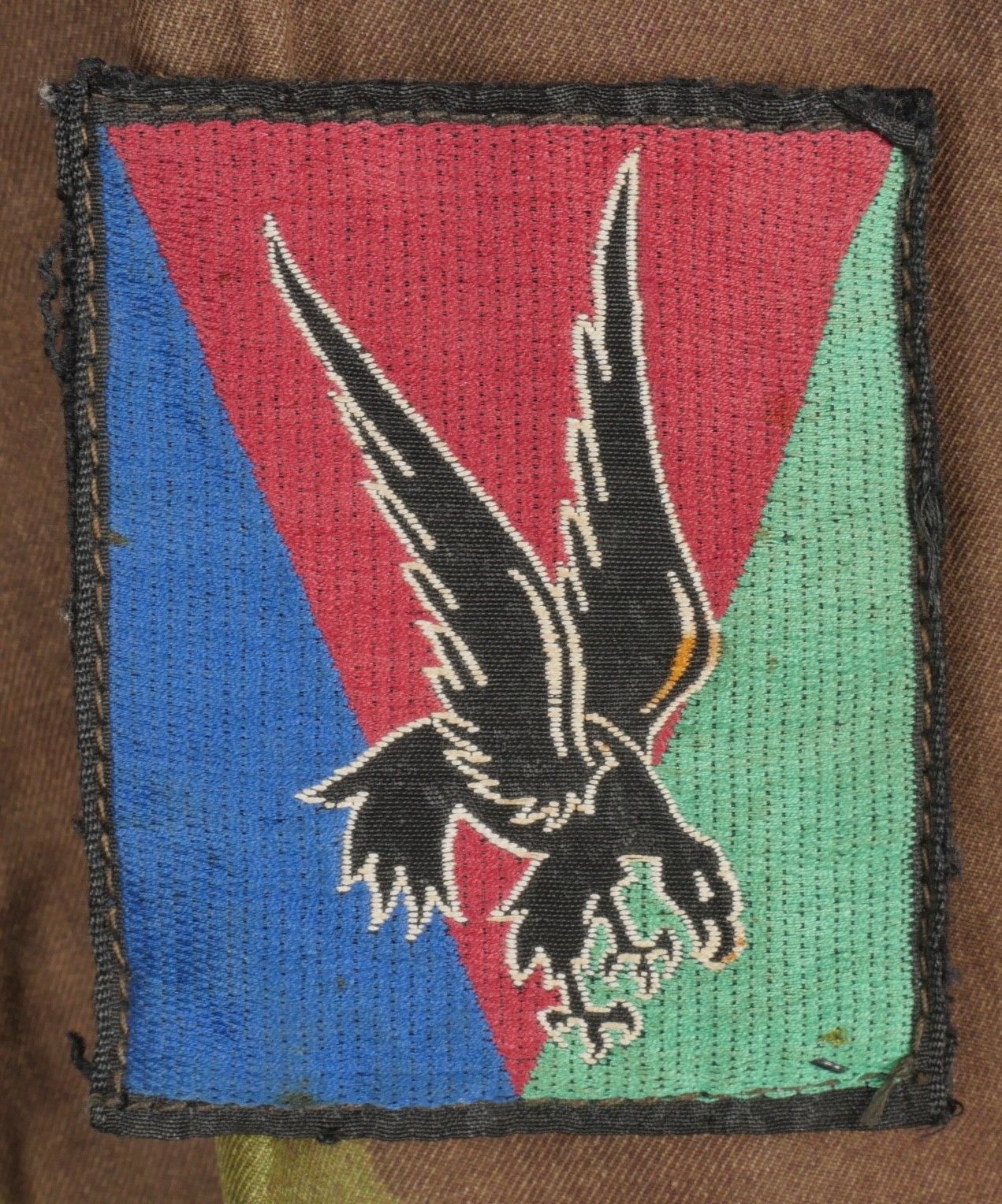 Parachutist jacket made from English windproof fabric, functional branded zip. Two chest pockets, small tab at bottom of sleeves. On the upper right sleeve is the insignia of the 10th parachute division held in place by 4 hooks. Above the right pocket there are holes for attaching the parachutist's brevet, and above the left pocket there are holes for attaching decoration reminders. This jacket belonged to Chief Warrant Officer Drapeau. Parachutist windproof jacket in British fabric functional Eclair zipper two chest pockets small wrist tabs. On right sleeve the 10th Parachute Division badge fixed with four hooks loops above pockets for parachute wings and decorations. Belonged to AdjutantChef Drapeau.