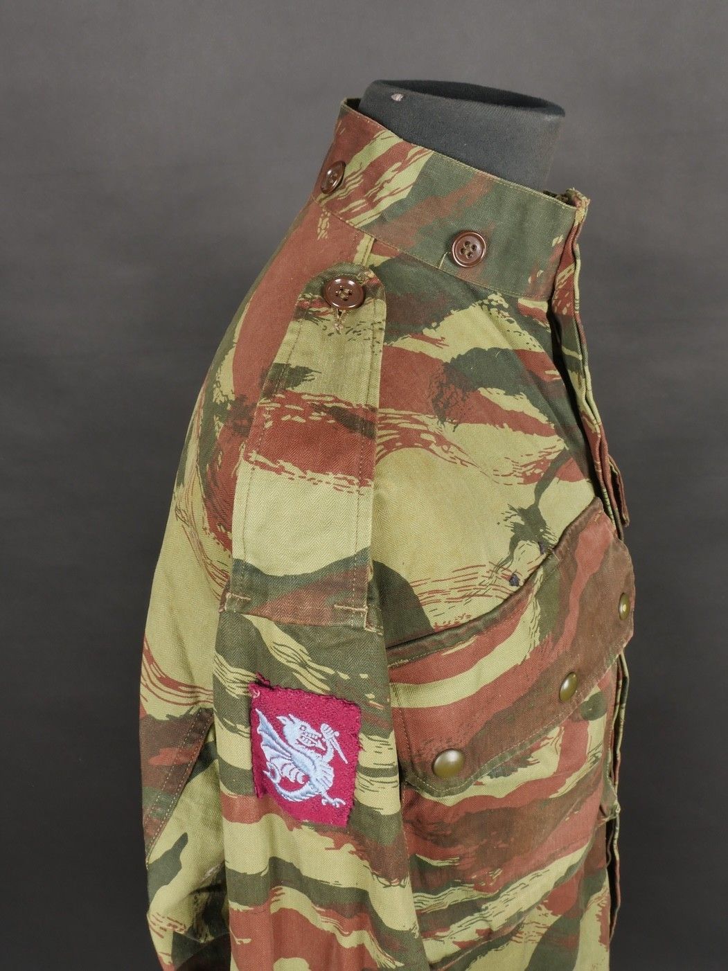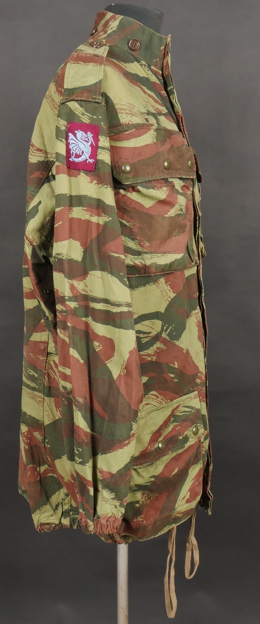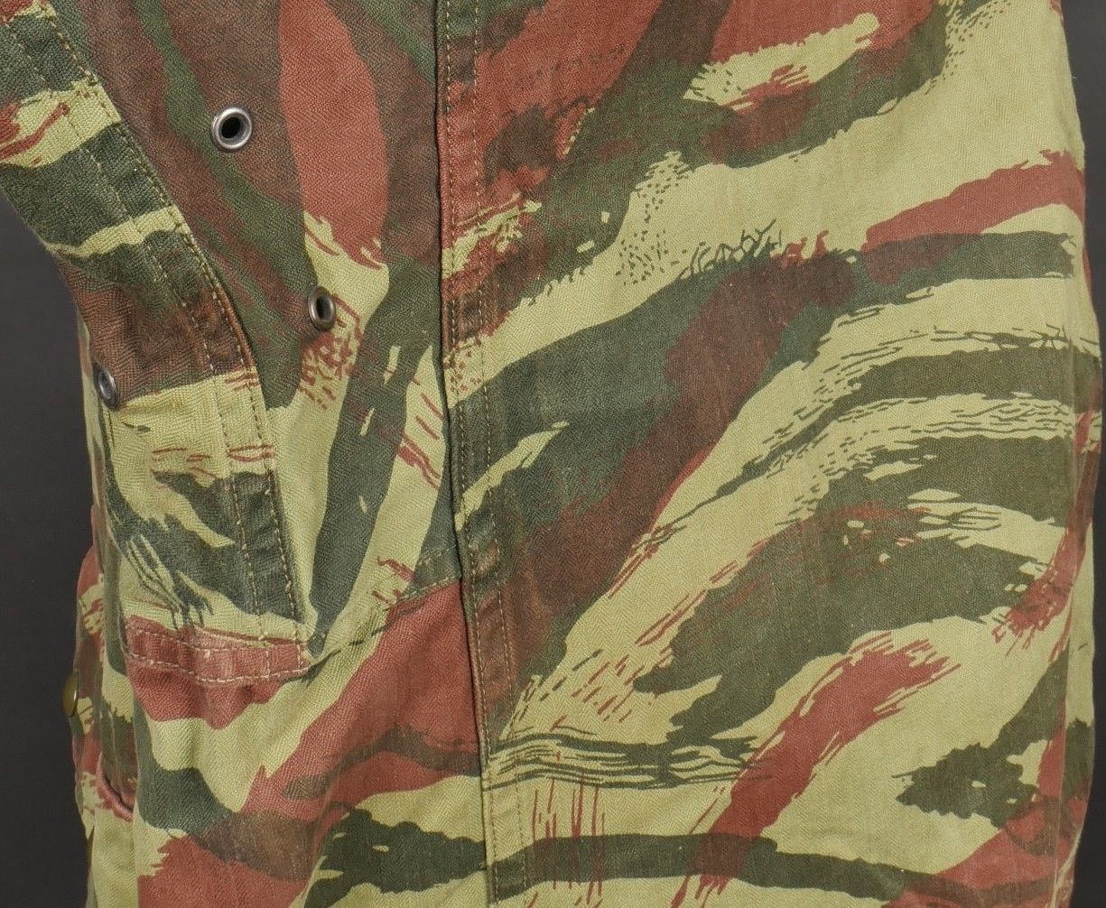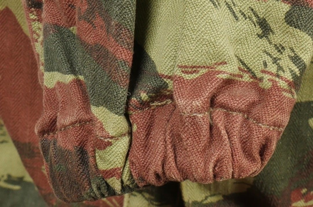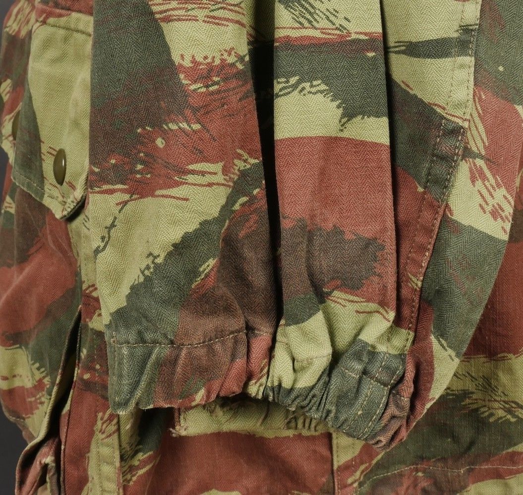 TAP 4756 camouflage jacket. Jacket made from 56 camouflage fabric, original paint press studs, Spidex zip, drawstring present. Utah manufacturer's stamp, paratrooper patent waiting above right breast pocket. Colonial parachutist insignia sewn on right sleeve and colonial-style 45 diamond for officer on left sleeve. No eyelets on chest pockets. TAP 4756 camouflage jacket. Made of 1956 pattern camouflage cloth with original painted snaps Spidex zipper functional drawcord present. Maker mark Utah loops above right chest for parachutist wings colonial paratrooper patch on right sleeve colonial officer 45 diamond on left sleeve no pocket eyelets.