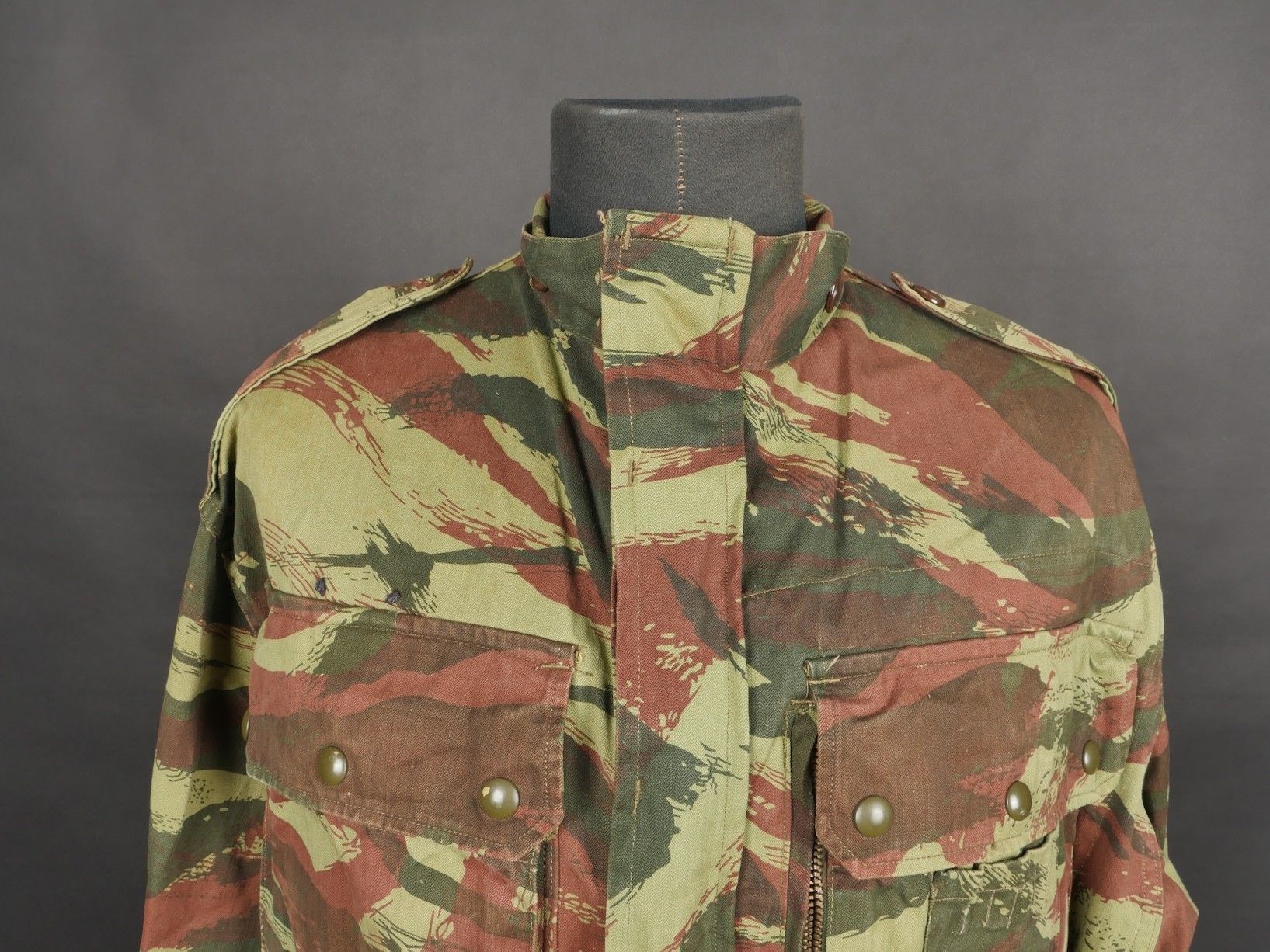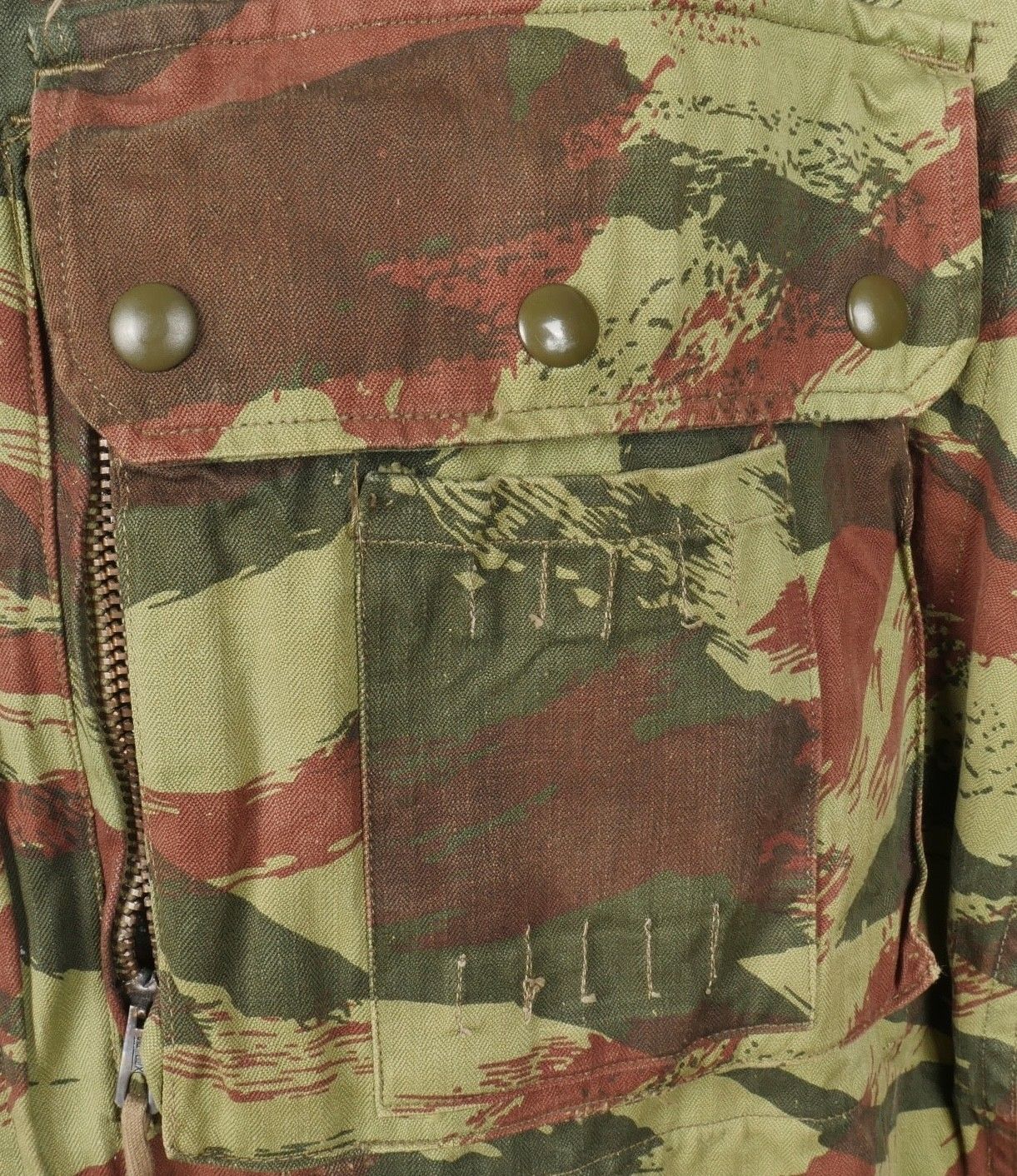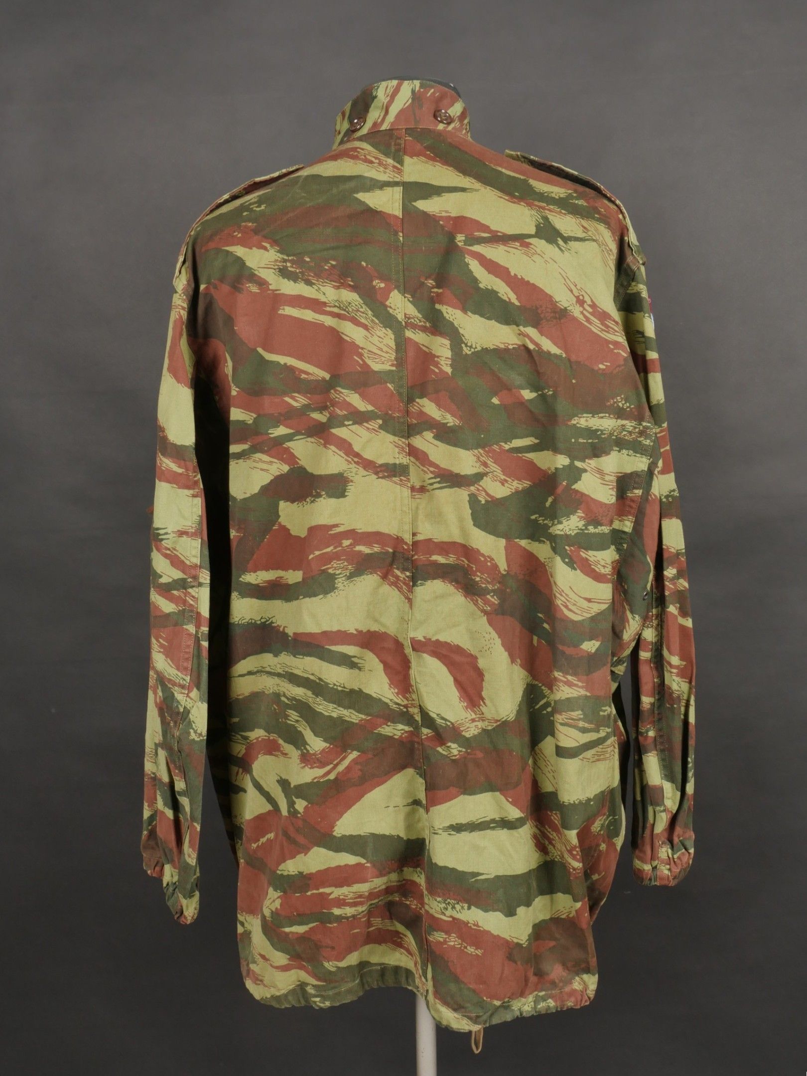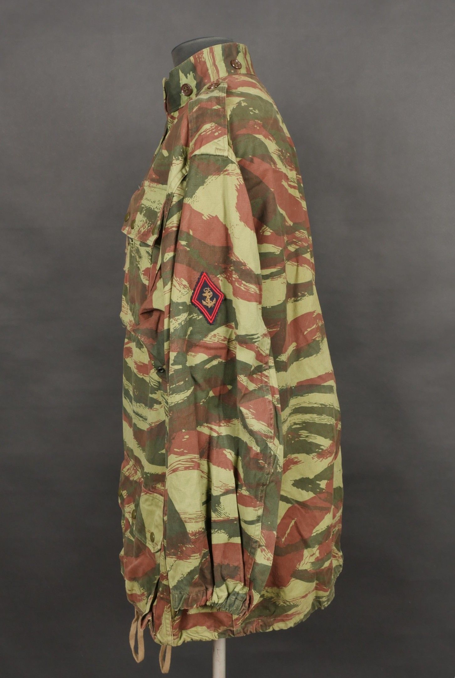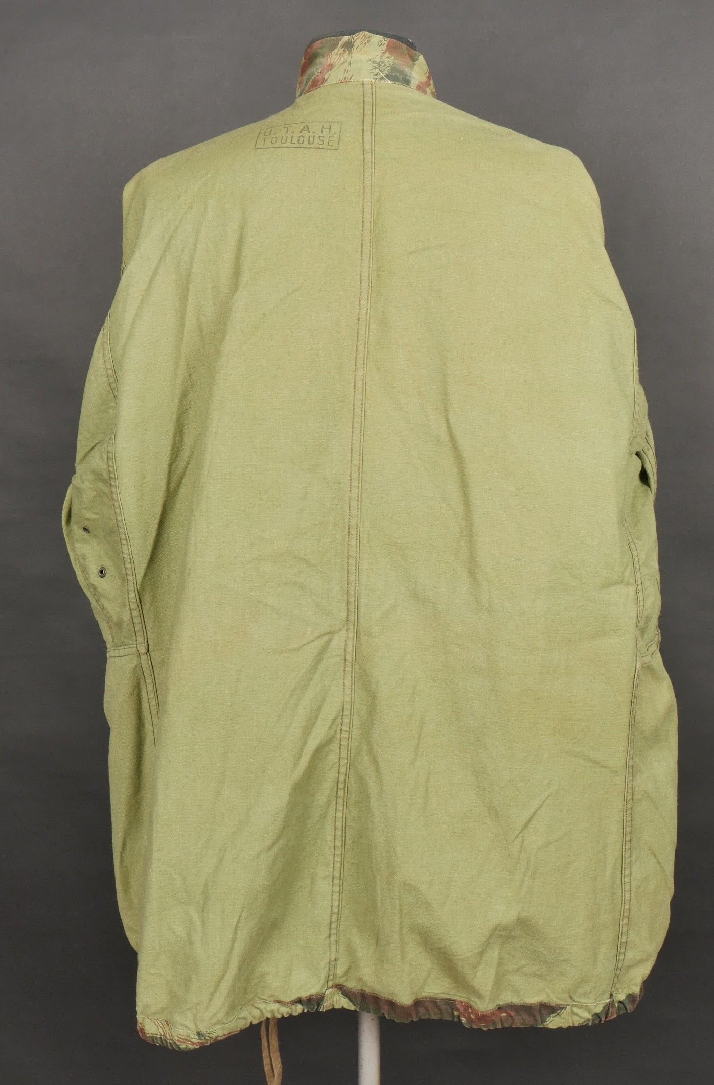 TAP 4756 camouflage jacket. Jacket made from 56 camouflage fabric, original paint press studs, Spidex zip, drawstring present. Utah manufacturer's stamp, paratrooper patent waiting above right breast pocket. Colonial parachutist insignia sewn on right sleeve and colonial-style 45 diamond for officer on left sleeve. No eyelets on chest pockets. TAP 4756 camouflage jacket. Made of 1956 pattern camouflage cloth with original painted snaps Spidex zipper functional drawcord present. Maker mark Utah loops above right chest for parachutist wings colonial paratrooper patch on right sleeve colonial officer 45 diamond on left sleeve no pocket eyelets.