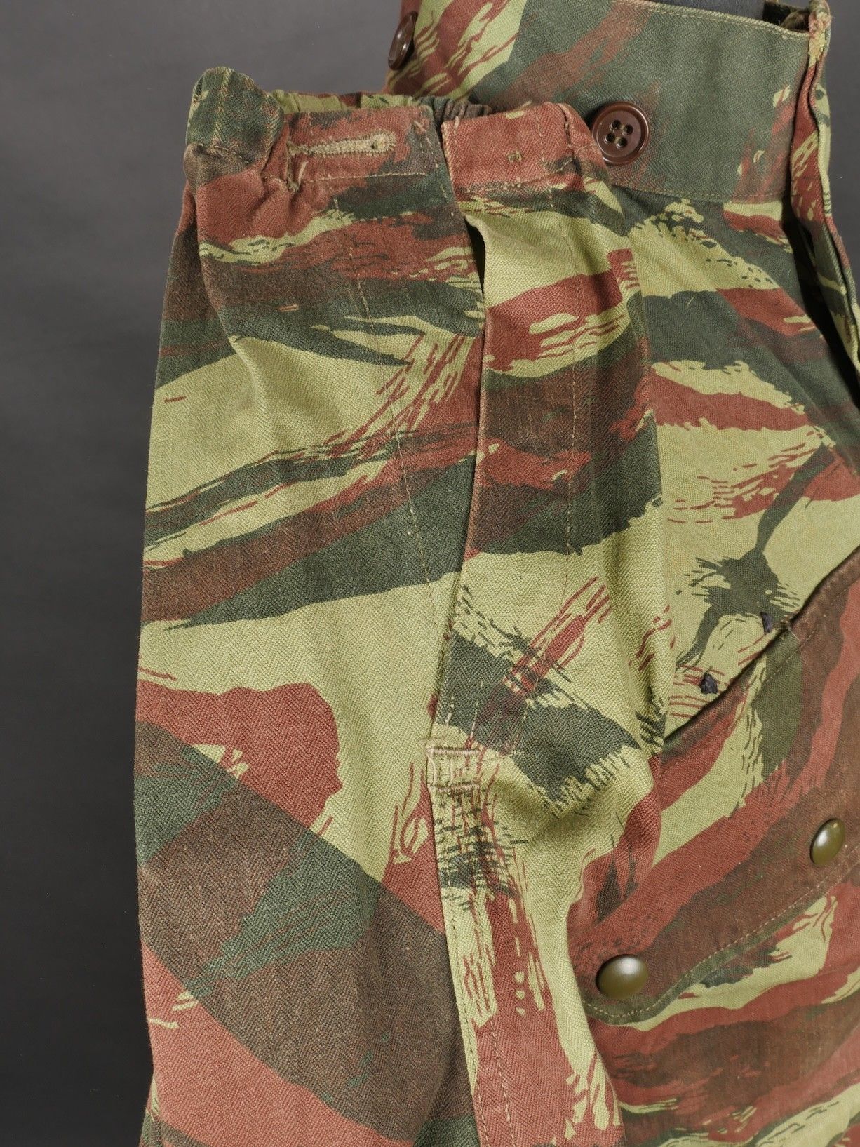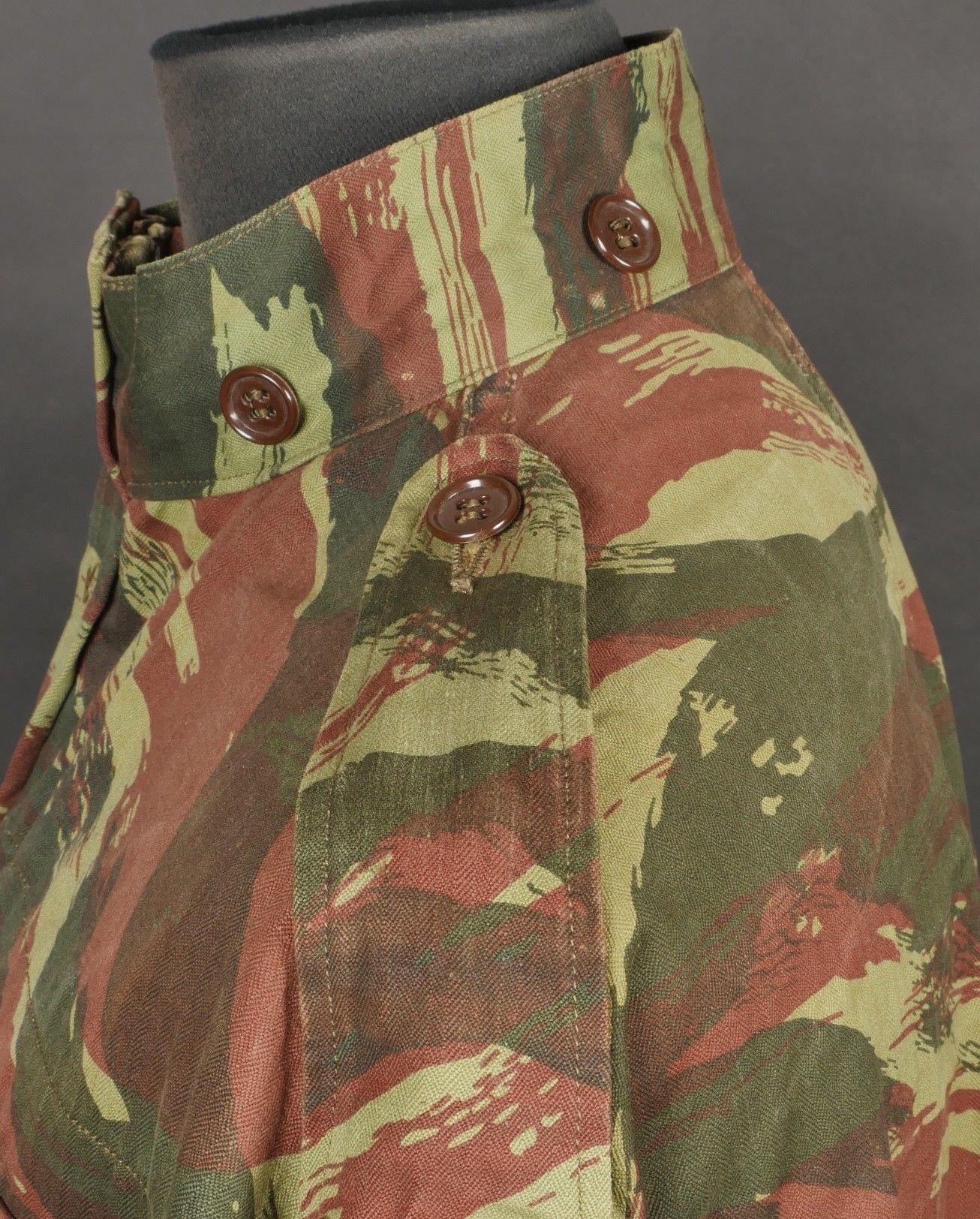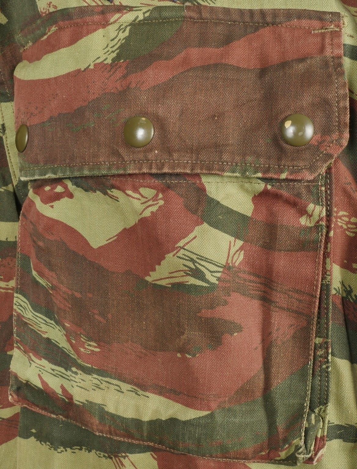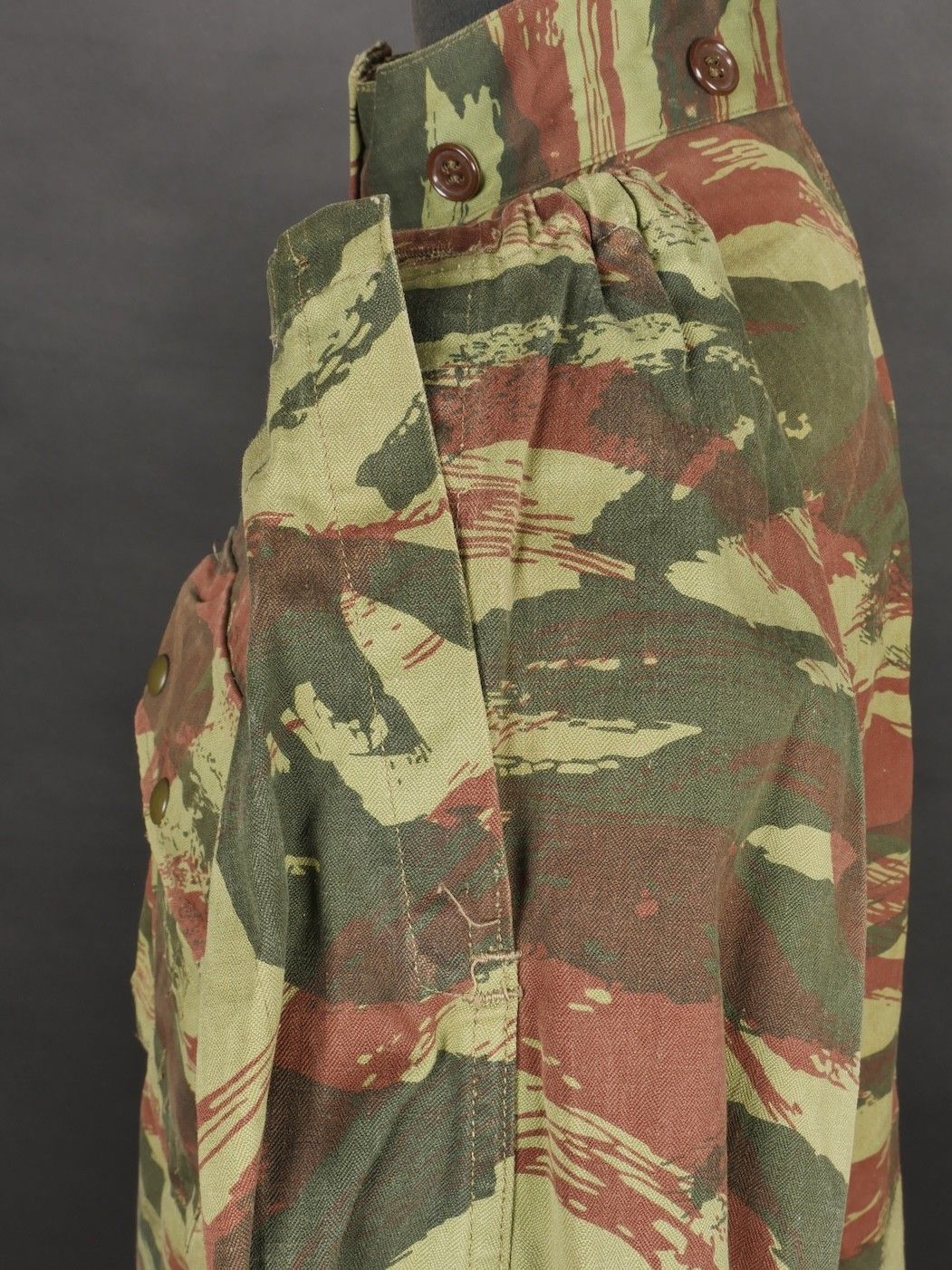 TAP 4756 camouflage jacket. Jacket made from 56 camouflage fabric, original paint press studs, Spidex zip, drawstring present. Utah manufacturer's stamp, paratrooper patent waiting above right breast pocket. Colonial parachutist insignia sewn on right sleeve and colonial-style 45 diamond for officer on left sleeve. No eyelets on chest pockets. TAP 4756 camouflage jacket. Made of 1956 pattern camouflage cloth with original painted snaps Spidex zipper functional drawcord present. Maker mark Utah loops above right chest for parachutist wings colonial paratrooper patch on right sleeve colonial officer 45 diamond on left sleeve no pocket eyelets.