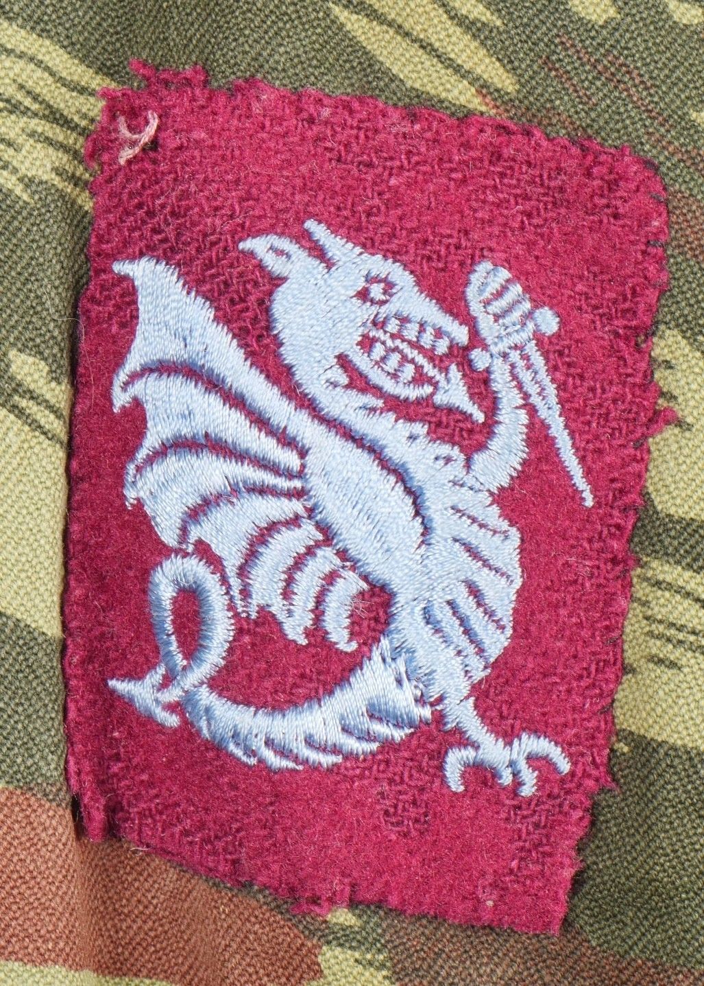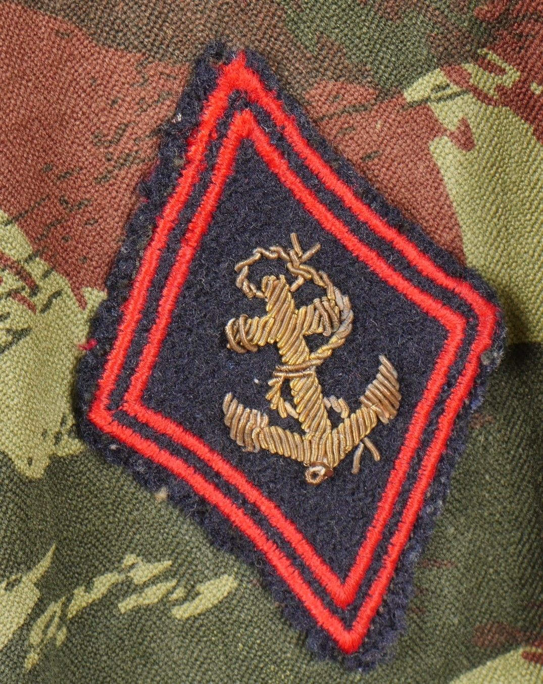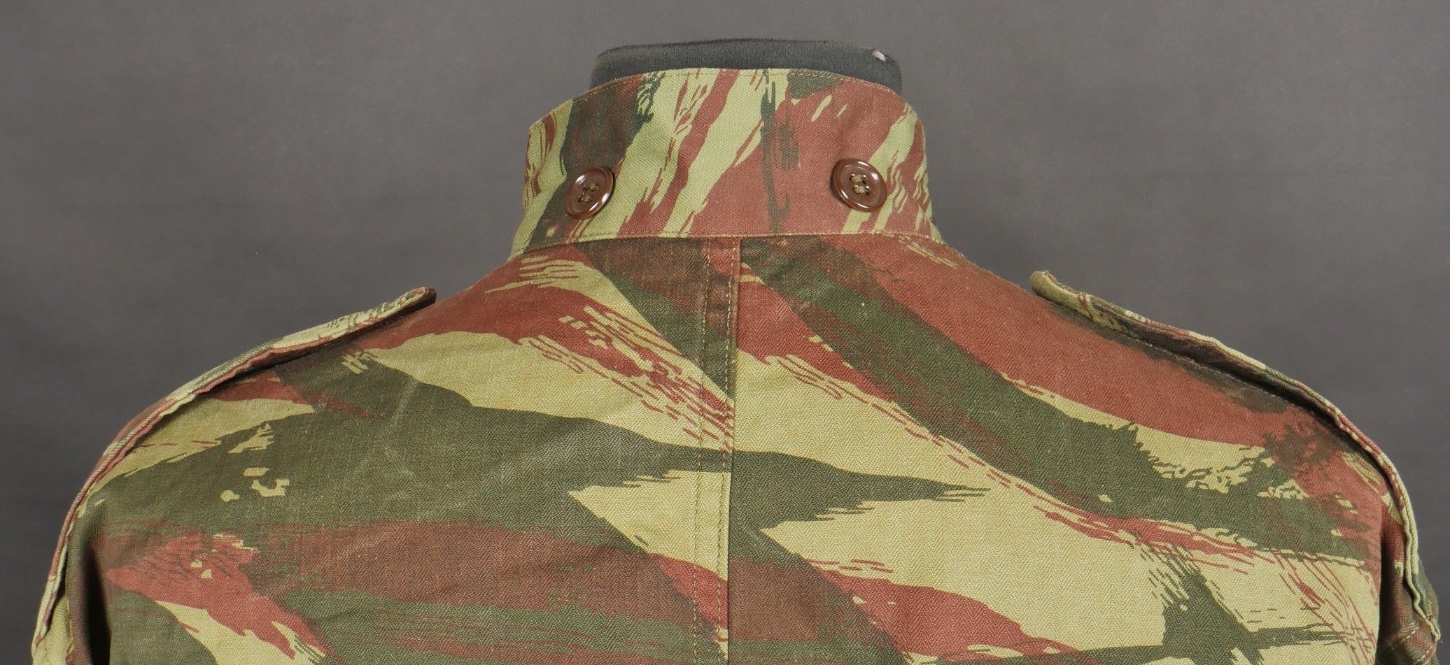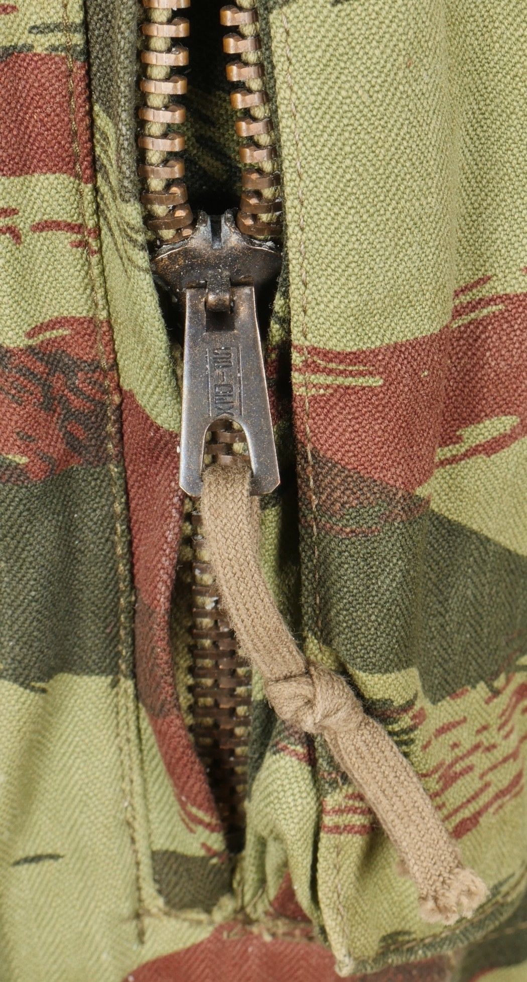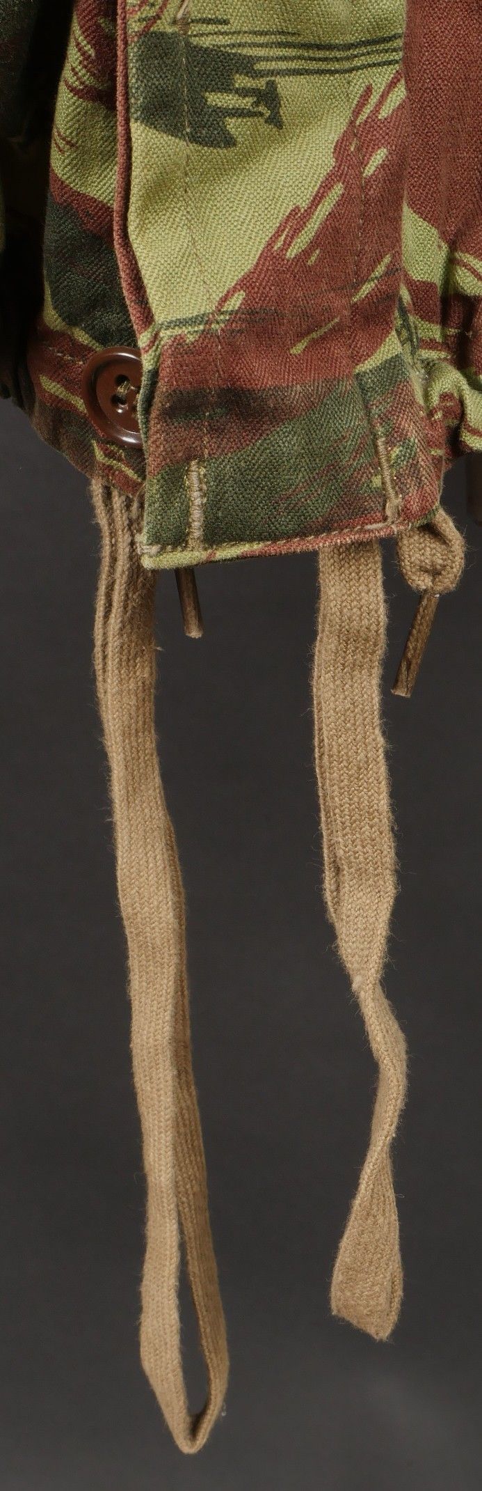 TAP 4756 camouflage jacket. Jacket made from 56 camouflage fabric, original paint press studs, Spidex zip, drawstring present. Utah manufacturer's stamp, paratrooper patent waiting above right breast pocket. Colonial parachutist insignia sewn on right sleeve and colonial-style 45 diamond for officer on left sleeve. No eyelets on chest pockets. TAP 4756 camouflage jacket. Made of 1956 pattern camouflage cloth with original painted snaps Spidex zipper functional drawcord present. Maker mark Utah loops above right chest for parachutist wings colonial paratrooper patch on right sleeve colonial officer 45 diamond on left sleeve no pocket eyelets.