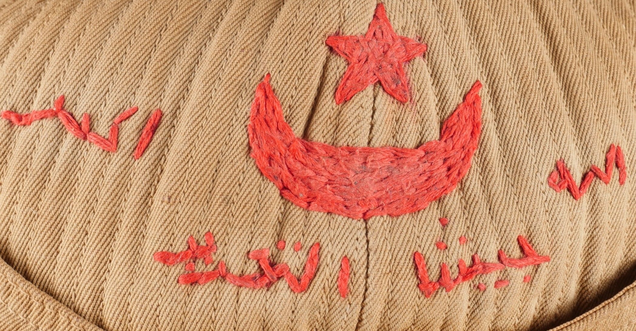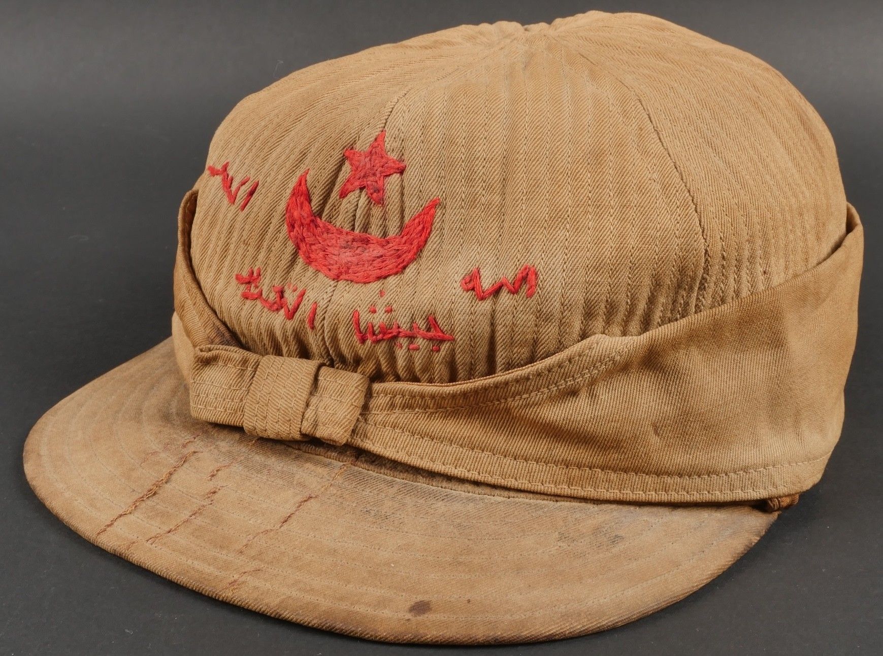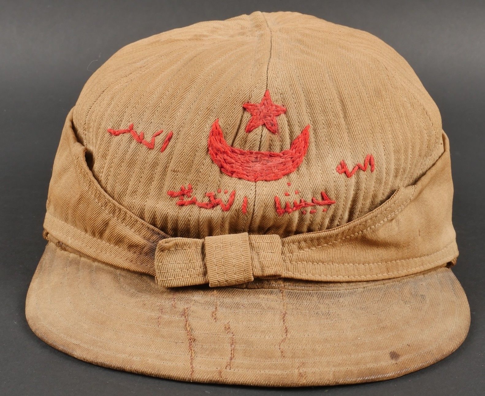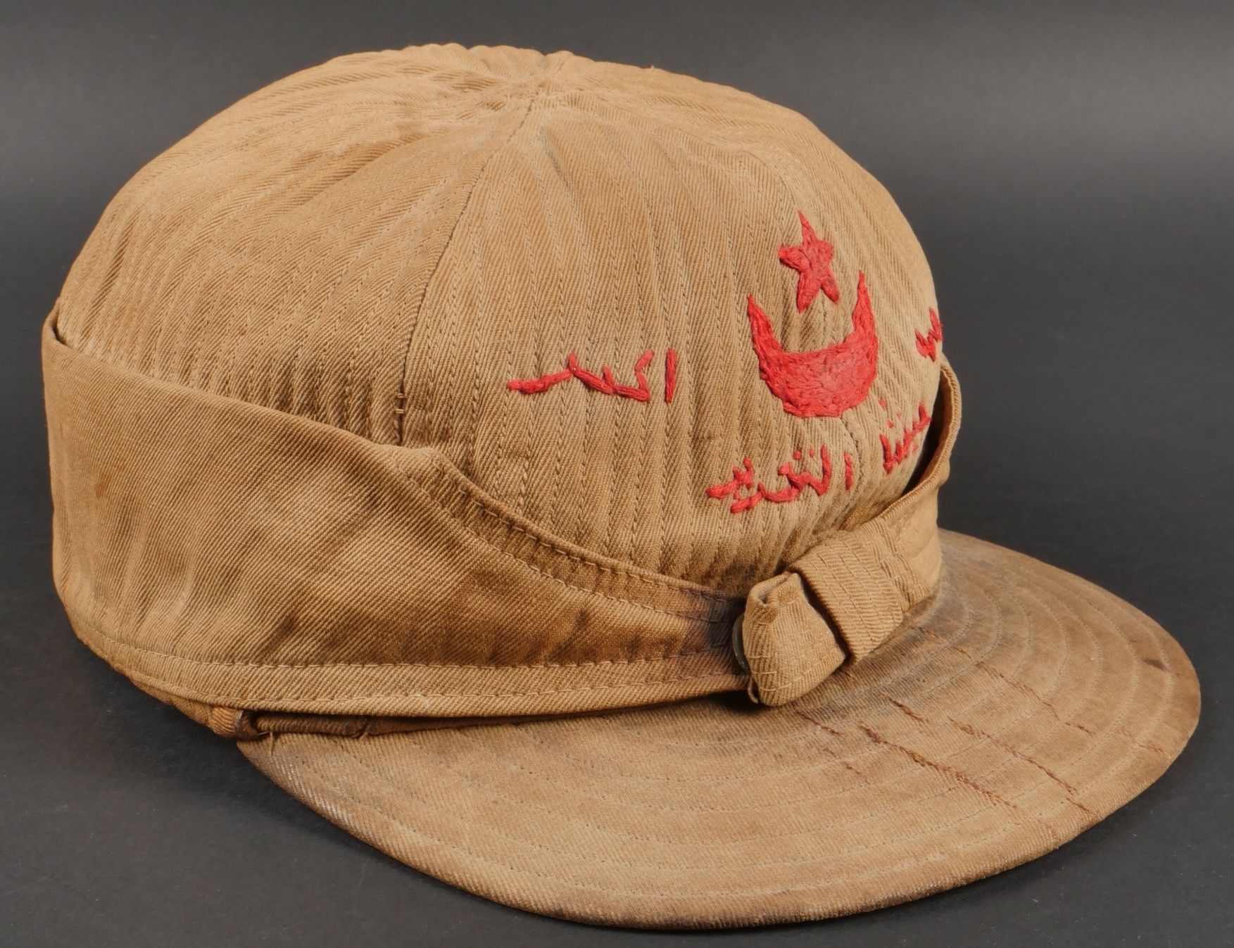 Cap worn by an FLN rebel and recovered by Sub-Lieutenant Escoffier of the 31st Battalion of Chasseurs à pied. Entirely made of a strong light khaki canvas, the cap has flaps held by a small button on the front. Inside, a French manufacturer's label reads Gill's Marque Française Grand Luxe. Brown leather sweatband. The front of the cap is embroidered with the red crescent moon surmounted by the star, as well as a motto in Arabic. There is also a revolver holster recovered by Second Lieutenant Escoffier. The holster is made of brown leather and decorated in the oriental style. 2 belt loops on the back and a shoulder strap. Cap worn by an FLN rebel recovered by Second Lieutenant Escoffier 31st Infantry Battalion. Heavy light khaki canvas with folddown ear flaps buttoned front interior label Gill's Marque Française Grand Luxe. Brown leather sweatband. Red crescent and star embroidered at front with Arabic motto. Includes a brown leather revolver holster of oriental design with two belt loops and strap ring.