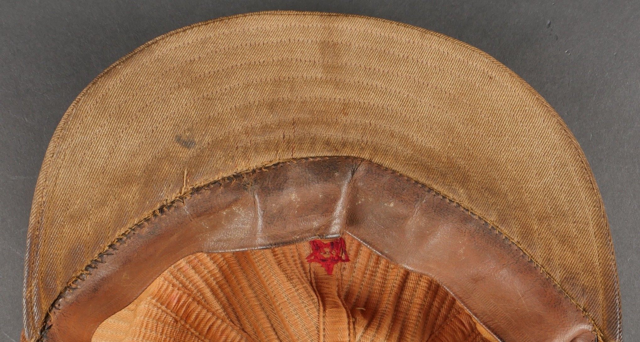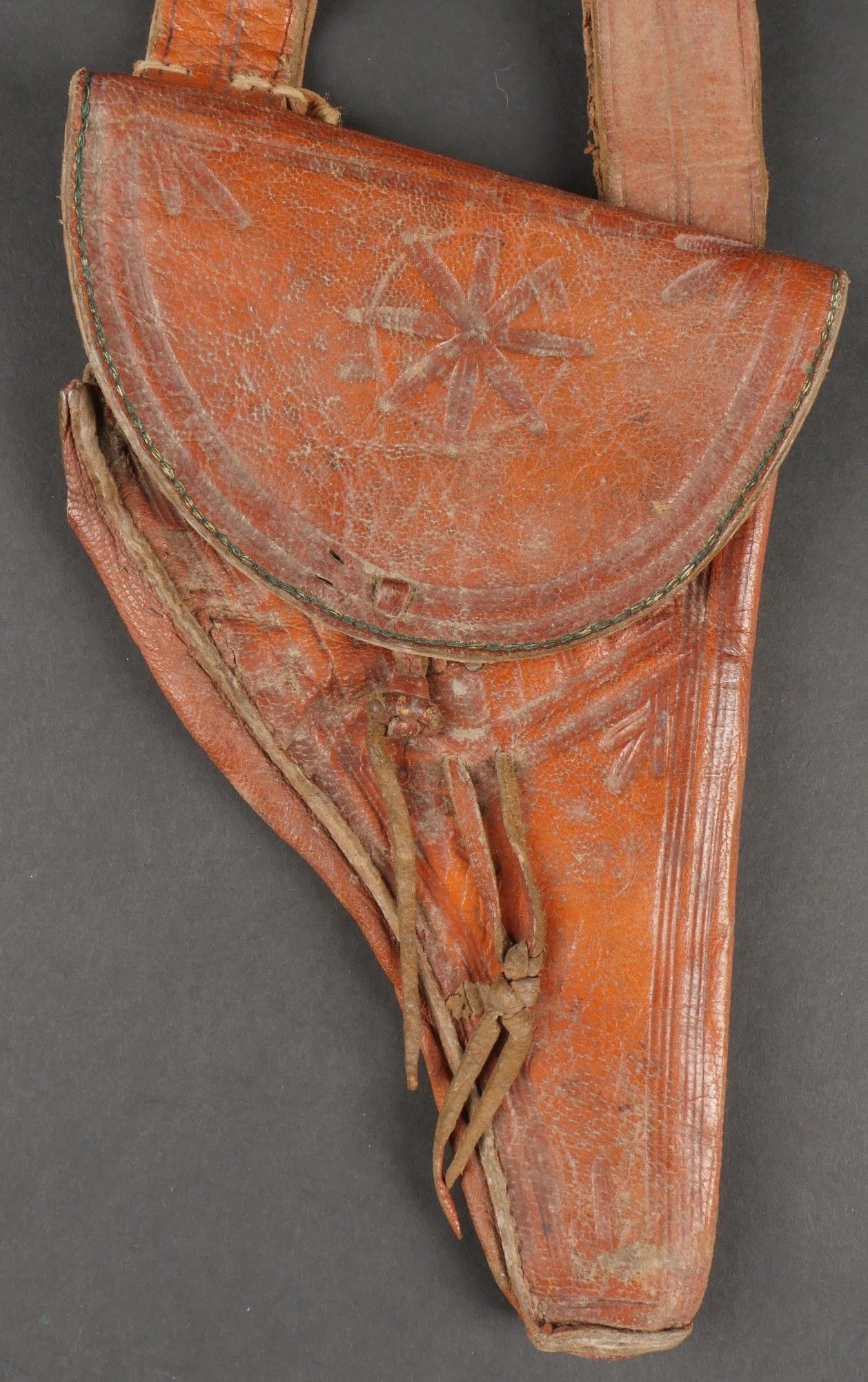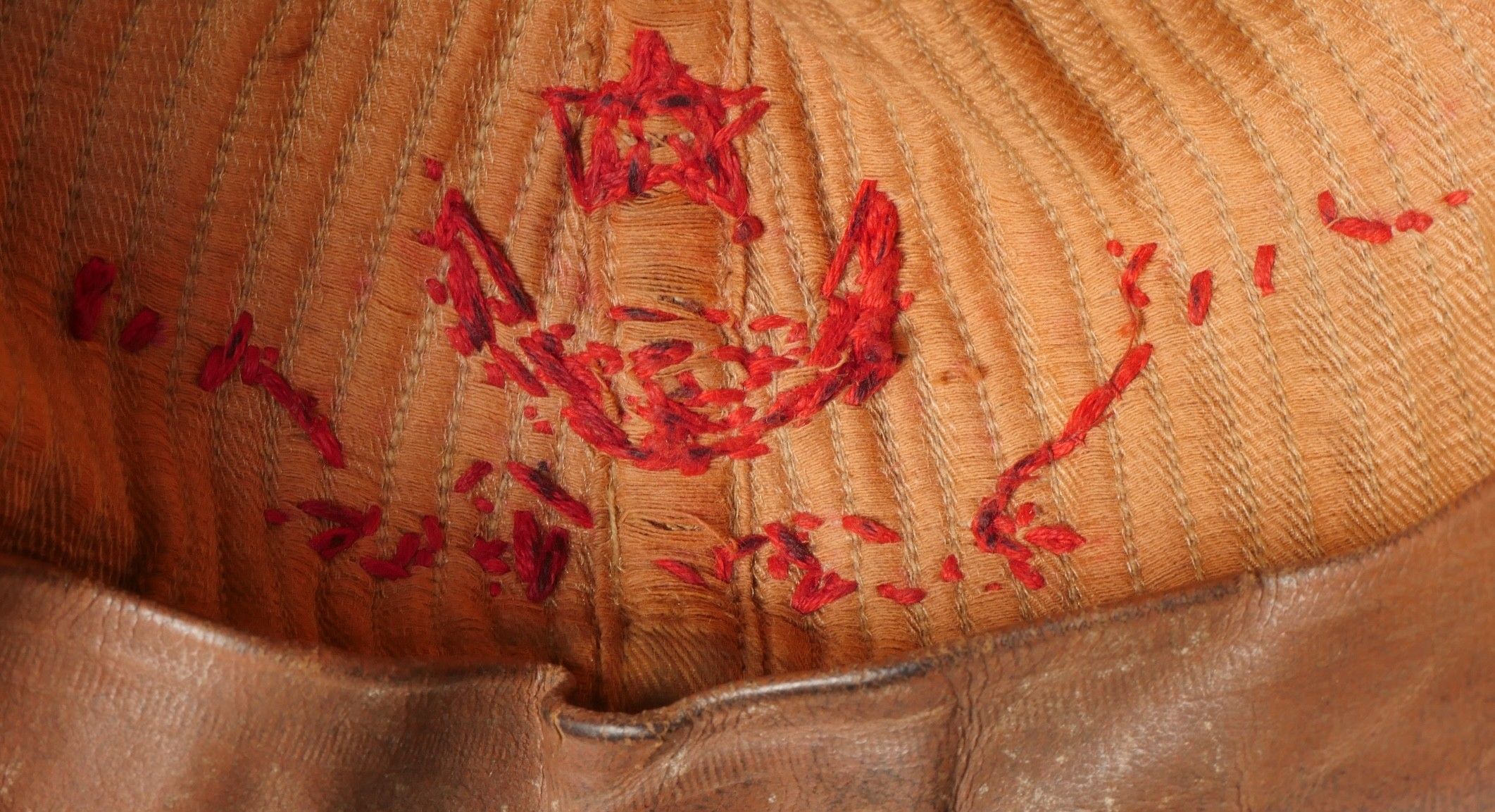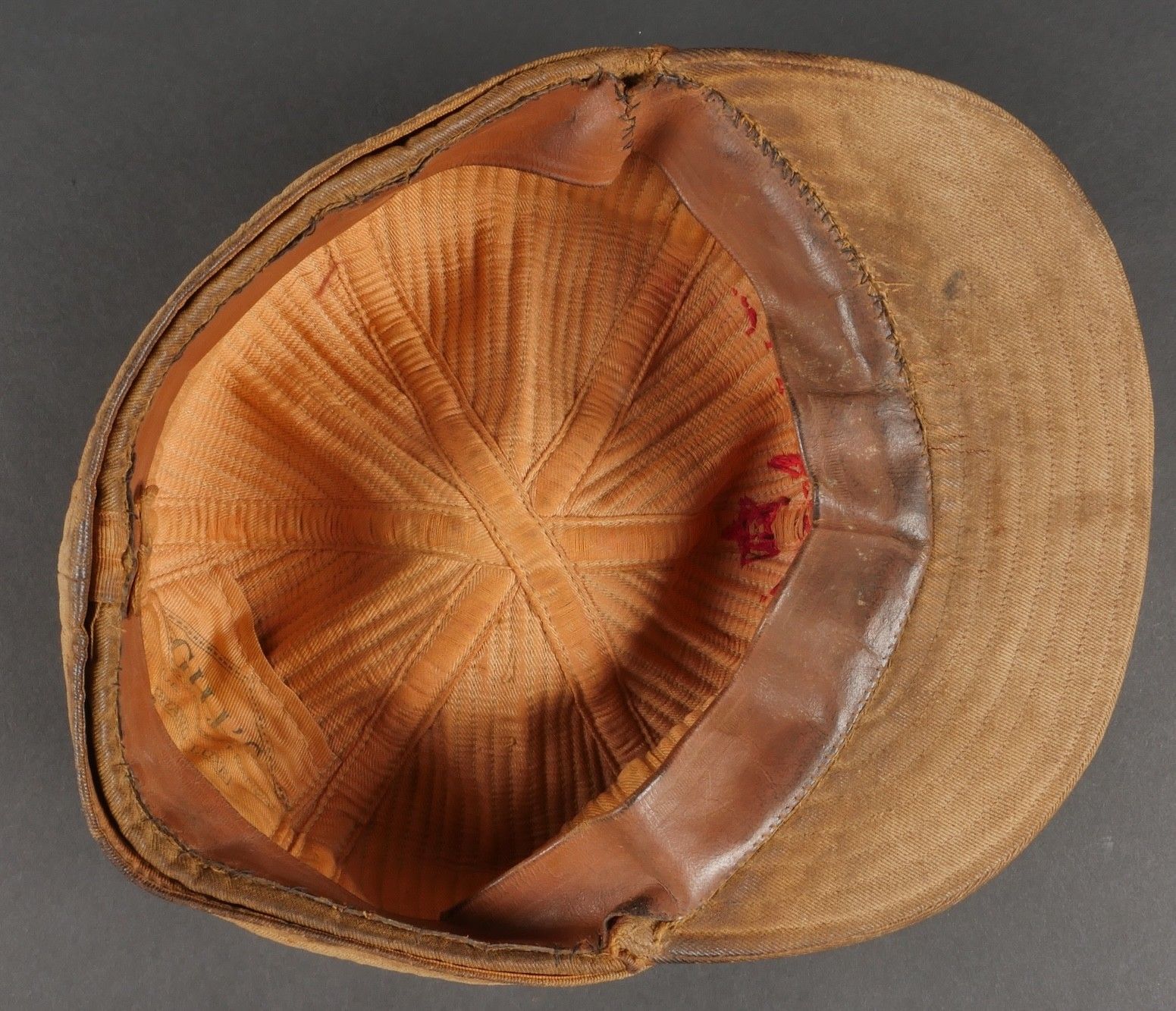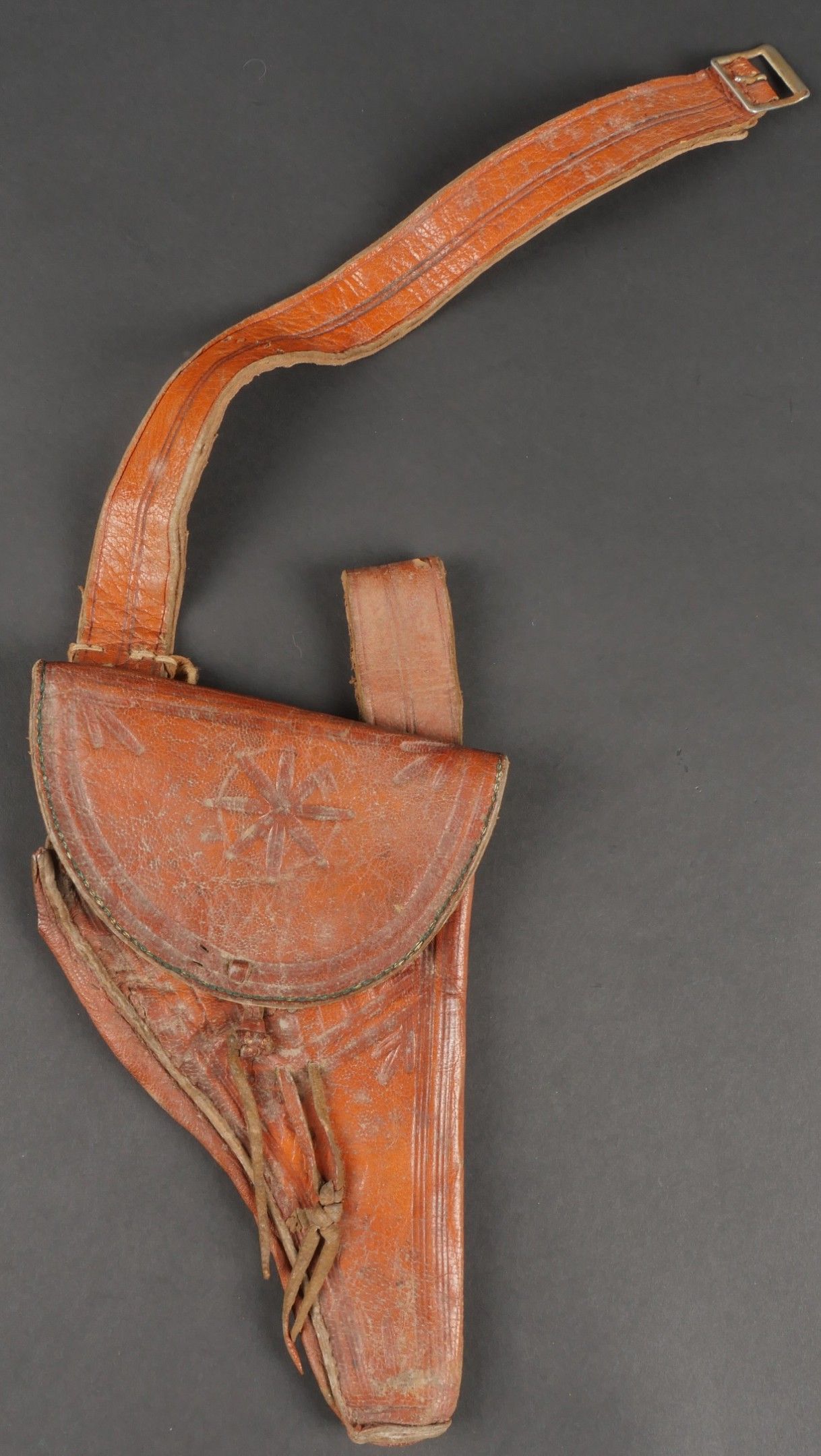Cap worn by an FLN rebel and recovered by Sub-Lieutenant Escoffier of the 31st Battalion of Chasseurs à pied. Entirely made of a strong light khaki canvas, the cap has flaps held by a small button on the front. Inside, a French manufacturer's label reads Gill's Marque Française Grand Luxe. Brown leather sweatband. The front of the cap is embroidered with the red crescent moon surmounted by the star, as well as a motto in Arabic. There is also a revolver holster recovered by Second Lieutenant Escoffier. The holster is made of brown leather and decorated in the oriental style. 2 belt loops on the back and a shoulder strap. Cap worn by an FLN rebel recovered by Second Lieutenant Escoffier 31st Infantry Battalion. Heavy light khaki canvas with folddown ear flaps buttoned front interior label Gill's Marque Française Grand Luxe. Brown leather sweatband. Red crescent and star embroidered at front with Arabic motto. Includes a brown leather revolver holster of oriental design with two belt loops and strap ring.