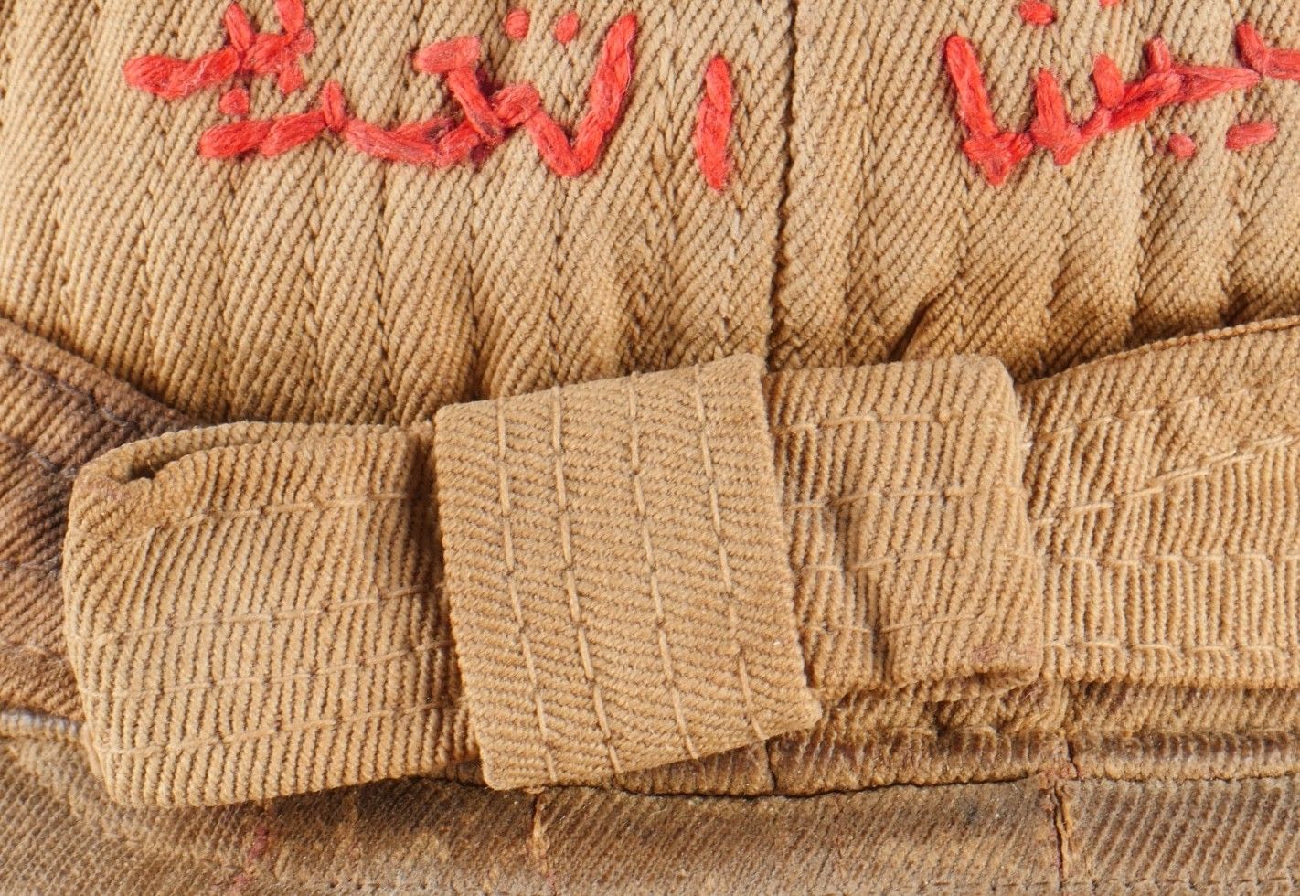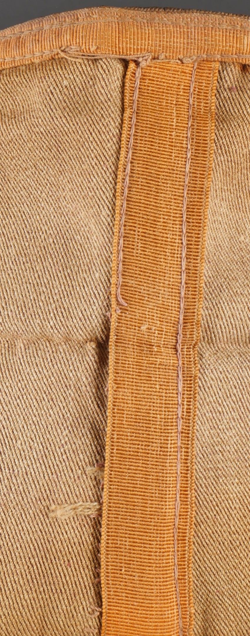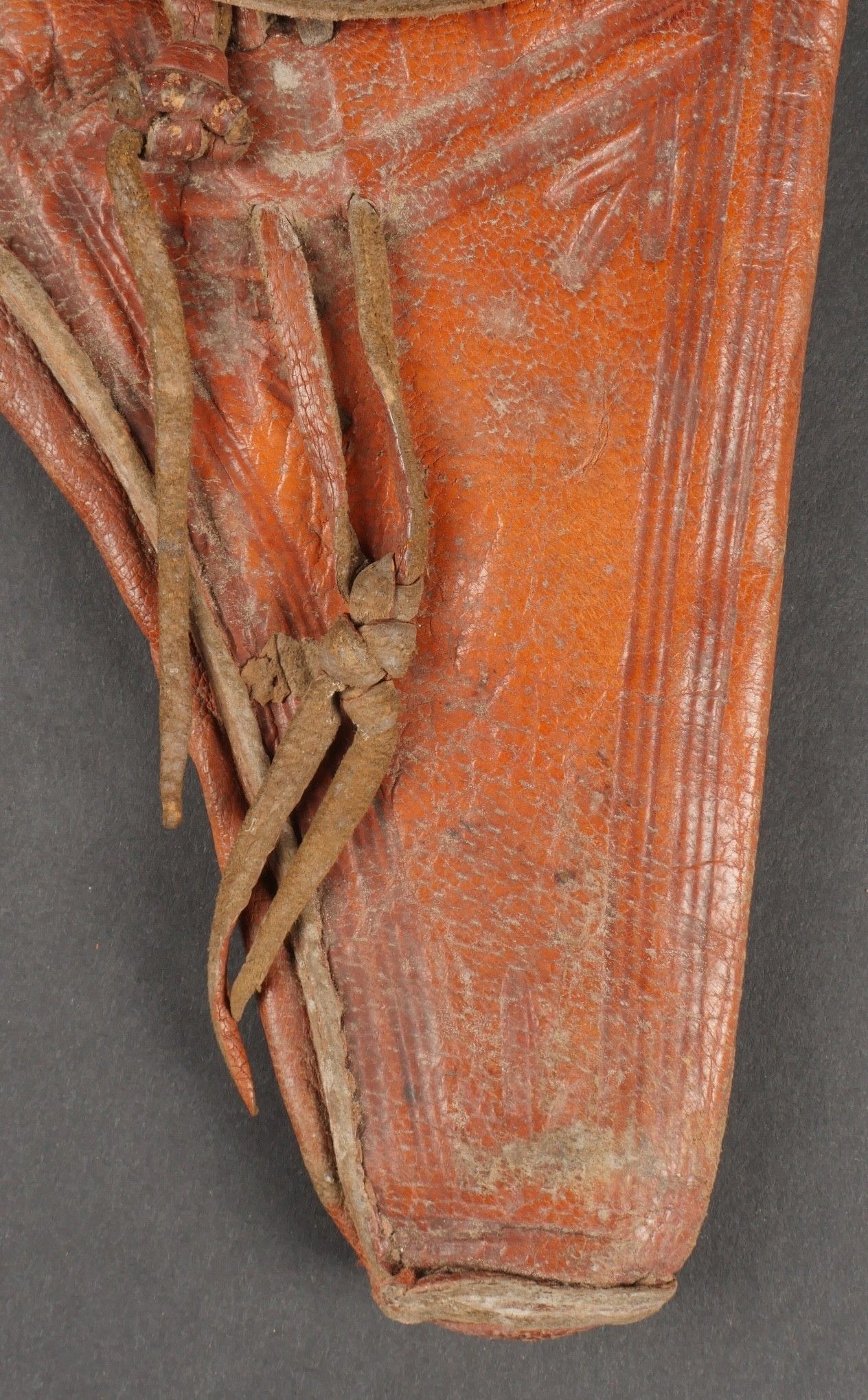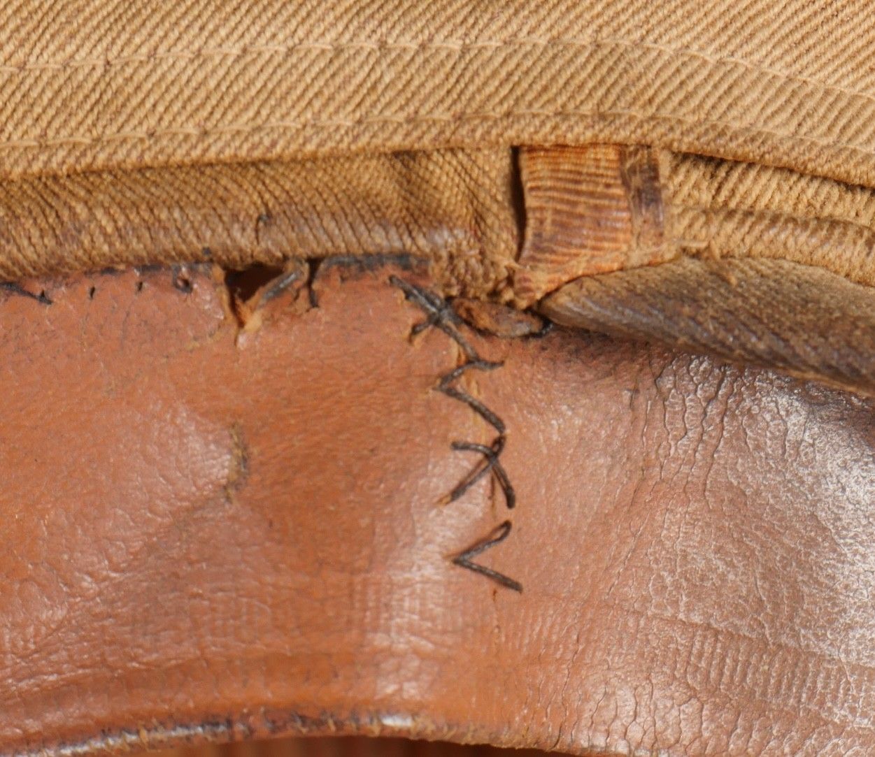 Cap worn by an FLN rebel and recovered by Sub-Lieutenant Escoffier of the 31st Battalion of Chasseurs à pied. Entirely made of a strong light khaki canvas, the cap has flaps held by a small button on the front. Inside, a French manufacturer's label reads Gill's Marque Française Grand Luxe. Brown leather sweatband. The front of the cap is embroidered with the red crescent moon surmounted by the star, as well as a motto in Arabic. There is also a revolver holster recovered by Second Lieutenant Escoffier. The holster is made of brown leather and decorated in the oriental style. 2 belt loops on the back and a shoulder strap. Cap worn by an FLN rebel recovered by Second Lieutenant Escoffier 31st Infantry Battalion. Heavy light khaki canvas with folddown ear flaps buttoned front interior label Gill's Marque Française Grand Luxe. Brown leather sweatband. Red crescent and star embroidered at front with Arabic motto. Includes a brown leather revolver holster of oriental design with two belt loops and strap ring.