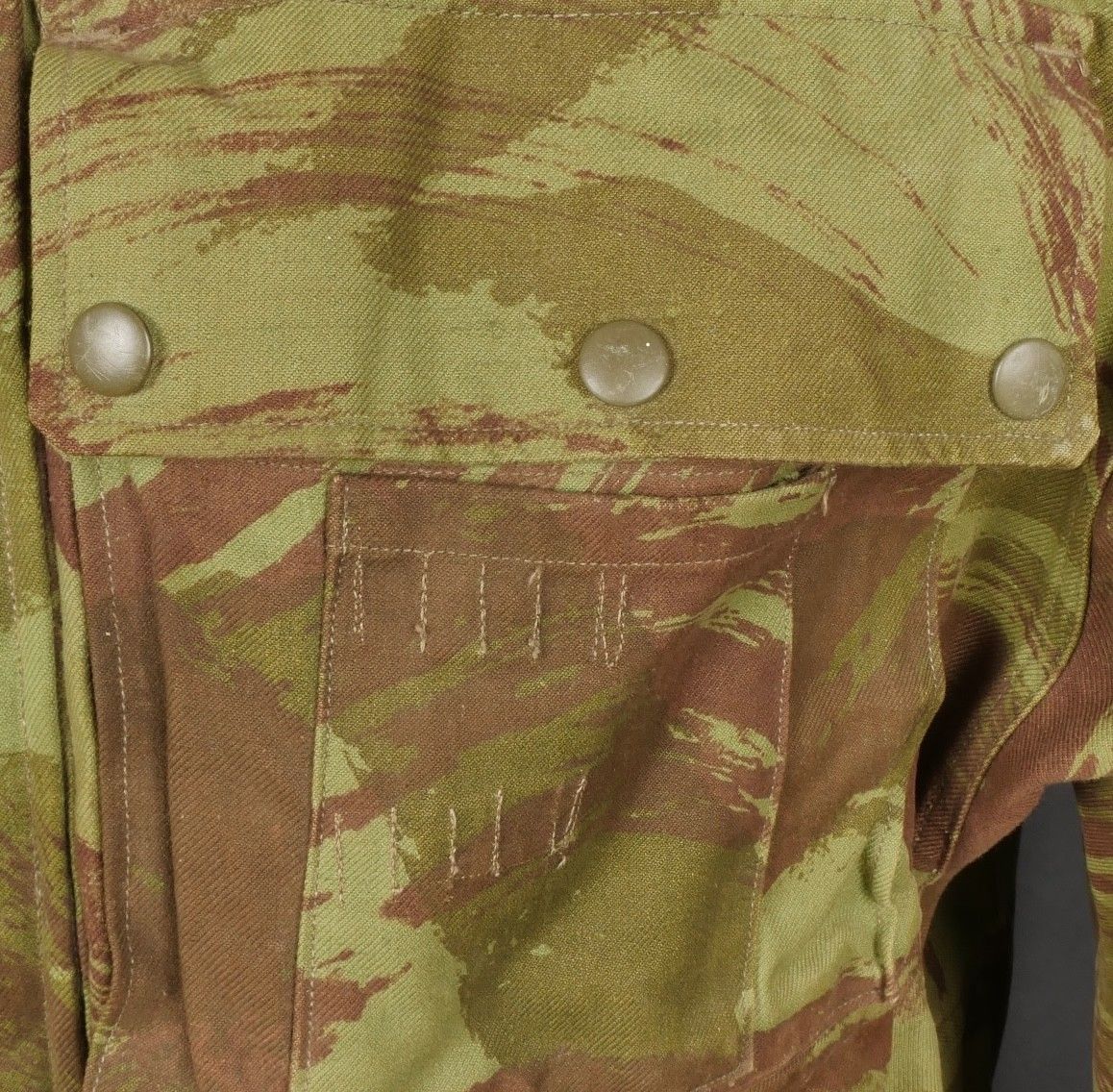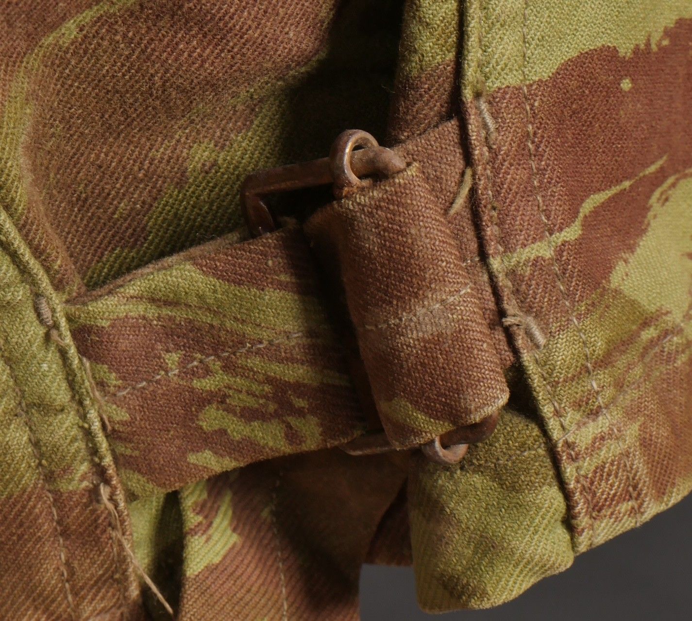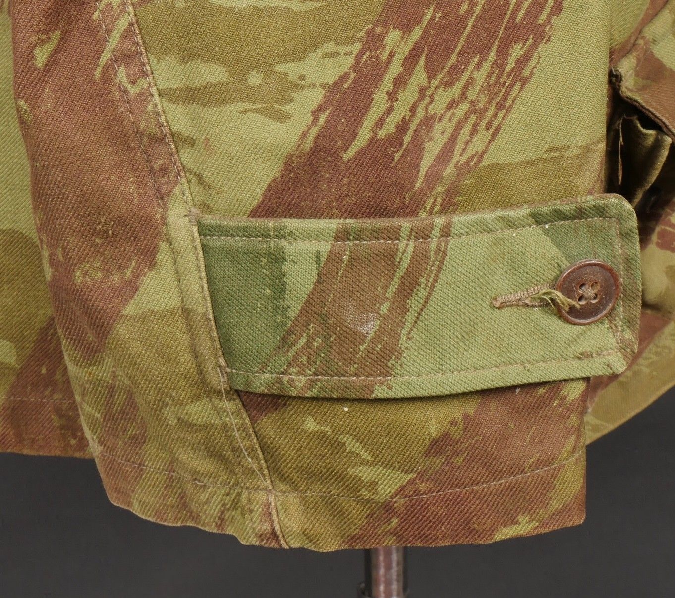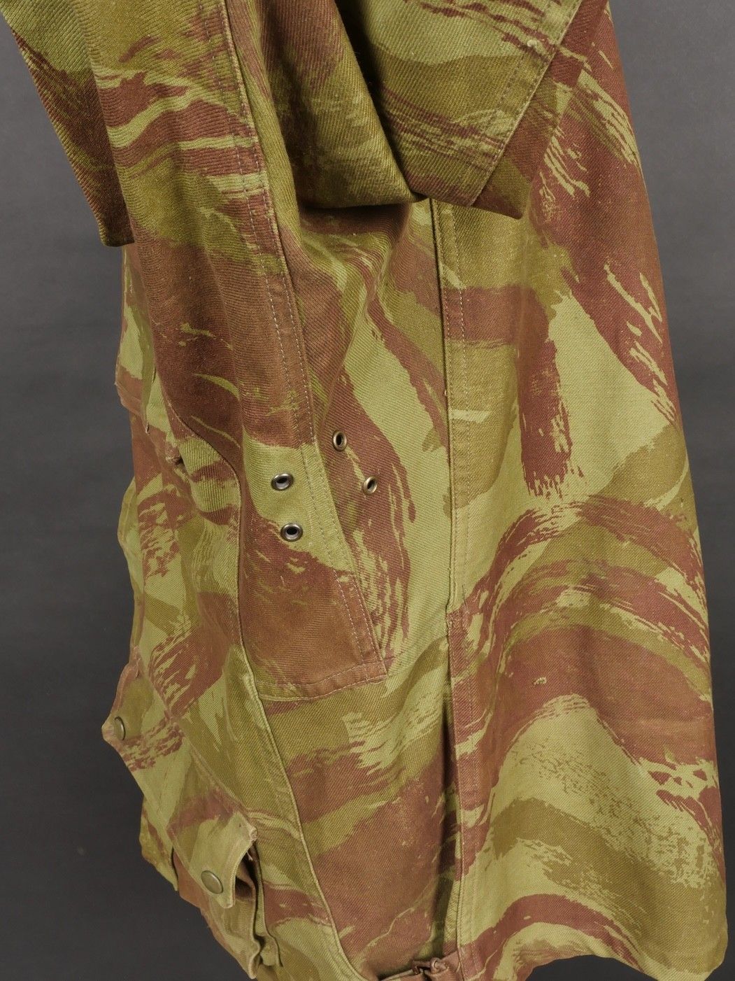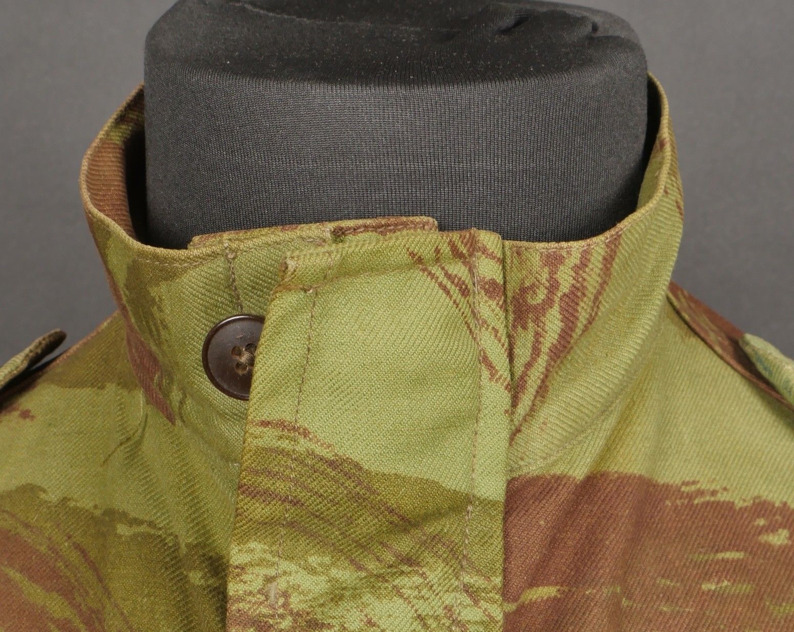 TAP 4754 jacket in camouflage fabric, fresh camouflage, functional painted press studs. Functional SPIDEX zip, one button missing. Stamp of the manufacturer Agostini in Saint Cloud present as well as a stamp of reception of the Army indicating the year 1954. Original sewn size 32 label. TAP 4754 camouflage jacket fresh colours functional painted snaps Spidex zipper intact one button missing maker Agostini SaintCloud army acceptance stamp dated 1954 original size tag 32.