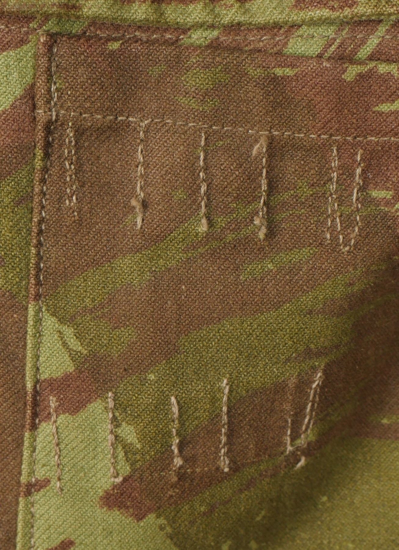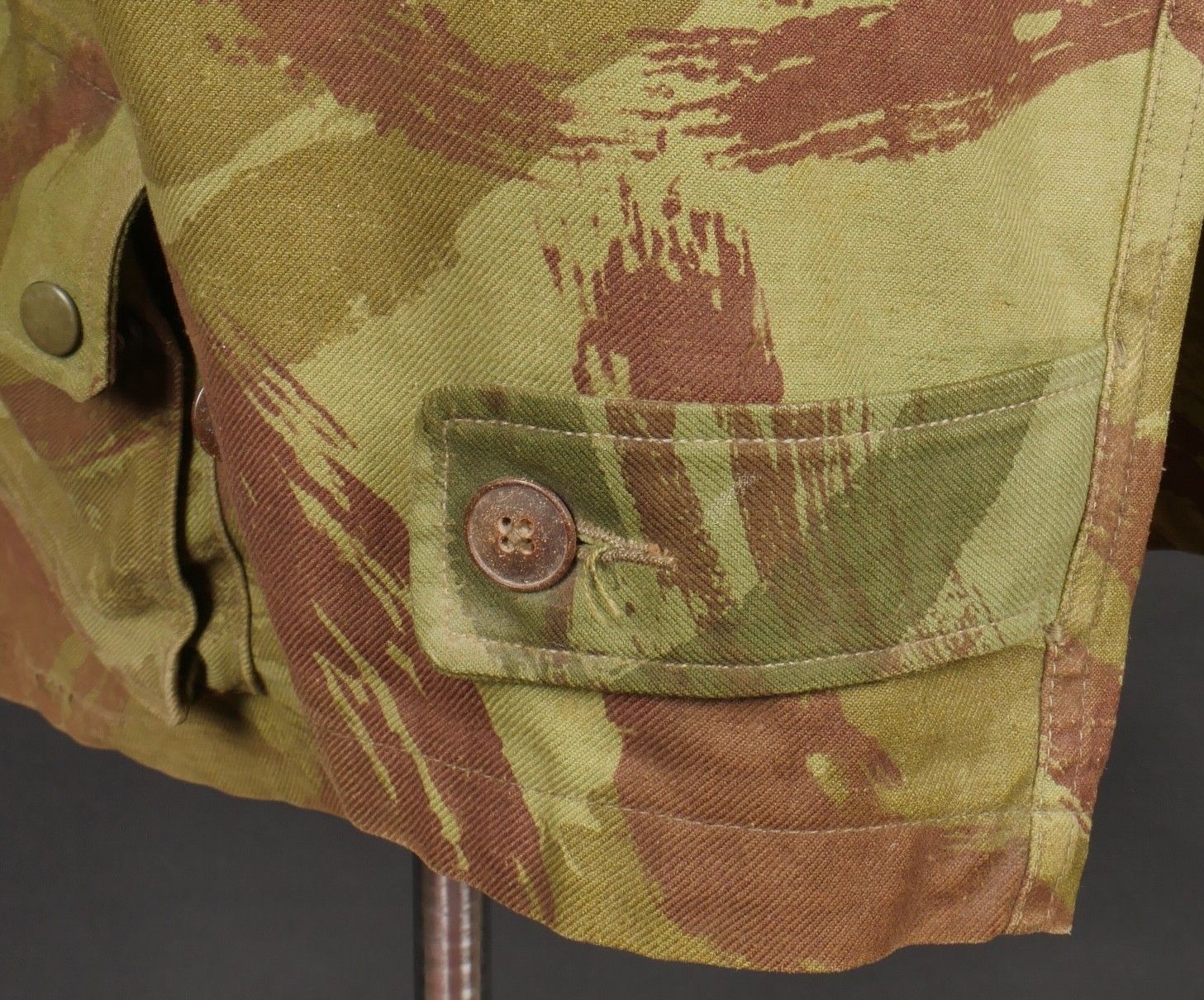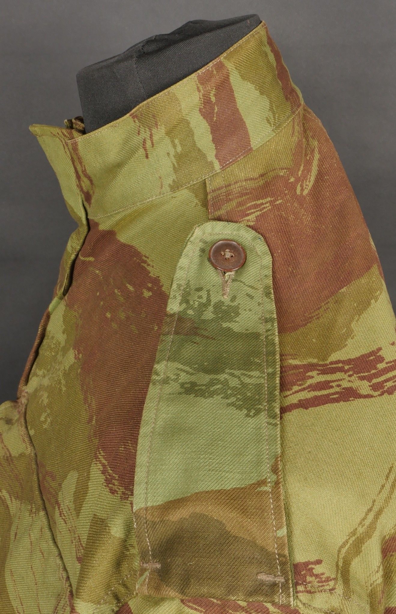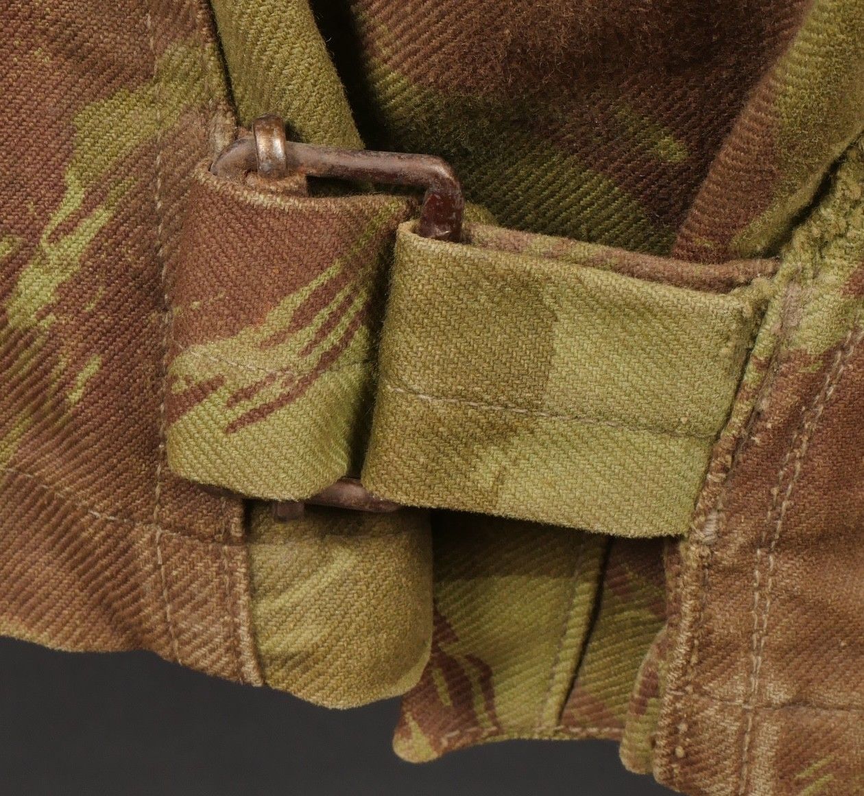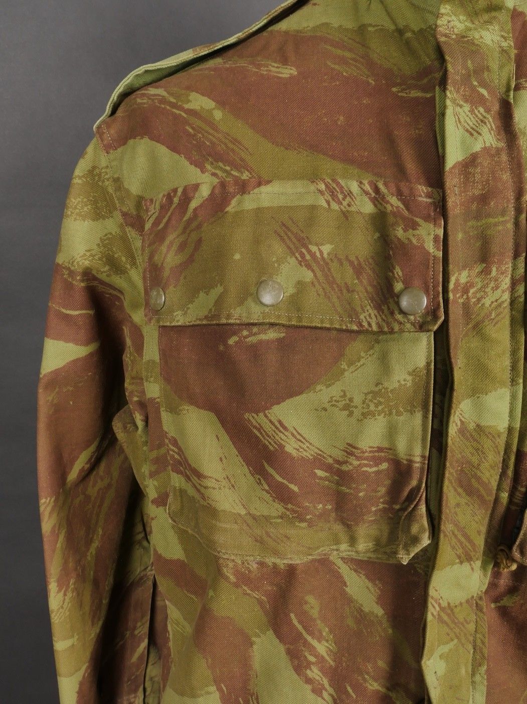 TAP 4754 jacket in camouflage fabric, fresh camouflage, functional painted press studs. Functional SPIDEX zip, one button missing. Stamp of the manufacturer Agostini in Saint Cloud present as well as a stamp of reception of the Army indicating the year 1954. Original sewn size 32 label. TAP 4754 camouflage jacket fresh colours functional painted snaps Spidex zipper intact one button missing maker Agostini SaintCloud army acceptance stamp dated 1954 original size tag 32.