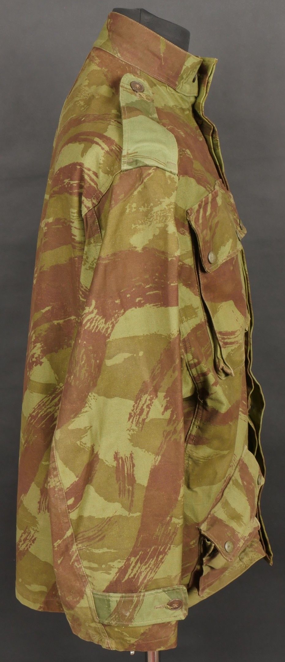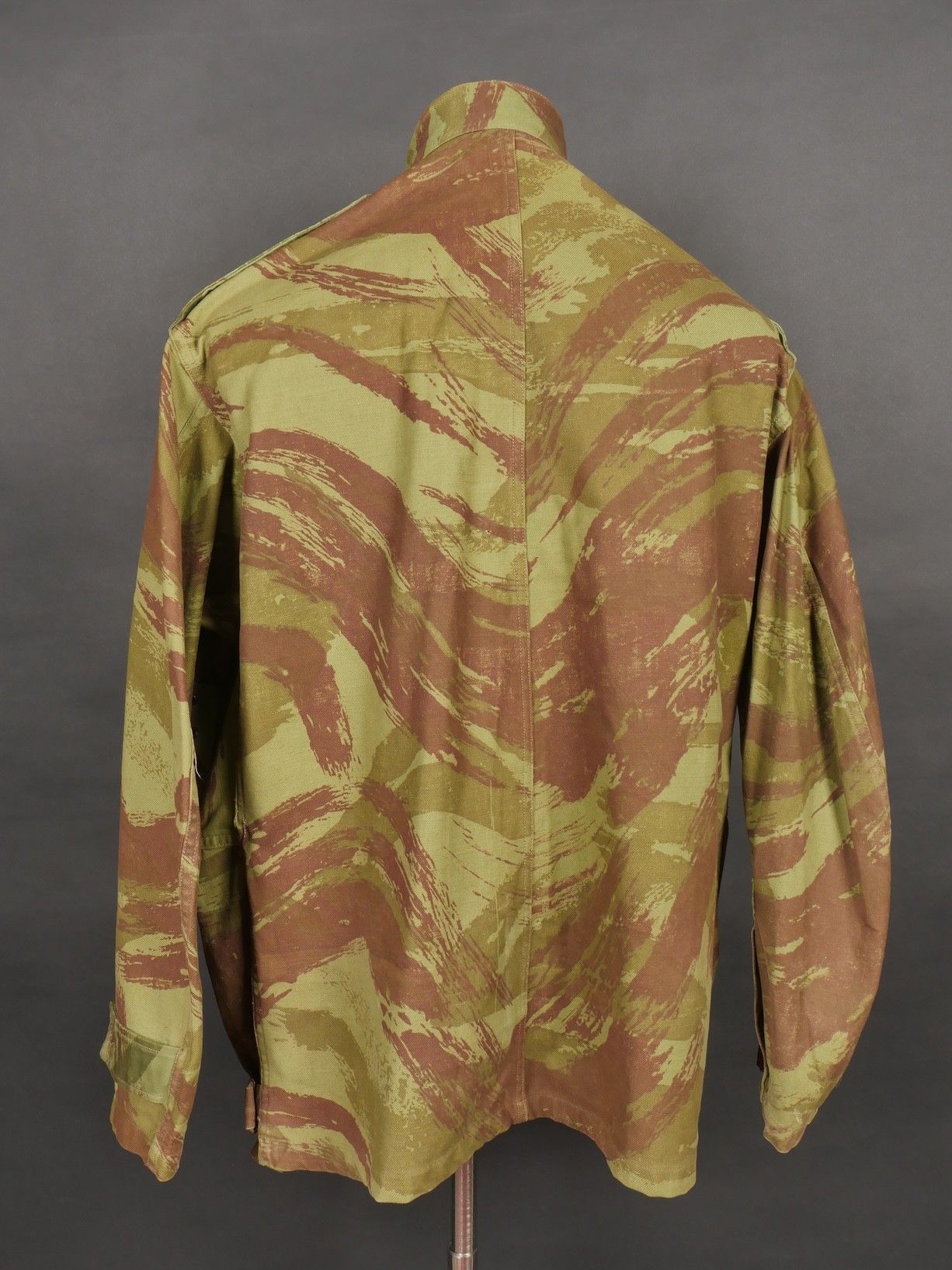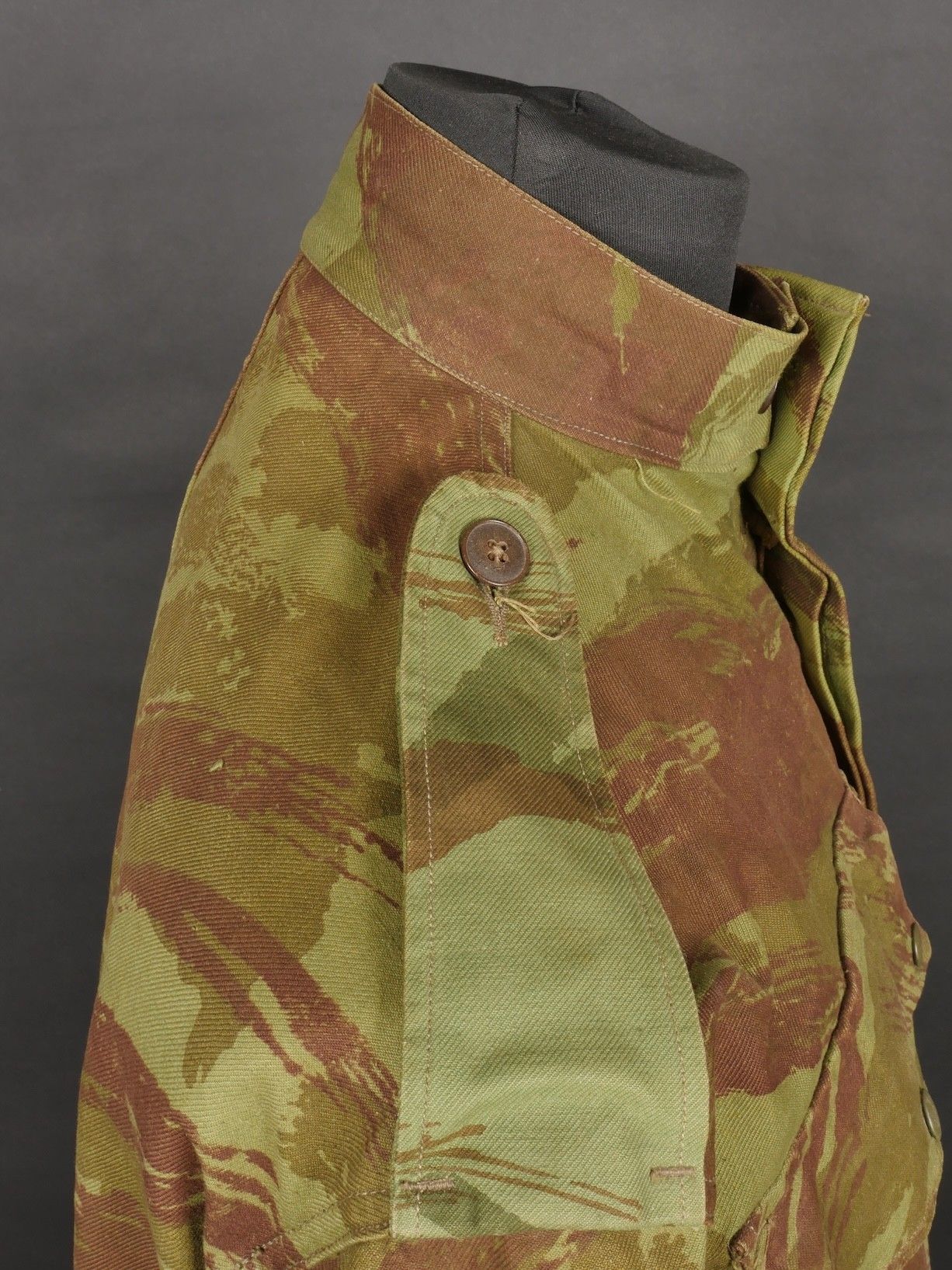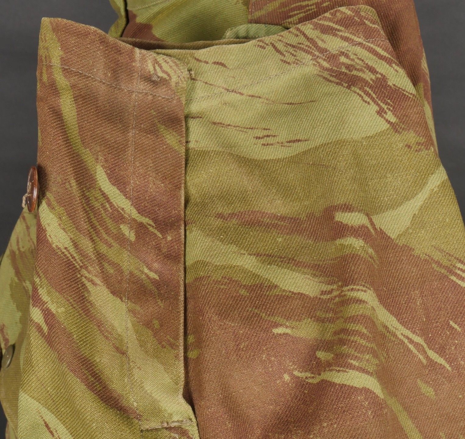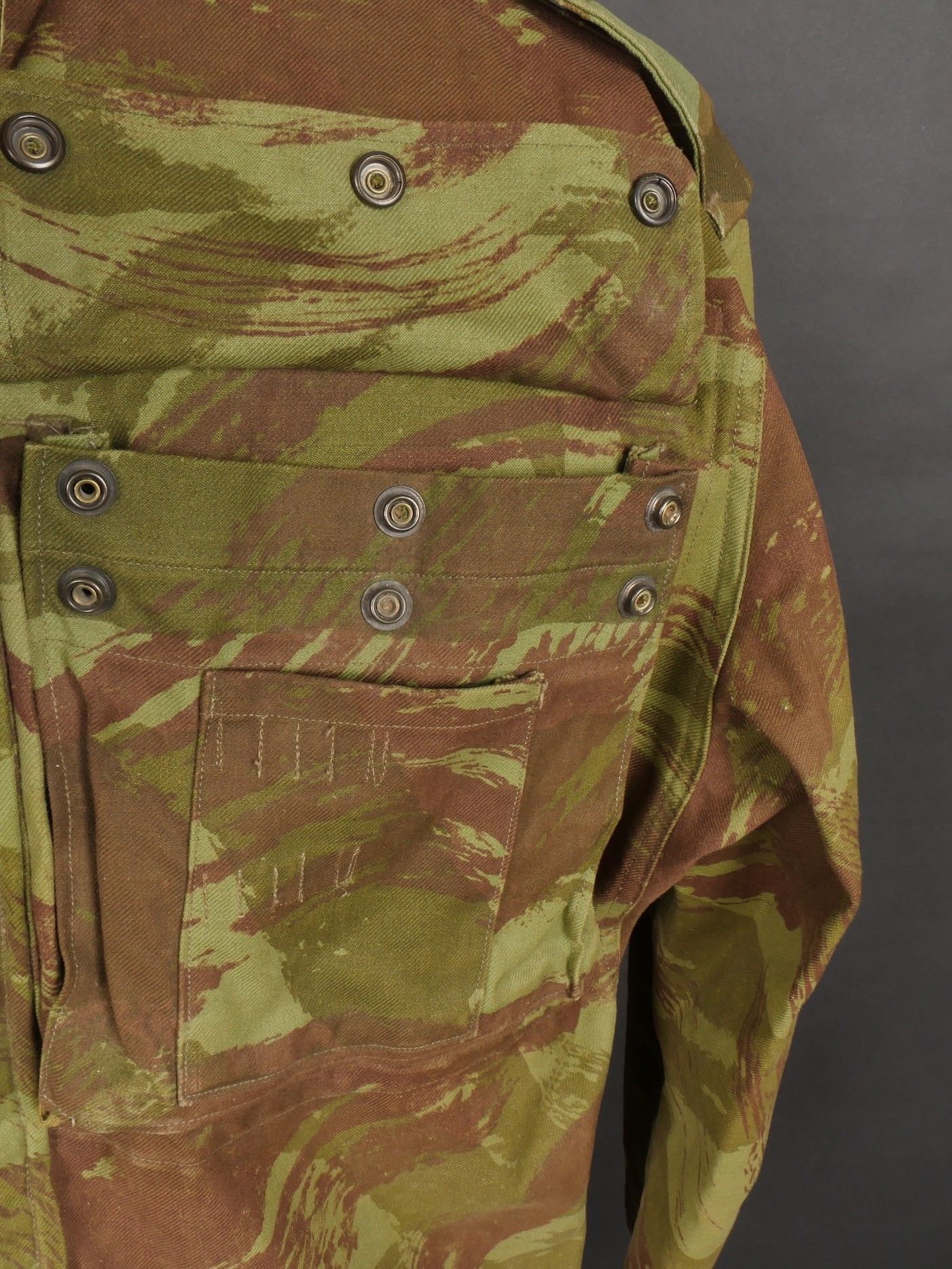 TAP 4754 jacket in camouflage fabric, fresh camouflage, functional painted press studs. Functional SPIDEX zip, one button missing. Stamp of the manufacturer Agostini in Saint Cloud present as well as a stamp of reception of the Army indicating the year 1954. Original sewn size 32 label. TAP 4754 camouflage jacket fresh colours functional painted snaps Spidex zipper intact one button missing maker Agostini SaintCloud army acceptance stamp dated 1954 original size tag 32.