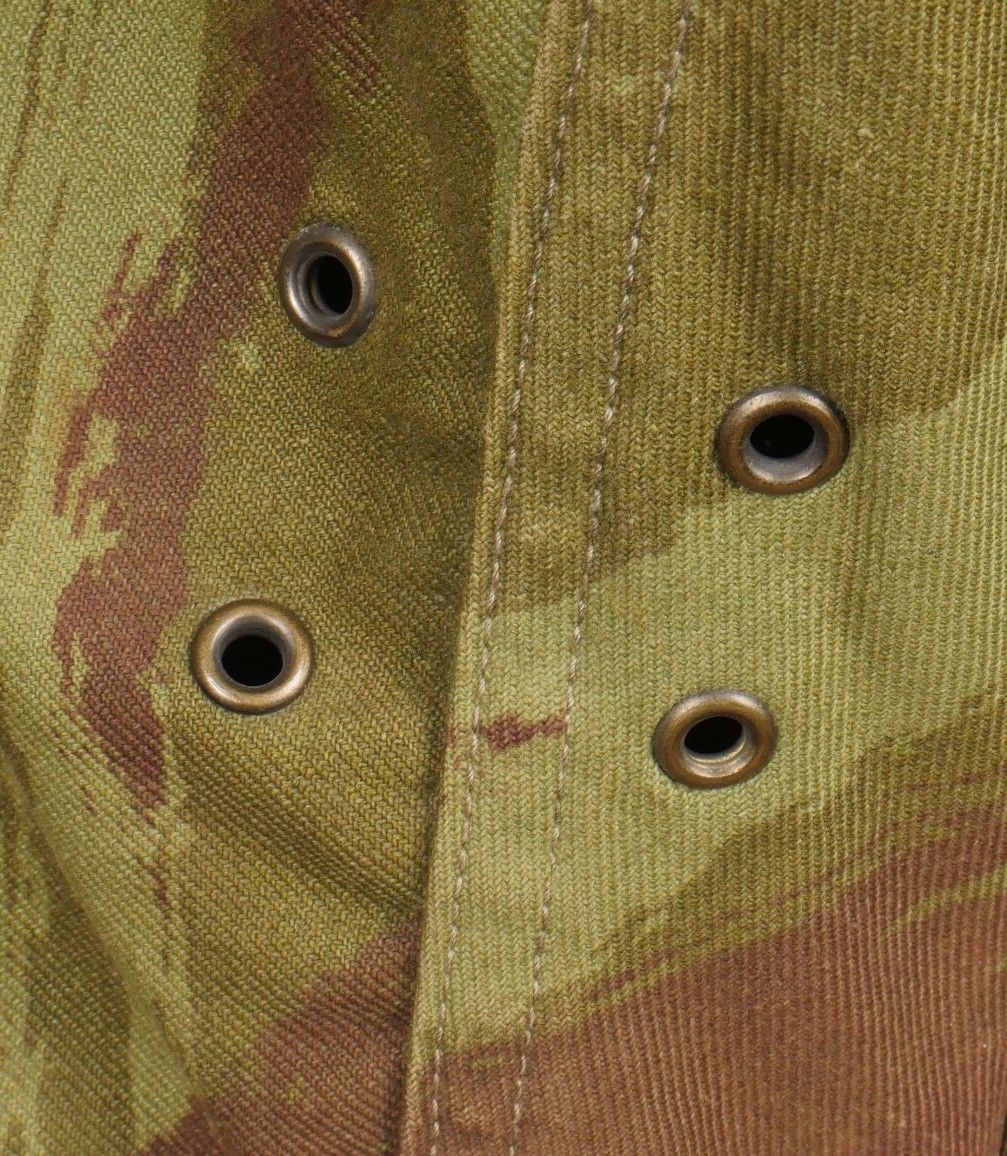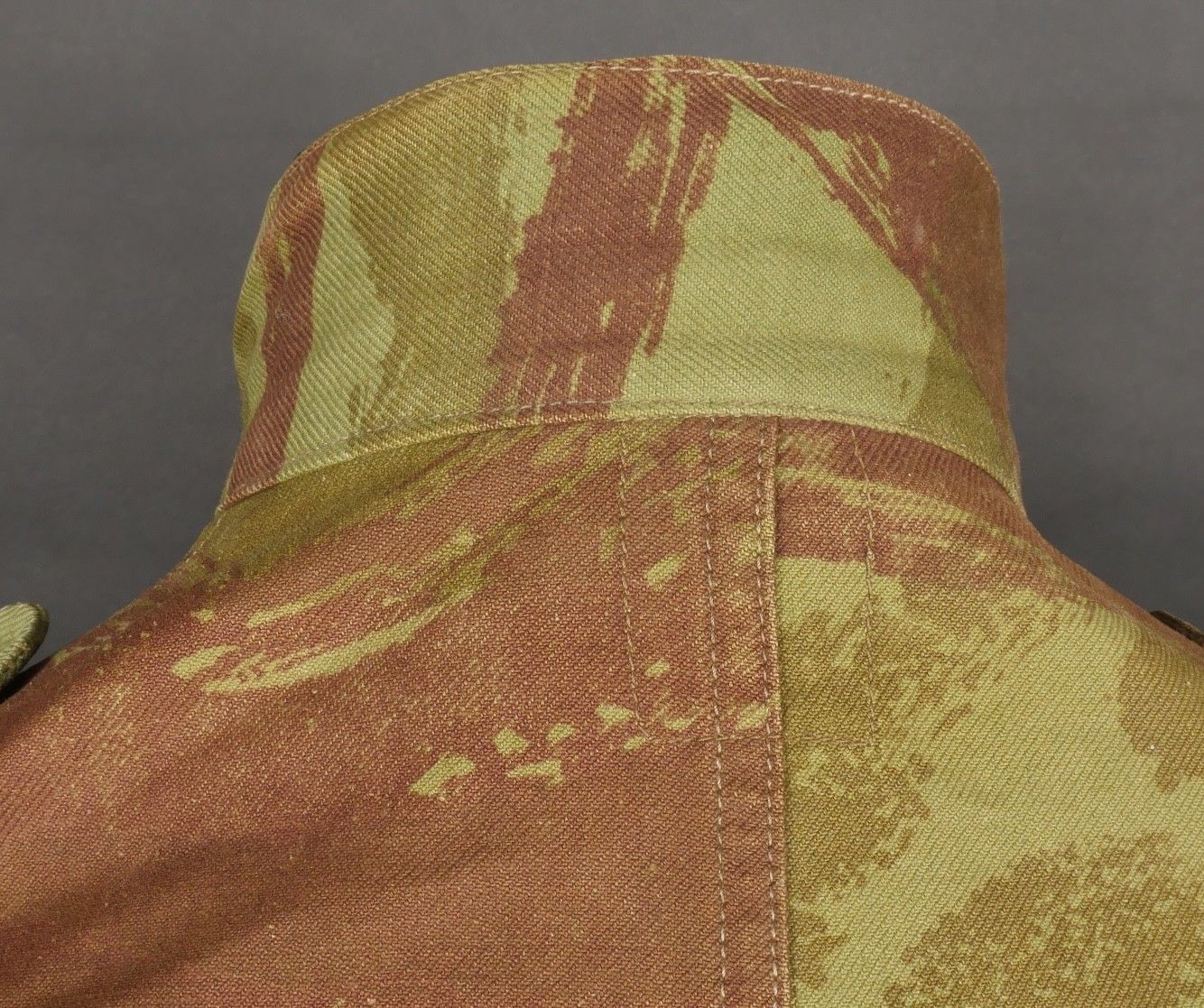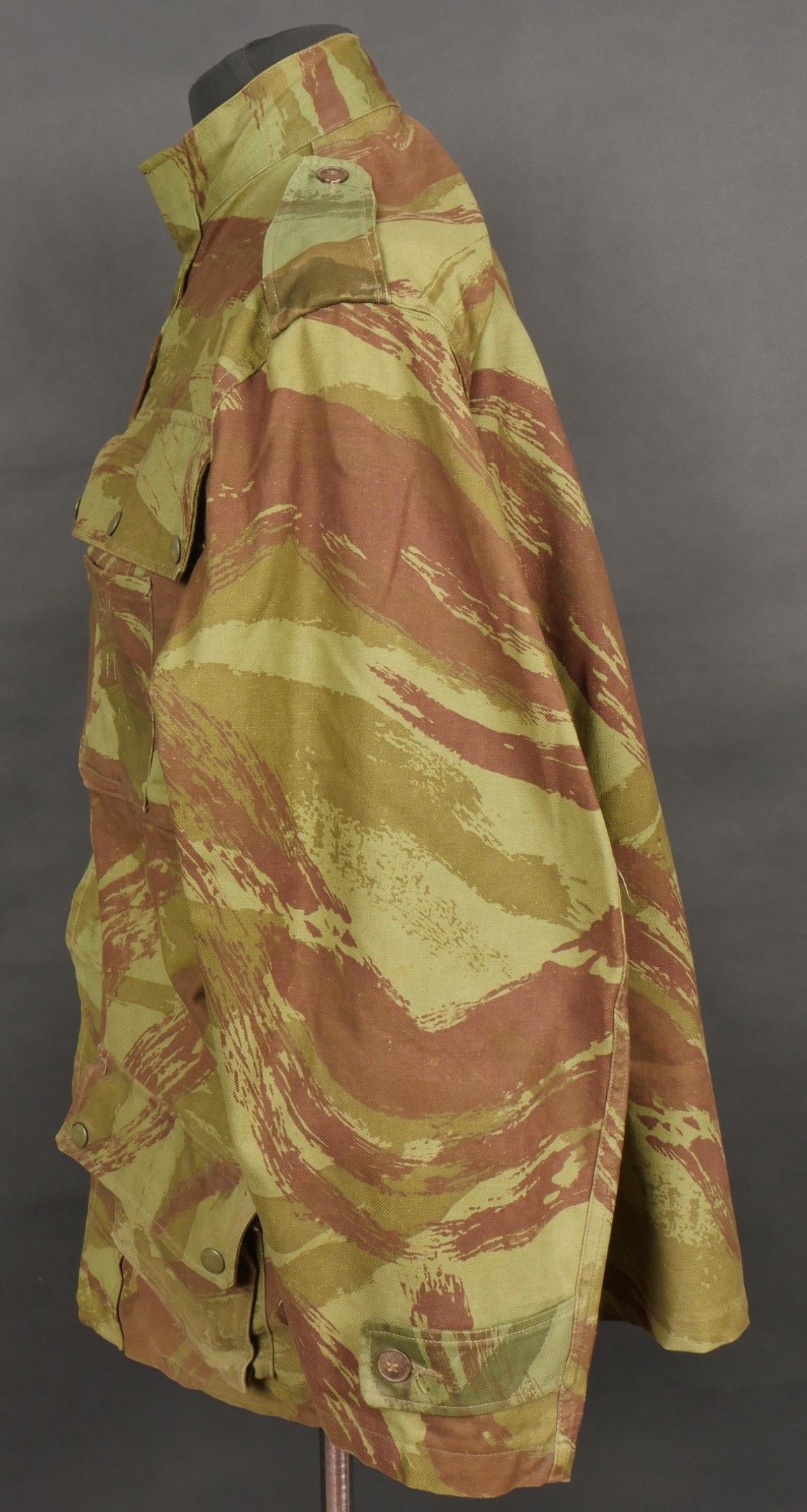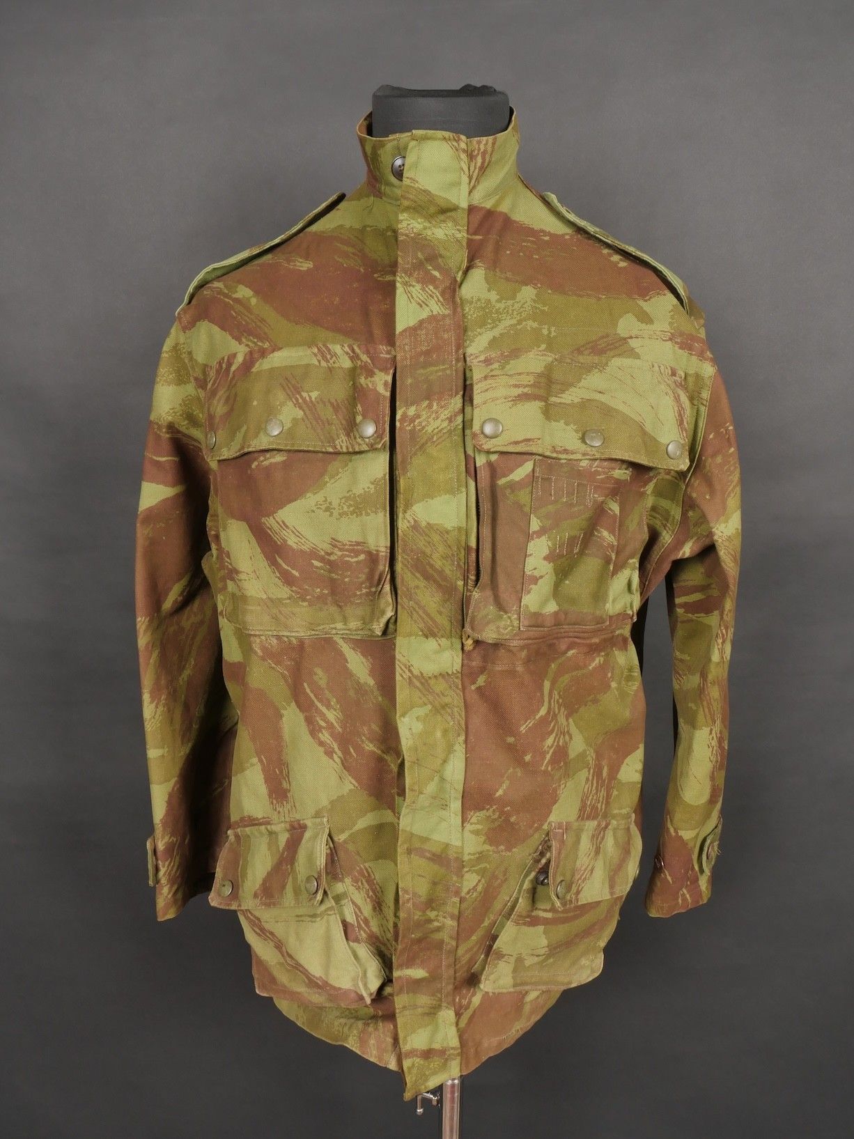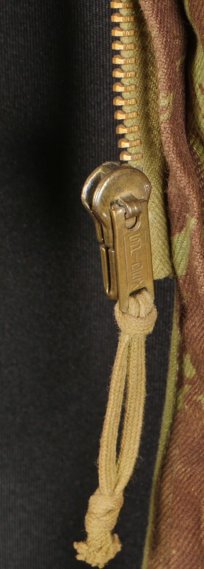 TAP 4754 jacket in camouflage fabric, fresh camouflage, functional painted press studs. Functional SPIDEX zip, one button missing. Stamp of the manufacturer Agostini in Saint Cloud present as well as a stamp of reception of the Army indicating the year 1954. Original sewn size 32 label. TAP 4754 camouflage jacket fresh colours functional painted snaps Spidex zipper intact one button missing maker Agostini SaintCloud army acceptance stamp dated 1954 original size tag 32.