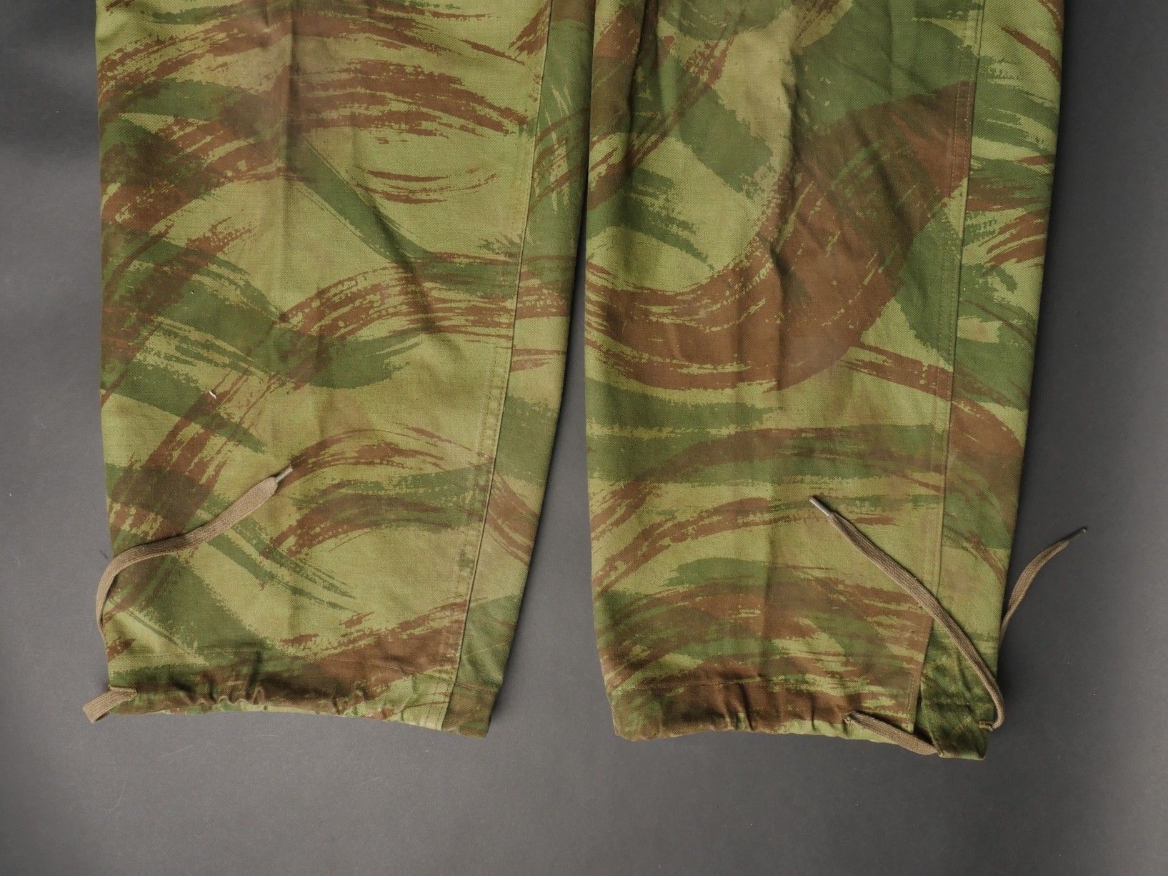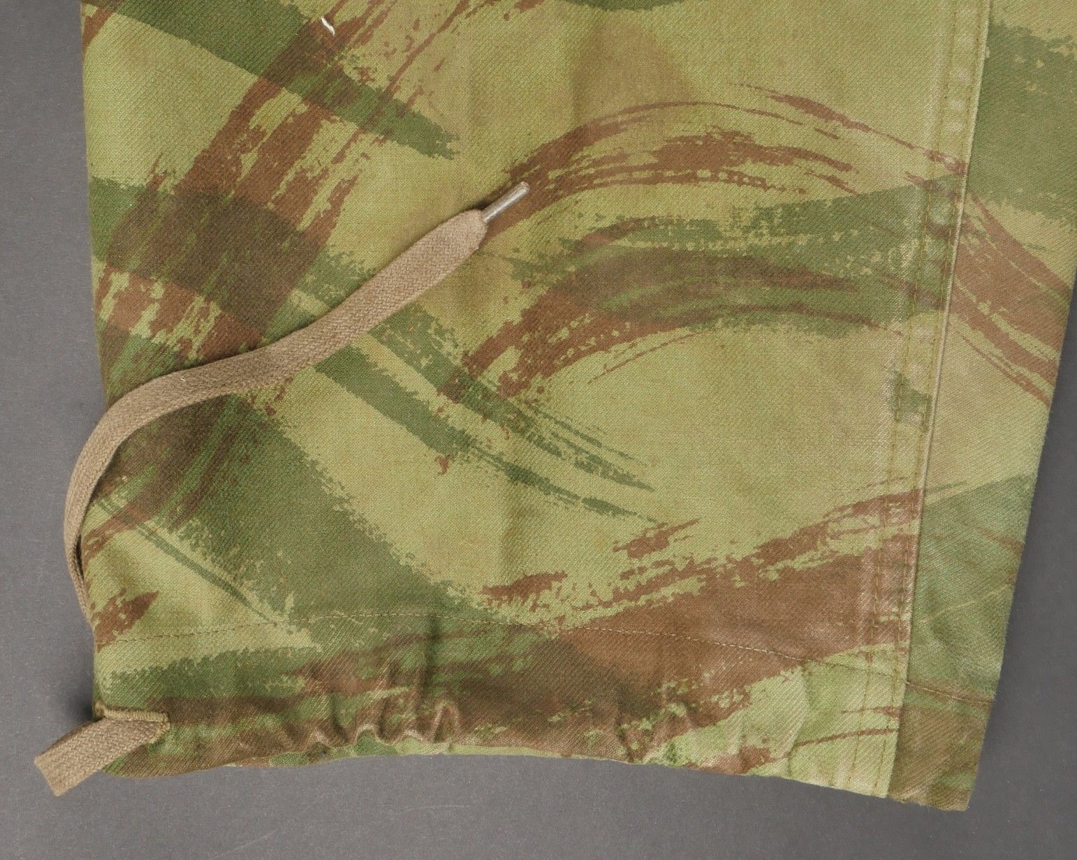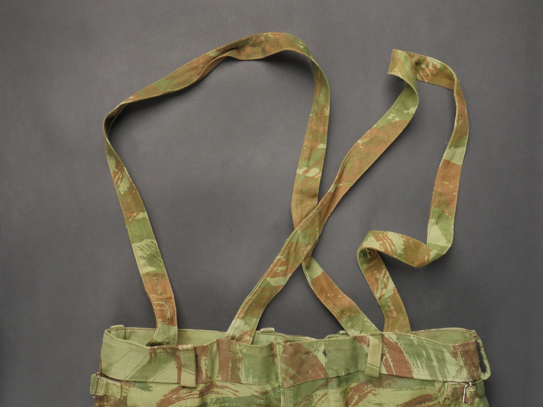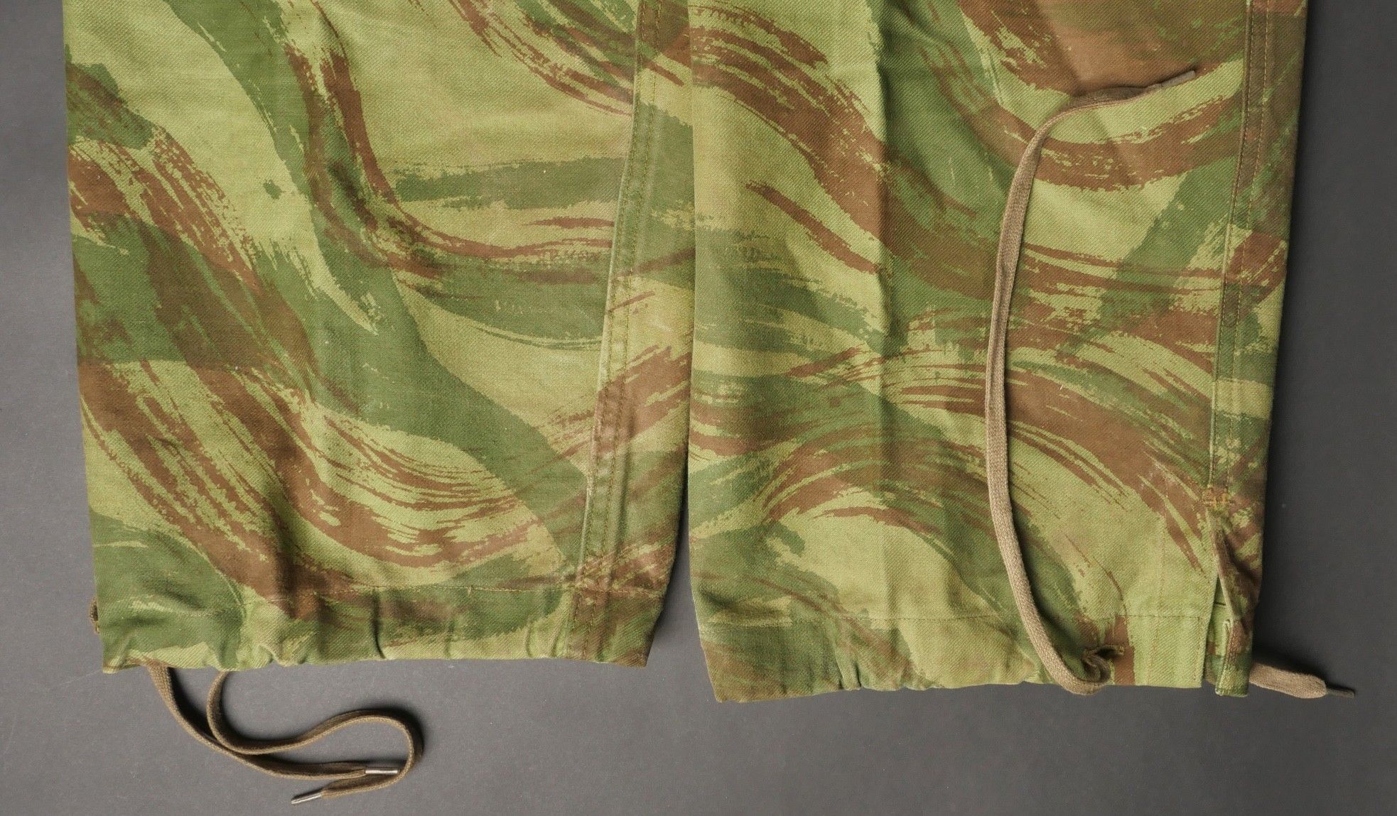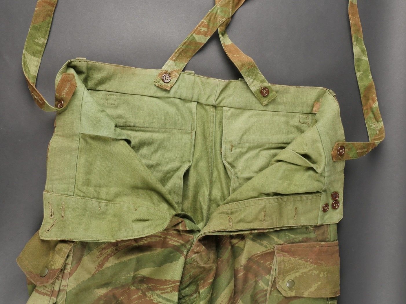 Nice pair of TAP 4753 trousers in camouflaged canvas, small model press studs in original paint, Vitex zip. Stamps of a manufacturer in Caussade as well as a stamp of reception indicating the year 54. Size stamp indicating 35. Original sewn hip straps. All the original buttons are present, only one button is sewn back on, as are the tightening laces. The camouflaged straps of model 4753 are also present. In superb condition, fresh camouflage, very little wear. Fine TAP 4753 trousers camouflage canvas with small painted snaps functional Eclair zipper maker Caussade and army stamp dated 1954 size 35 side tabs original all buttons present one restitched lace ties at ankles with matching 4753 camouflage braces. Excellent condition fresh camouflage little wear.