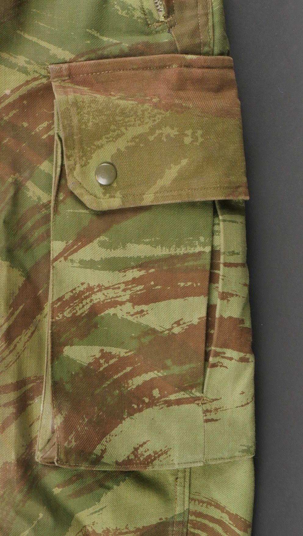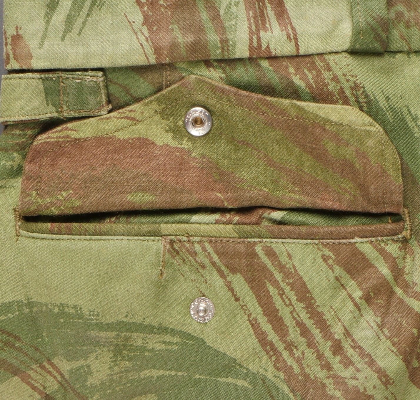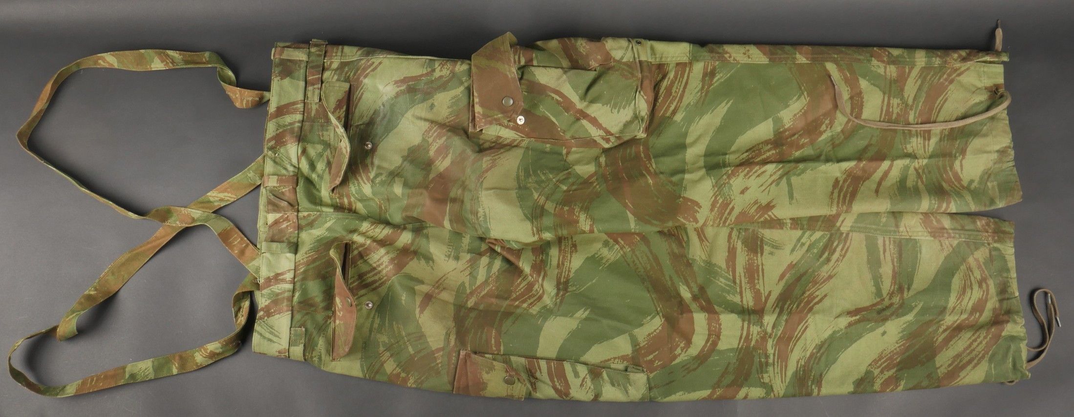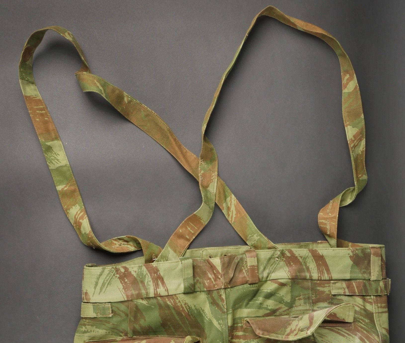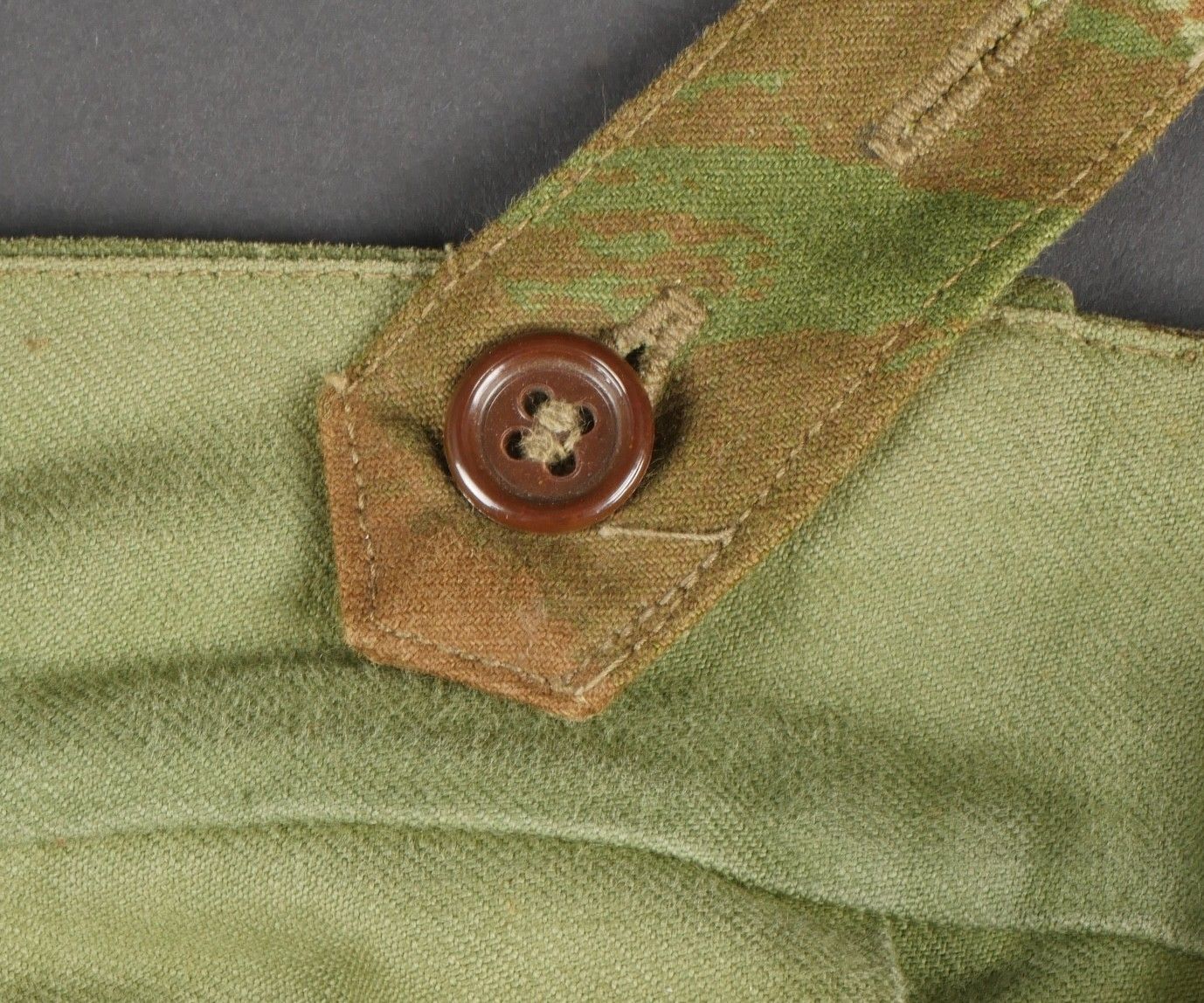 Nice pair of TAP 4753 trousers in camouflaged canvas, small model press studs in original paint, Vitex zip. Stamps of a manufacturer in Caussade as well as a stamp of reception indicating the year 54. Size stamp indicating 35. Original sewn hip straps. All the original buttons are present, only one button is sewn back on, as are the tightening laces. The camouflaged straps of model 4753 are also present. In superb condition, fresh camouflage, very little wear. Fine TAP 4753 trousers camouflage canvas with small painted snaps functional Eclair zipper maker Caussade and army stamp dated 1954 size 35 side tabs original all buttons present one restitched lace ties at ankles with matching 4753 camouflage braces. Excellent condition fresh camouflage little wear.