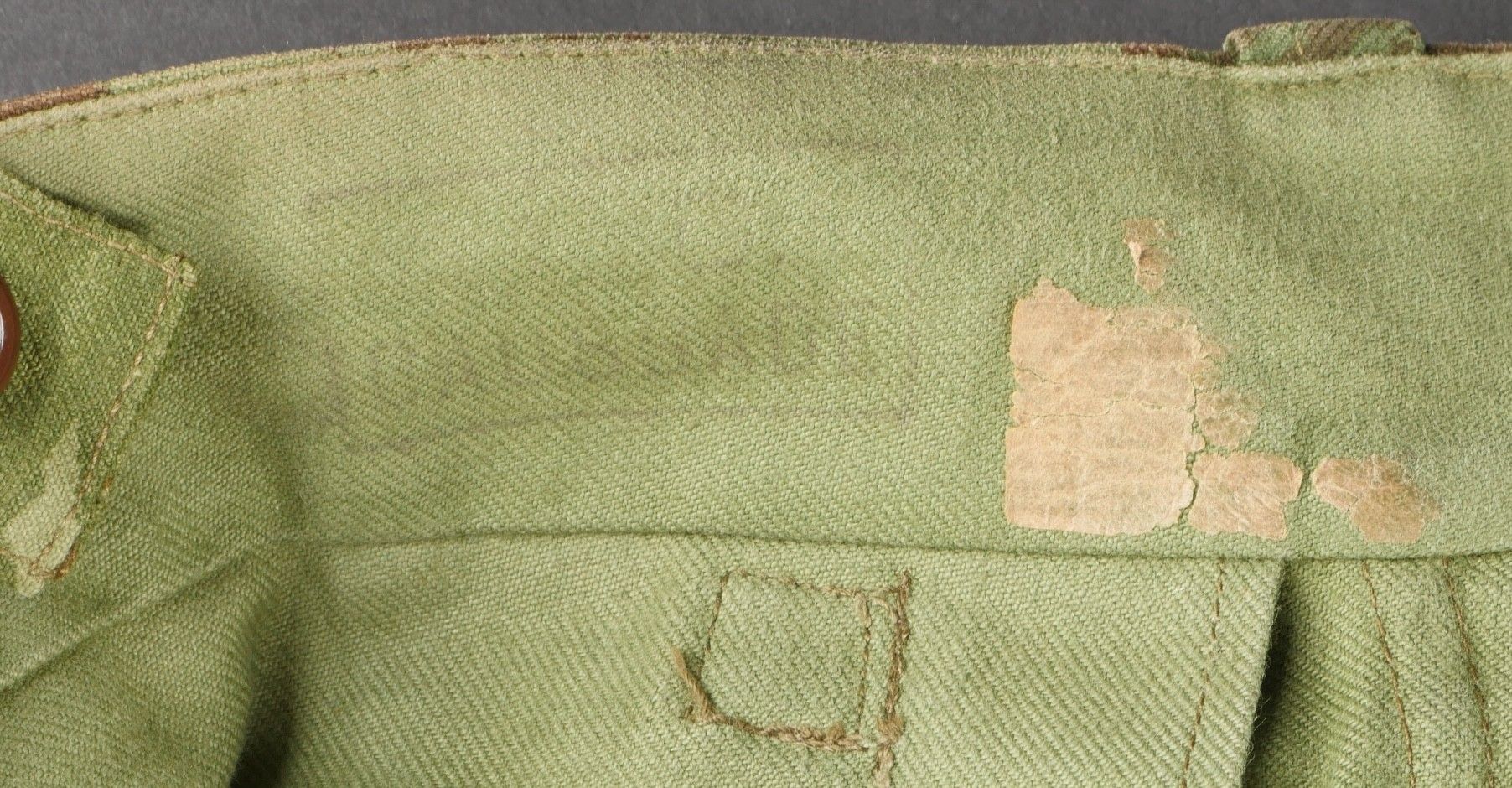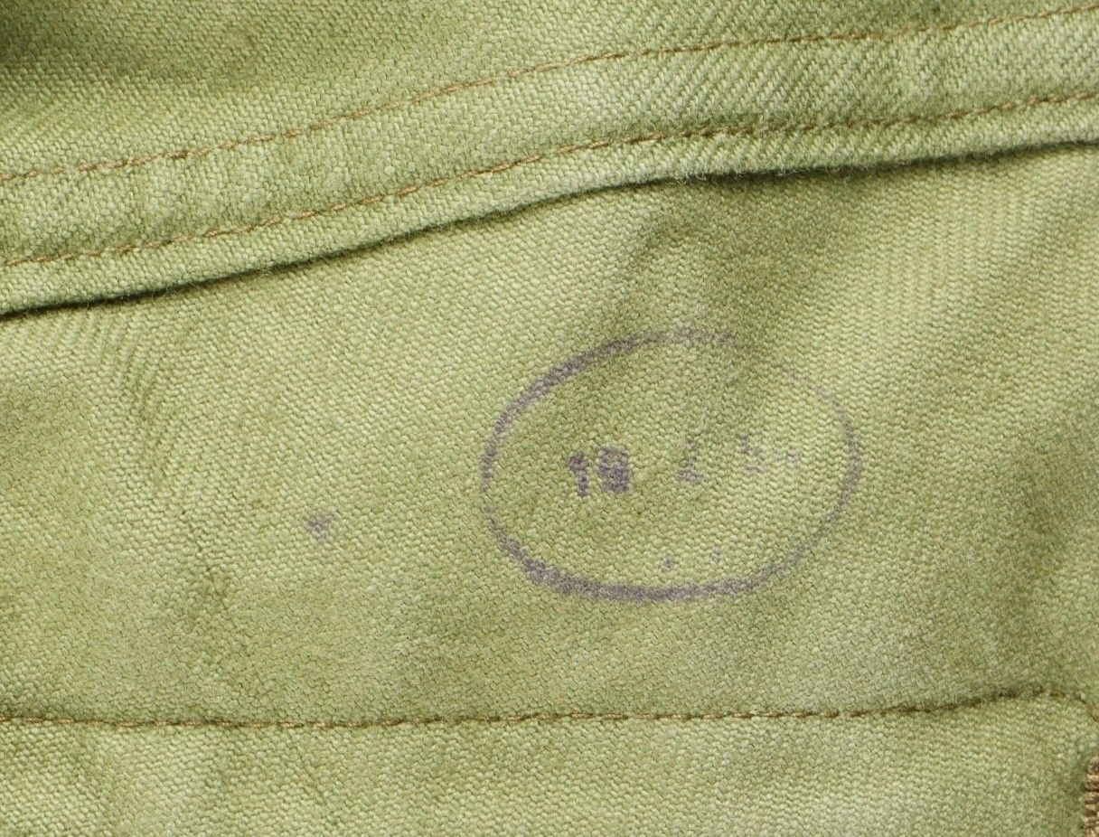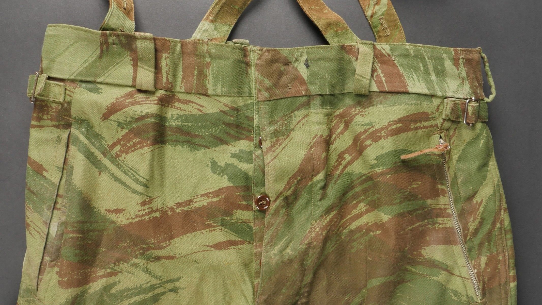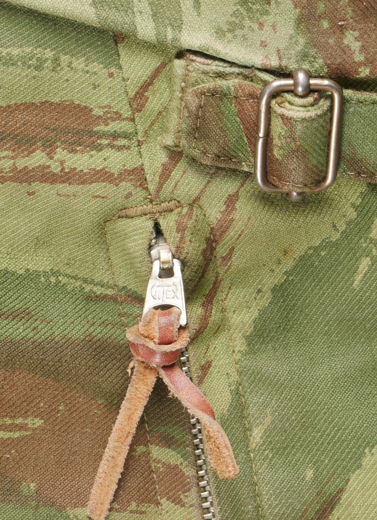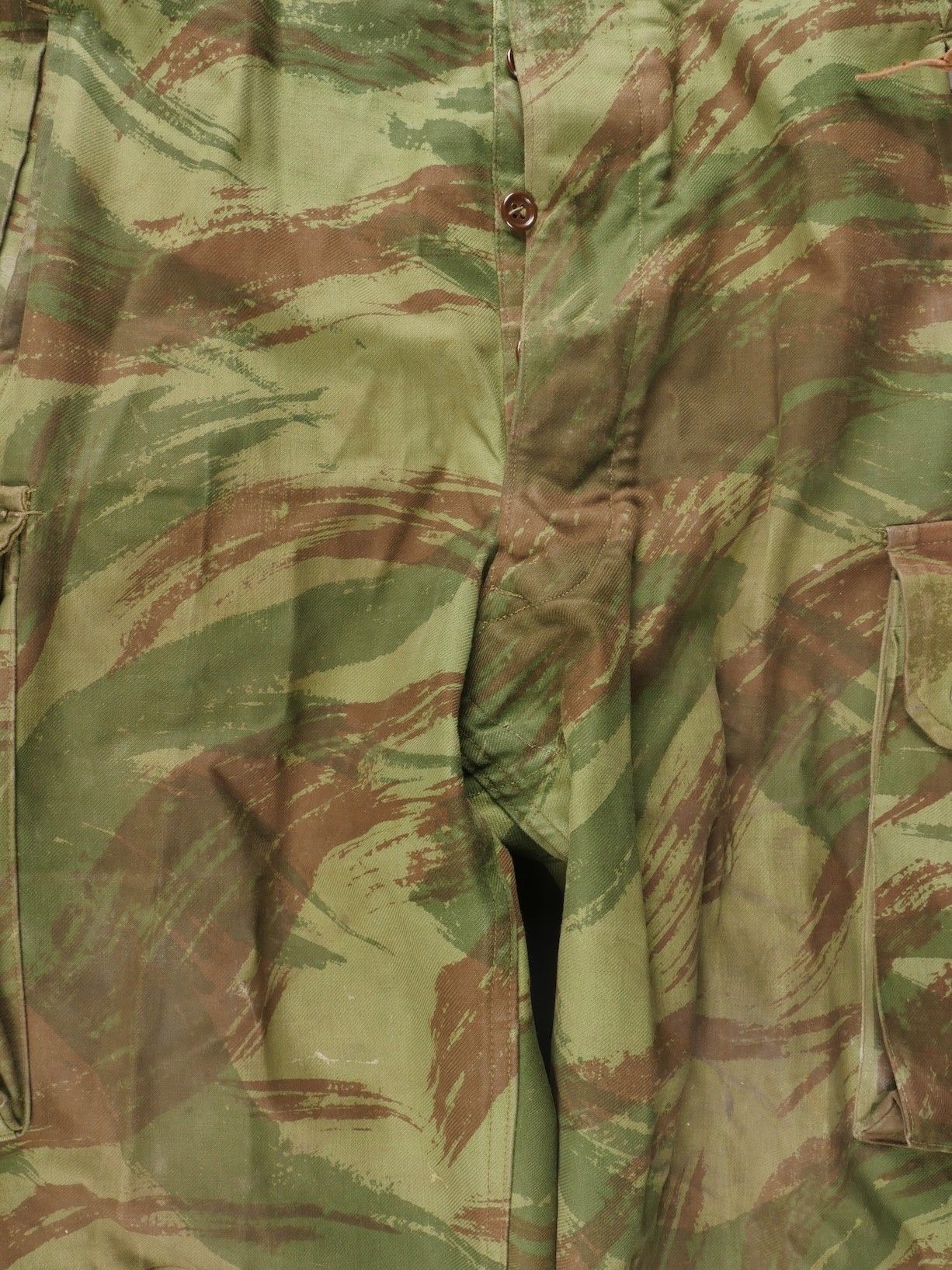 Nice pair of TAP 4753 trousers in camouflaged canvas, small model press studs in original paint, Vitex zip. Stamps of a manufacturer in Caussade as well as a stamp of reception indicating the year 54. Size stamp indicating 35. Original sewn hip straps. All the original buttons are present, only one button is sewn back on, as are the tightening laces. The camouflaged straps of model 4753 are also present. In superb condition, fresh camouflage, very little wear. Fine TAP 4753 trousers camouflage canvas with small painted snaps functional Eclair zipper maker Caussade and army stamp dated 1954 size 35 side tabs original all buttons present one restitched lace ties at ankles with matching 4753 camouflage braces. Excellent condition fresh camouflage little wear.