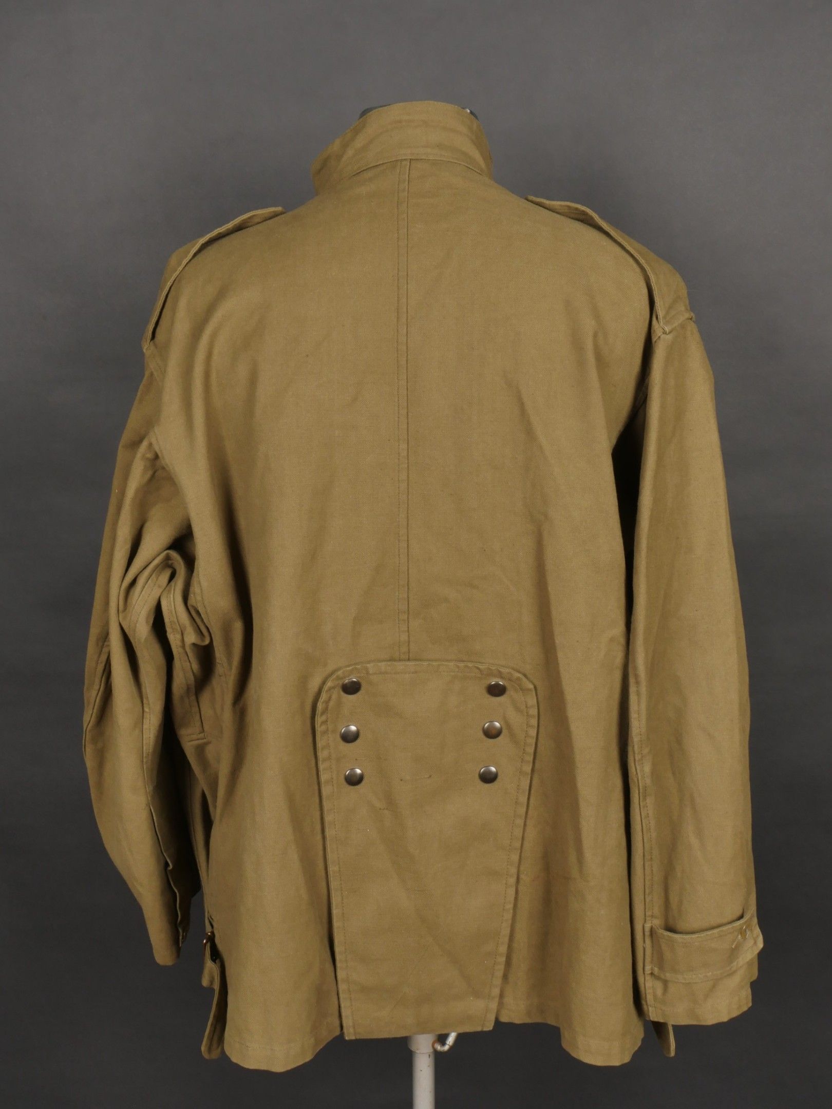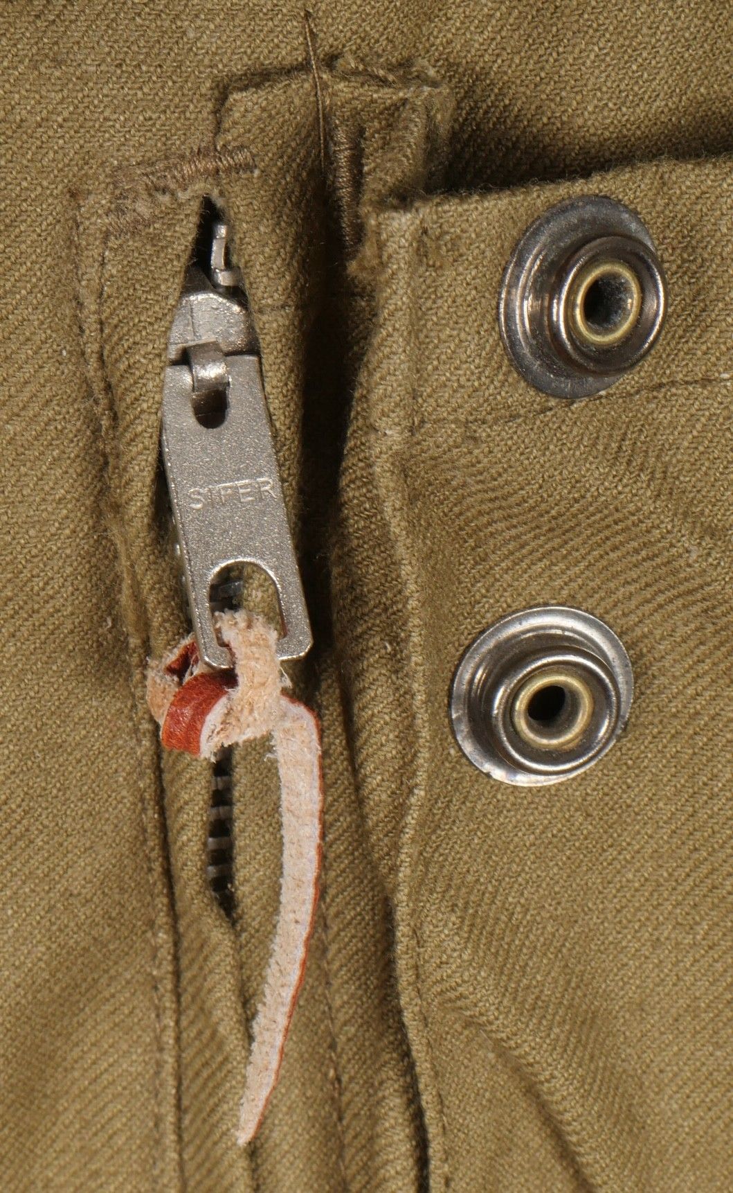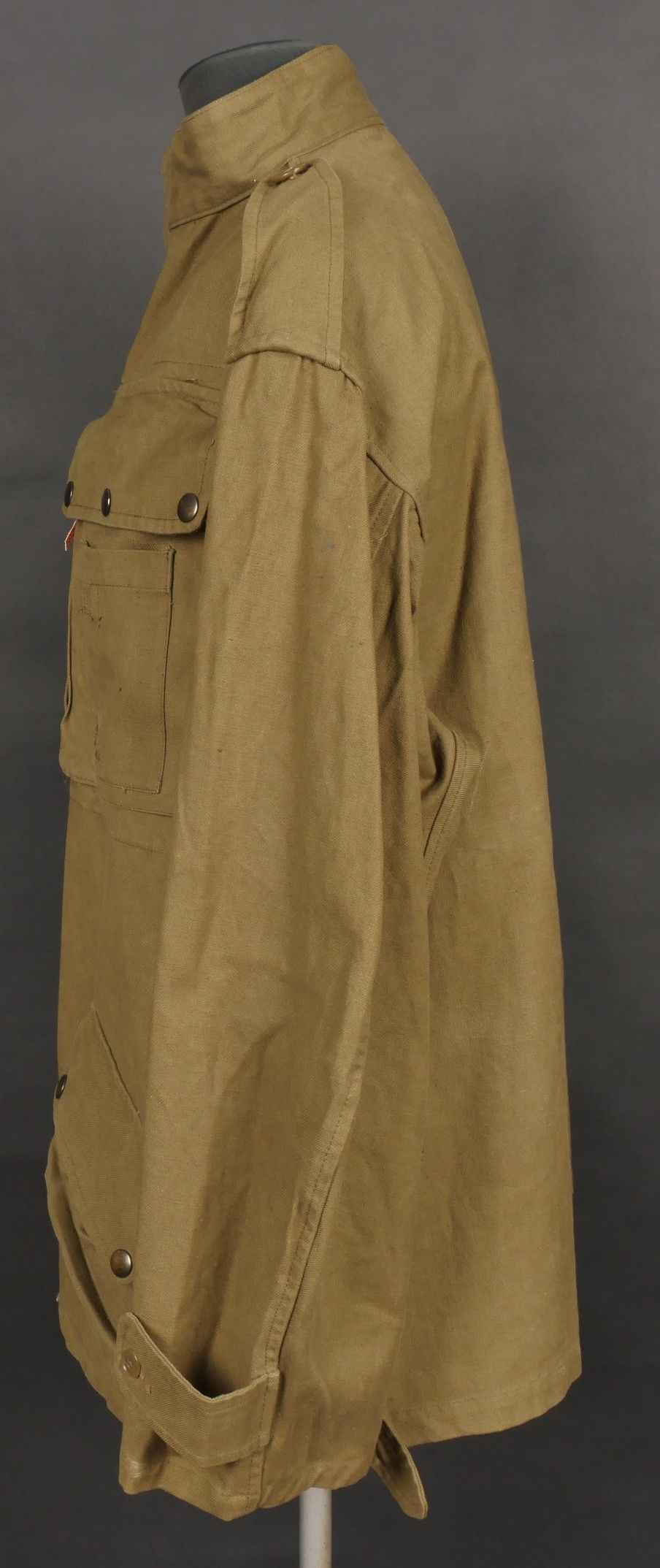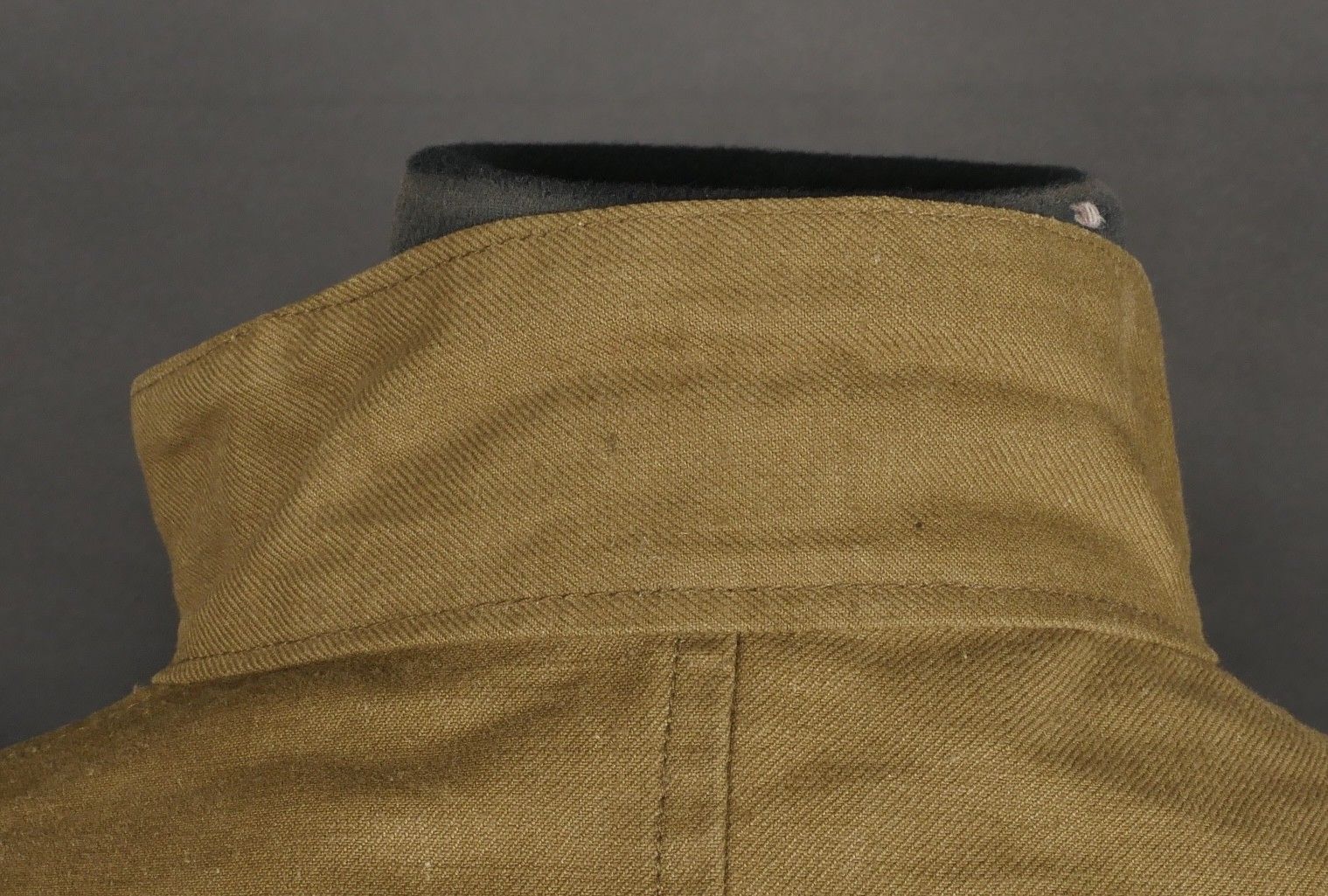 TAP 4753 jacket. Jacket in mint condition, made of khaki cotton and fastened with eight buttons and a functional Sifer zip. Manufacturer's markings on collar, size 32, receipt stamp present but not very legible. Original stitched beavertail. TAP 4753 jacket mint cotton khaki closing with eight buttons and functional Sifer zipper maker mark at collar partly illegible size 32 acceptance stamp faint beavertail sewn original.