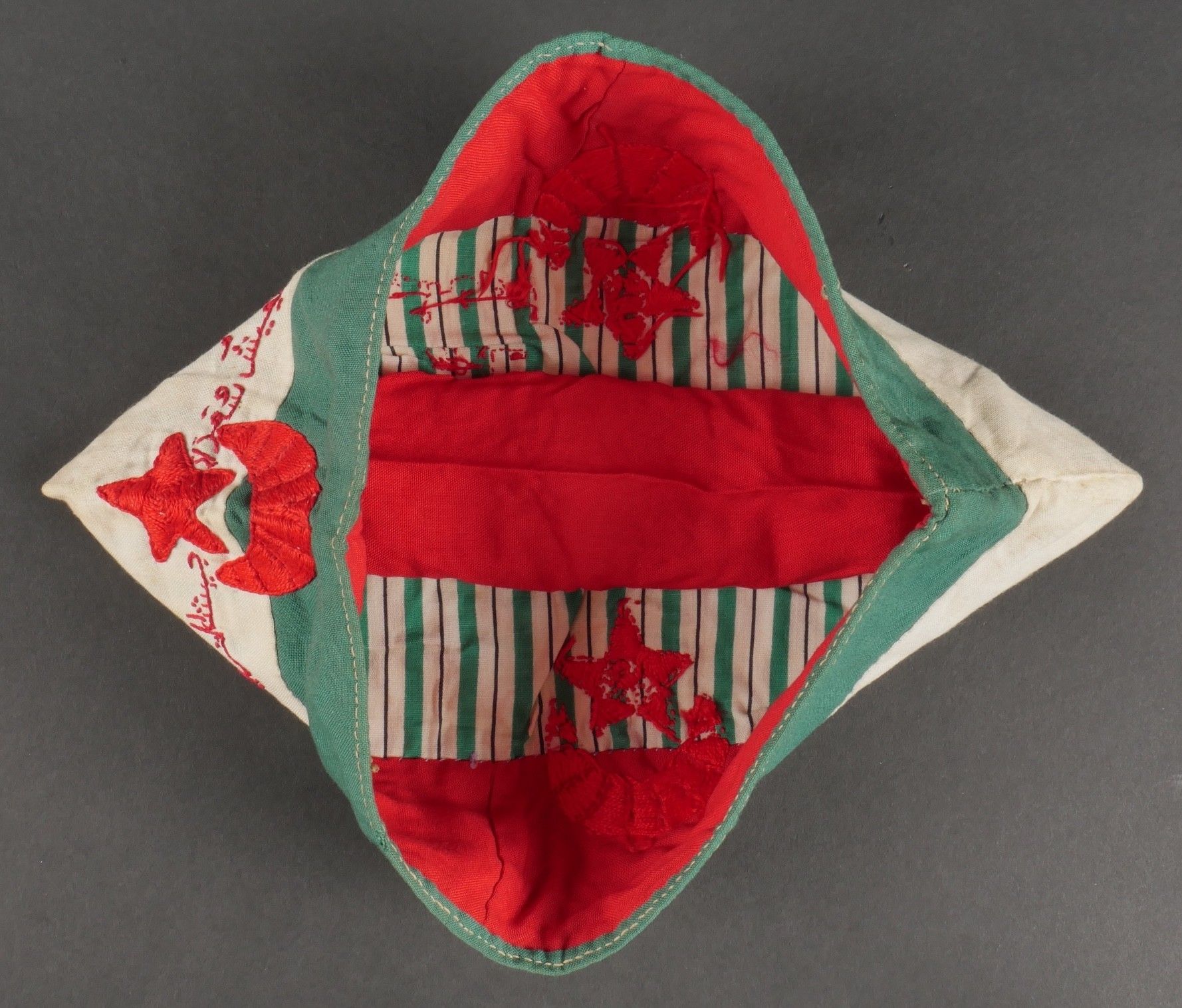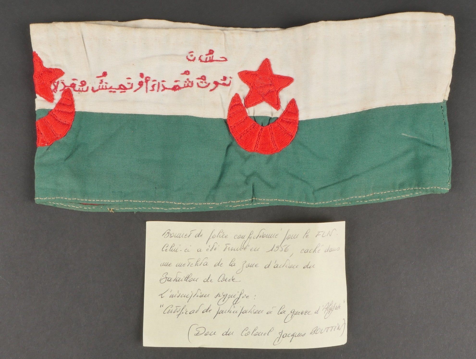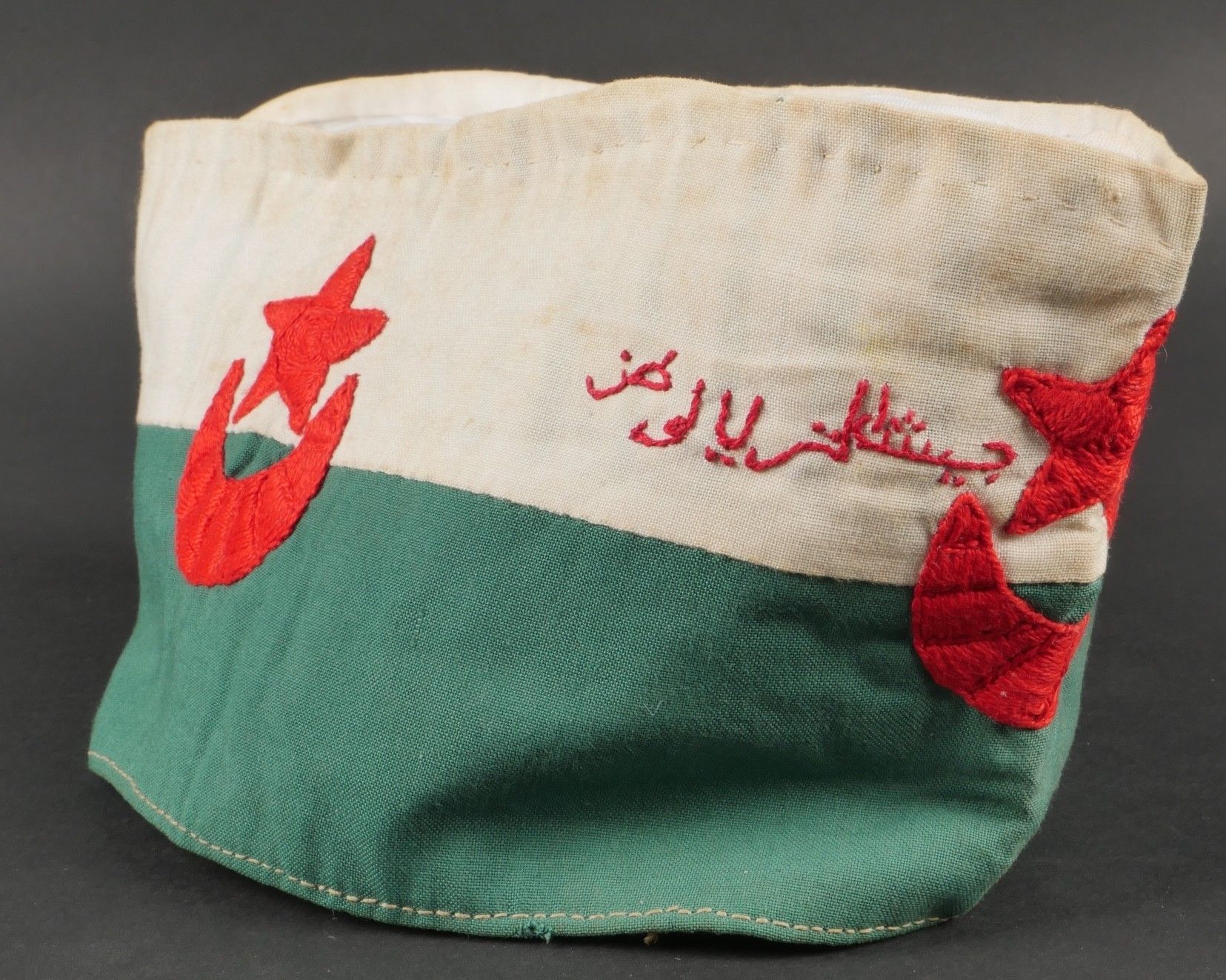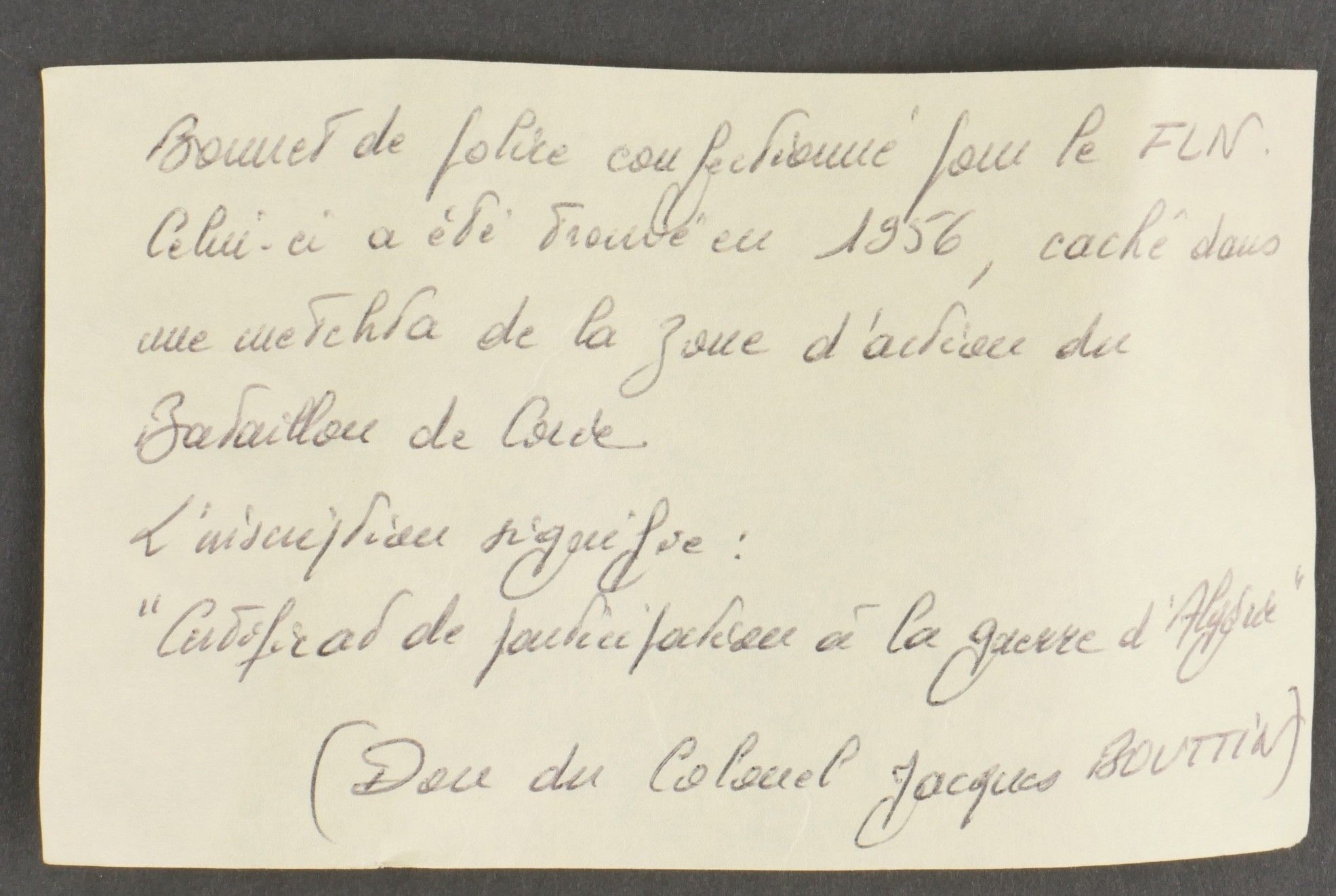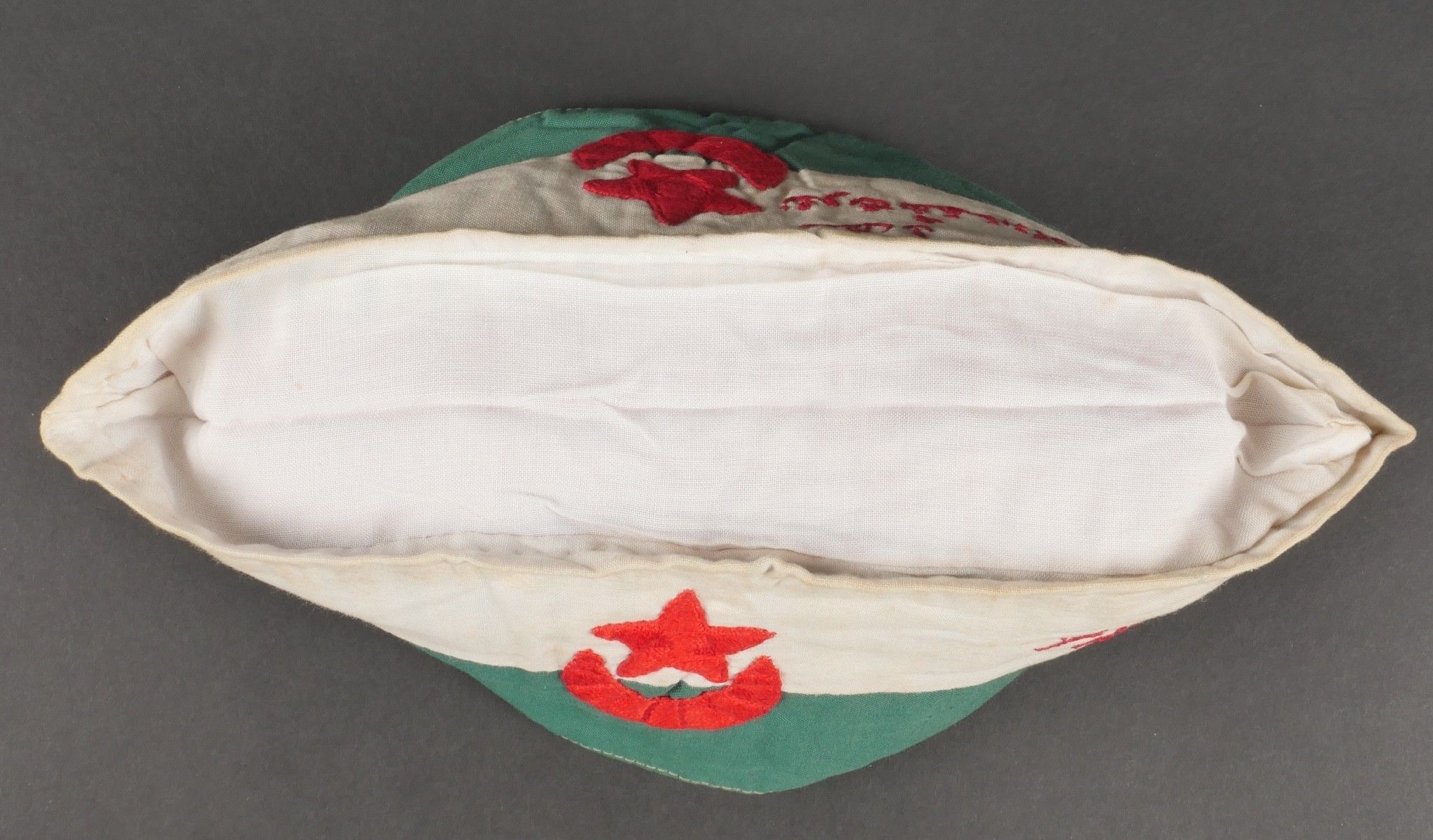 Police cap made for the FLN. As a small document inside the cap attests, it was found in 1956 hidden in a mechta in the Korean Battalion's area of operations. Donated by Colonel Jacques Bouttin. Headdress made of fine white and green cotton fabric, on which the crescent moon surmounted by the star was embroidered 3 times, as well as several mottos in Arabic. FLN side cap. Small document inside indicates it was found in 1956 hidden in a mechta in the action zone of the Korean Battalion donated by Colonel Jacques Bouttin. White and green cotton lining embroidered three times with red crescent and star and Arabic mottos.