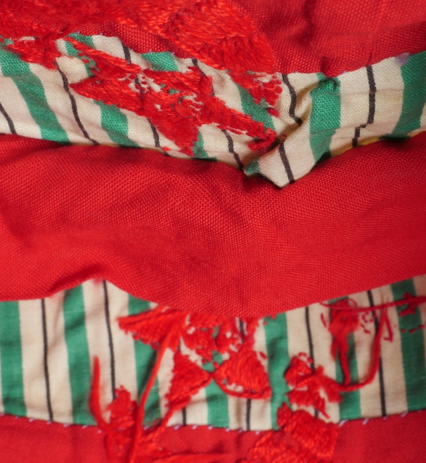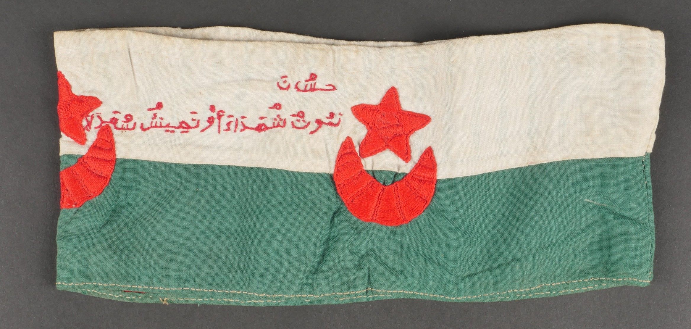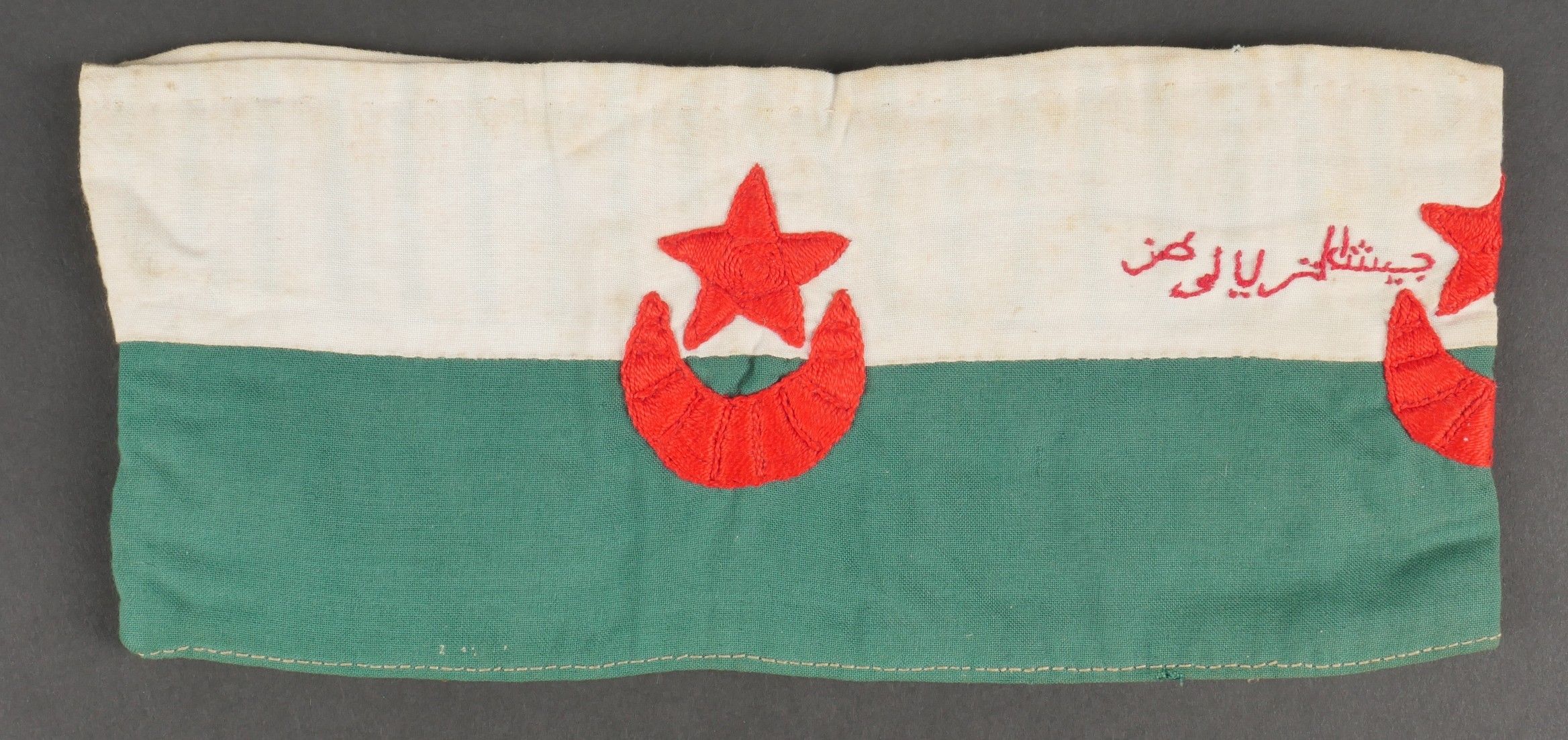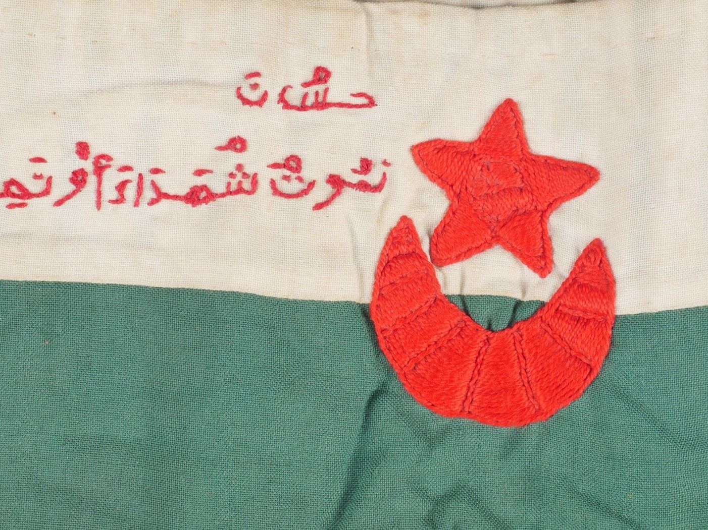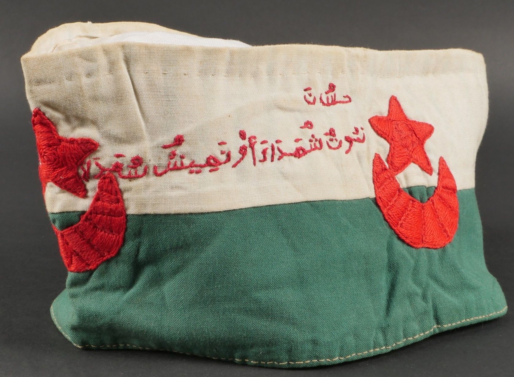 Police cap made for the FLN. As a small document inside the cap attests, it was found in 1956 hidden in a mechta in the Korean Battalion's area of operations. Donated by Colonel Jacques Bouttin. Headdress made of fine white and green cotton fabric, on which the crescent moon surmounted by the star was embroidered 3 times, as well as several mottos in Arabic. FLN side cap. Small document inside indicates it was found in 1956 hidden in a mechta in the action zone of the Korean Battalion donated by Colonel Jacques Bouttin. White and green cotton lining embroidered three times with red crescent and star and Arabic mottos.
