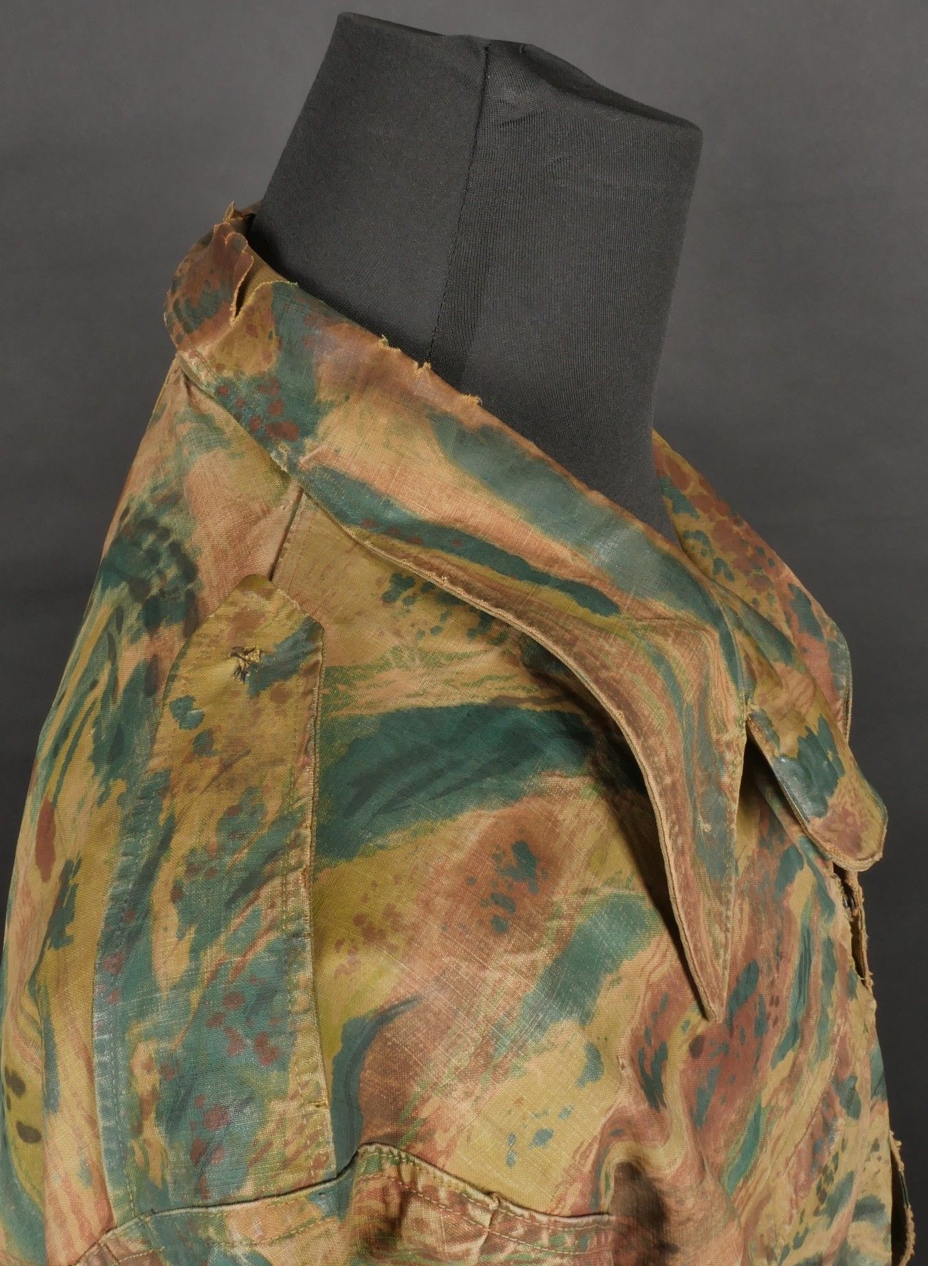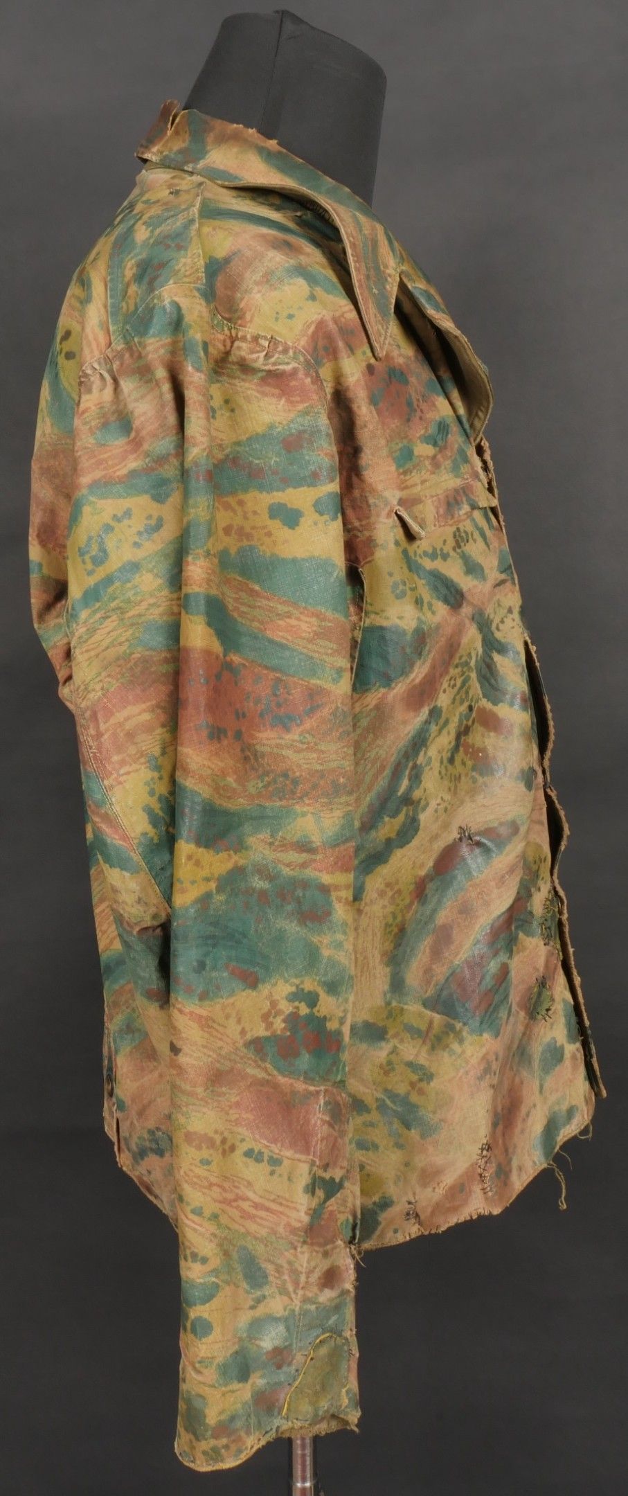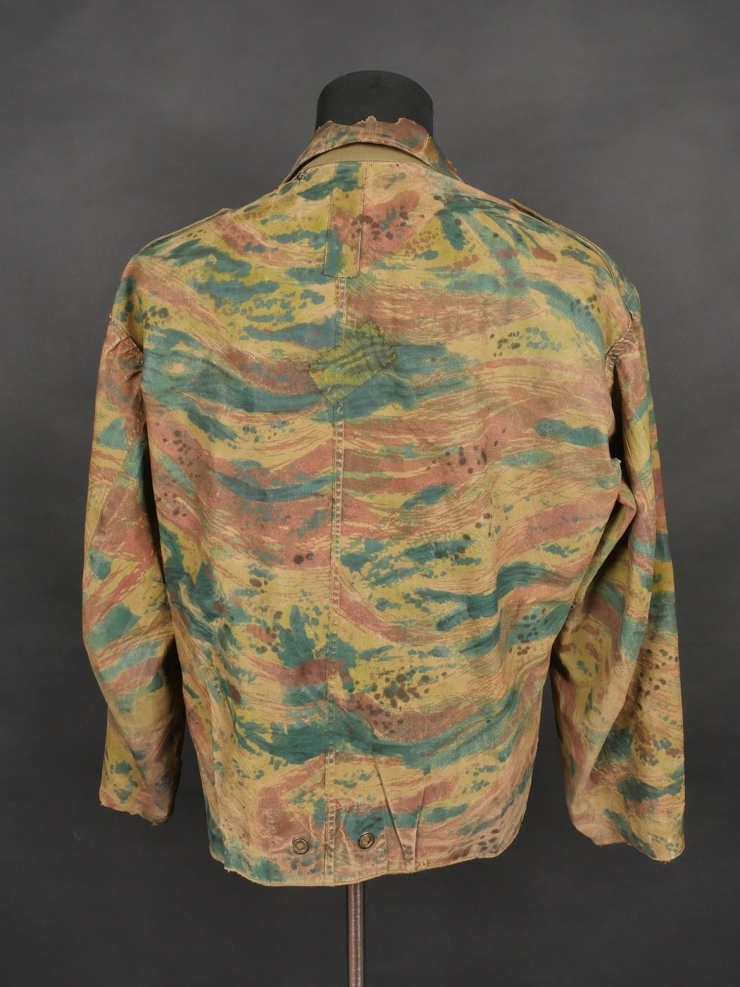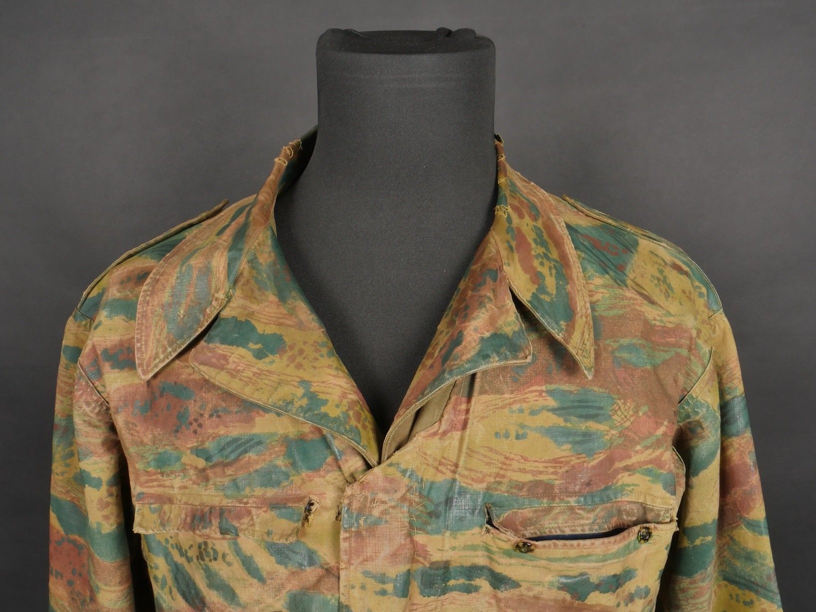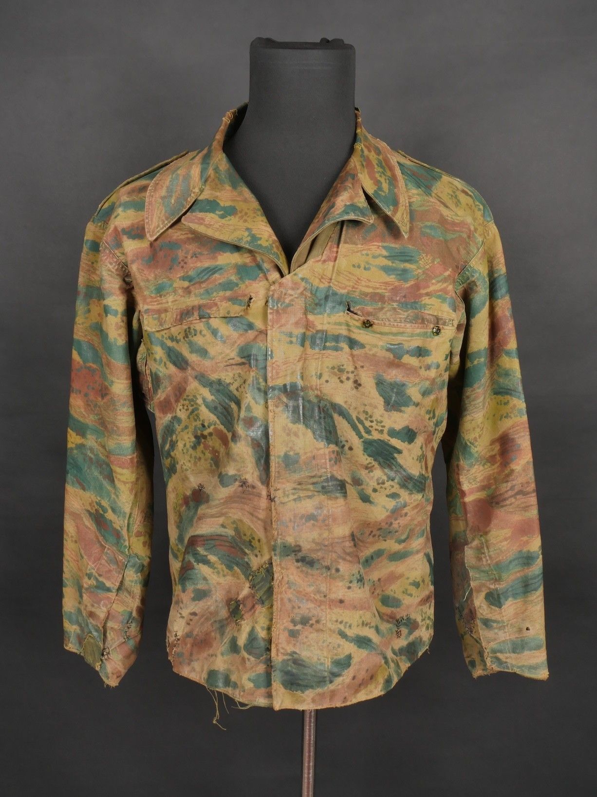 Atypical jacket worn by Second Lieutenant Escoffier during the Algerian War. The jacket was made from a light khaki TTA 47 52 jacket, onto which a master tailor sewed a waterproof canvas, then camouflaged it with a brush. The camouflage is based on French camouflage, with green and brown being the main colours. The jacket fastens with 4 large press studs, but can also be fastened with a buttonhole that joins the buttons on the TTA jacket. 2 chest pockets close with 2 small press studs. Several small period repairs. Sublieutenant Escoffier served during the Algerian War in the company specialising in guerrilla and counter-guerrilla warfare of the 31st Battalion of Chasseurs à pied. Unique jacket. Unique jacket worn by Second Lieutenant Escoffier during the Algerian War modified from a khaki TTA 4752 lightweight jacket by adding a handpainted waterproof camouflage layer in green and brown French pattern. Four large press studs for closure additional buttonholes to use original buttons two chest pockets with small press studs. Several period repairs. Escoffier served with the 31st Infantry Battalion's guerrilla and counterguerrilla company. Oneofakind piece.