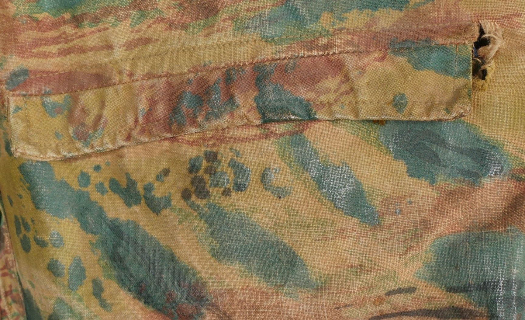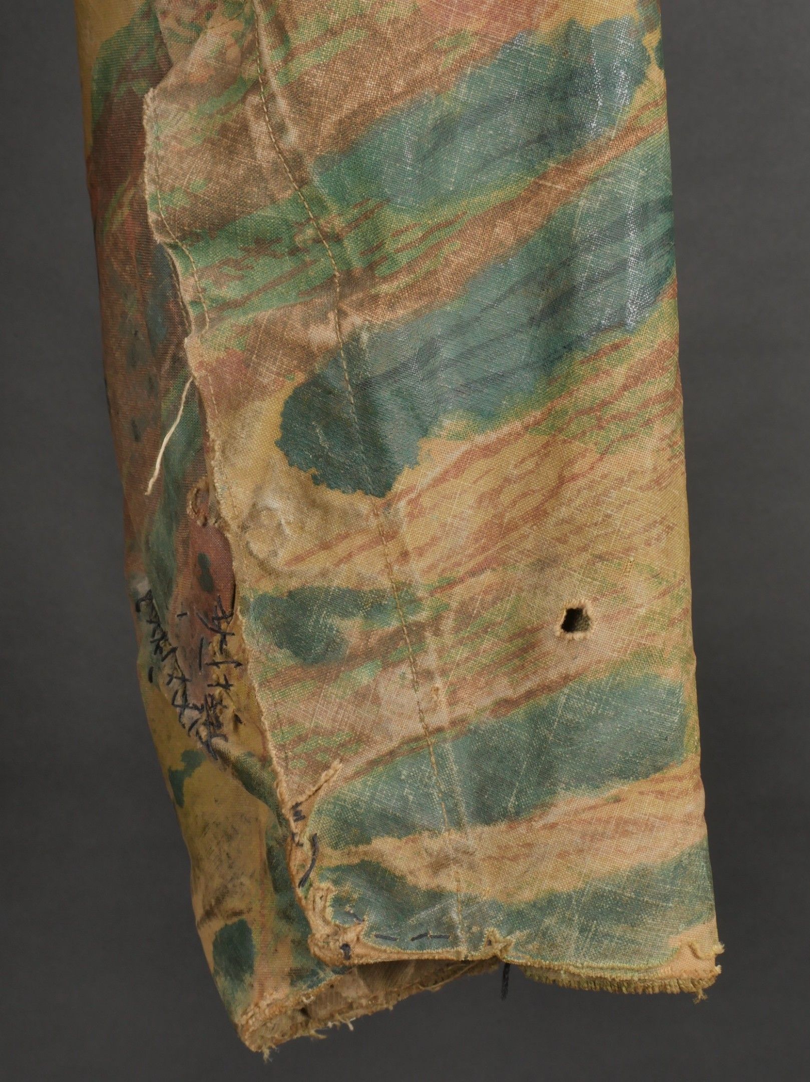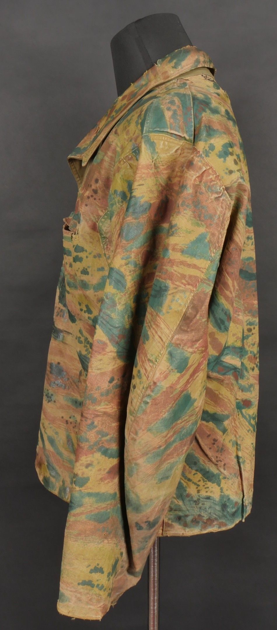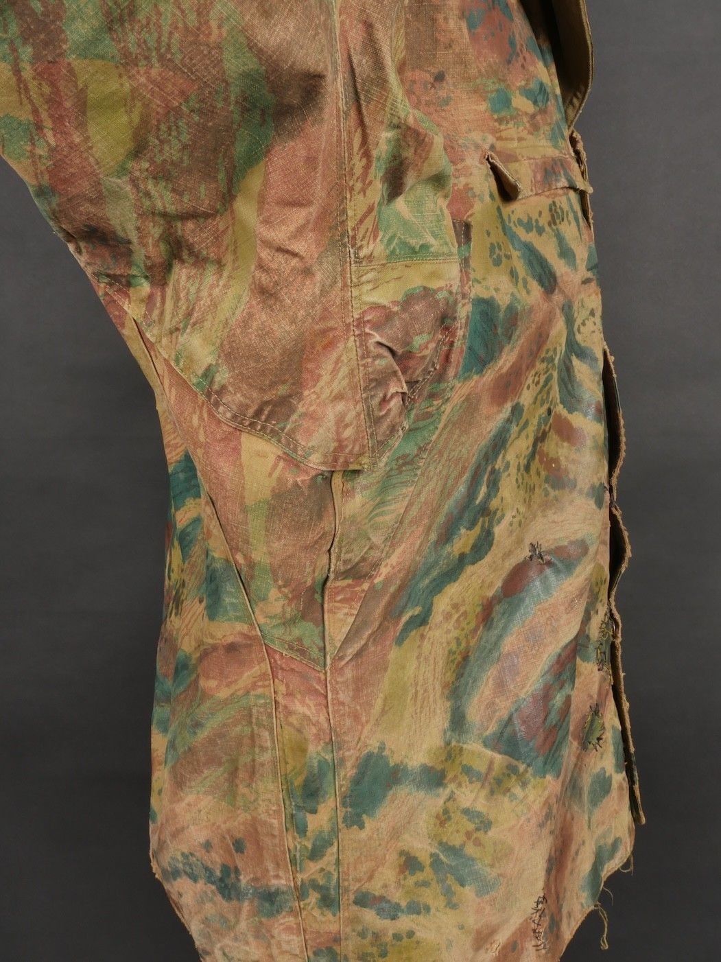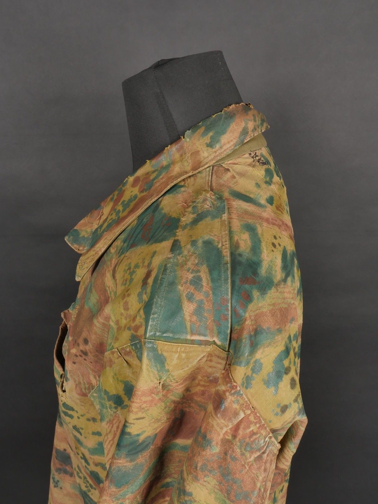 Atypical jacket worn by Second Lieutenant Escoffier during the Algerian War. The jacket was made from a light khaki TTA 47 52 jacket, onto which a master tailor sewed a waterproof canvas, then camouflaged it with a brush. The camouflage is based on French camouflage, with green and brown being the main colours. The jacket fastens with 4 large press studs, but can also be fastened with a buttonhole that joins the buttons on the TTA jacket. 2 chest pockets close with 2 small press studs. Several small period repairs. Sublieutenant Escoffier served during the Algerian War in the company specialising in guerrilla and counter-guerrilla warfare of the 31st Battalion of Chasseurs à pied. Unique jacket. Unique jacket worn by Second Lieutenant Escoffier during the Algerian War modified from a khaki TTA 4752 lightweight jacket by adding a handpainted waterproof camouflage layer in green and brown French pattern. Four large press studs for closure additional buttonholes to use original buttons two chest pockets with small press studs. Several period repairs. Escoffier served with the 31st Infantry Battalion's guerrilla and counterguerrilla company. Oneofakind piece.