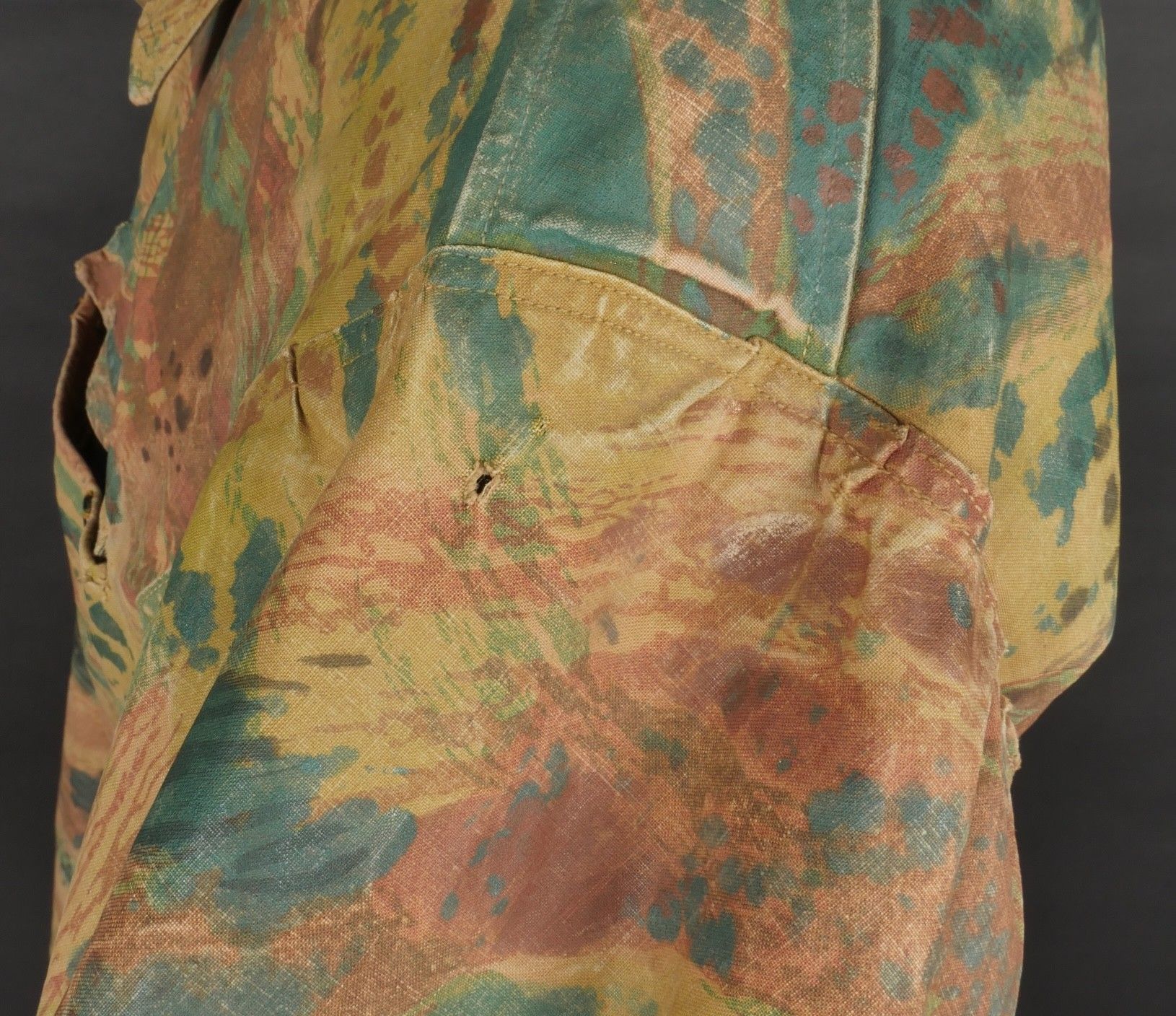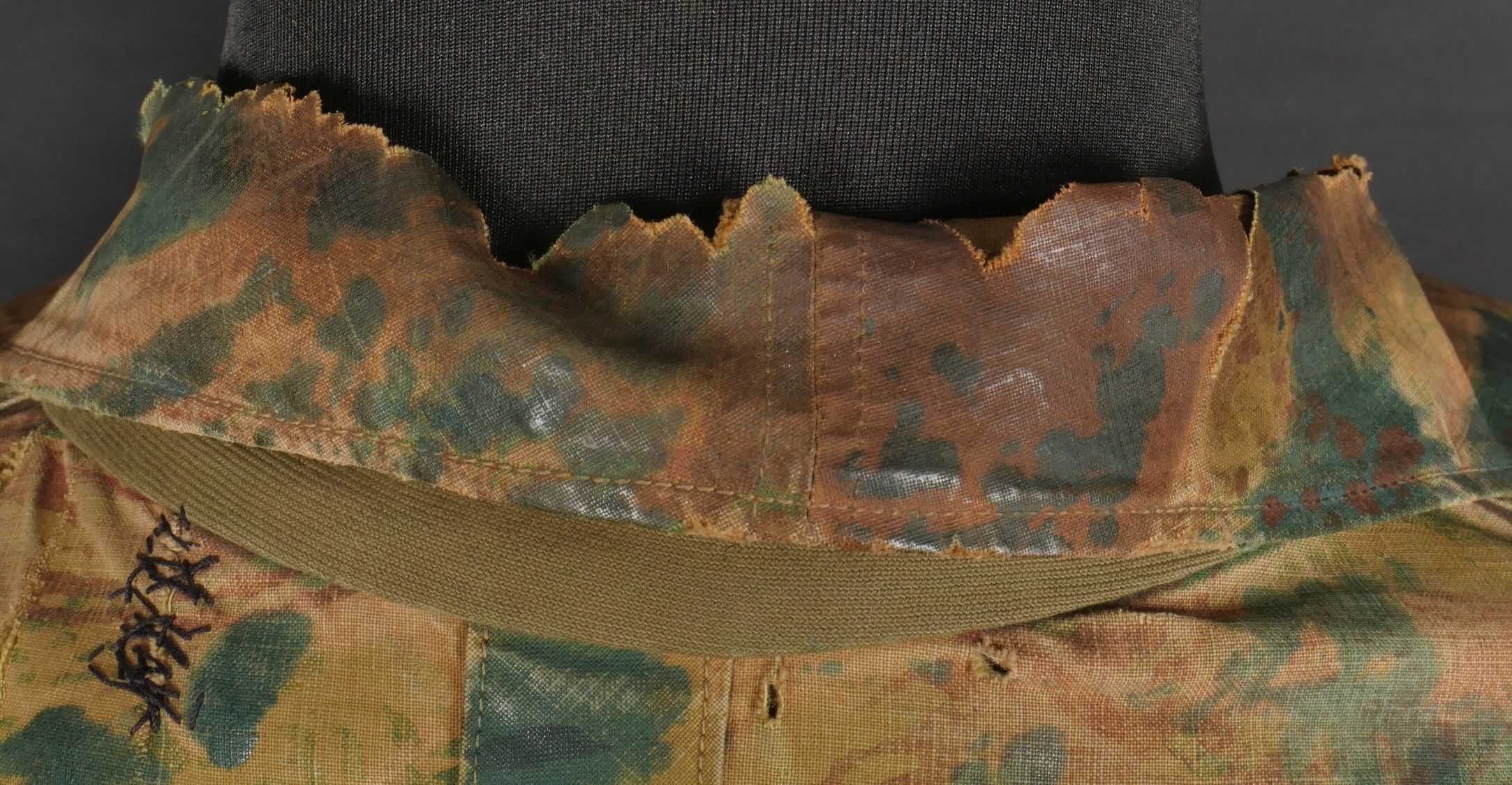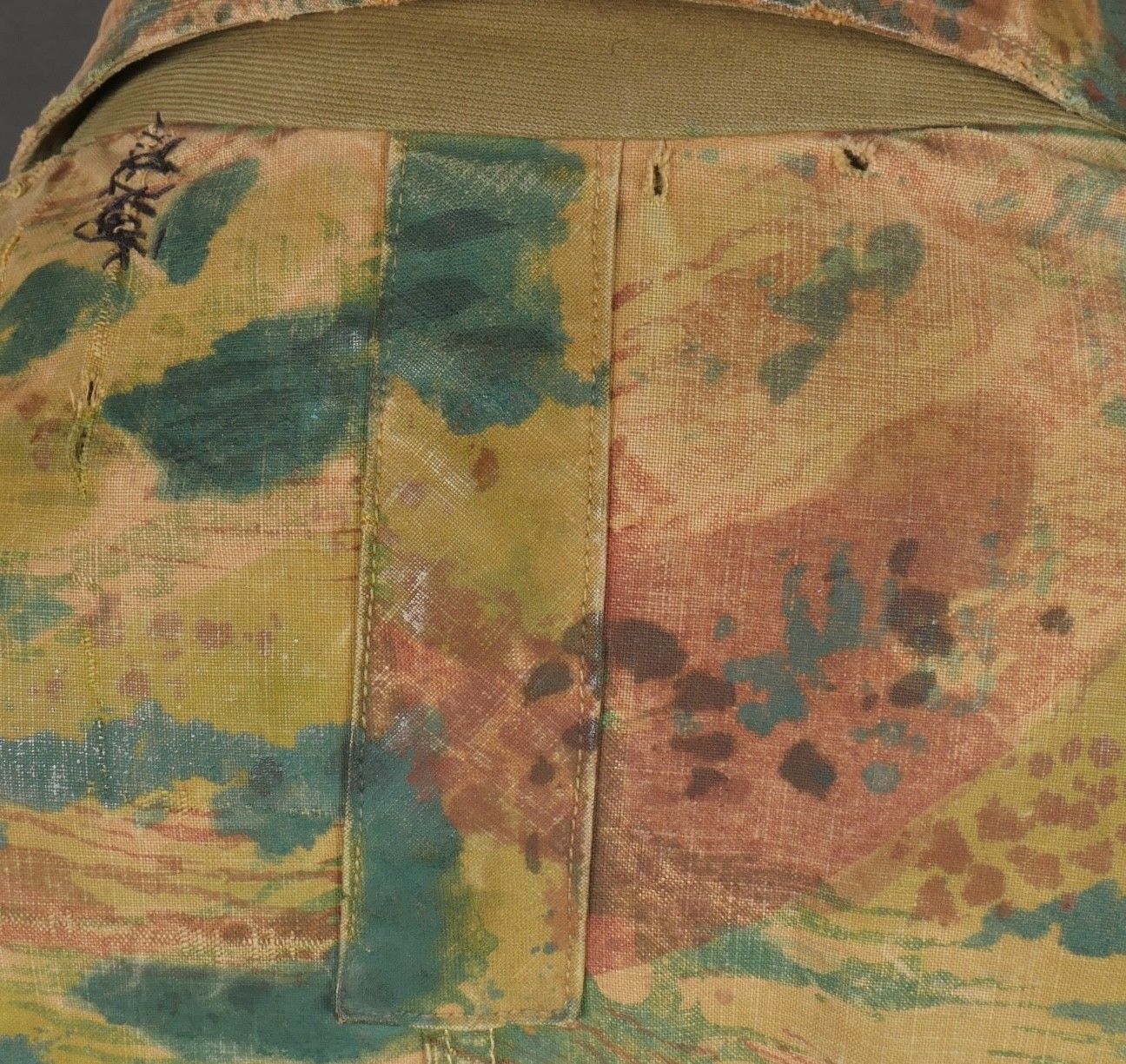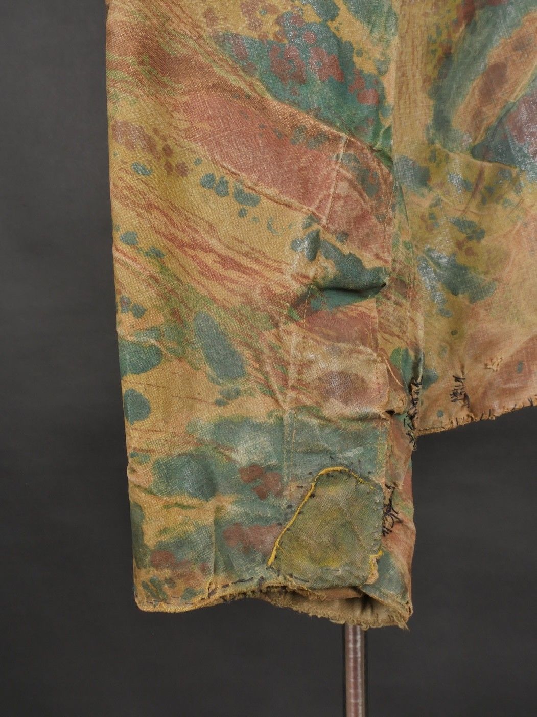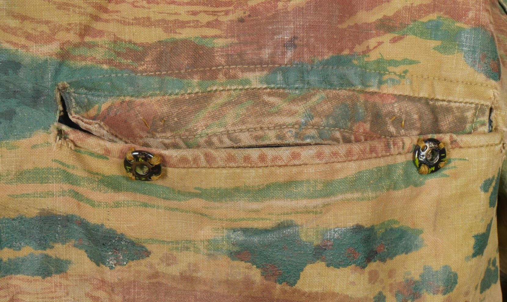 Atypical jacket worn by Second Lieutenant Escoffier during the Algerian War. The jacket was made from a light khaki TTA 47 52 jacket, onto which a master tailor sewed a waterproof canvas, then camouflaged it with a brush. The camouflage is based on French camouflage, with green and brown being the main colours. The jacket fastens with 4 large press studs, but can also be fastened with a buttonhole that joins the buttons on the TTA jacket. 2 chest pockets close with 2 small press studs. Several small period repairs. Sublieutenant Escoffier served during the Algerian War in the company specialising in guerrilla and counter-guerrilla warfare of the 31st Battalion of Chasseurs à pied. Unique jacket. Unique jacket worn by Second Lieutenant Escoffier during the Algerian War modified from a khaki TTA 4752 lightweight jacket by adding a handpainted waterproof camouflage layer in green and brown French pattern. Four large press studs for closure additional buttonholes to use original buttons two chest pockets with small press studs. Several period repairs. Escoffier served with the 31st Infantry Battalion's guerrilla and counterguerrilla company. Oneofakind piece.