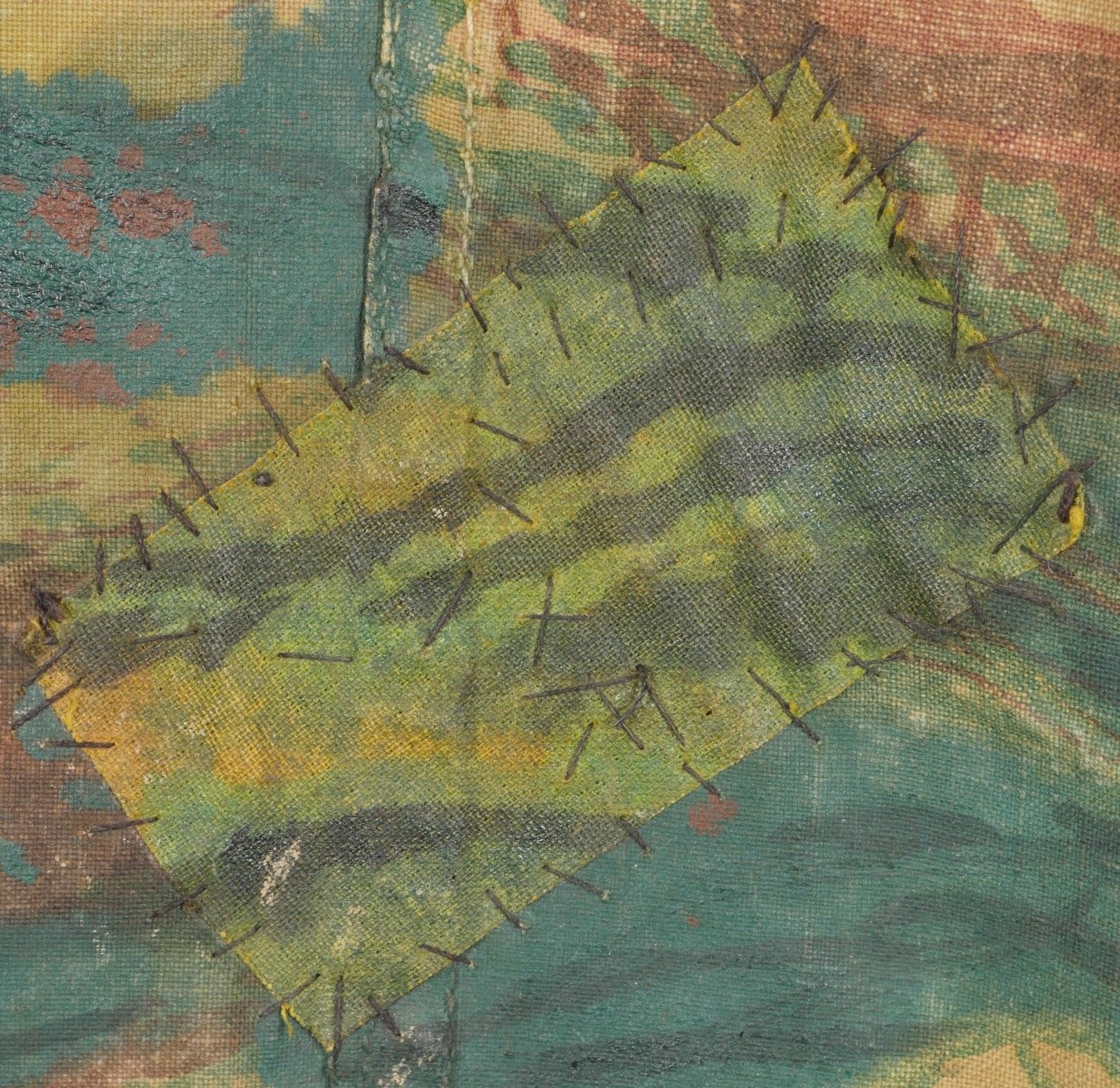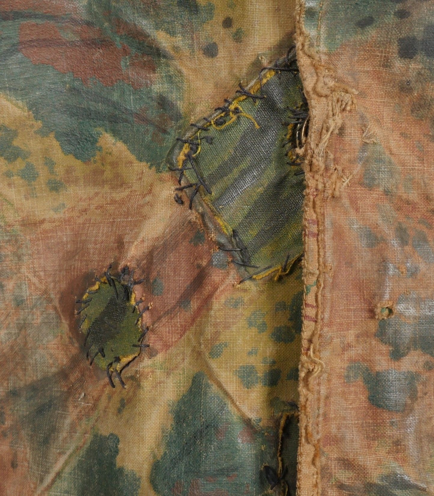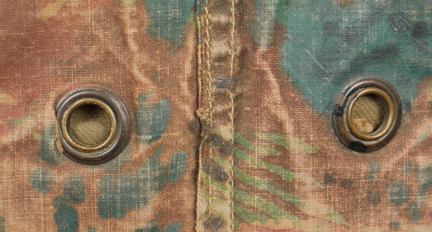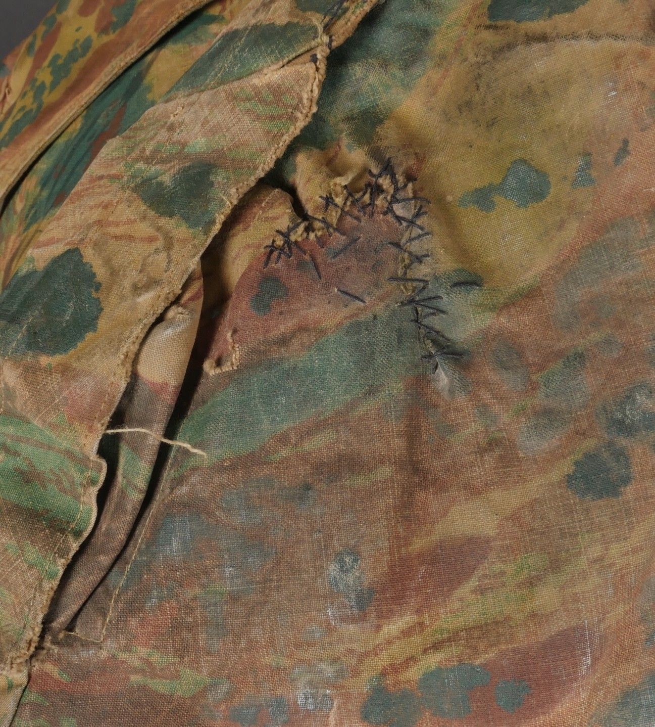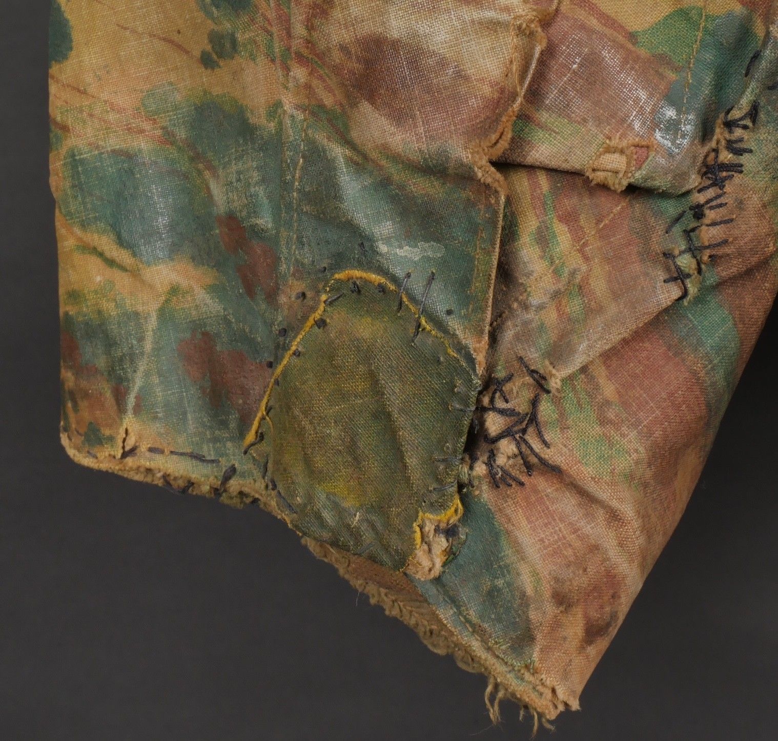 Atypical jacket worn by Second Lieutenant Escoffier during the Algerian War. The jacket was made from a light khaki TTA 47 52 jacket, onto which a master tailor sewed a waterproof canvas, then camouflaged it with a brush. The camouflage is based on French camouflage, with green and brown being the main colours. The jacket fastens with 4 large press studs, but can also be fastened with a buttonhole that joins the buttons on the TTA jacket. 2 chest pockets close with 2 small press studs. Several small period repairs. Sublieutenant Escoffier served during the Algerian War in the company specialising in guerrilla and counter-guerrilla warfare of the 31st Battalion of Chasseurs à pied. Unique jacket. Unique jacket worn by Second Lieutenant Escoffier during the Algerian War modified from a khaki TTA 4752 lightweight jacket by adding a handpainted waterproof camouflage layer in green and brown French pattern. Four large press studs for closure additional buttonholes to use original buttons two chest pockets with small press studs. Several period repairs. Escoffier served with the 31st Infantry Battalion's guerrilla and counterguerrilla company. Oneofakind piece.