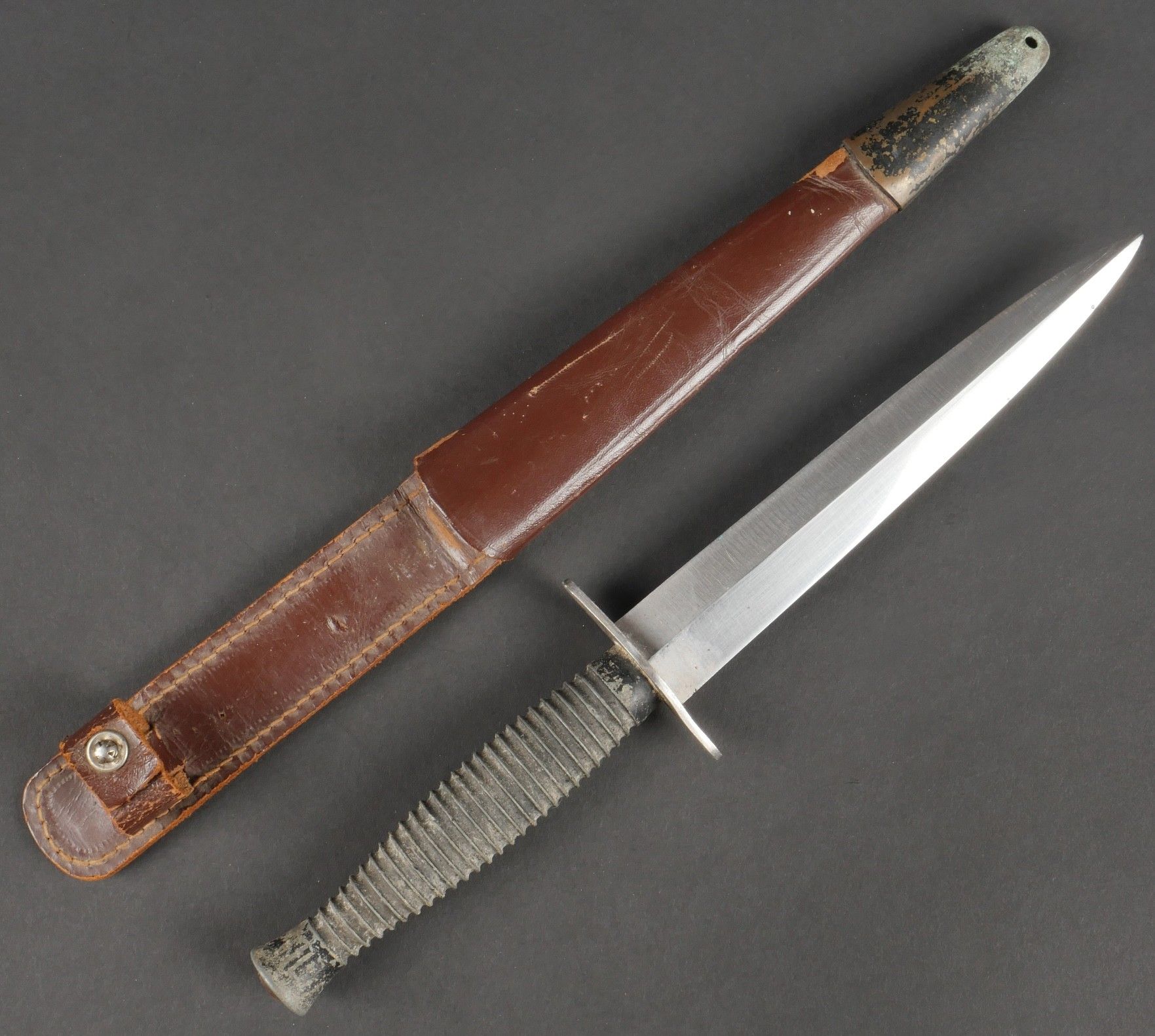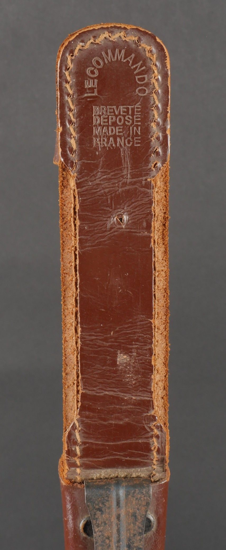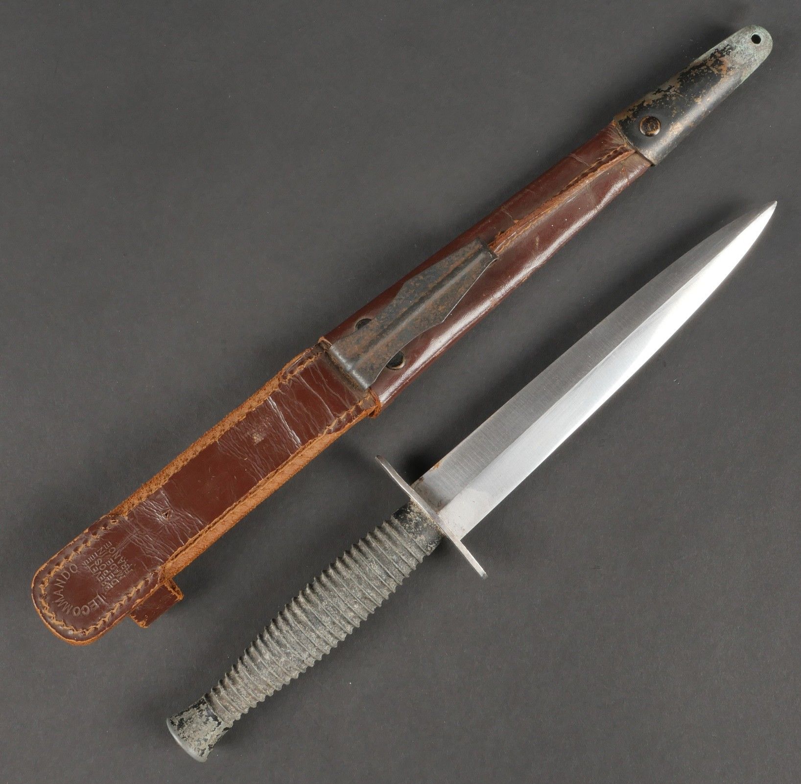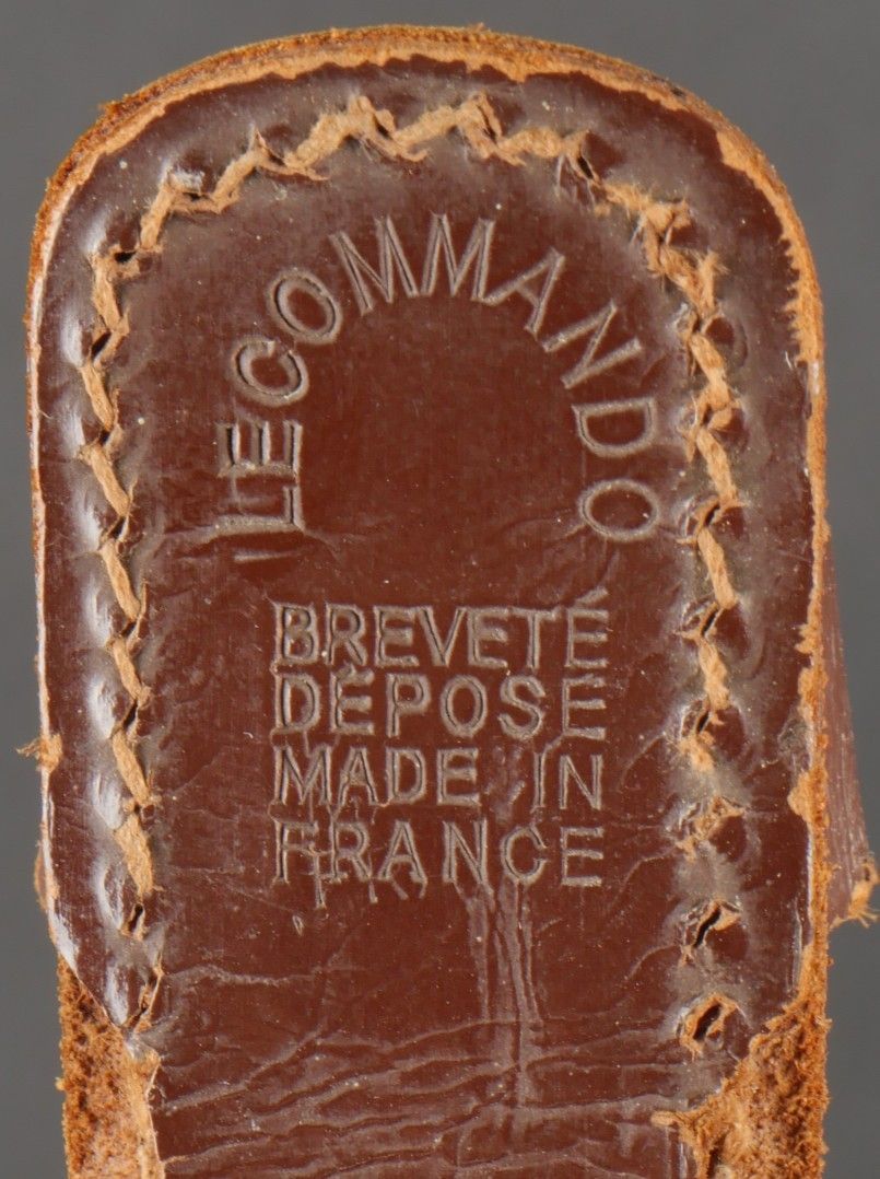 Le Commando dagger. Moulded zamak handle with 26 grooves and remains of matt black paint. Original guard marked Le Commando Inox Make & Model Deposited, the inscription Super Nogent appears to have been filed down. Original disassembly screw. Blade in its original length and still sharp. Scabbard specific to this dagger, made entirely of leather, spring still attached, brass tip painted matt black. Functional pressure. Marking on reverse side Le commando Breveté Déposé Made in France. Le Commando dagger. Cast zamak handle with 26 flutes traces of original matte black paint guard marked Le Commando Inox Marque & Modèle Déposés inscription Super Nogent partially filed off original assembly screw fulllength sharp blade specific scabbard entirely of leather with intact spring and blackpainted brass tip functional snap reverse marked Le Commando Breveté Déposé Made in France.