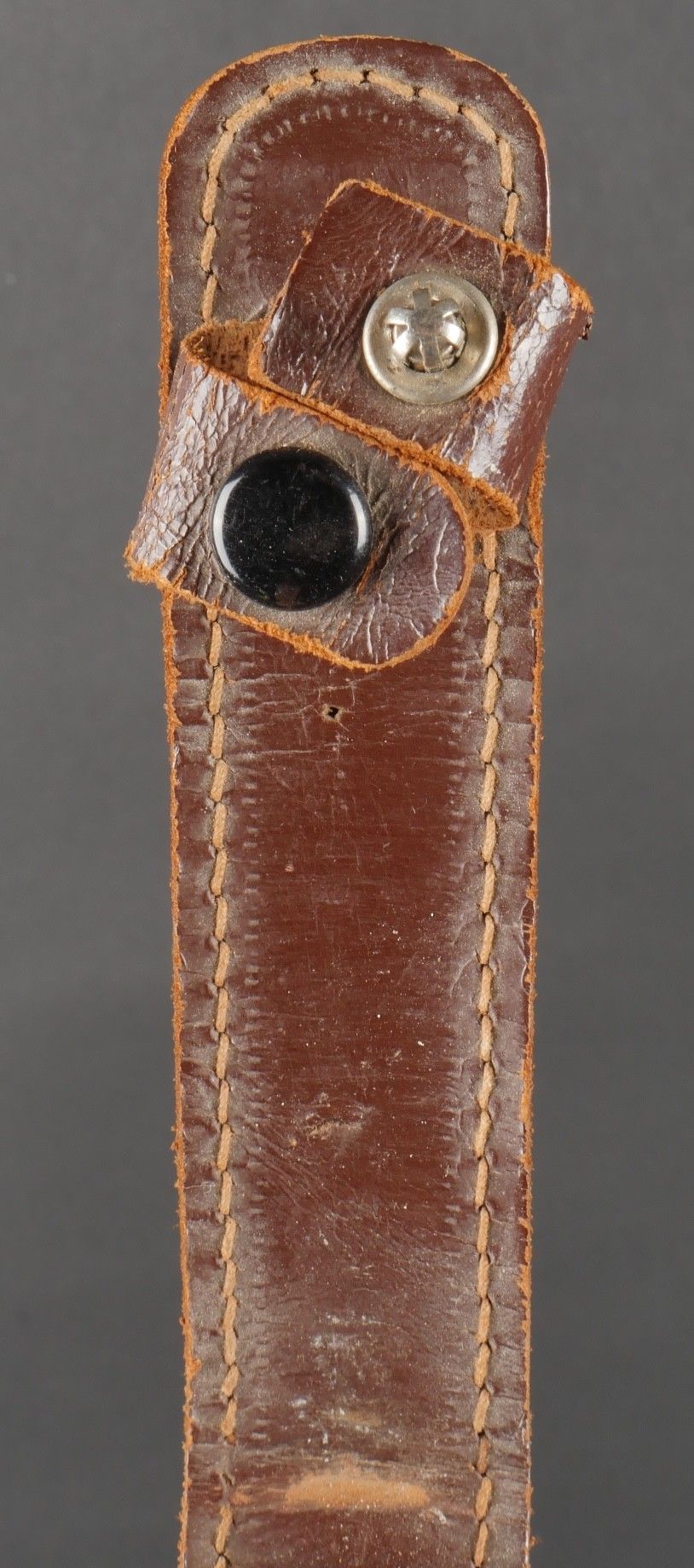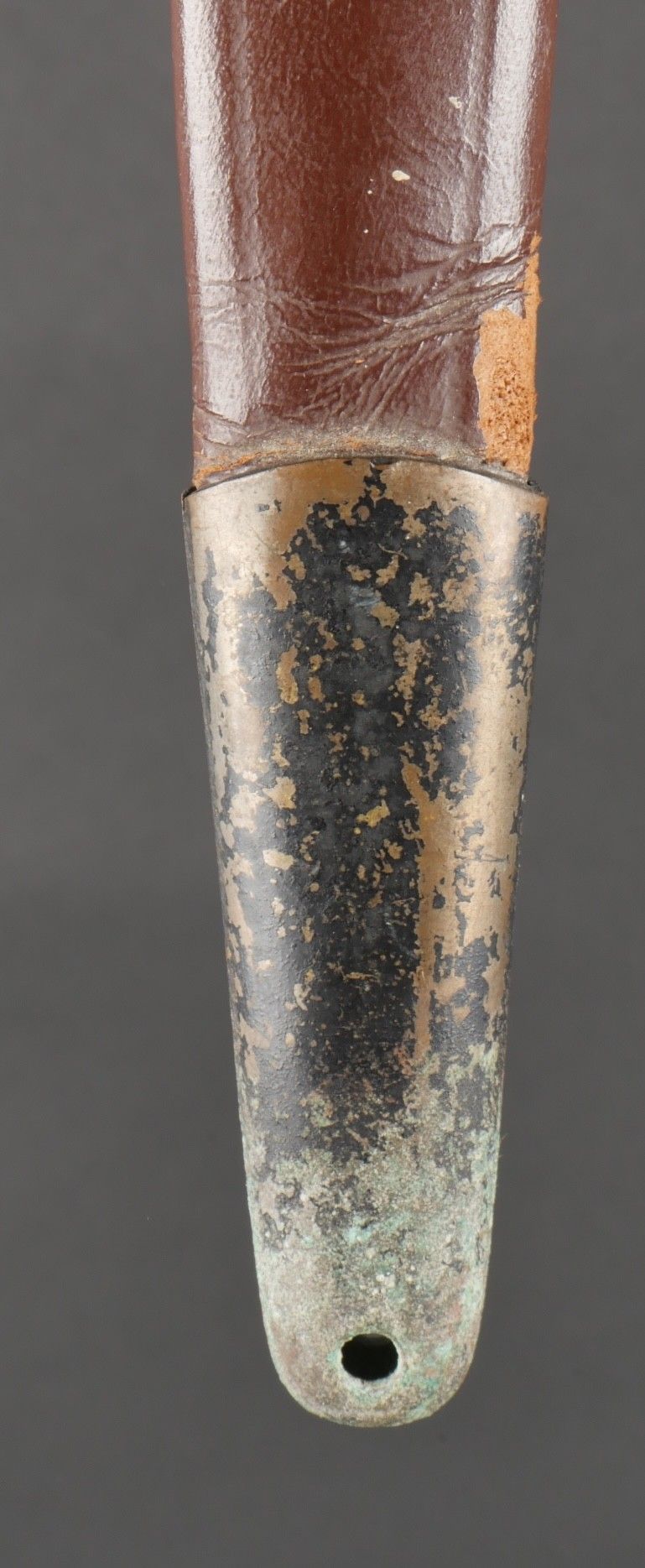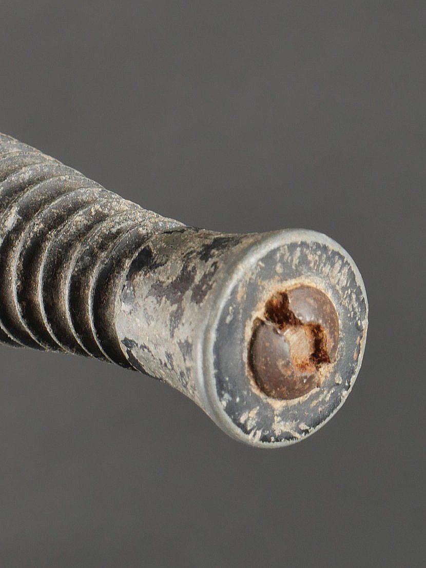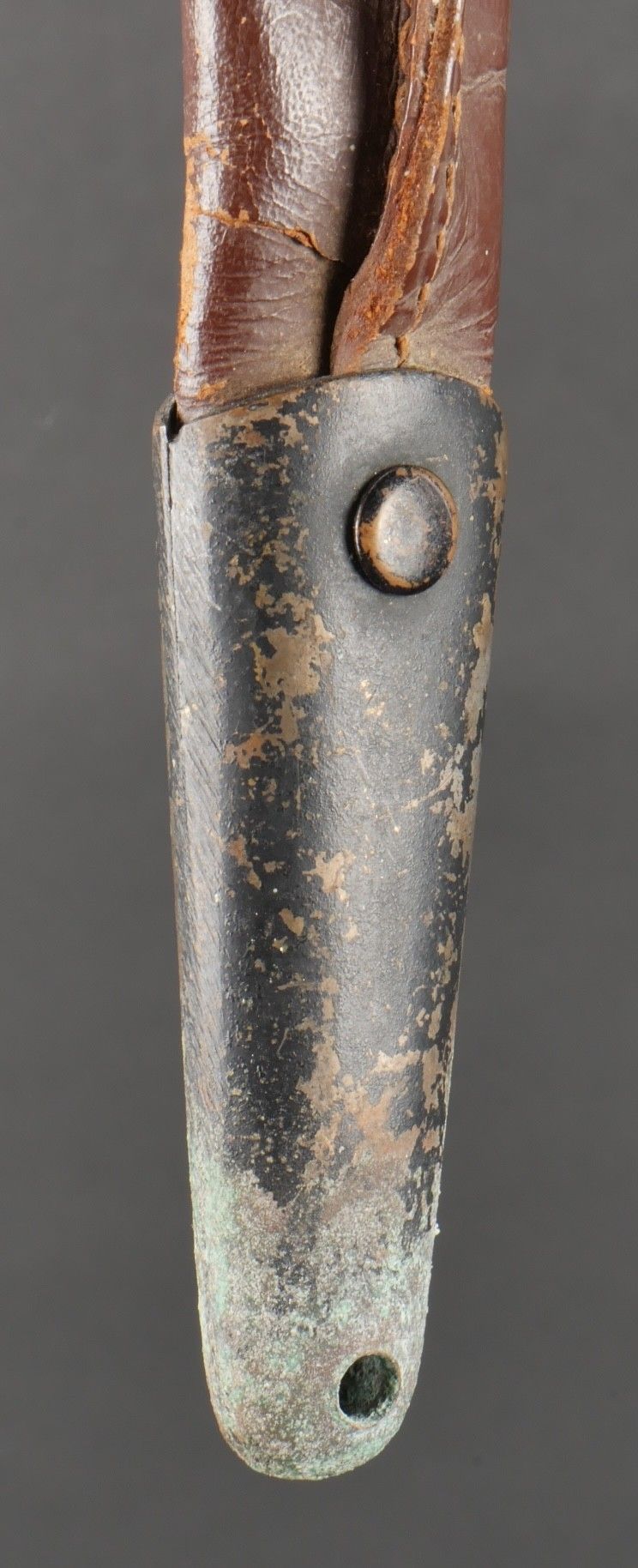 Le Commando dagger. Moulded zamak handle with 26 grooves and remains of matt black paint. Original guard marked Le Commando Inox Make & Model Deposited, the inscription Super Nogent appears to have been filed down. Original disassembly screw. Blade in its original length and still sharp. Scabbard specific to this dagger, made entirely of leather, spring still attached, brass tip painted matt black. Functional pressure. Marking on reverse side Le commando Breveté Déposé Made in France. Le Commando dagger. Cast zamak handle with 26 flutes traces of original matte black paint guard marked Le Commando Inox Marque & Modèle Déposés inscription Super Nogent partially filed off original assembly screw fulllength sharp blade specific scabbard entirely of leather with intact spring and blackpainted brass tip functional snap reverse marked Le Commando Breveté Déposé Made in France.