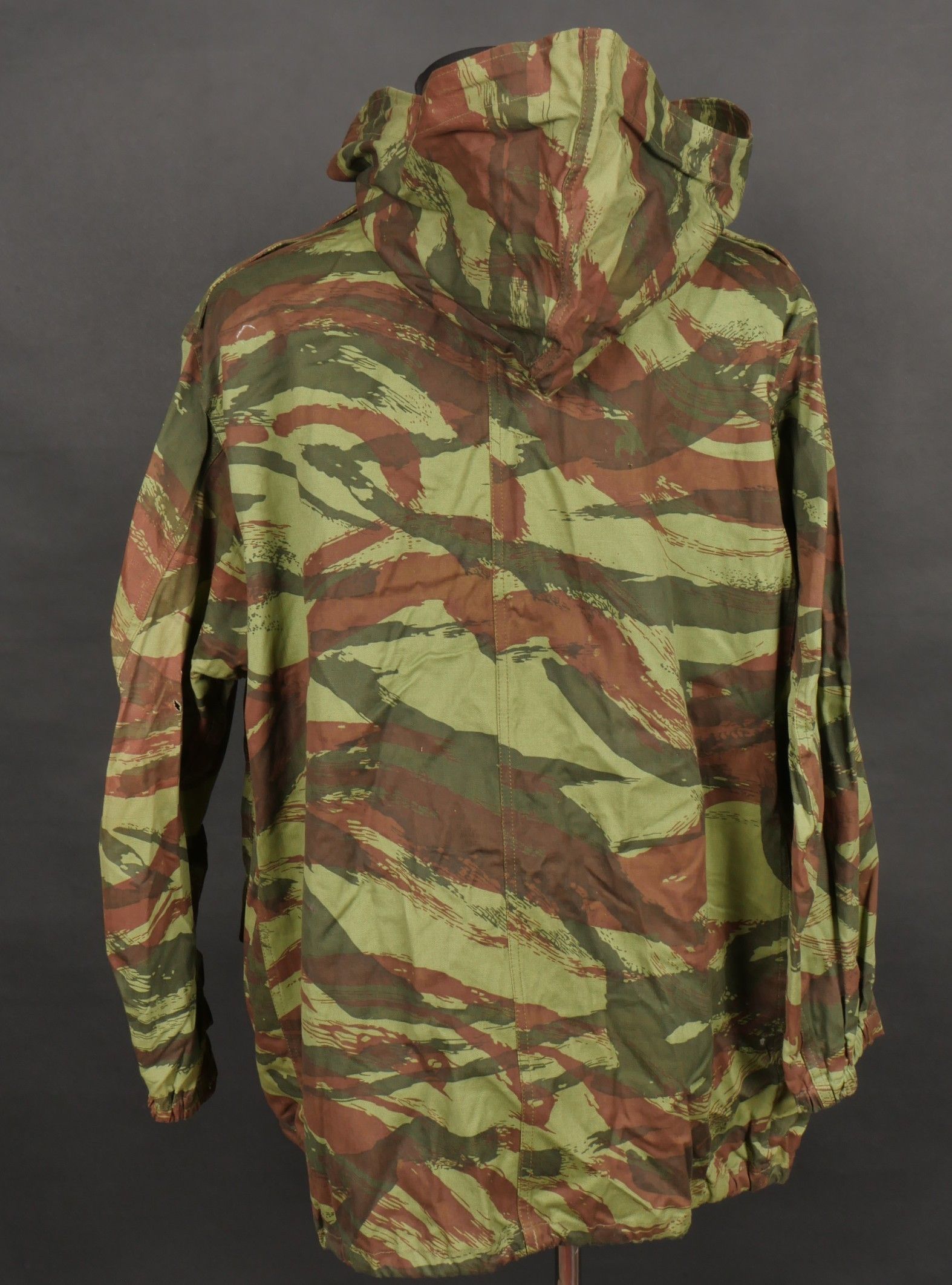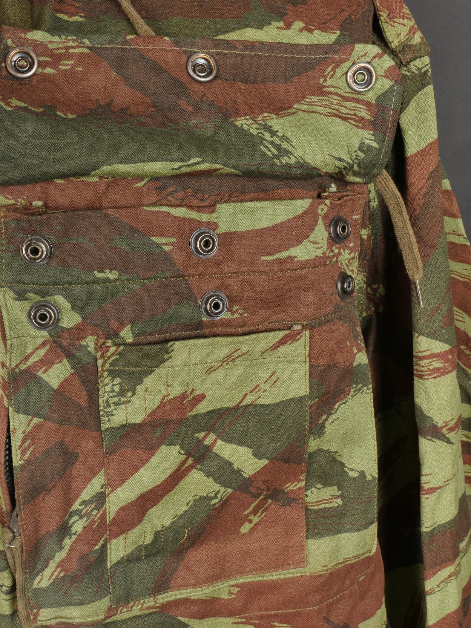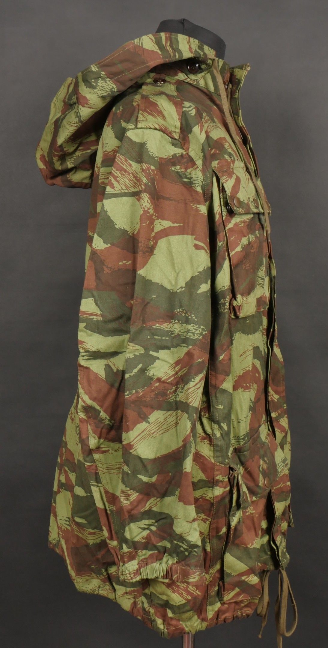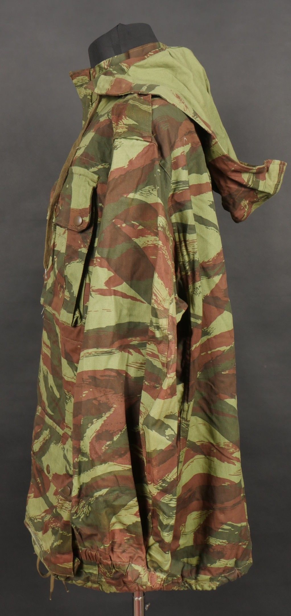 TAP 4756 camouflage jacket. Jacket made in 56 camouflage fabric, original paint press studs, Spidex zip, drawstring present. Biebuyck manufacturer's stamp, parachutist patent waiting above right breast pocket, decoration waiting above left breast. No eyelets on chest pockets. Size 32. Note two tears at top of left sleeve, original hood present, NH stamp. Sleeves tightened with elastic. TAP 4756 camouflage jacket. 1956 camouflage cloth original painted snaps Spidex zipper drawcord present maker Biebuyck loops for parachutist badge above right chest decoration loops above left chest no pocket eyelets size 32 two small snags upper left sleeve original hood present NH stamp elastic cuffs.