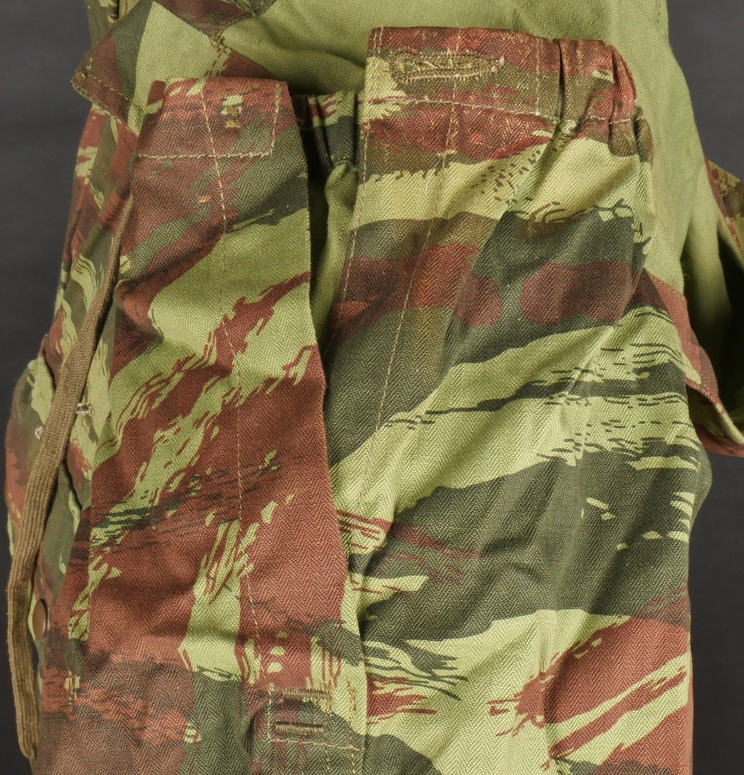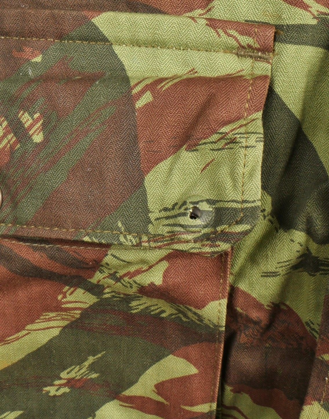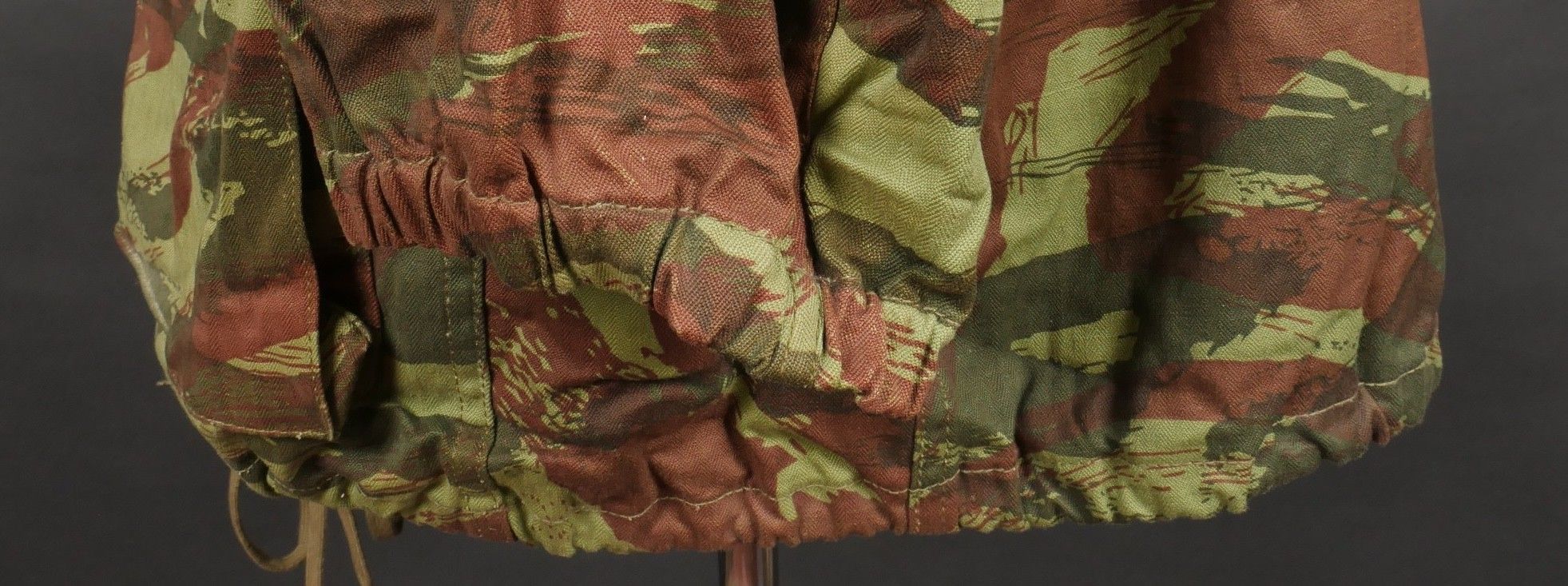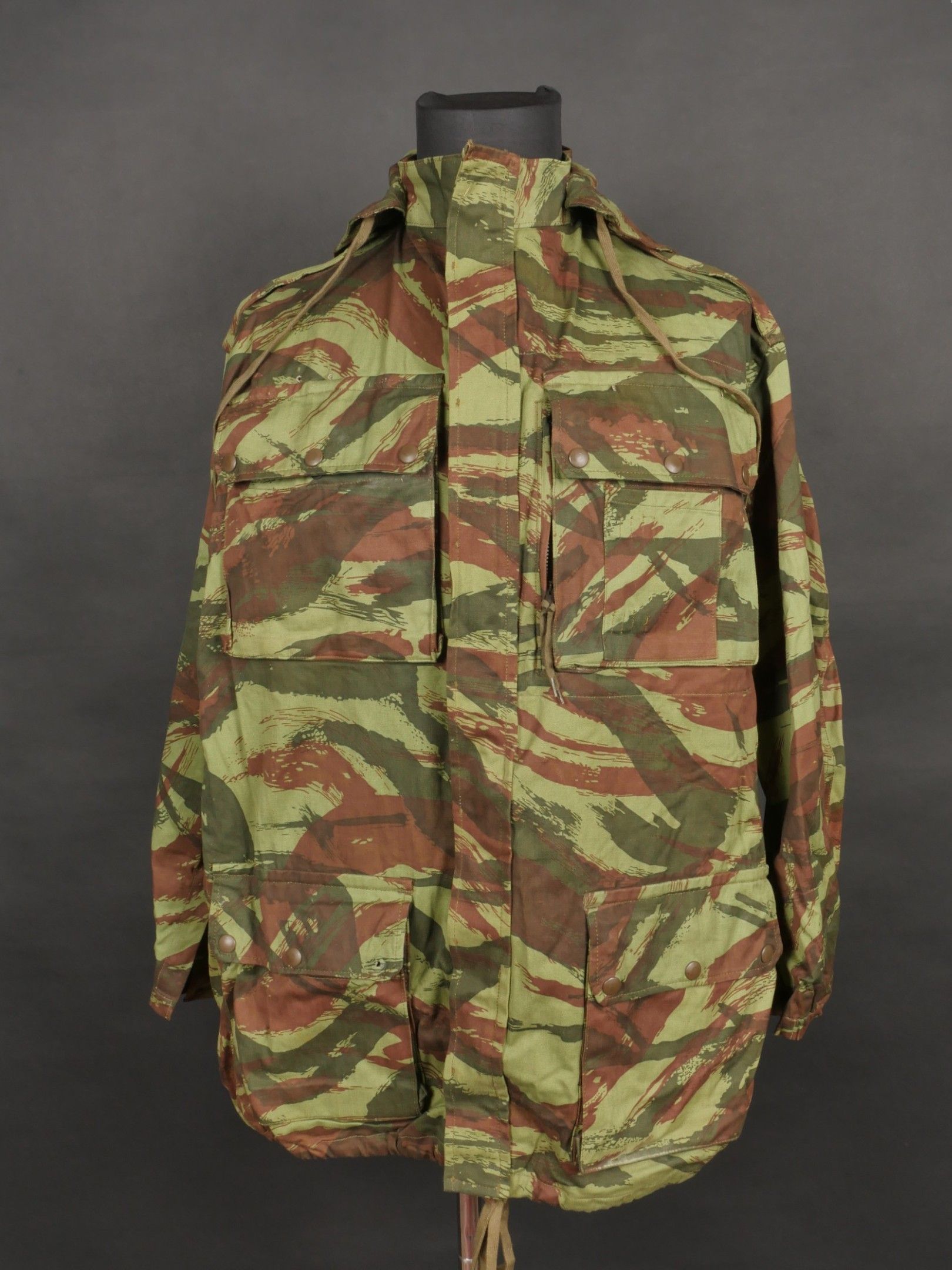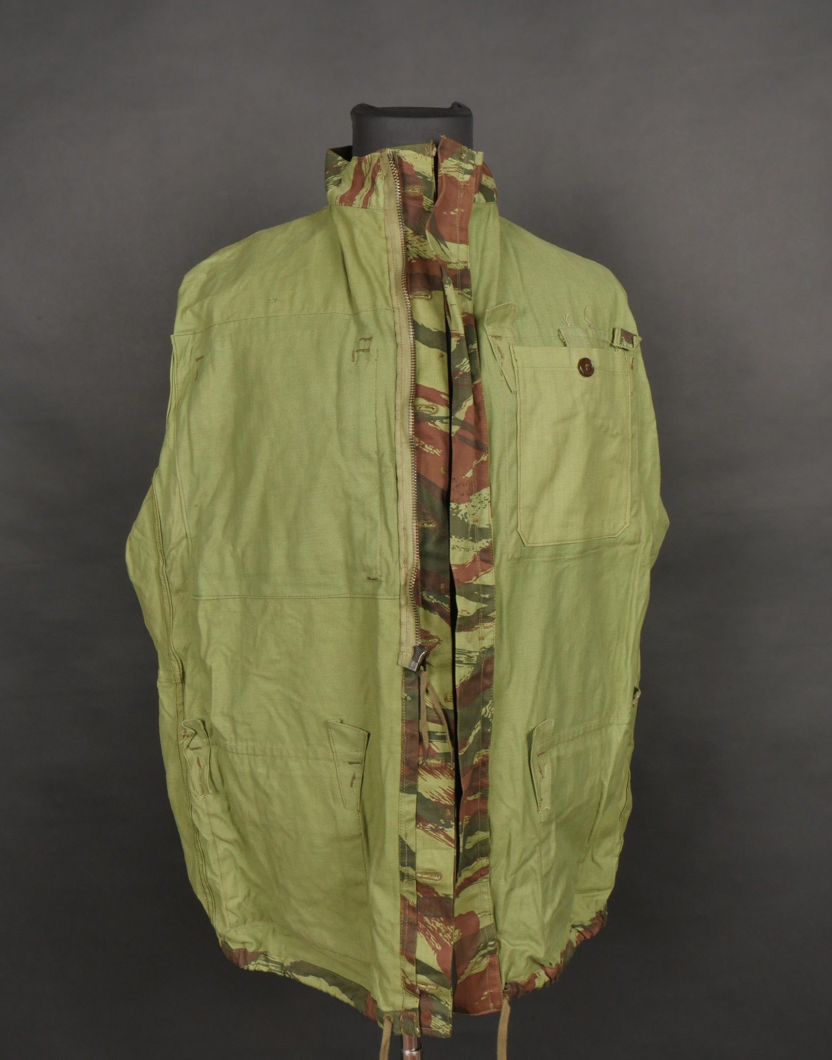 TAP 4756 camouflage jacket. Jacket made in 56 camouflage fabric, original paint press studs, Spidex zip, drawstring present. Biebuyck manufacturer's stamp, parachutist patent waiting above right breast pocket, decoration waiting above left breast. No eyelets on chest pockets. Size 32. Note two tears at top of left sleeve, original hood present, NH stamp. Sleeves tightened with elastic. TAP 4756 camouflage jacket. 1956 camouflage cloth original painted snaps Spidex zipper drawcord present maker Biebuyck loops for parachutist badge above right chest decoration loops above left chest no pocket eyelets size 32 two small snags upper left sleeve original hood present NH stamp elastic cuffs.