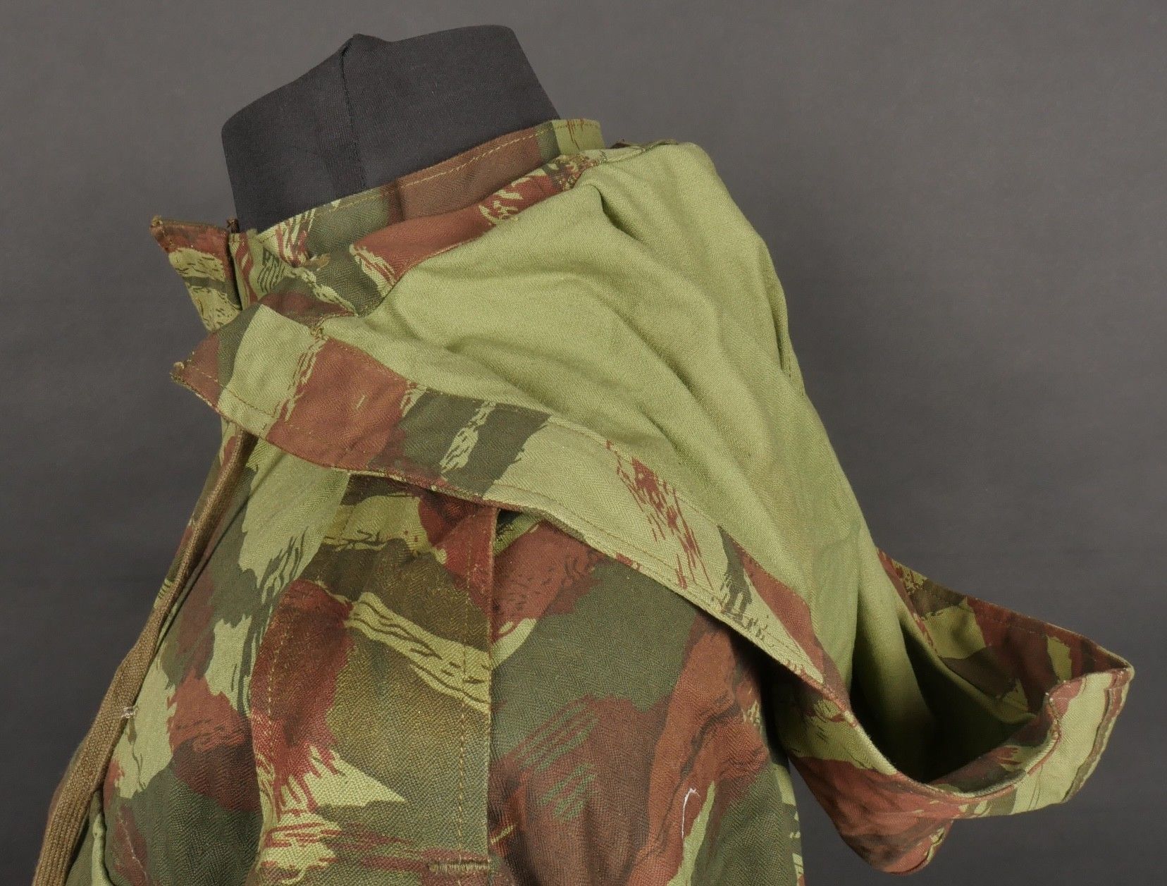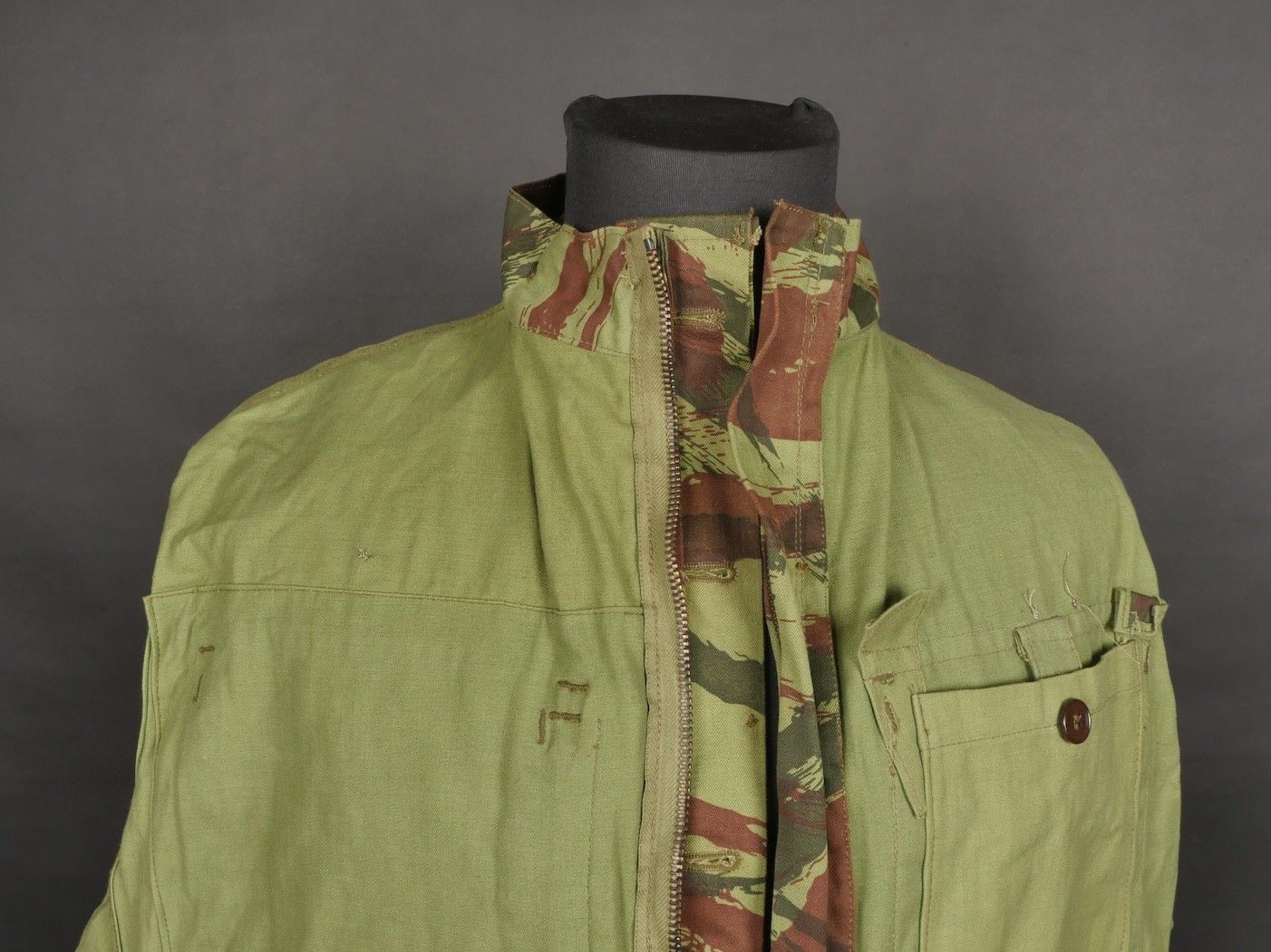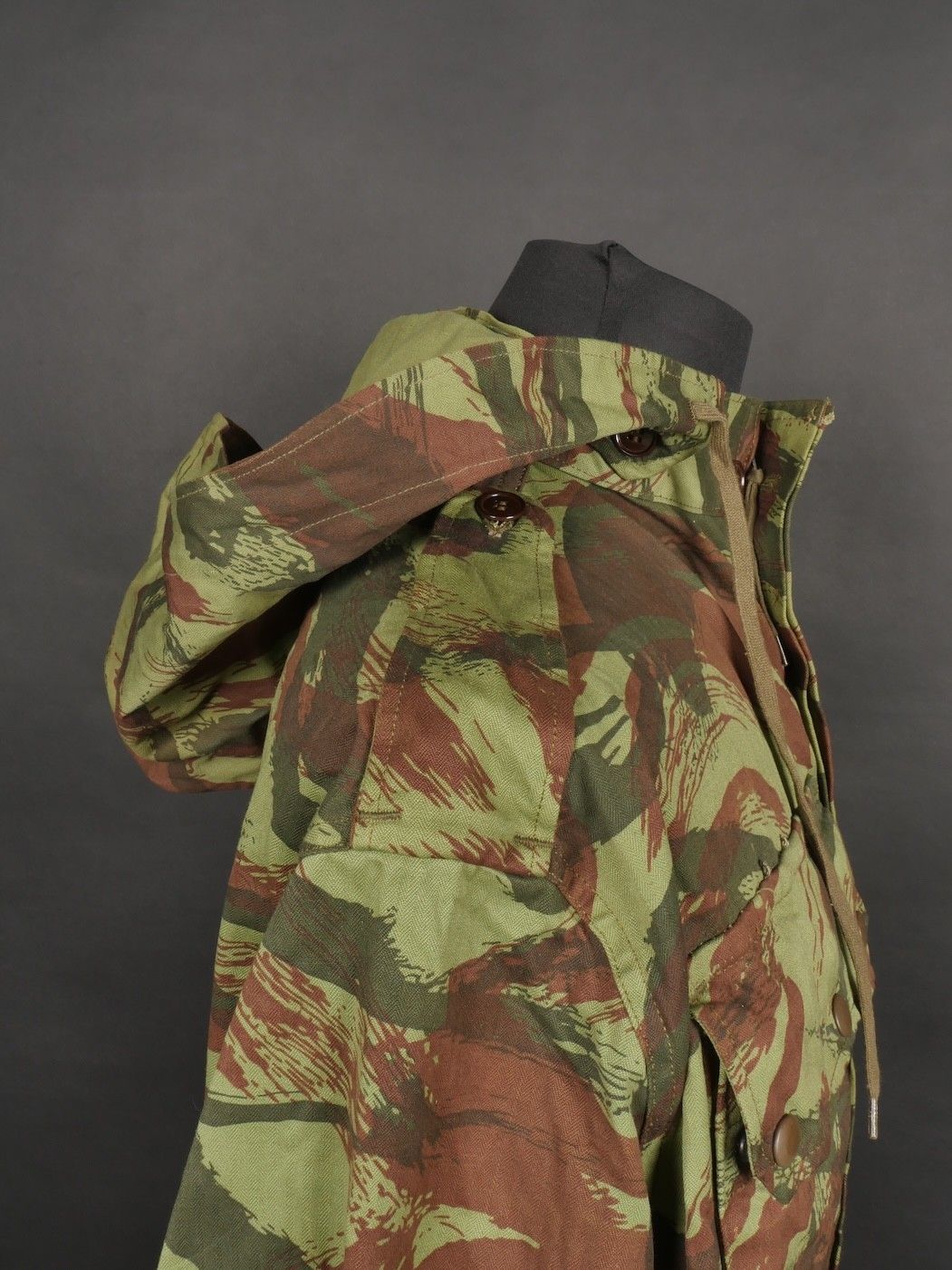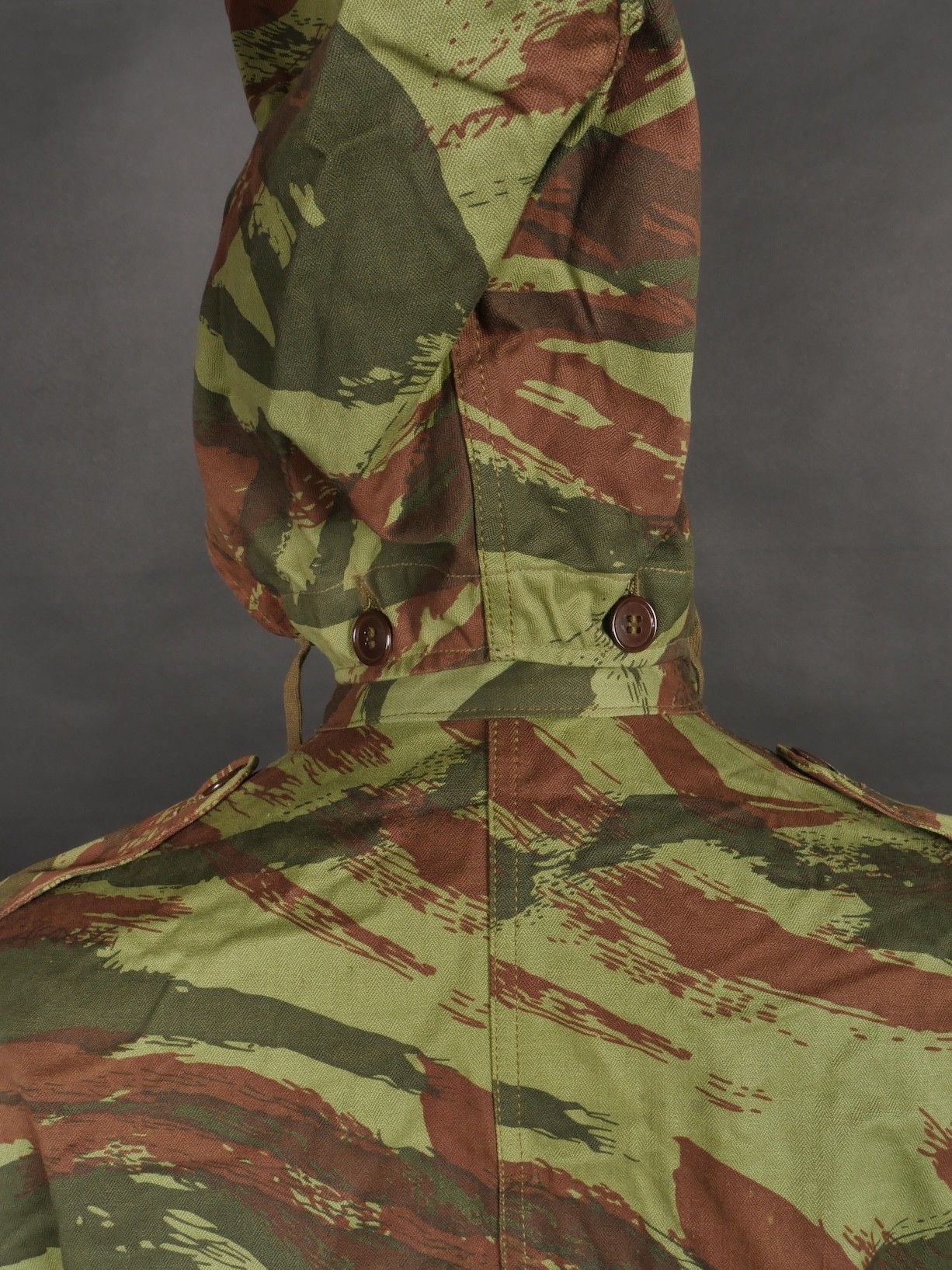 TAP 4756 camouflage jacket. Jacket made in 56 camouflage fabric, original paint press studs, Spidex zip, drawstring present. Biebuyck manufacturer's stamp, parachutist patent waiting above right breast pocket, decoration waiting above left breast. No eyelets on chest pockets. Size 32. Note two tears at top of left sleeve, original hood present, NH stamp. Sleeves tightened with elastic. TAP 4756 camouflage jacket. 1956 camouflage cloth original painted snaps Spidex zipper drawcord present maker Biebuyck loops for parachutist badge above right chest decoration loops above left chest no pocket eyelets size 32 two small snags upper left sleeve original hood present NH stamp elastic cuffs.