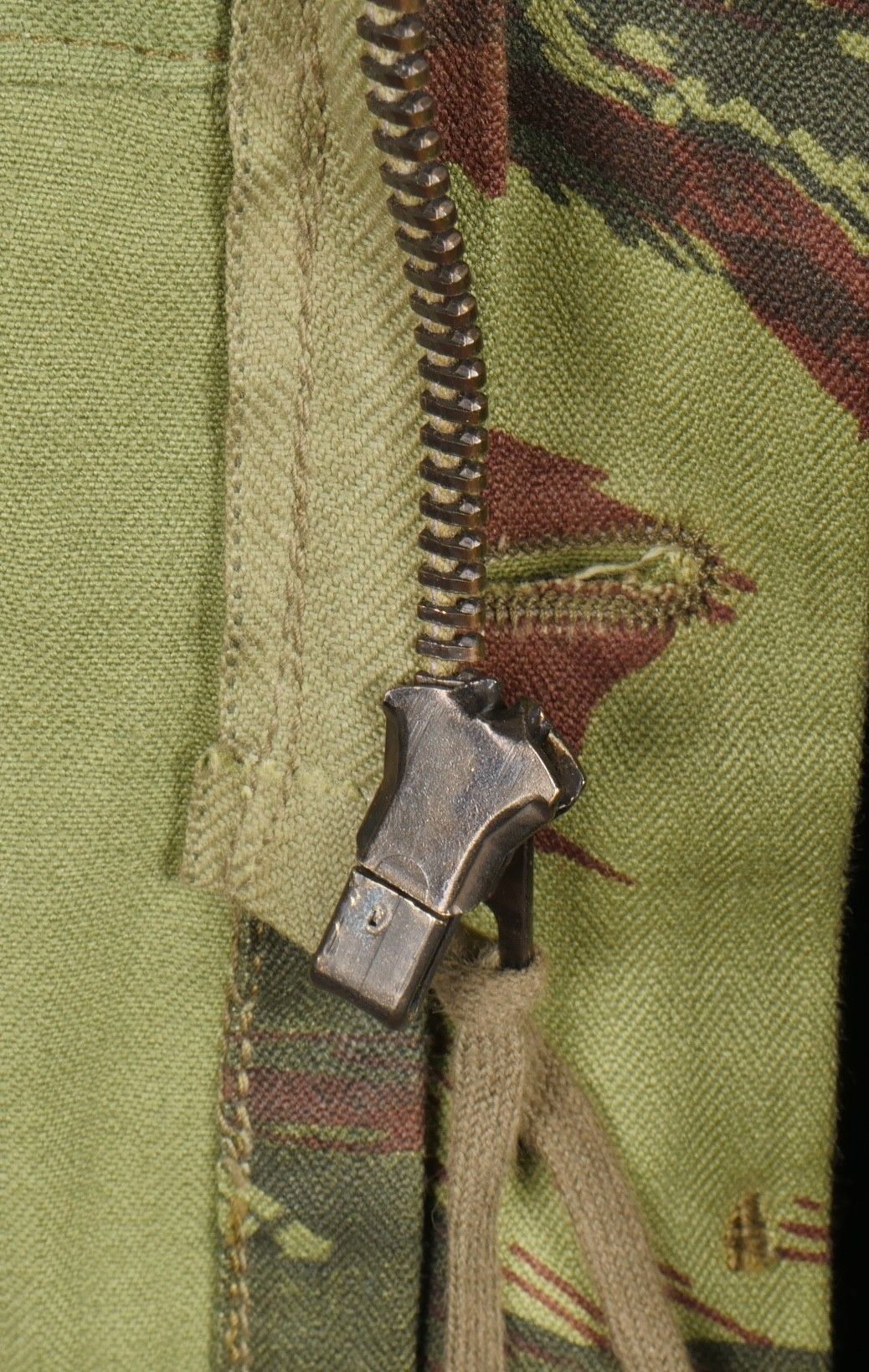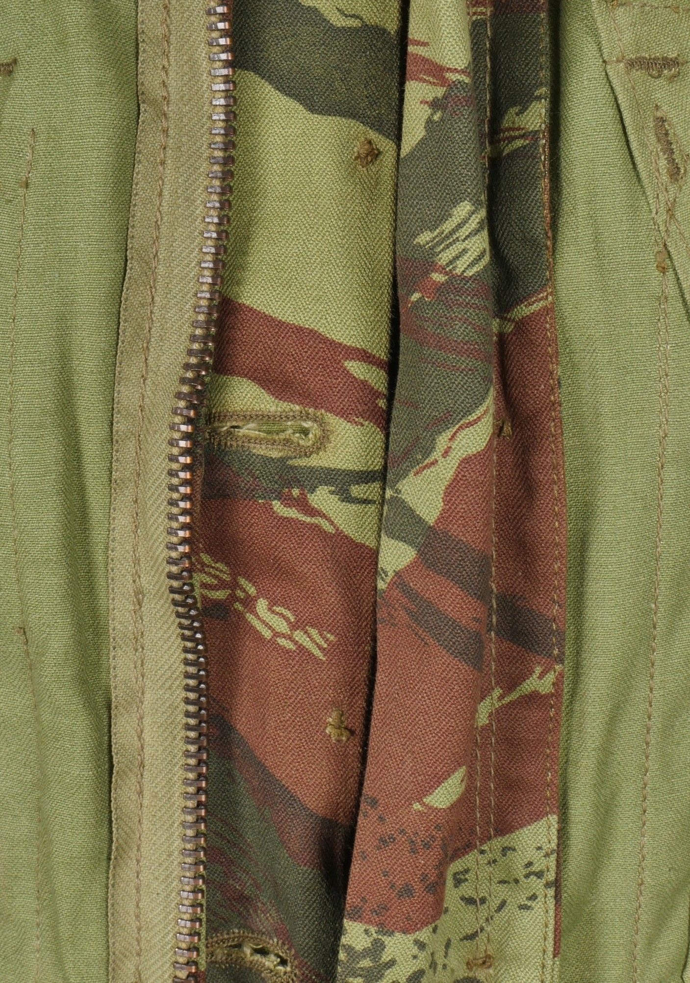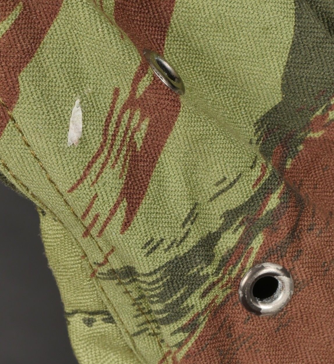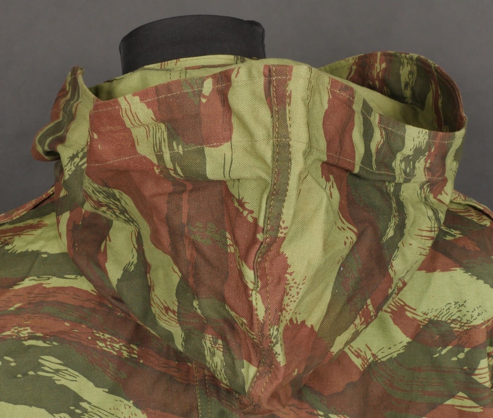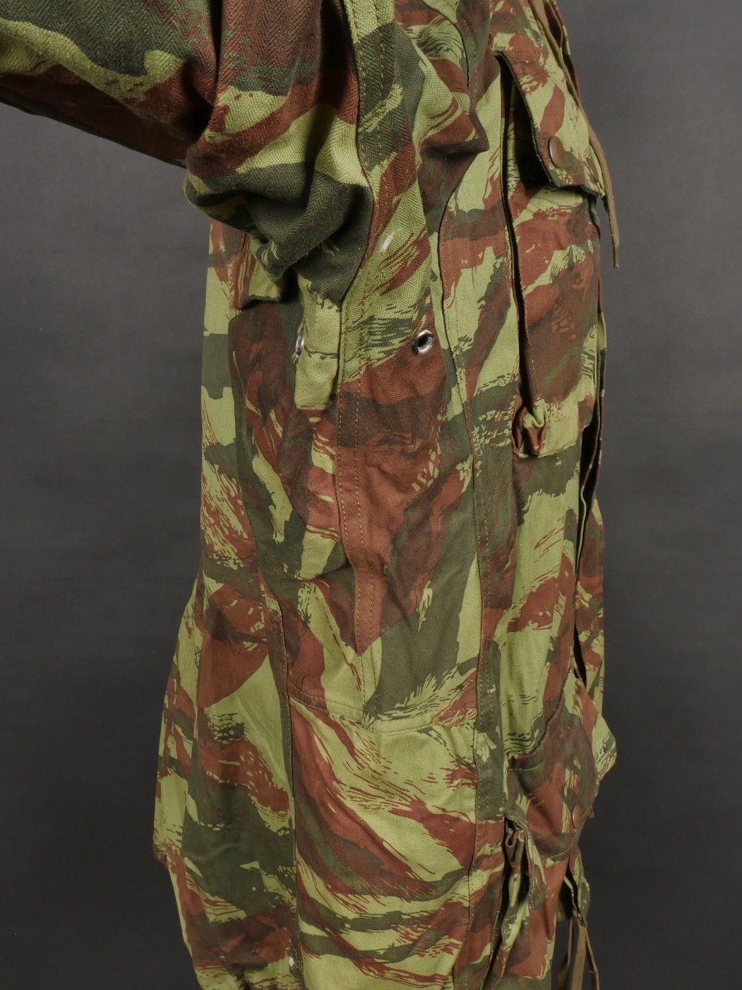 TAP 4756 camouflage jacket. Jacket made in 56 camouflage fabric, original paint press studs, Spidex zip, drawstring present. Biebuyck manufacturer's stamp, parachutist patent waiting above right breast pocket, decoration waiting above left breast. No eyelets on chest pockets. Size 32. Note two tears at top of left sleeve, original hood present, NH stamp. Sleeves tightened with elastic. TAP 4756 camouflage jacket. 1956 camouflage cloth original painted snaps Spidex zipper drawcord present maker Biebuyck loops for parachutist badge above right chest decoration loops above left chest no pocket eyelets size 32 two small snags upper left sleeve original hood present NH stamp elastic cuffs.
