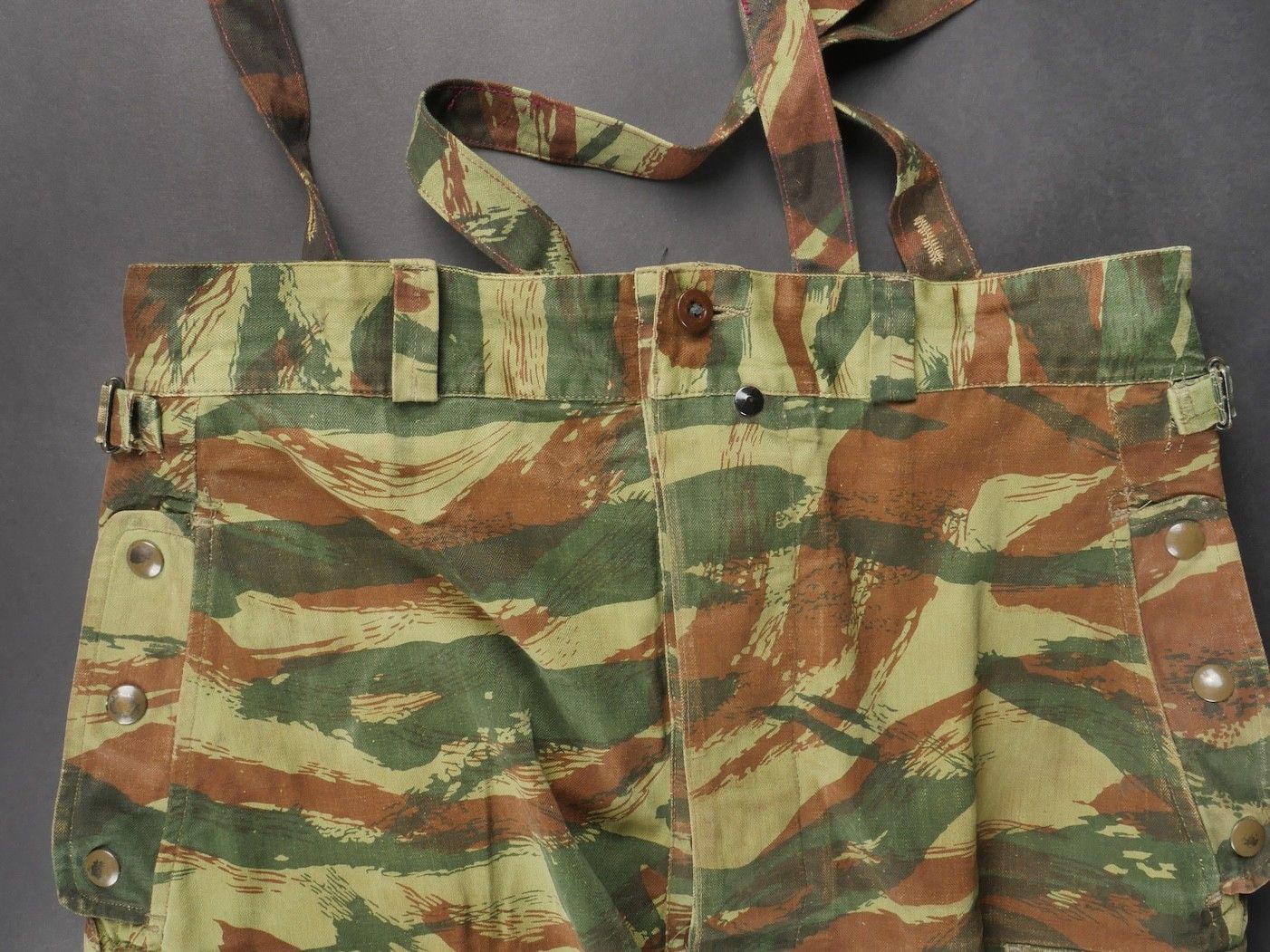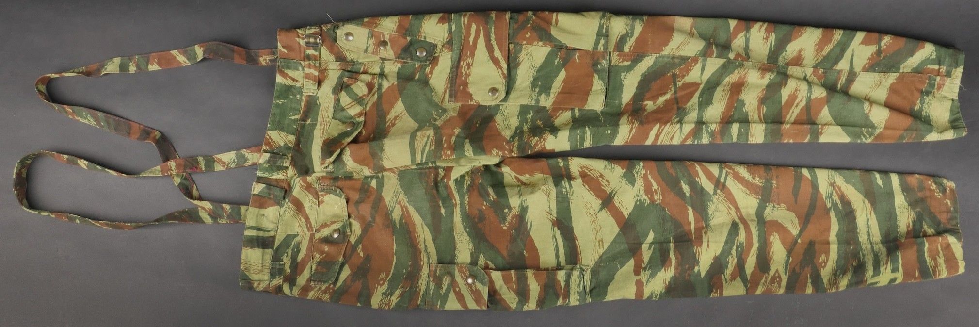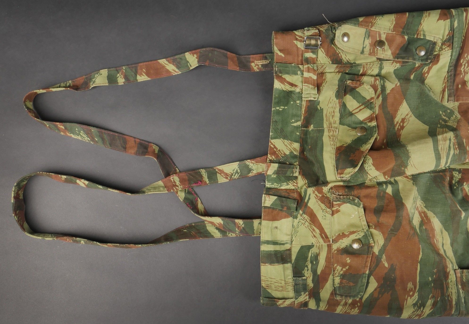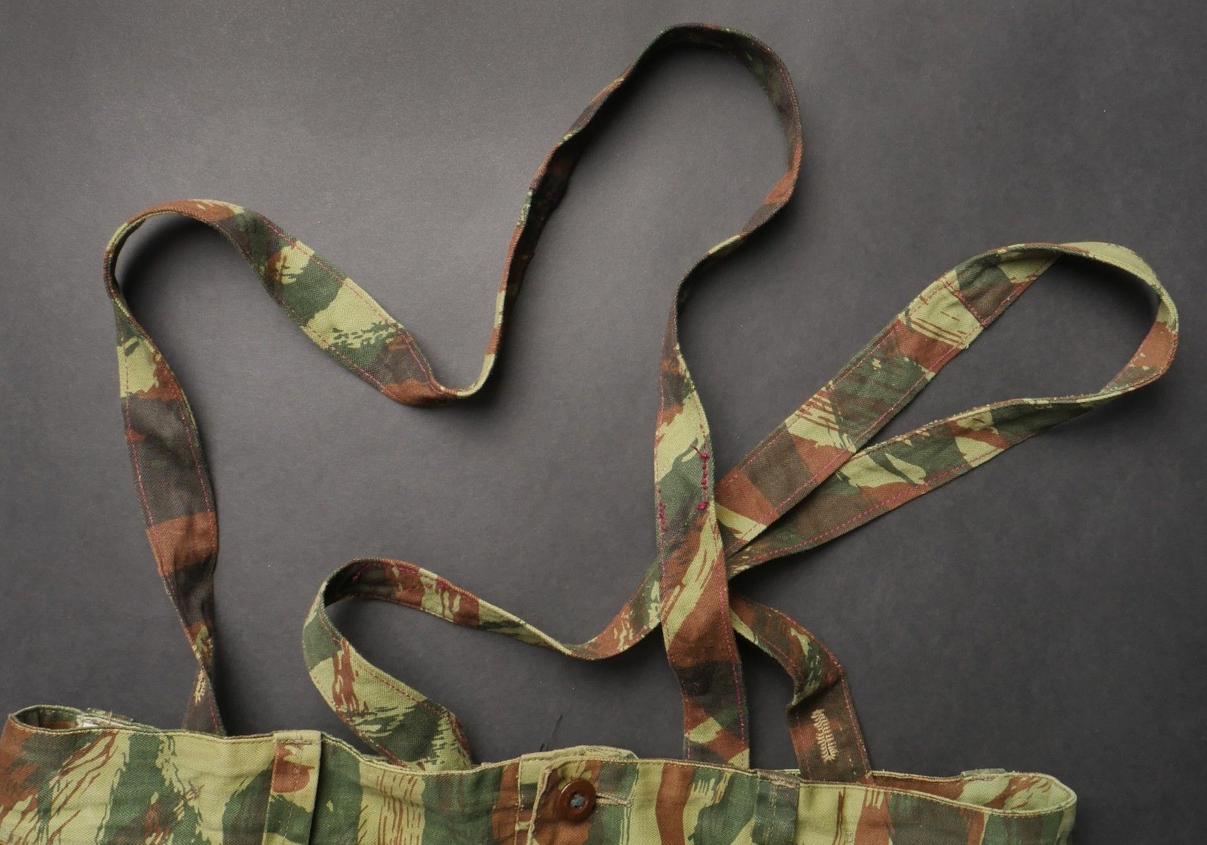 TAP 4756 camouflage trousers. Camouflage canvas trousers 56, press studs, no eyelets to pockets. Two buttock pockets indicating pre-1961 manufacture, hip straps, two fly buttons replaced, size 33, manufacturer's markings illegible. With original braces, tightened at bottom of legs. TAP 4756 camouflage trousers. 1956 camouflage canvas painted snaps no pocket eyelets twin rear pockets indicating pre1961 manufacture waist adjusters two replaced fly buttons size 33 illegible maker original braces ankle ties.