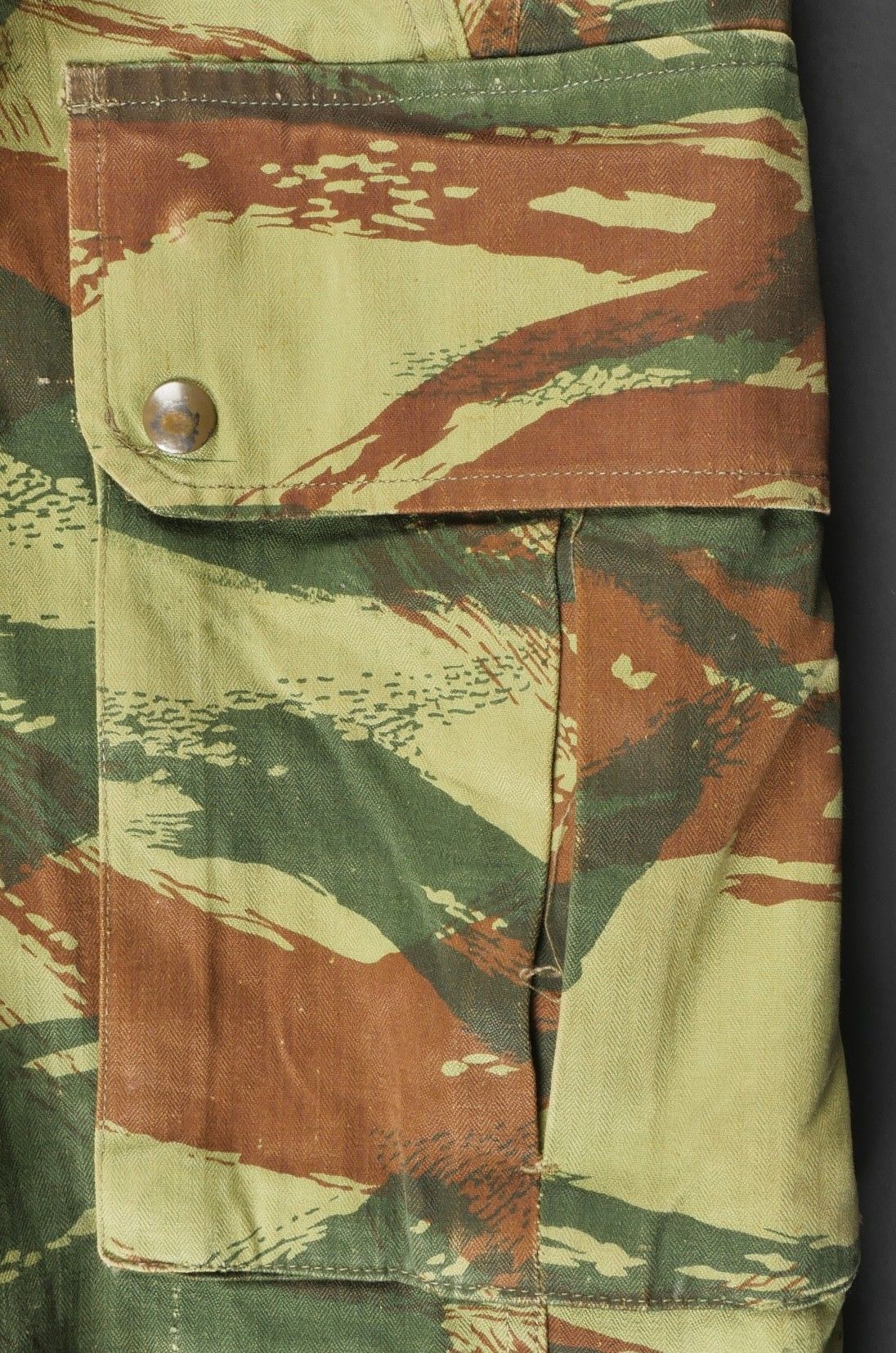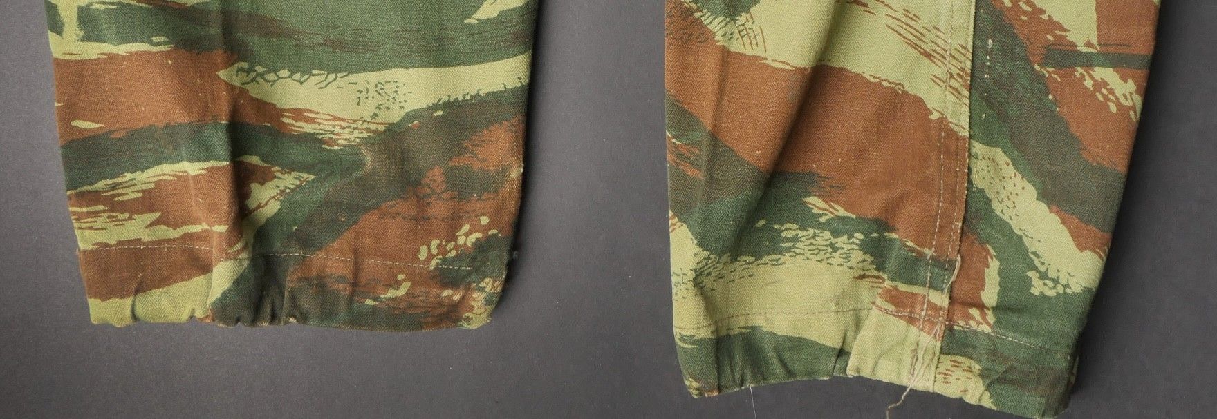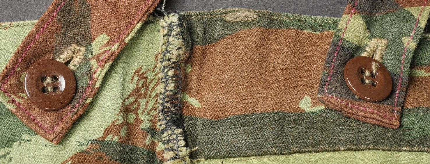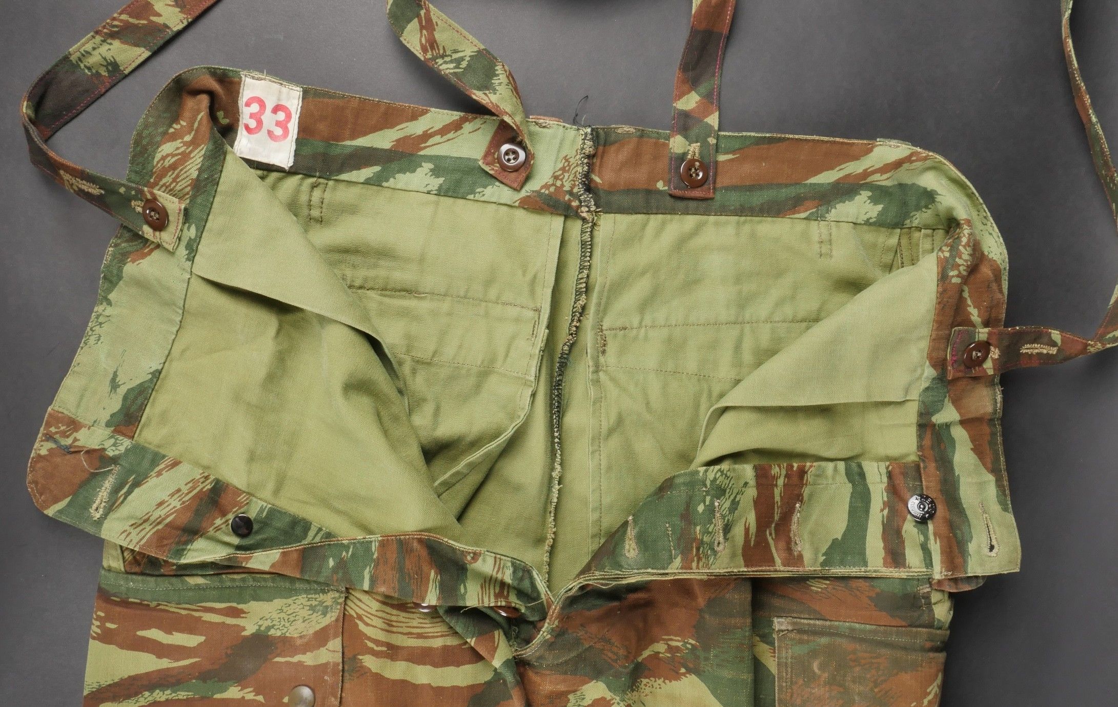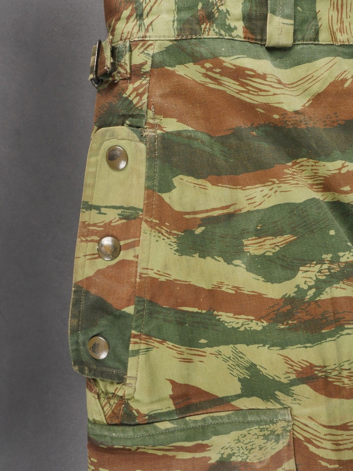 TAP 4756 camouflage trousers. Camouflage canvas trousers 56, press studs, no eyelets to pockets. Two buttock pockets indicating pre-1961 manufacture, hip straps, two fly buttons replaced, size 33, manufacturer's markings illegible. With original braces, tightened at bottom of legs. TAP 4756 camouflage trousers. 1956 camouflage canvas painted snaps no pocket eyelets twin rear pockets indicating pre1961 manufacture waist adjusters two replaced fly buttons size 33 illegible maker original braces ankle ties.