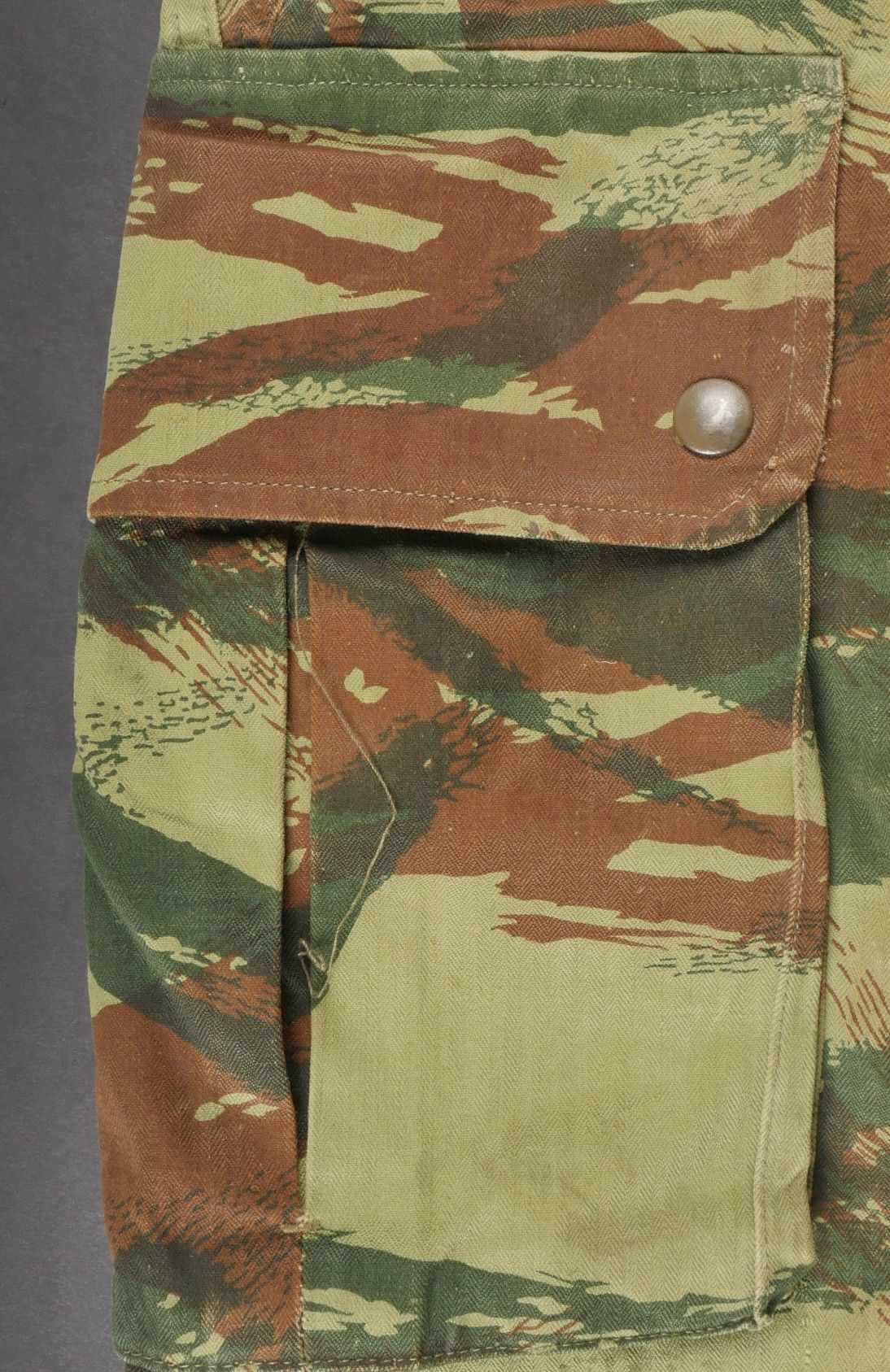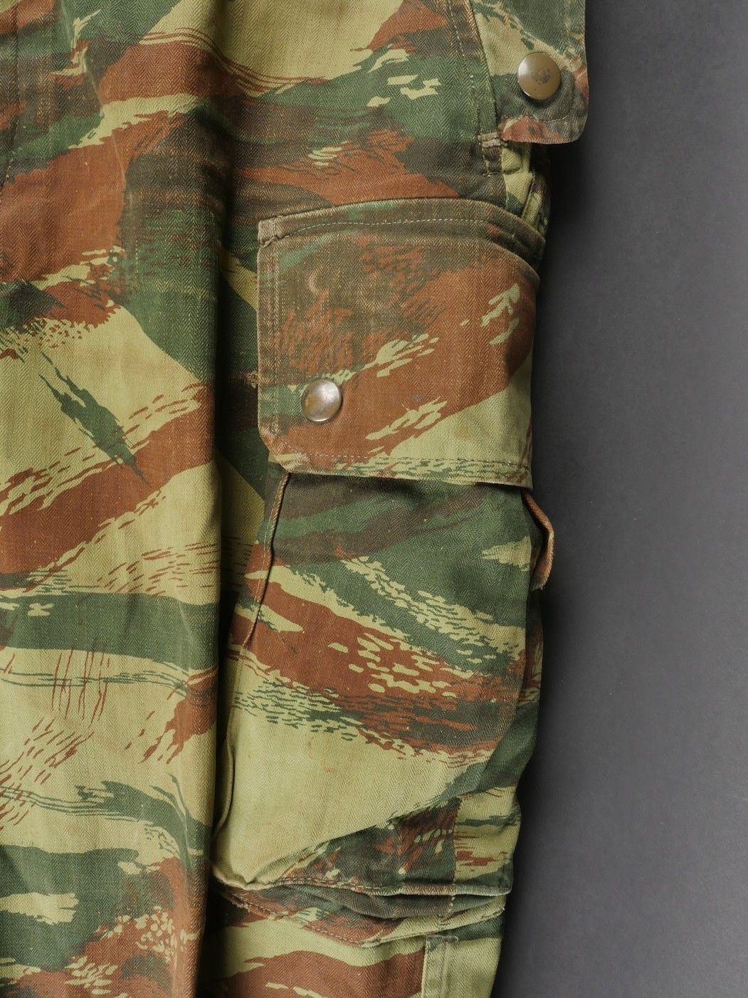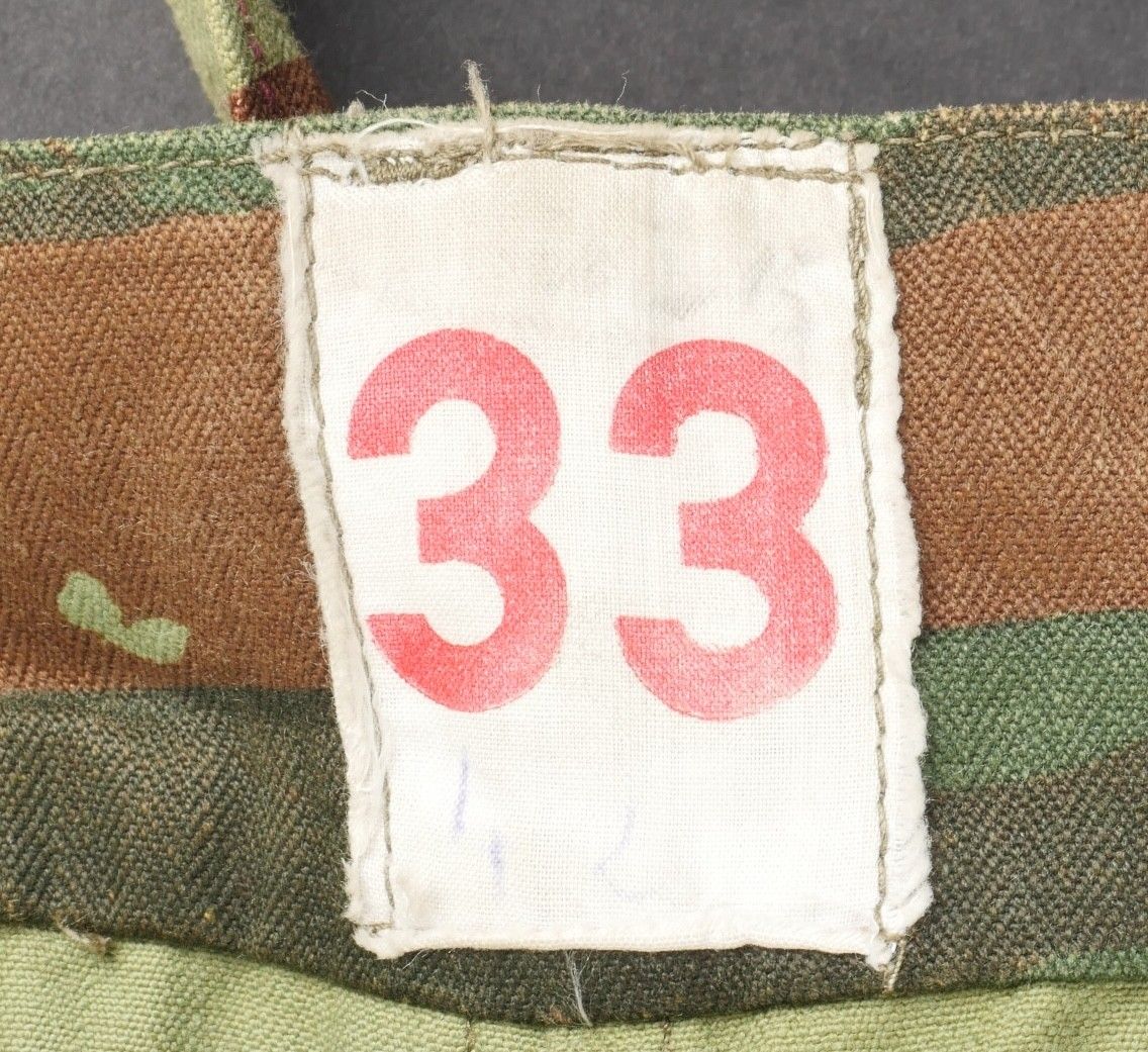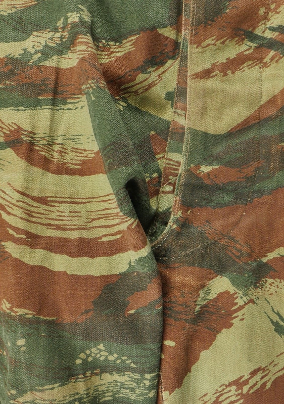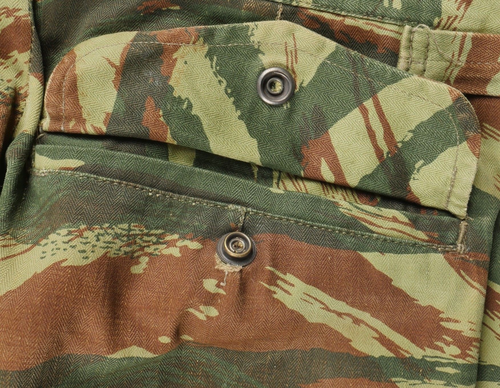 TAP 4756 camouflage trousers. Camouflage canvas trousers 56, press studs, no eyelets to pockets. Two buttock pockets indicating pre-1961 manufacture, hip straps, two fly buttons replaced, size 33, manufacturer's markings illegible. With original braces, tightened at bottom of legs. TAP 4756 camouflage trousers. 1956 camouflage canvas painted snaps no pocket eyelets twin rear pockets indicating pre1961 manufacture waist adjusters two replaced fly buttons size 33 illegible maker original braces ankle ties.