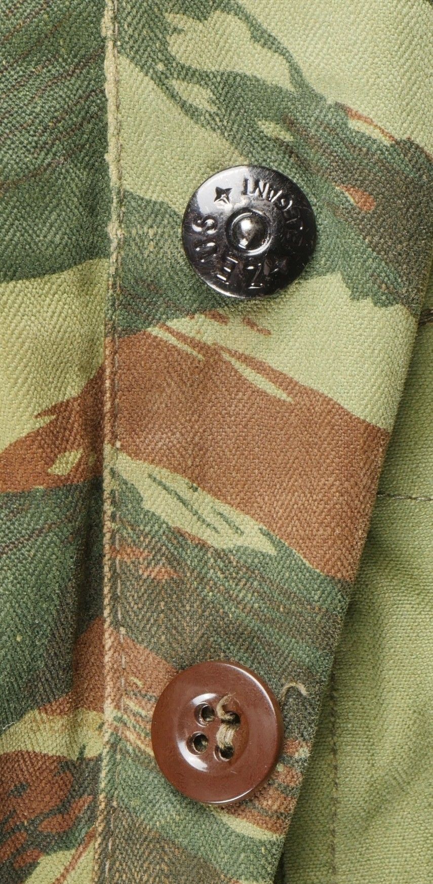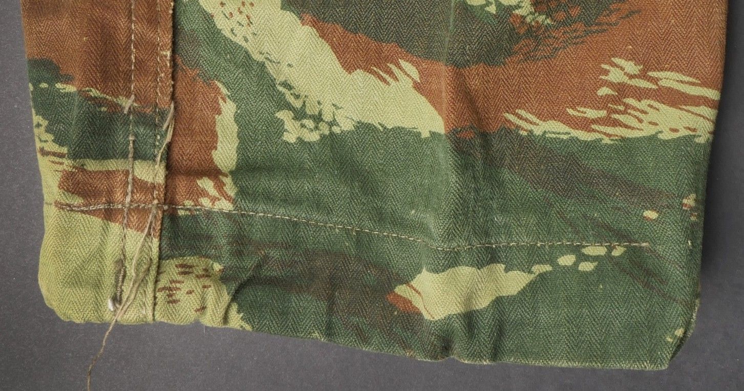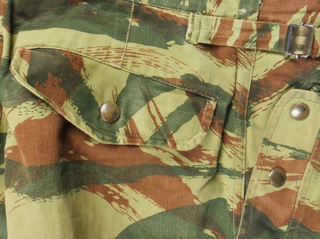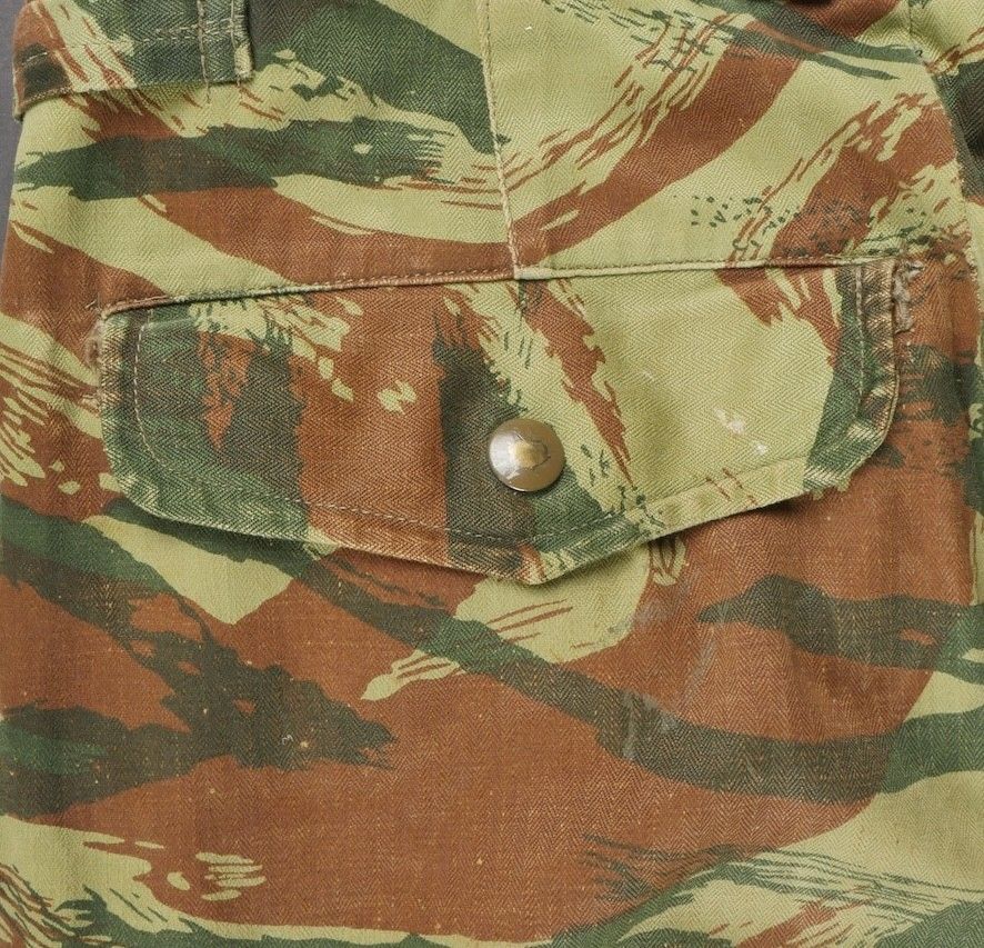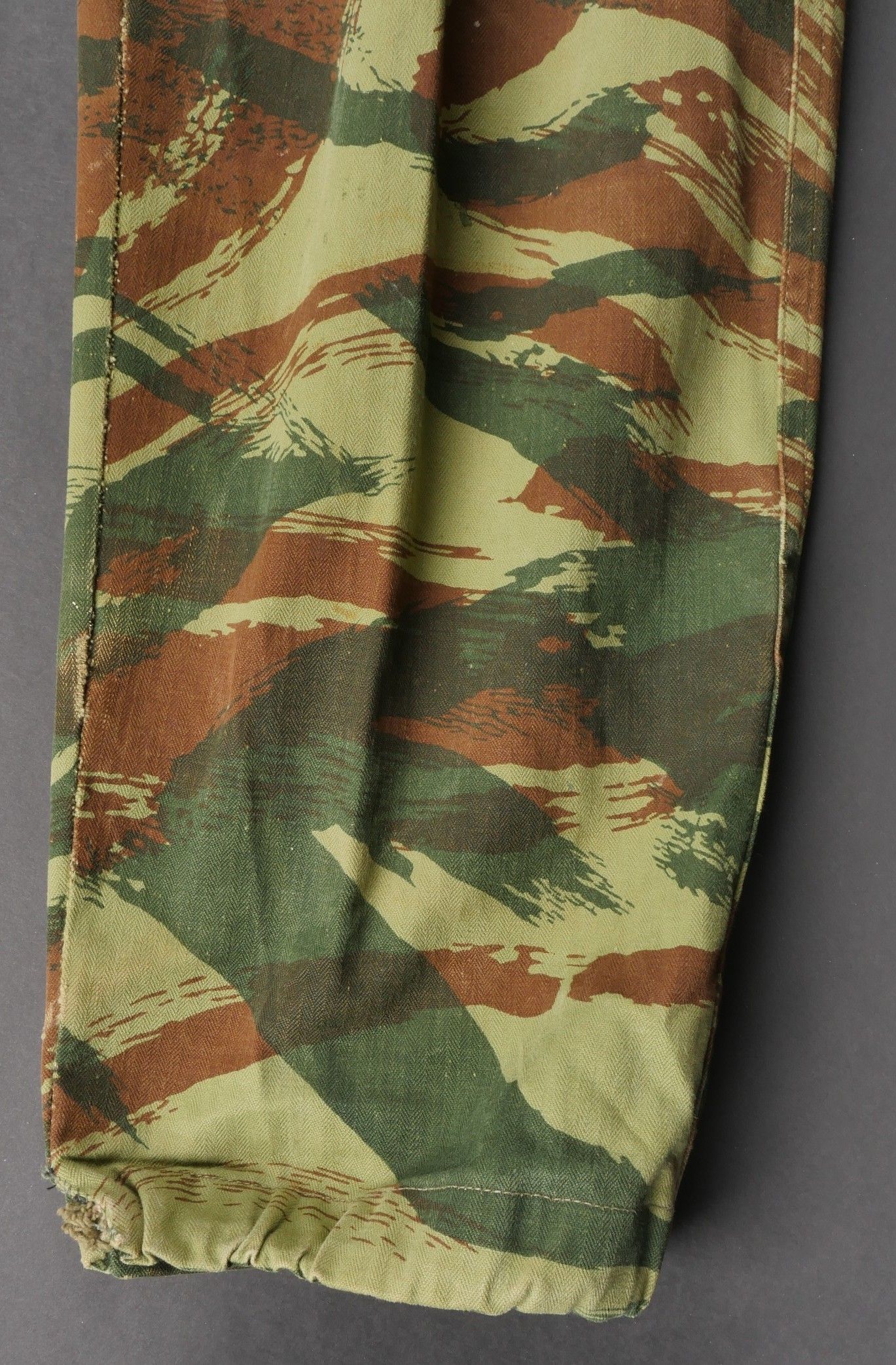 TAP 4756 camouflage trousers. Camouflage canvas trousers 56, press studs, no eyelets to pockets. Two buttock pockets indicating pre-1961 manufacture, hip straps, two fly buttons replaced, size 33, manufacturer's markings illegible. With original braces, tightened at bottom of legs. TAP 4756 camouflage trousers. 1956 camouflage canvas painted snaps no pocket eyelets twin rear pockets indicating pre1961 manufacture waist adjusters two replaced fly buttons size 33 illegible maker original braces ankle ties.