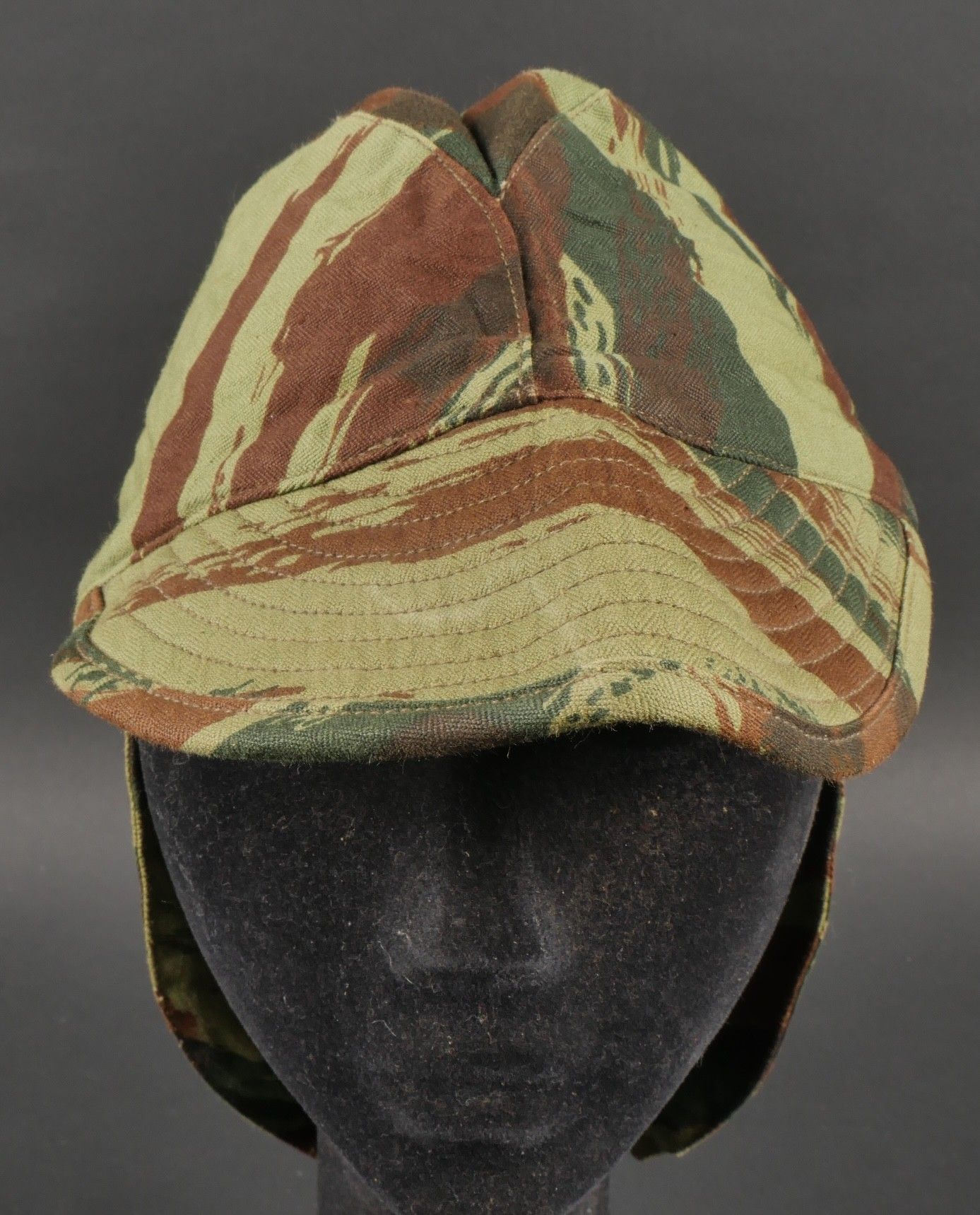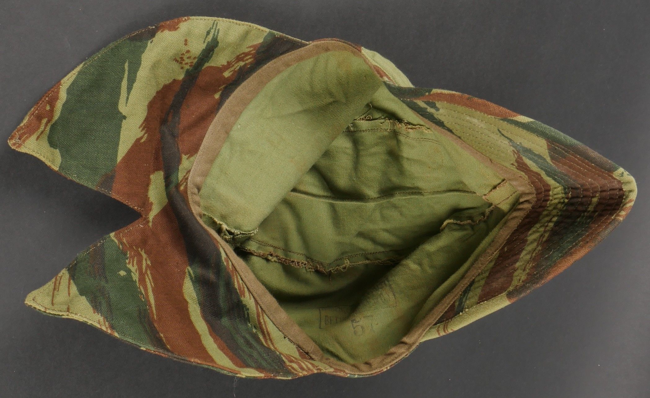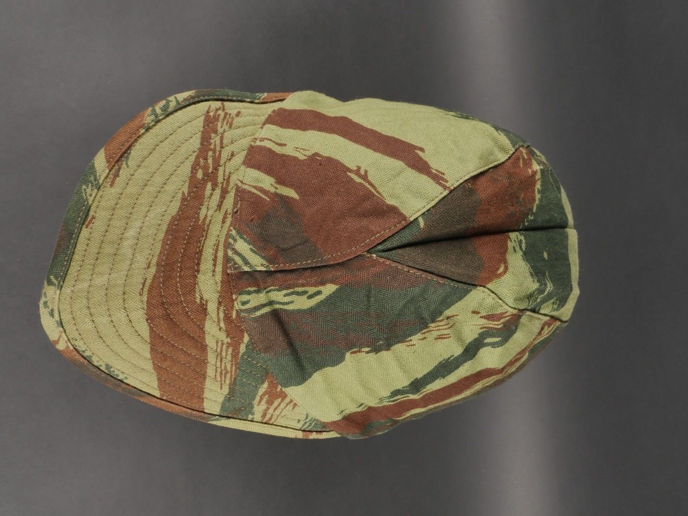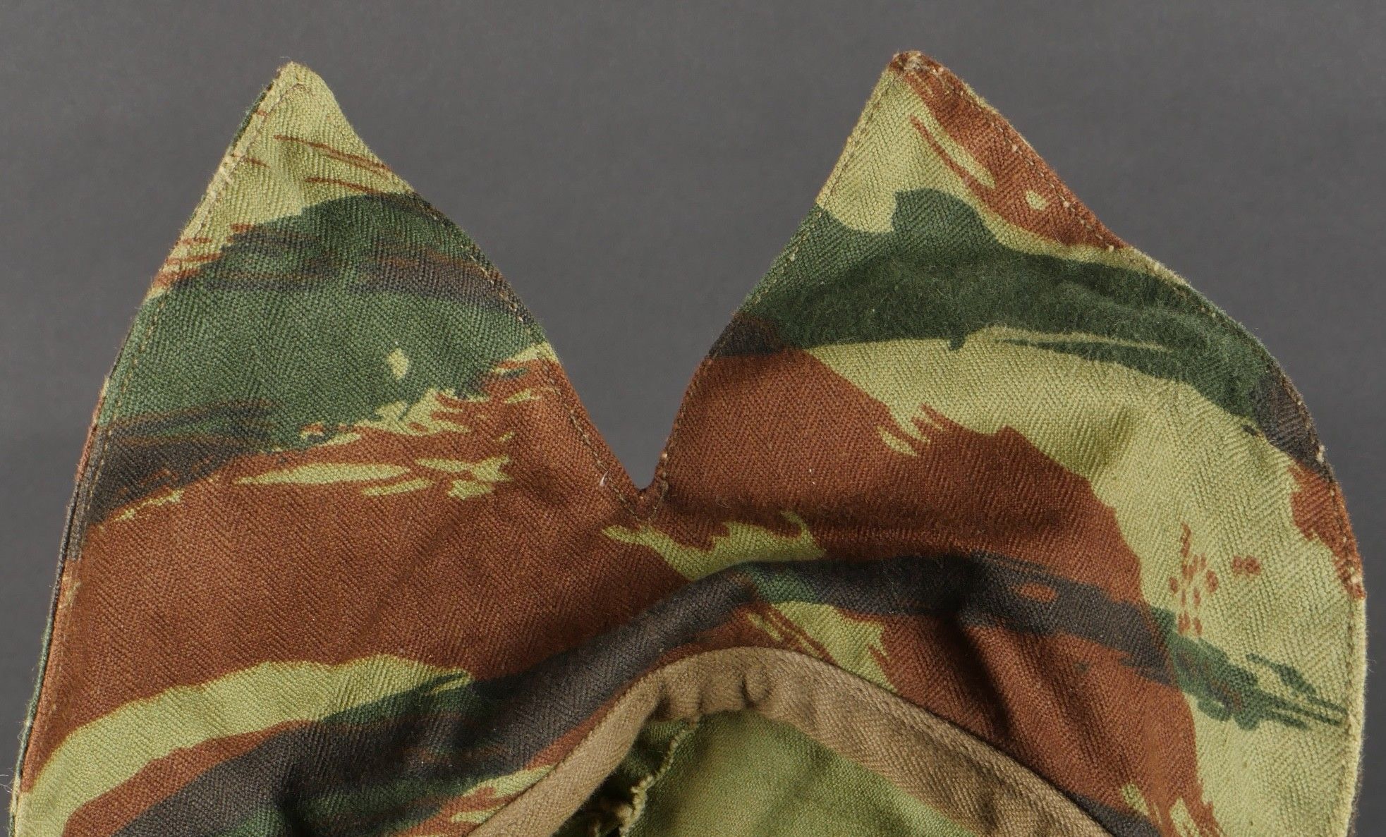 Bigeard cap for airborne troops during the Algerian war, made from camouflage fabric 4756, stamped by a manufacturer in Béthune and size 57. Very good condition, lightly worn. Bigeard cap for airborne troops during Algerian War made of 4756 camouflage cloth maker Béthune size 57 very good lightly worn.