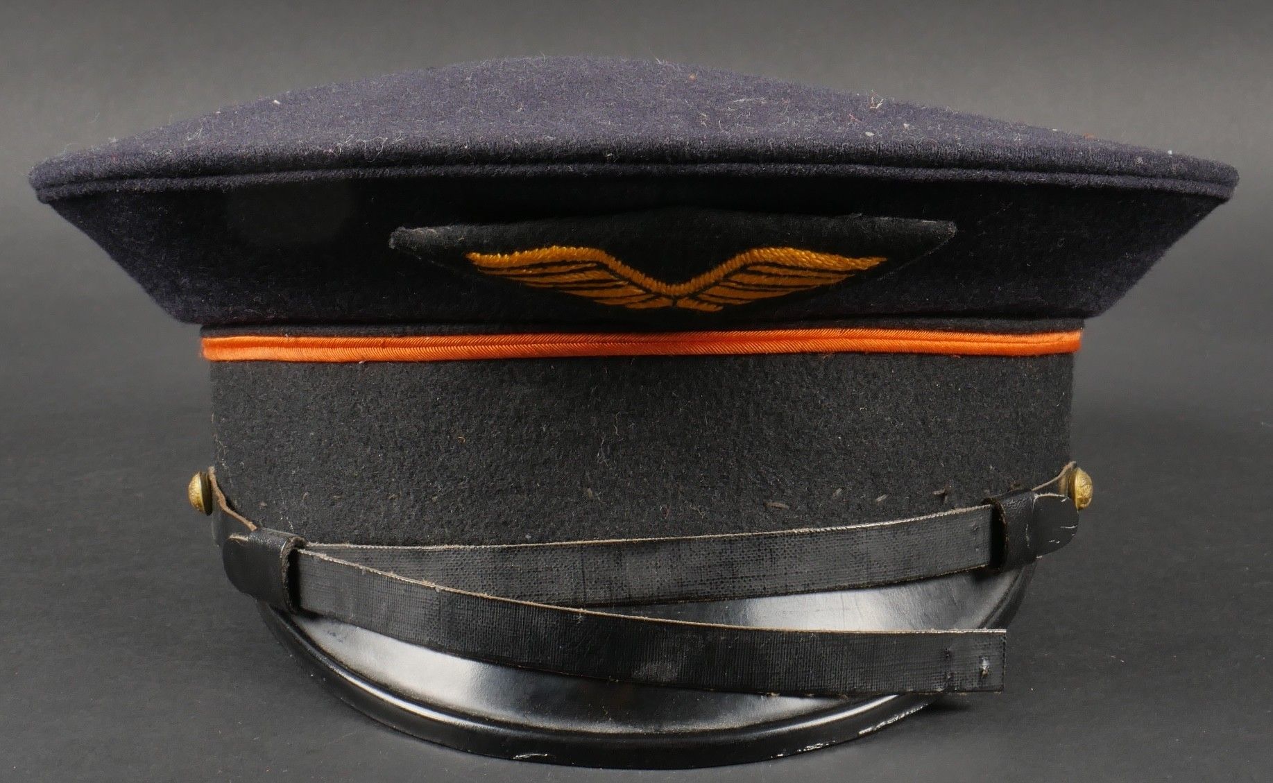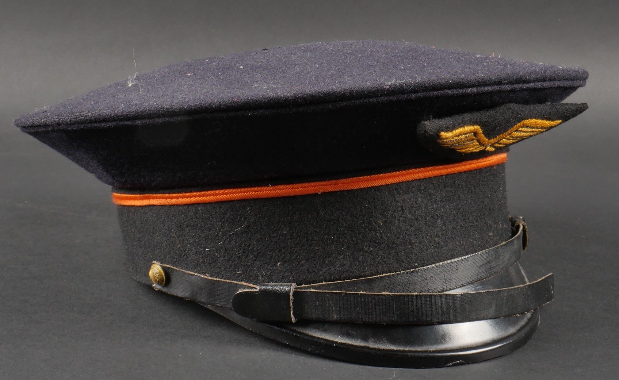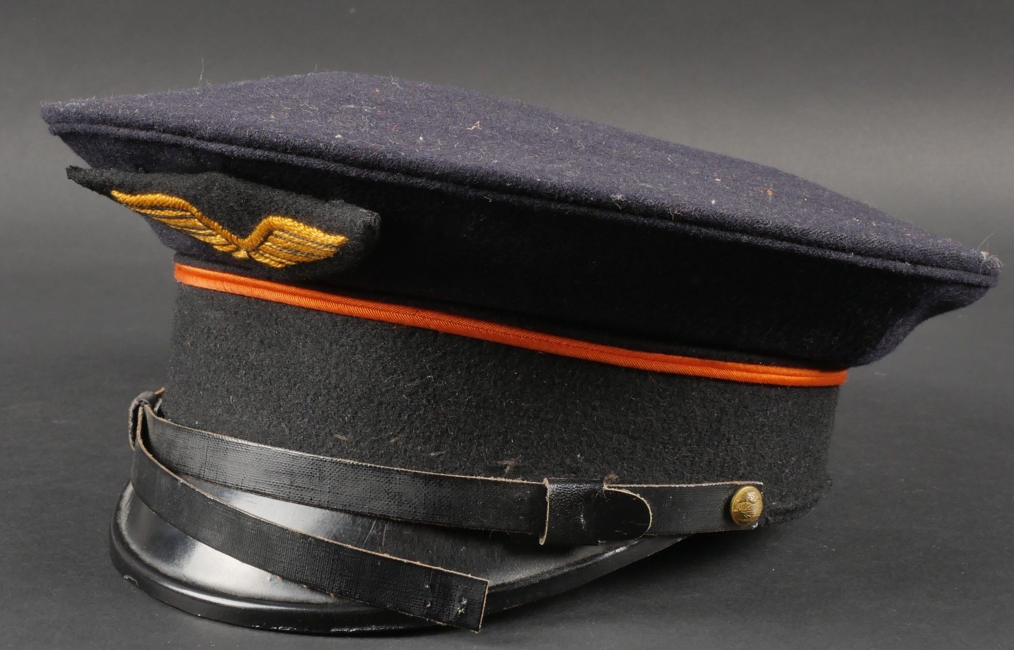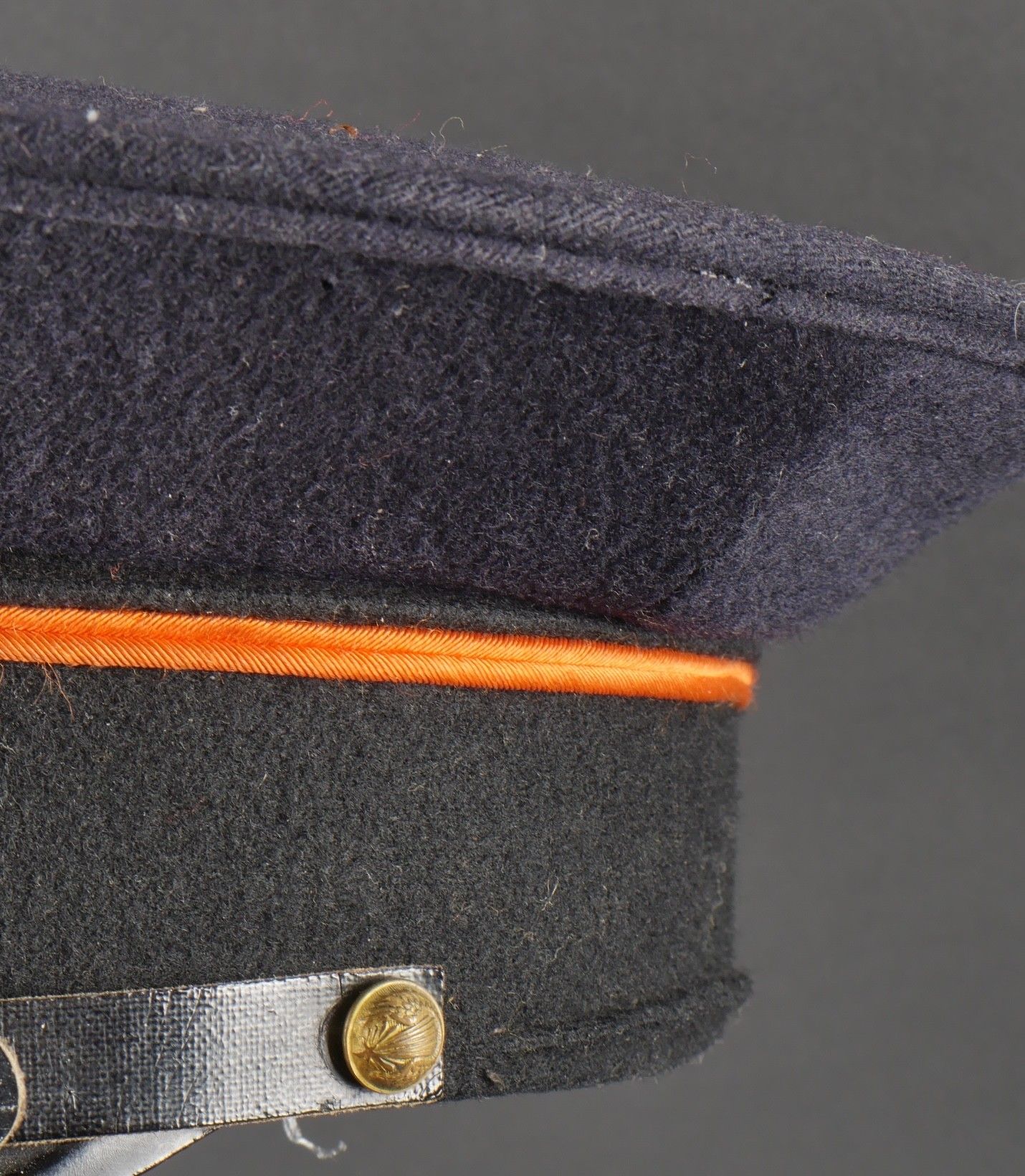 Set comprising an Armée de l'Air model 35 cap. Made of blue woollen cloth, orange piping, small buttons decorated with the insignia of the Armée de l'Air holding a false chinstrap. Fabric front insignia, with Troop-type wings. Composite visor, black leather headband, label on the back of the cap from a tailor in Albi. Also included is a regulation Métropole bush hat, beige canvas, paint pressure, SEMA manufacturer's stamp and size 56. Set including Air Force cap model 35 blue wool with orange piping small buttons bearing Air Force insignia holding false chinstrap cloth badge with wings troop type composite visor black leather sweatband label from tailor in Albi. With it a regulation metropolitan bush hat beige canvas painted snap SEMA maker size 56.