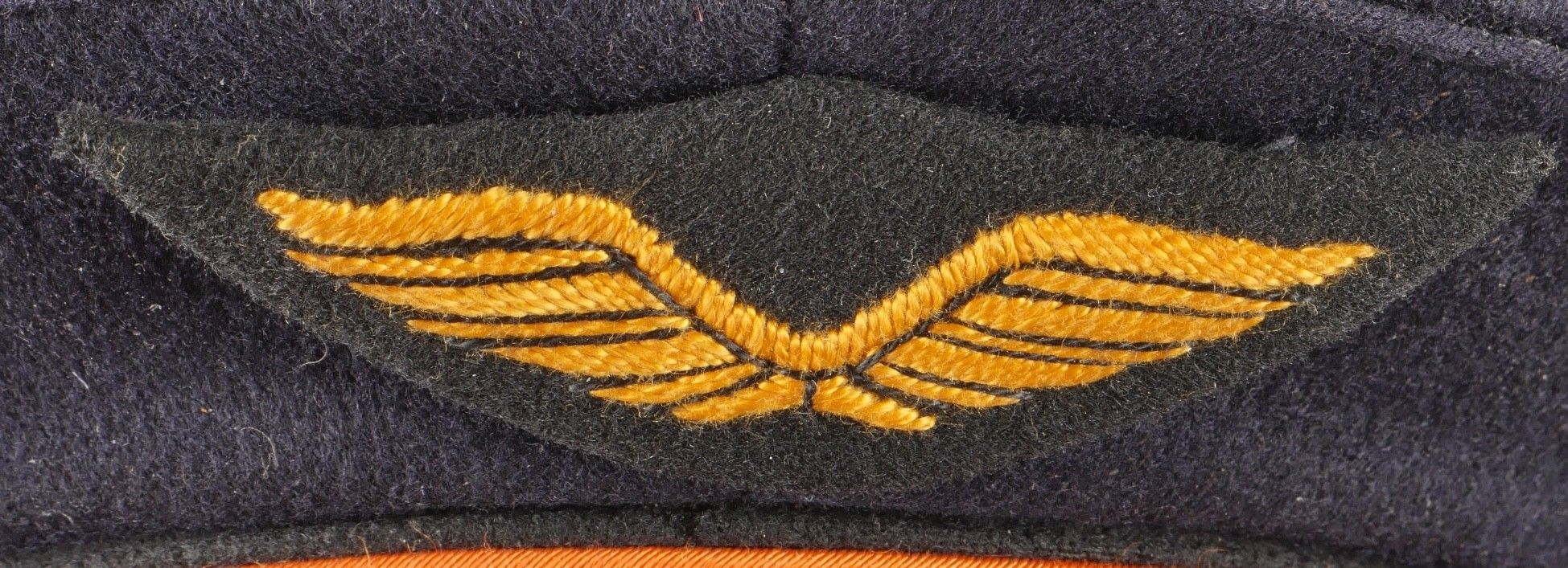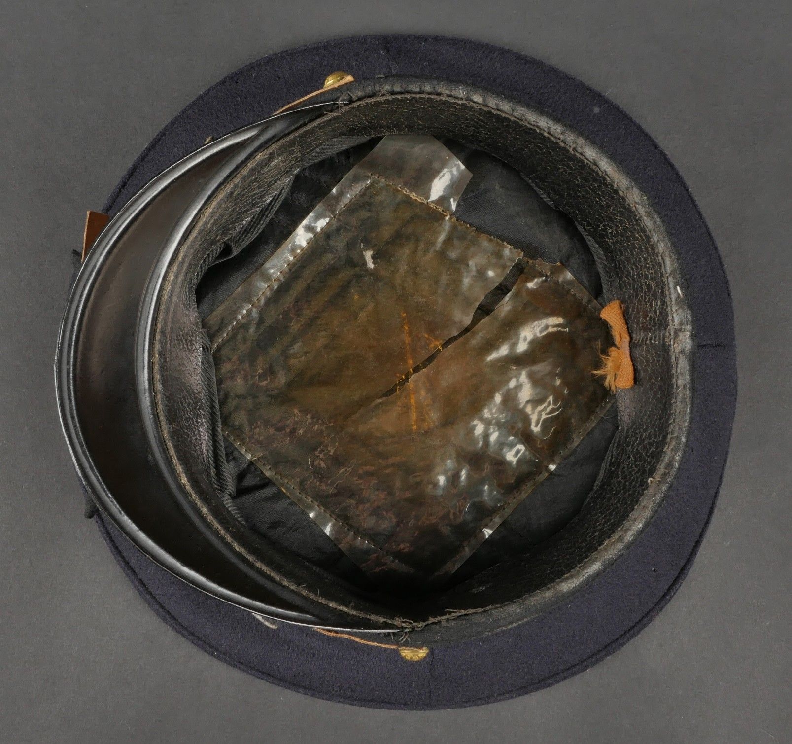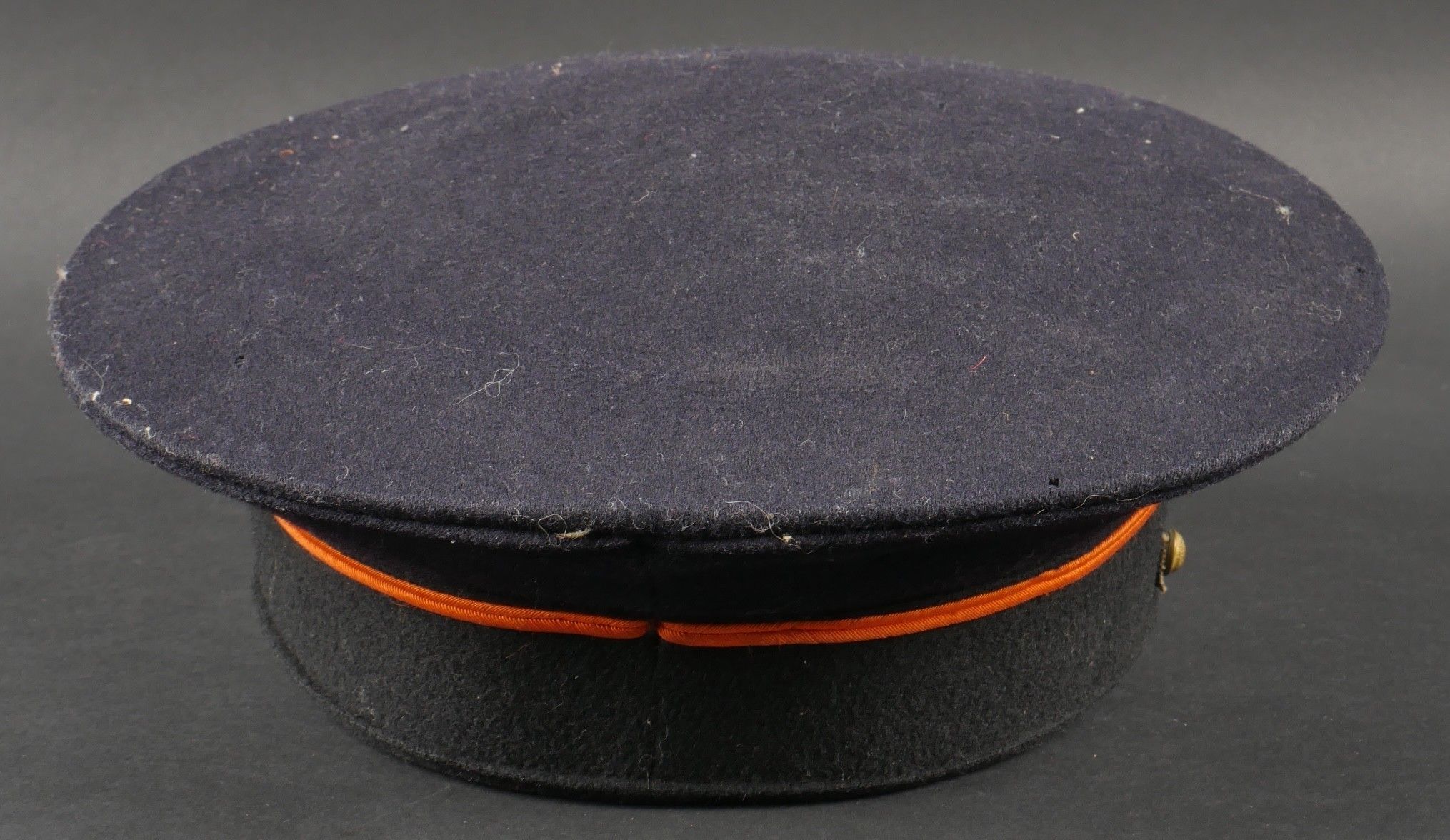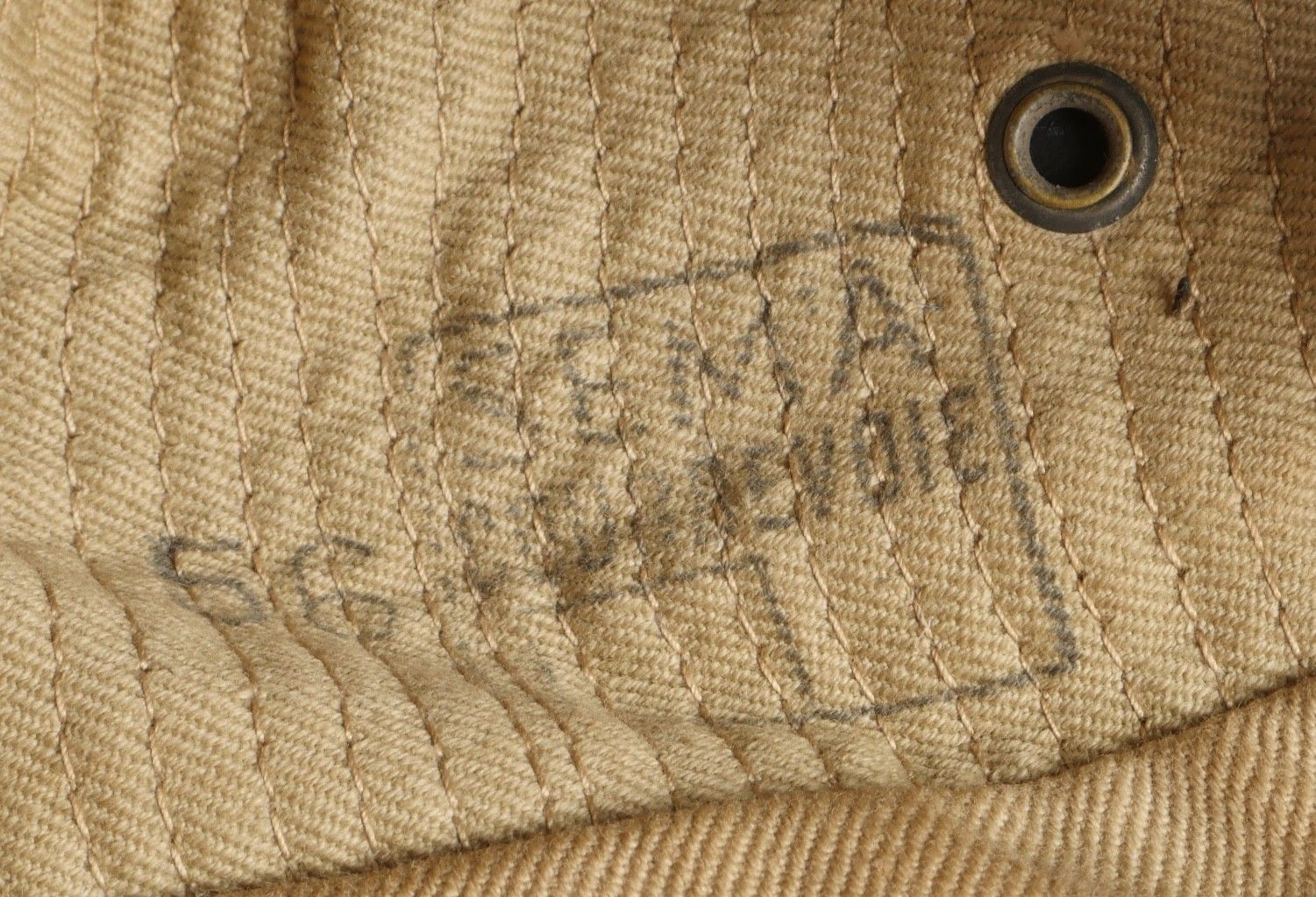 Set comprising an Armée de l'Air model 35 cap. Made of blue woollen cloth, orange piping, small buttons decorated with the insignia of the Armée de l'Air holding a false chinstrap. Fabric front insignia, with Troop-type wings. Composite visor, black leather headband, label on the back of the cap from a tailor in Albi. Also included is a regulation Métropole bush hat, beige canvas, paint pressure, SEMA manufacturer's stamp and size 56. Set including Air Force cap model 35 blue wool with orange piping small buttons bearing Air Force insignia holding false chinstrap cloth badge with wings troop type composite visor black leather sweatband label from tailor in Albi. With it a regulation metropolitan bush hat beige canvas painted snap SEMA maker size 56.