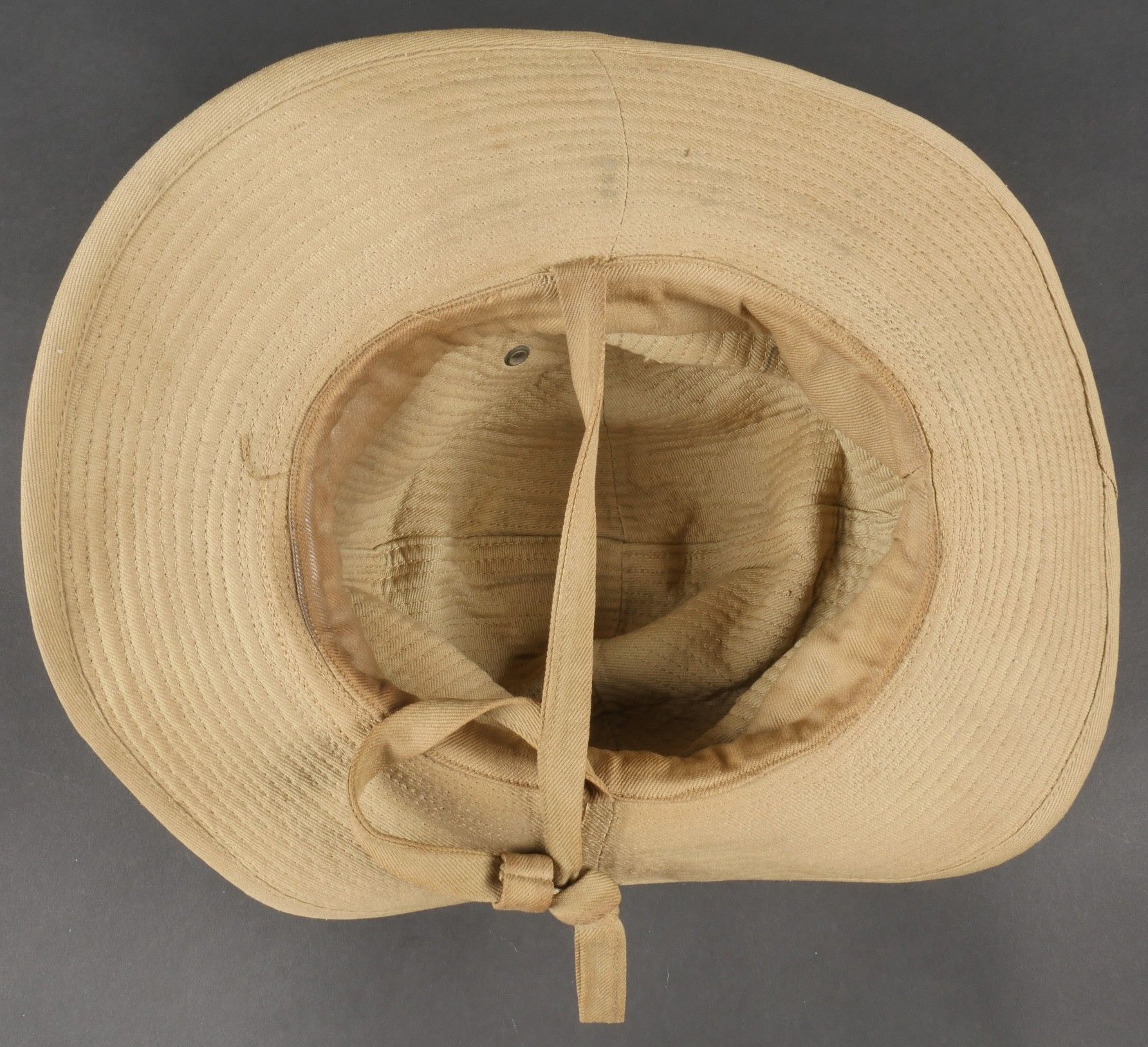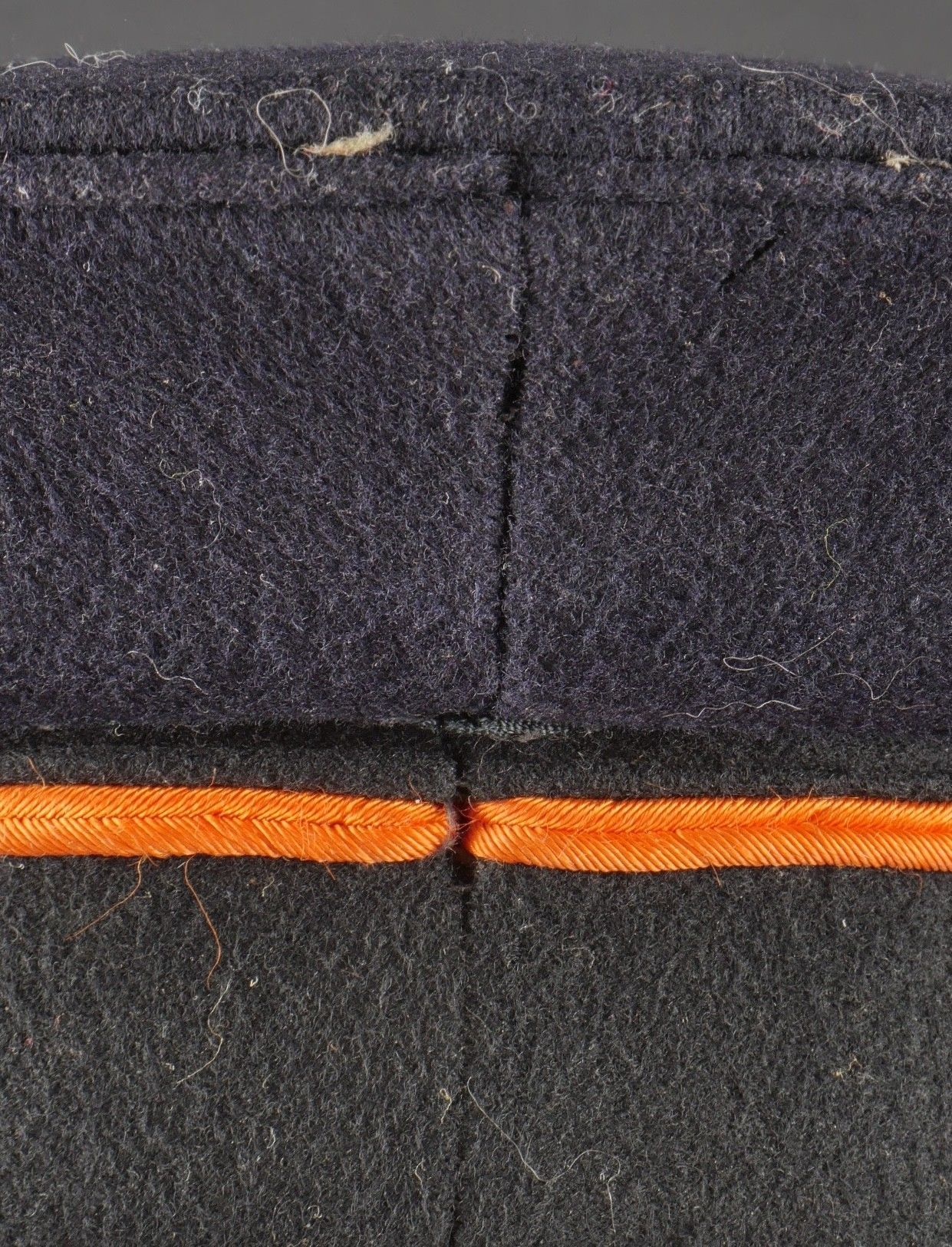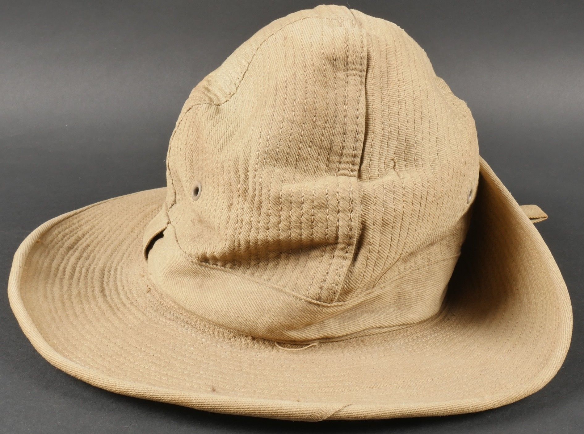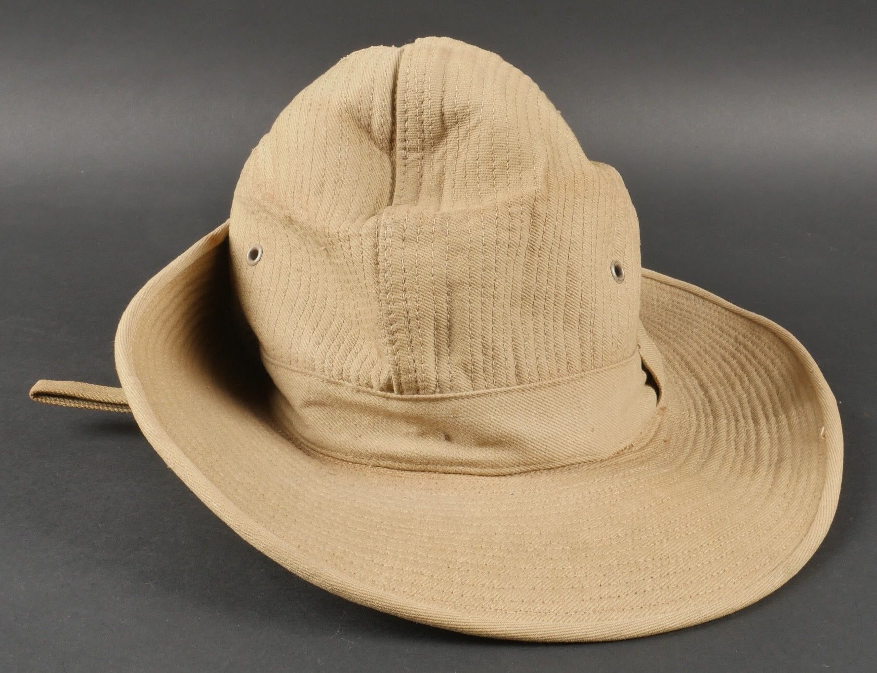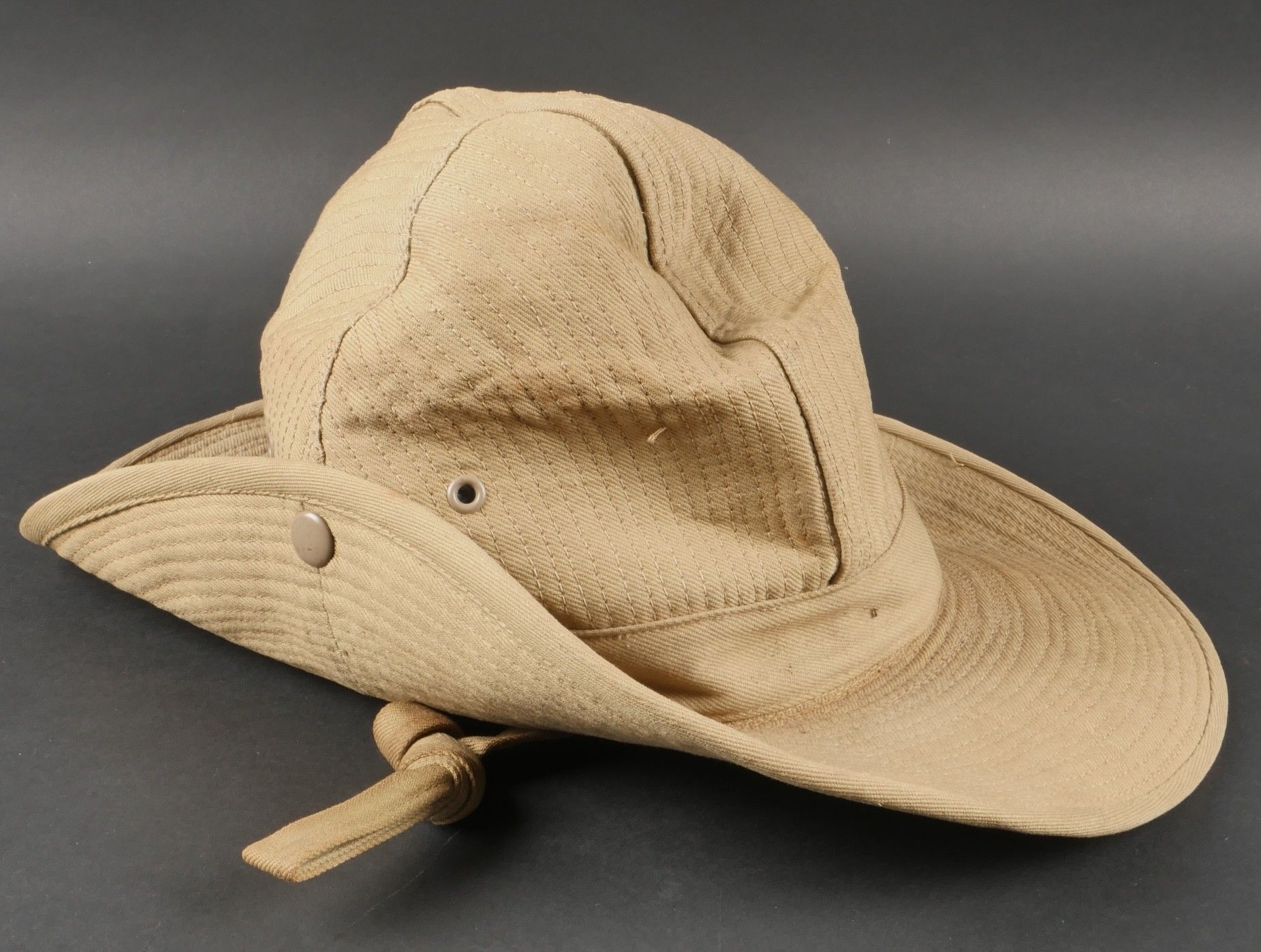 Set comprising an Armée de l'Air model 35 cap. Made of blue woollen cloth, orange piping, small buttons decorated with the insignia of the Armée de l'Air holding a false chinstrap. Fabric front insignia, with Troop-type wings. Composite visor, black leather headband, label on the back of the cap from a tailor in Albi. Also included is a regulation Métropole bush hat, beige canvas, paint pressure, SEMA manufacturer's stamp and size 56. Set including Air Force cap model 35 blue wool with orange piping small buttons bearing Air Force insignia holding false chinstrap cloth badge with wings troop type composite visor black leather sweatband label from tailor in Albi. With it a regulation metropolitan bush hat beige canvas painted snap SEMA maker size 56.