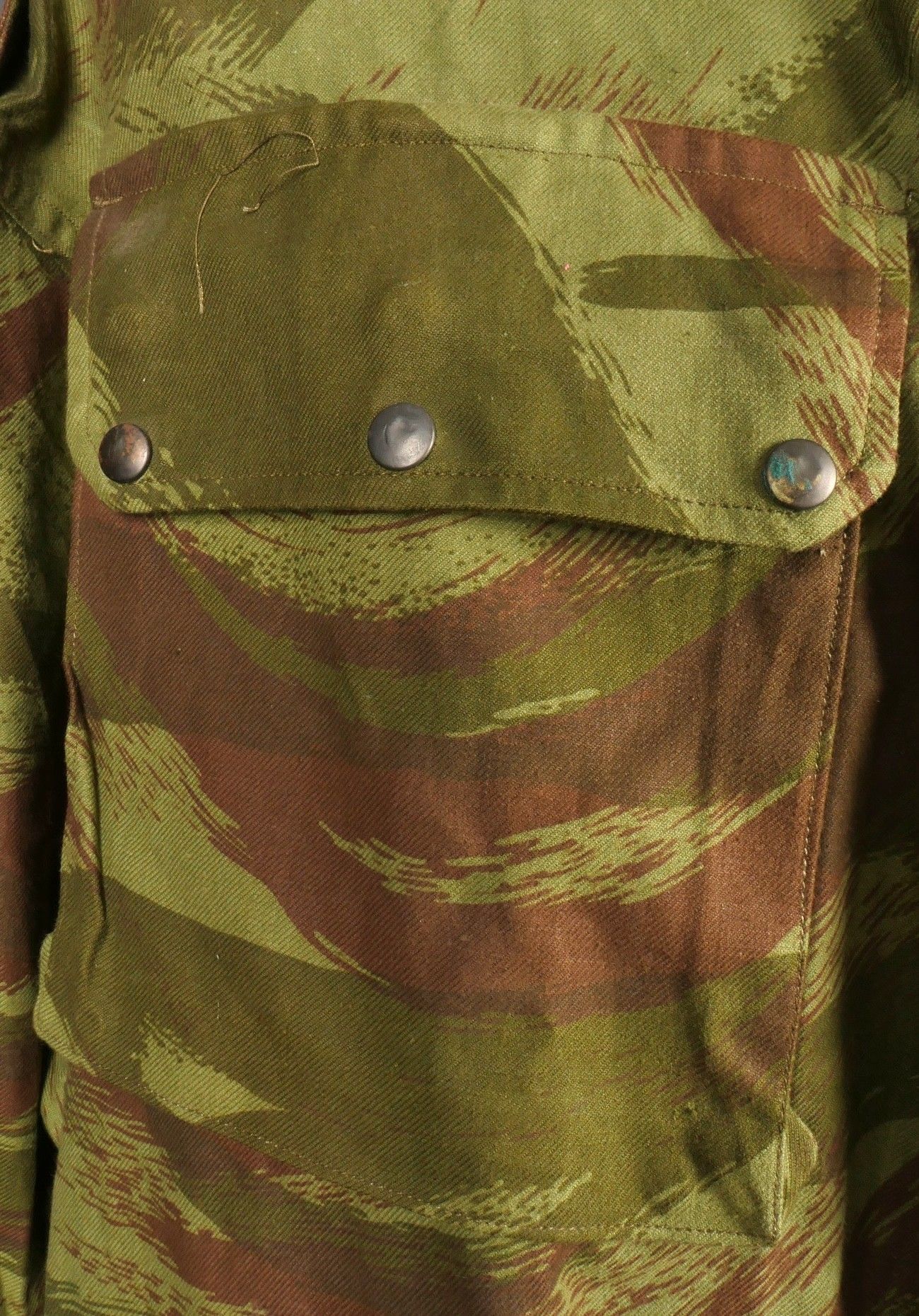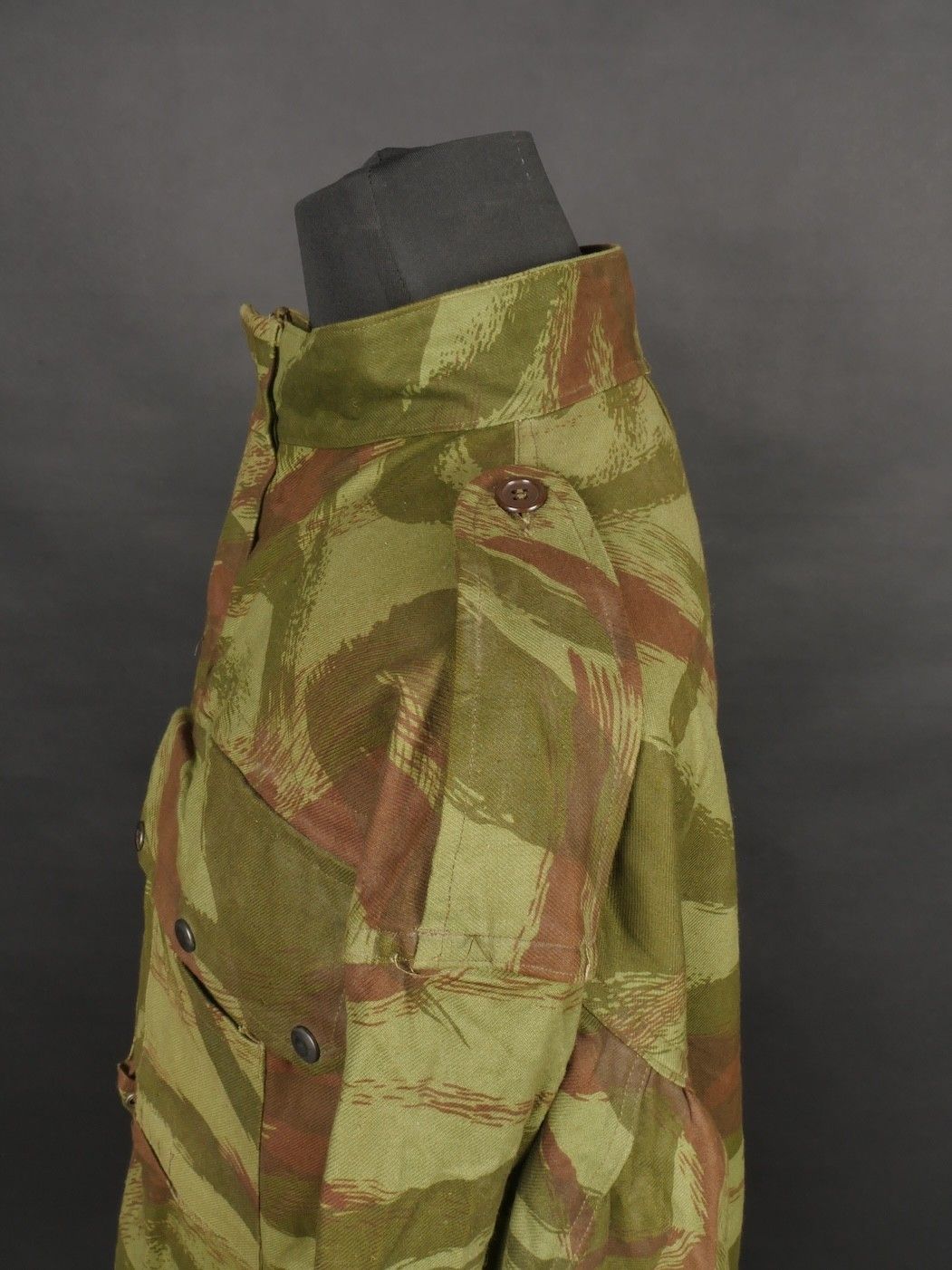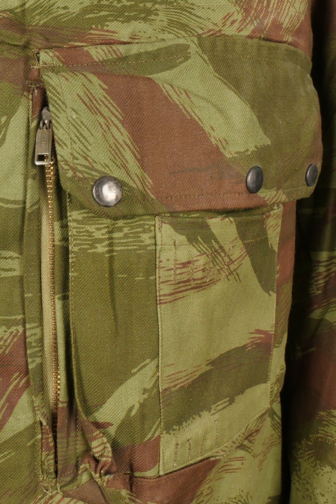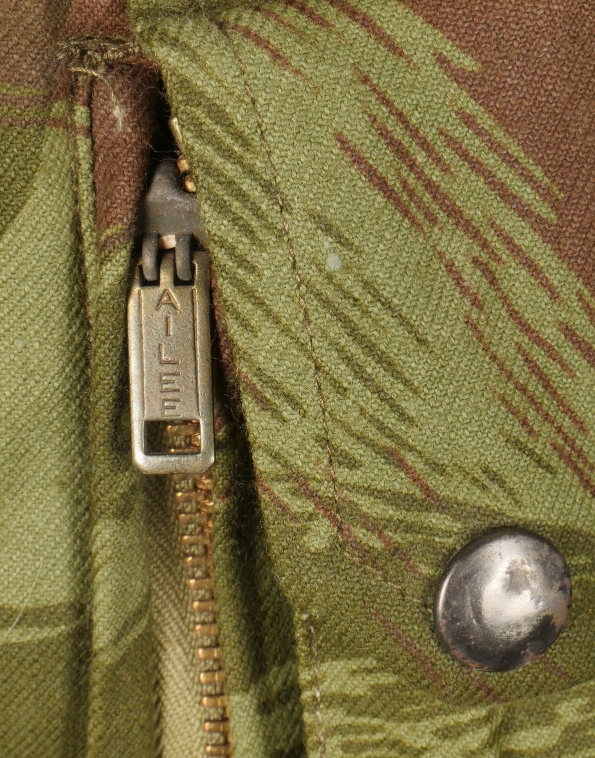 TAP 4753 jacket. Jacket made from camouflaged cotton and fastened with eight buttons and an Ailee zip. Manufacturer's mark on collar Chaumont Paris, size 29. Original stitched beavertail. TAP 4753 jacket cotton camouflage closing with eight buttons and functional Ailee zipper maker Chaumont Paris size 29 beavertail original.