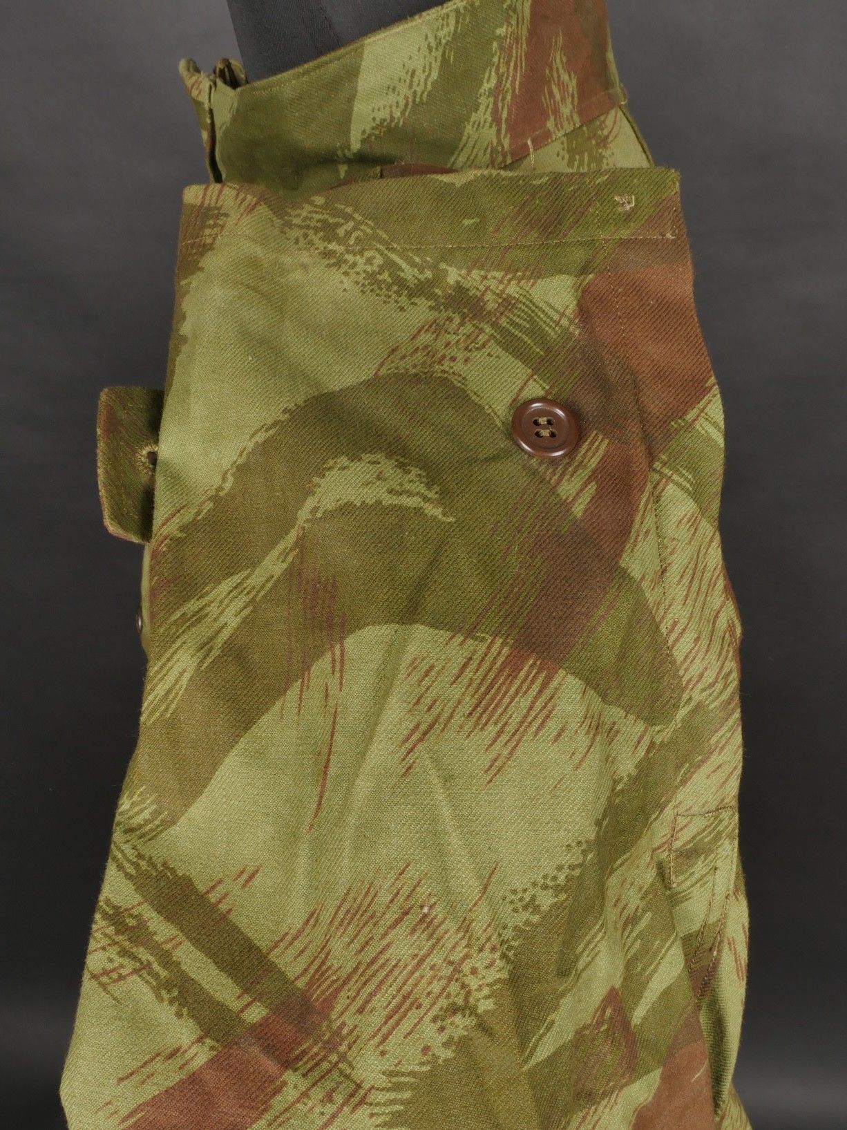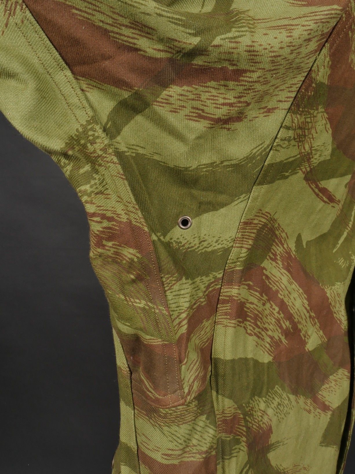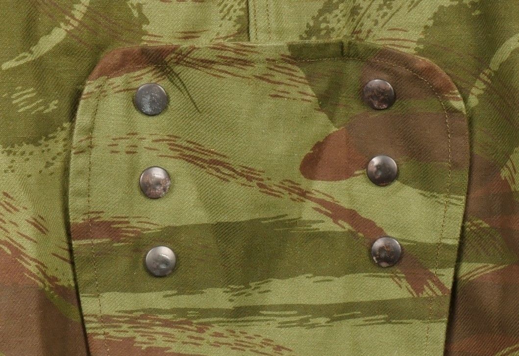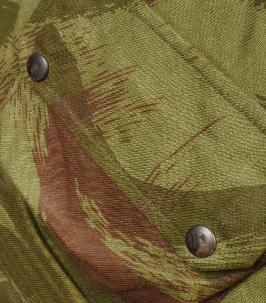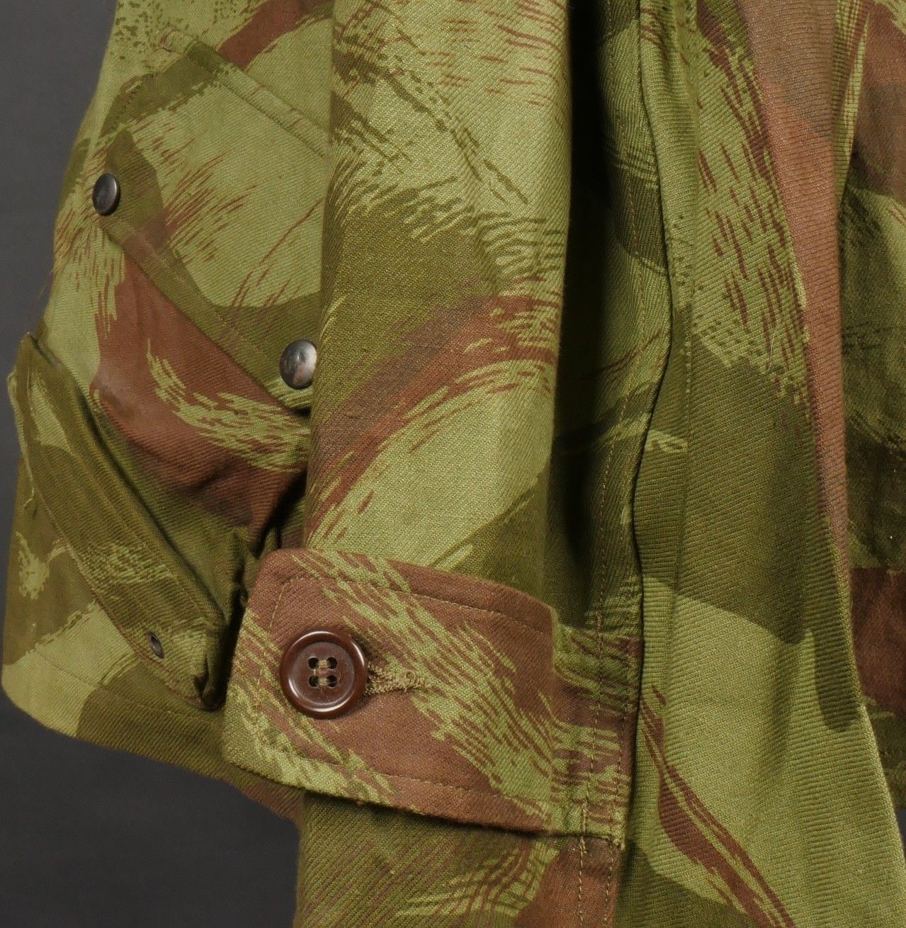 TAP 4753 jacket. Jacket made from camouflaged cotton and fastened with eight buttons and an Ailee zip. Manufacturer's mark on collar Chaumont Paris, size 29. Original stitched beavertail. TAP 4753 jacket cotton camouflage closing with eight buttons and functional Ailee zipper maker Chaumont Paris size 29 beavertail original.
