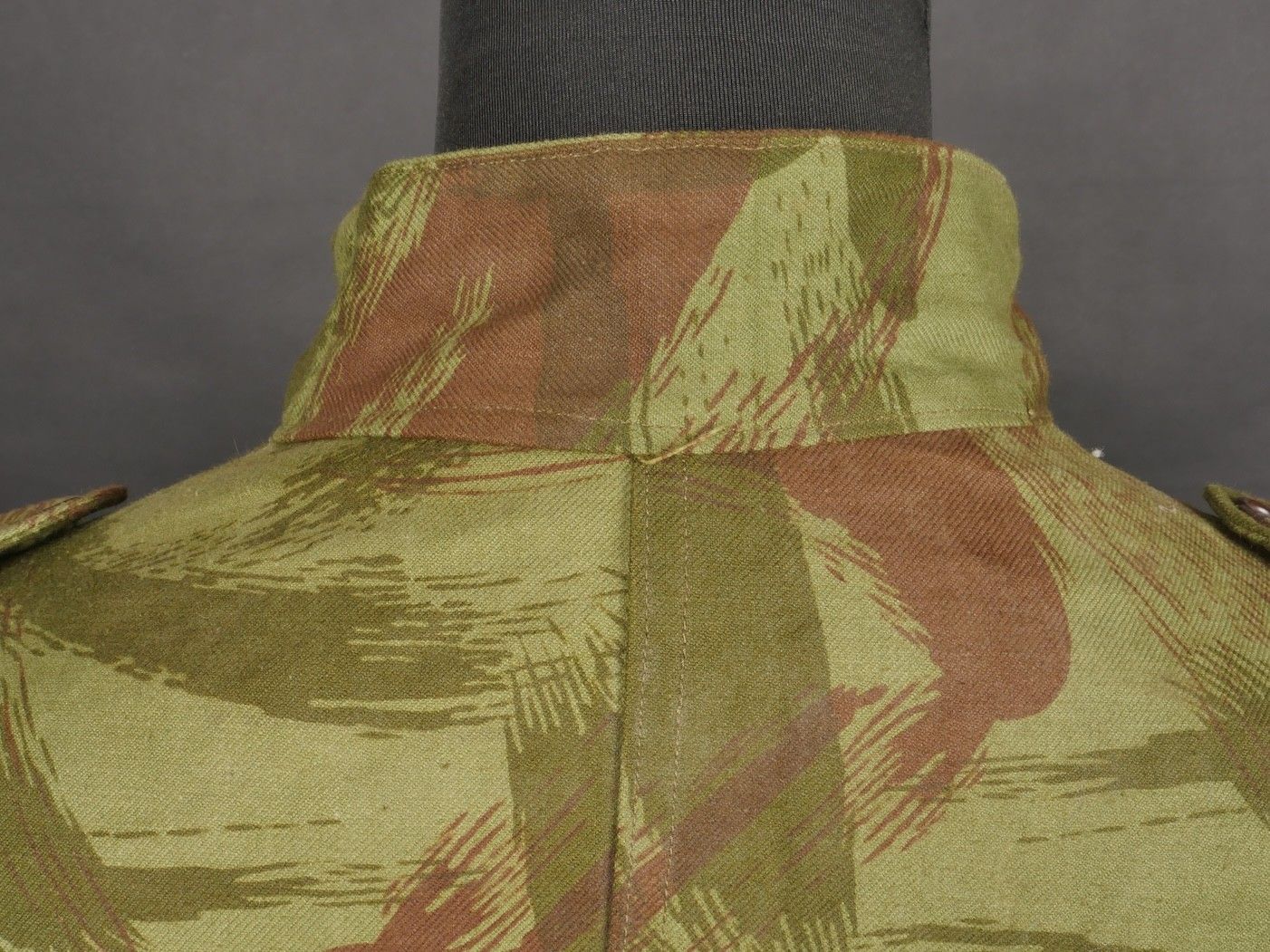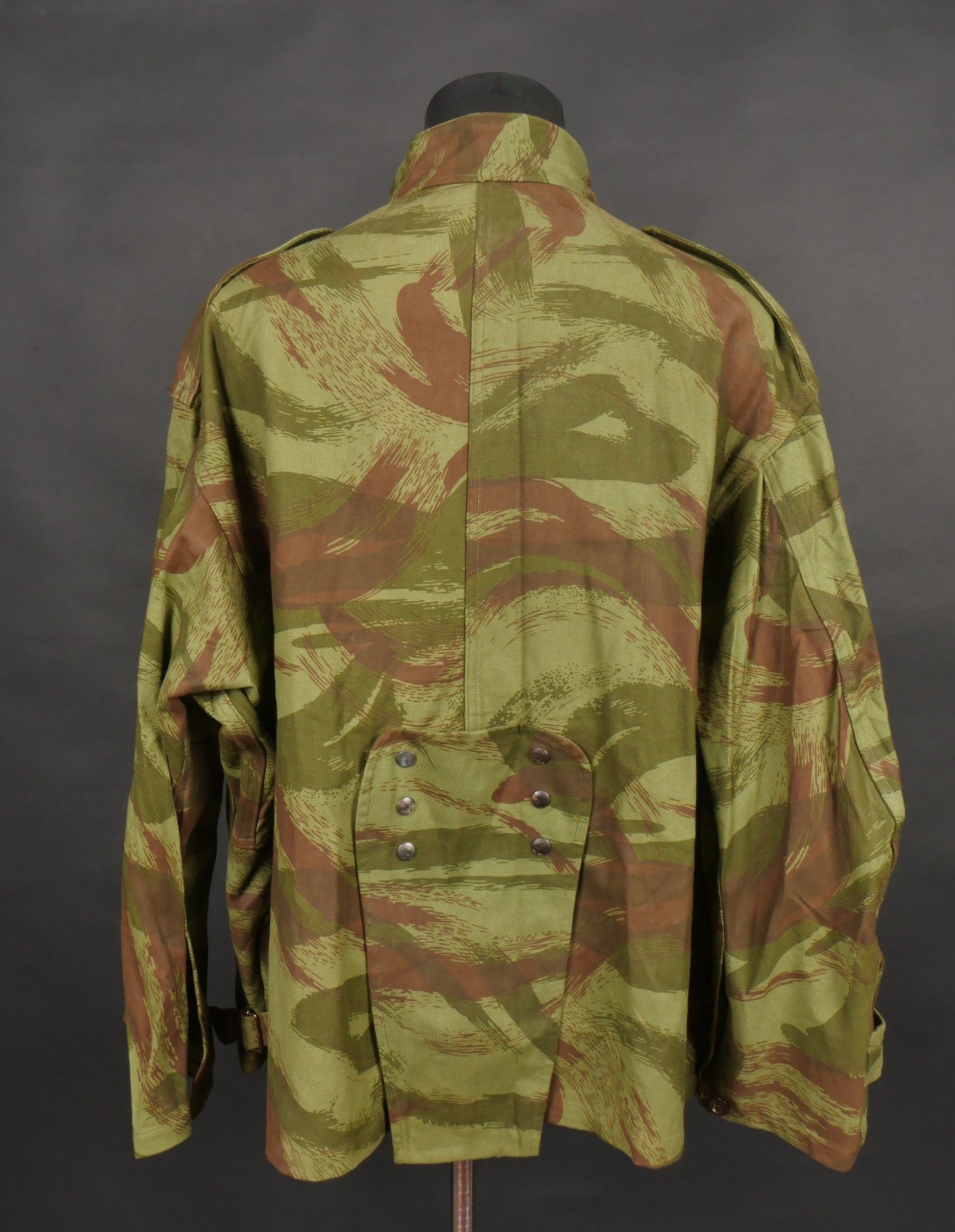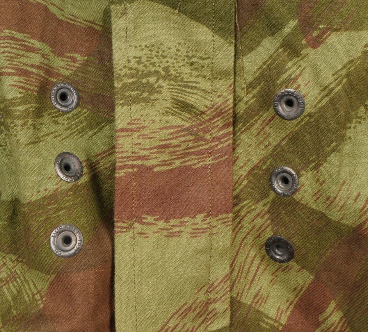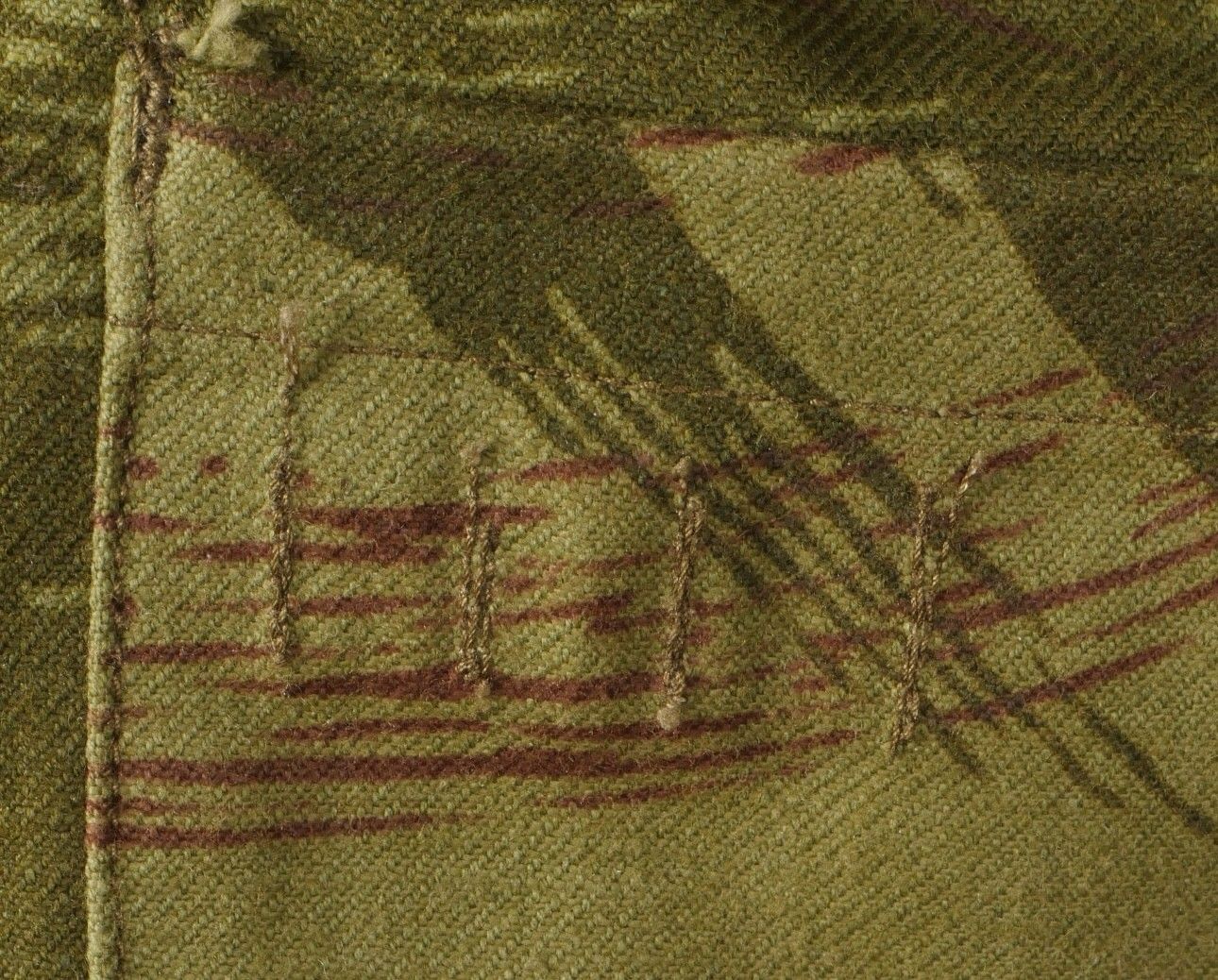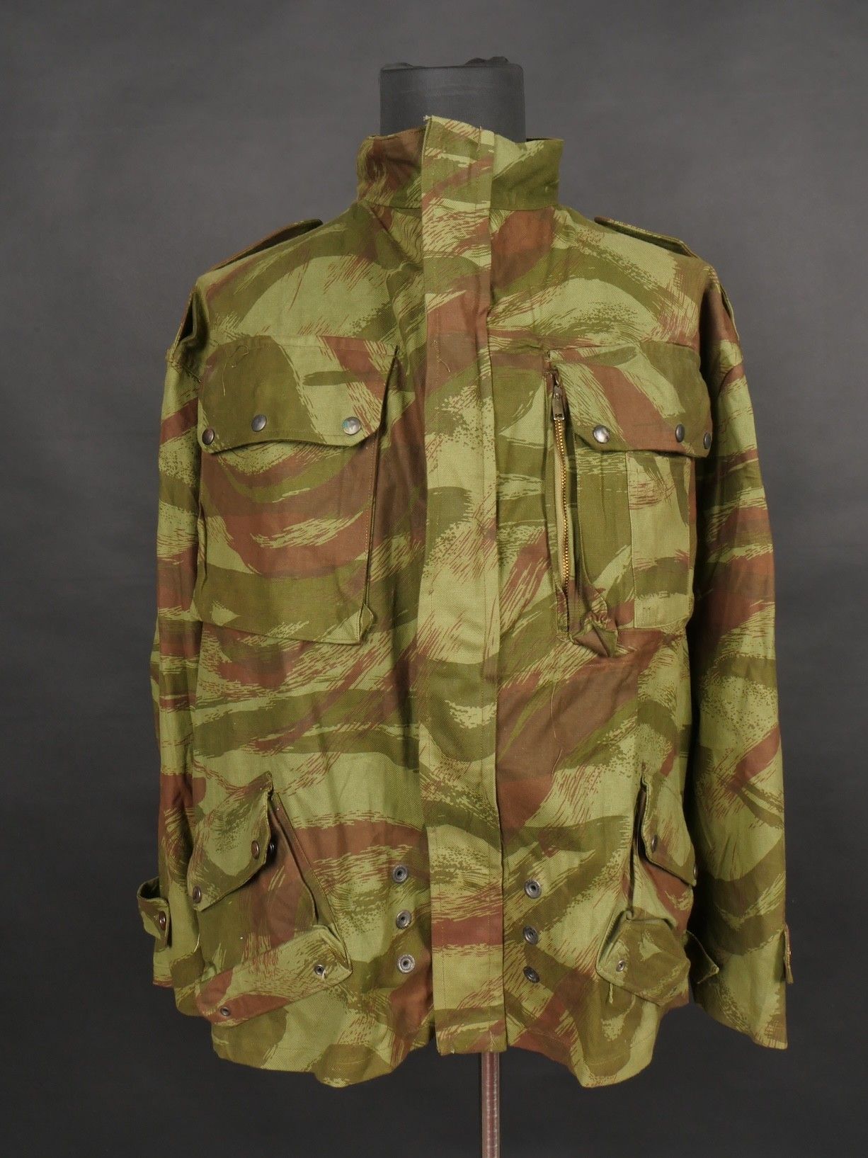 TAP 4753 jacket. Jacket made from camouflaged cotton and fastened with eight buttons and an Ailee zip. Manufacturer's mark on collar Chaumont Paris, size 29. Original stitched beavertail. TAP 4753 jacket cotton camouflage closing with eight buttons and functional Ailee zipper maker Chaumont Paris size 29 beavertail original.