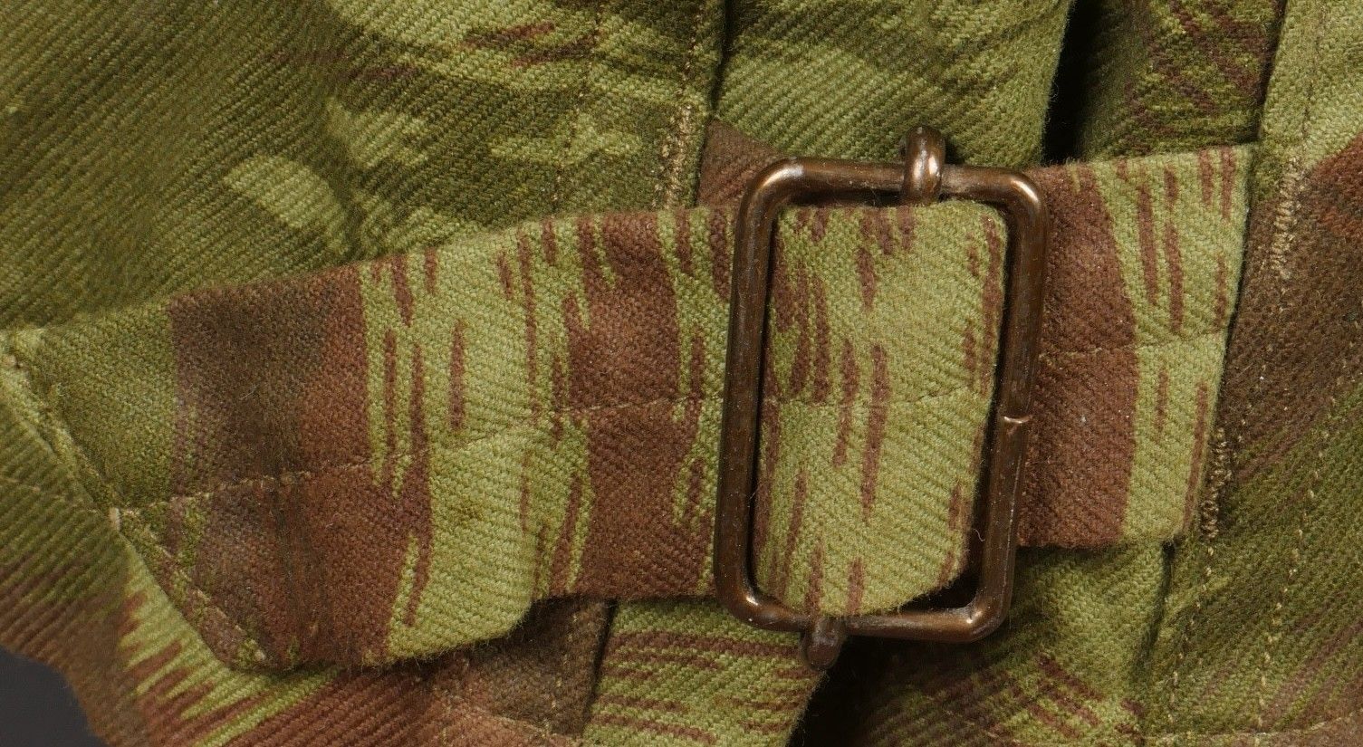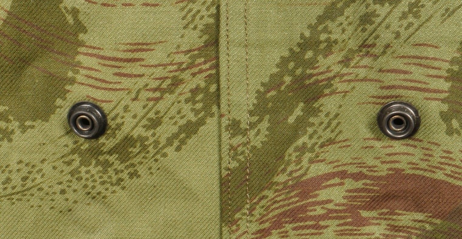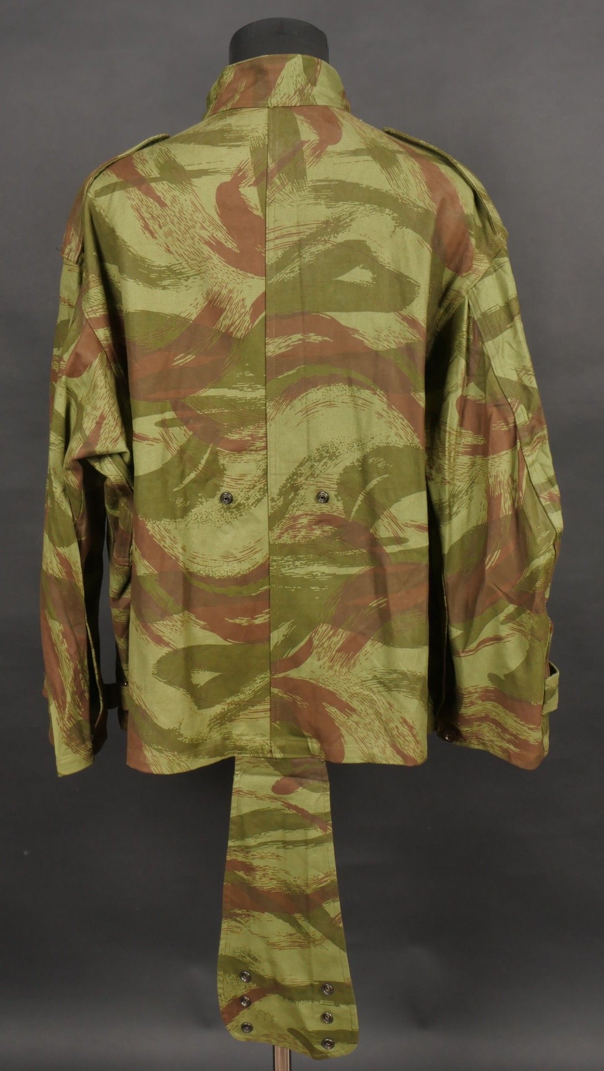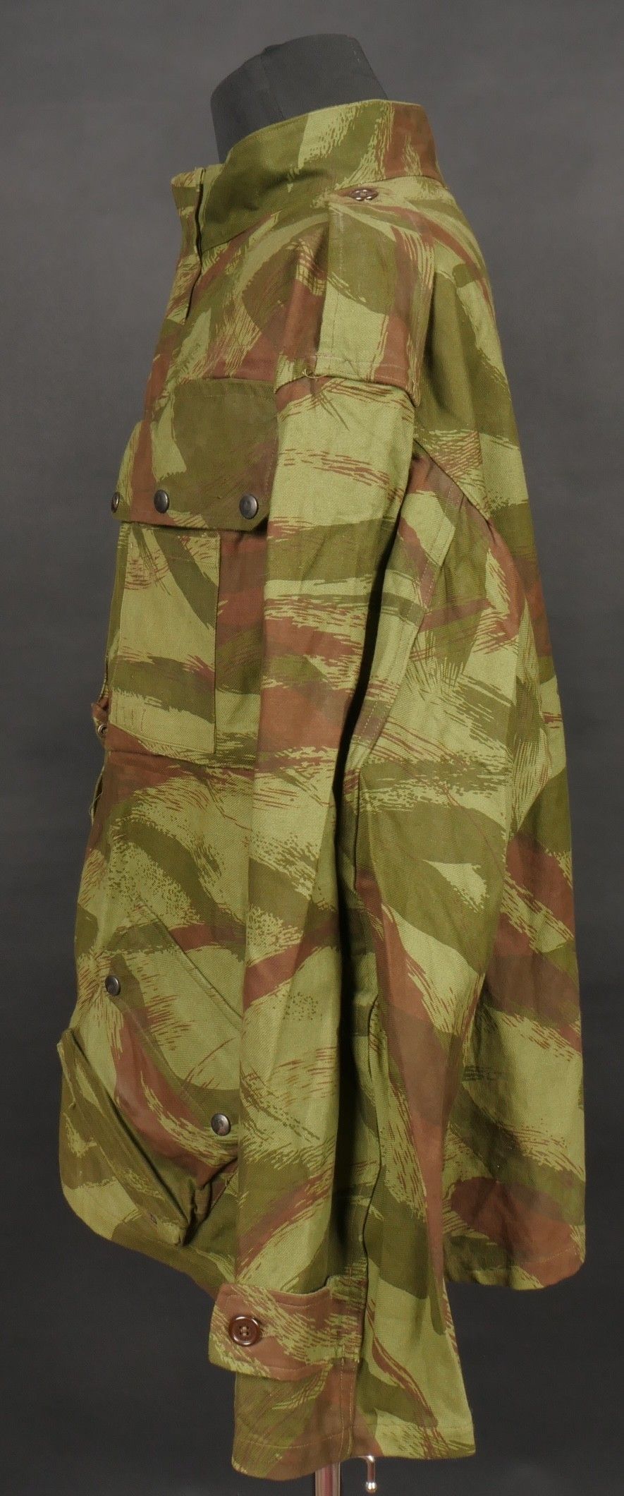 TAP 4753 jacket. Jacket made from camouflaged cotton and fastened with eight buttons and an Ailee zip. Manufacturer's mark on collar Chaumont Paris, size 29. Original stitched beavertail. TAP 4753 jacket cotton camouflage closing with eight buttons and functional Ailee zipper maker Chaumont Paris size 29 beavertail original.