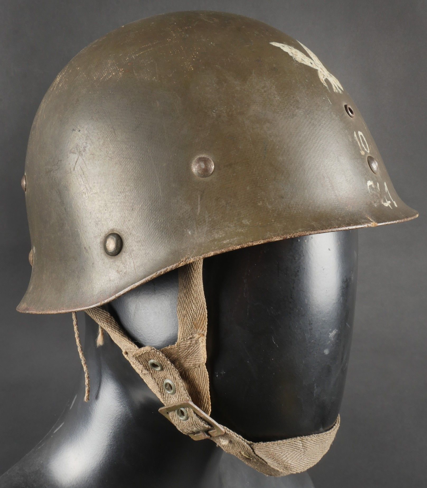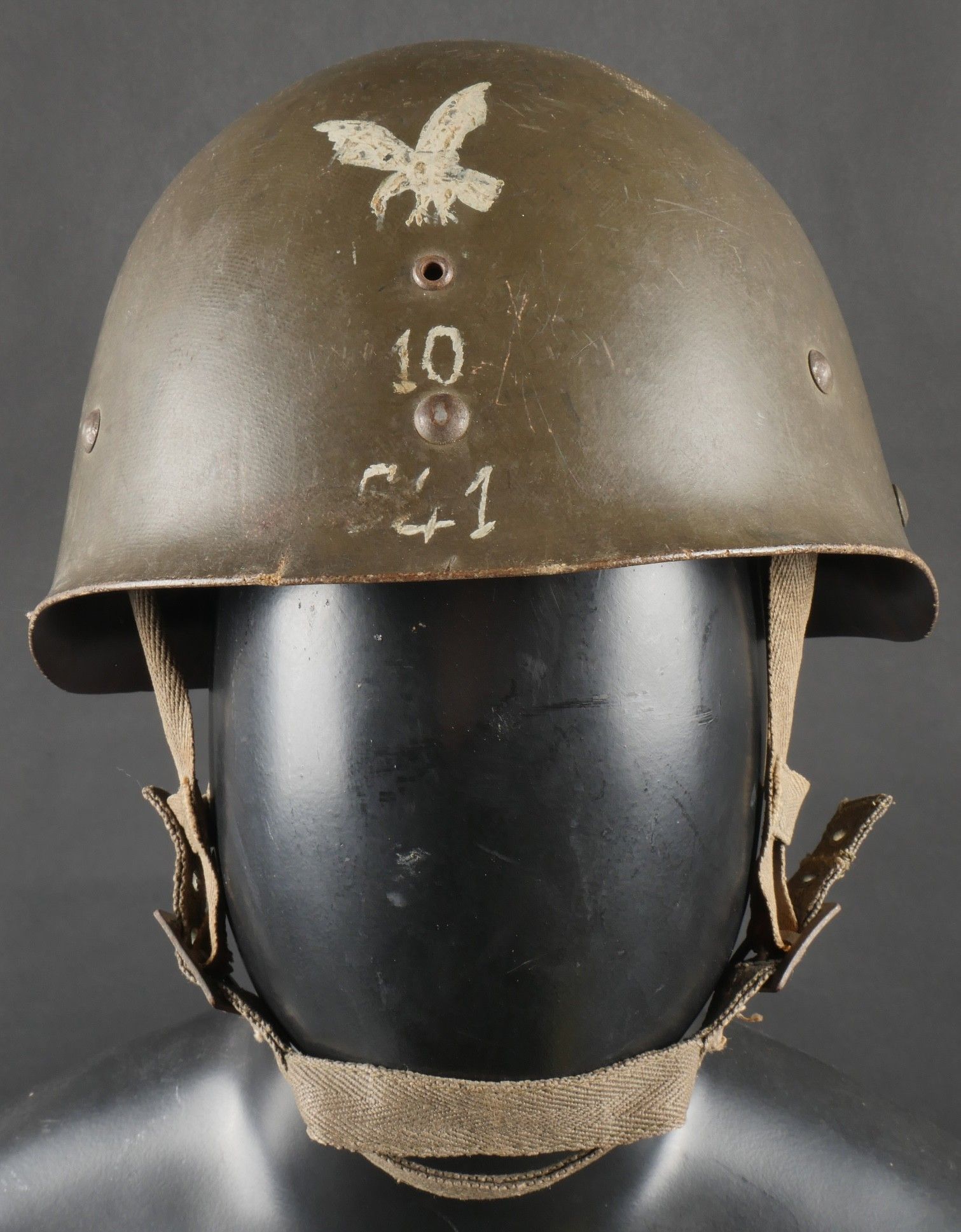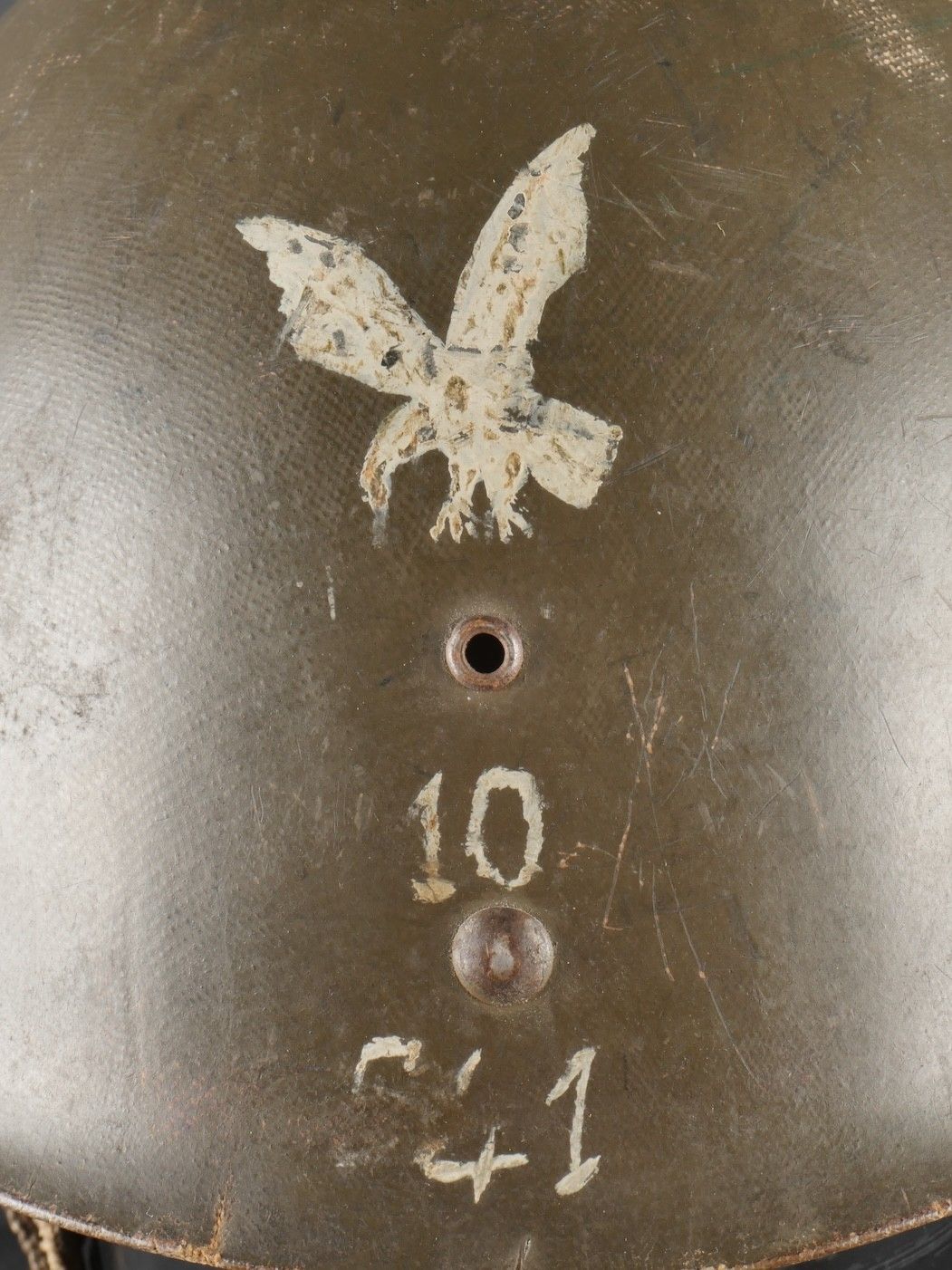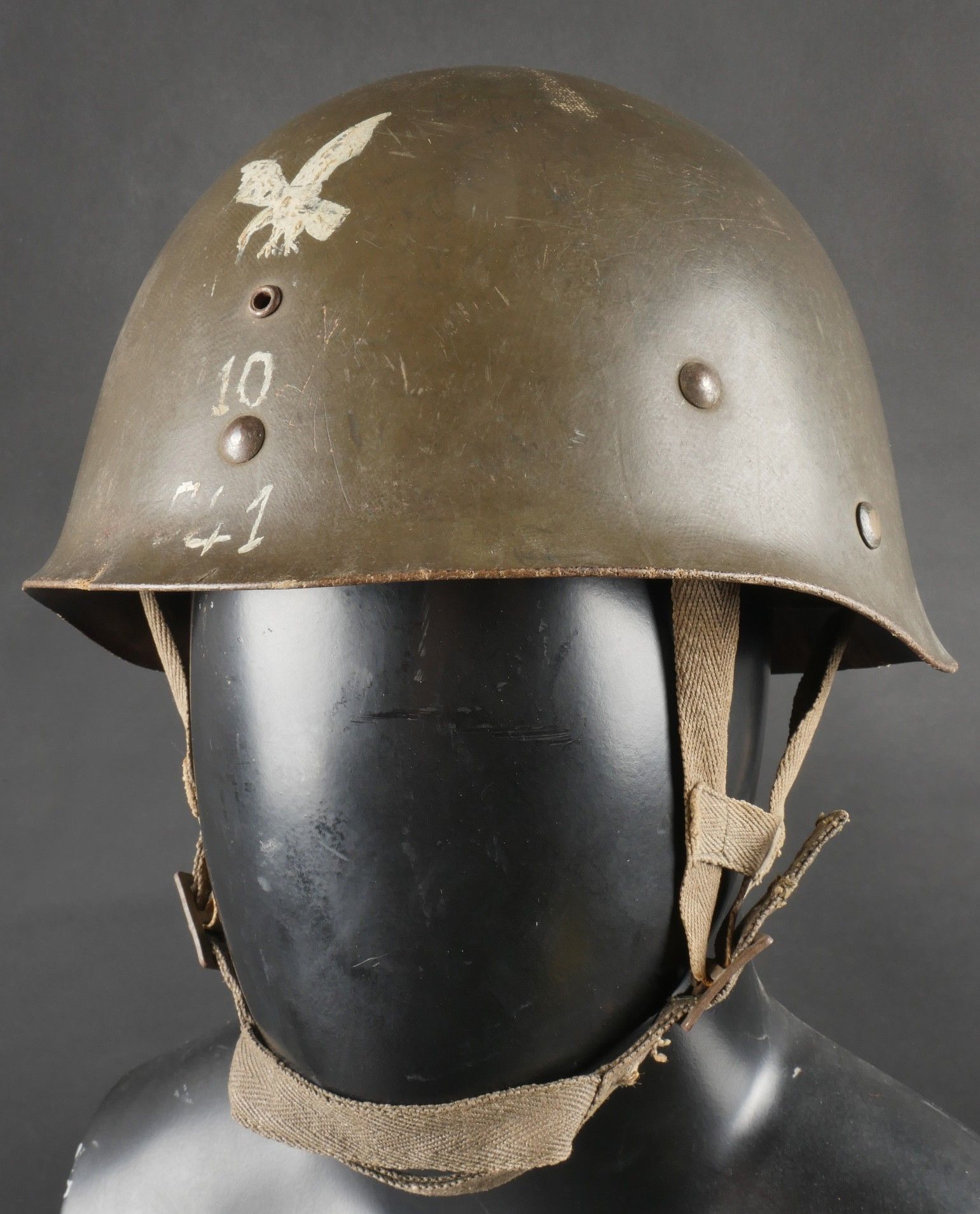 Nice under helmet model TAP 1951, 2nd type with a white eagle on the front over the number 10 Commando Parachutiste de l'Air 10 . Under helmet made of vulcanised celoron fibre by FD and dated 1954. Second type neck protector, sewn in, with a small repair. Adjustment buckle in khaki paint. Leather headband present but two staples missing. Chin strap in khaki canvas specific to the TAP model. An unusual item. This helmet can be seen in the book Paras Français Algérie 1954 1962, page 154. Fine TAP 1951 liner second type bearing at front a white eagle above number 10 Commando Parachutiste de l'Air 10 made of vulcanized fiber by FD dated 1954. Secondtype neckband with small period repair adjustment buckle khaki paint leather sweatband with two clips missing khaki web chinstrap specific to TAP model rare piece referenced in Paras Français Algérie 1954-1962 page 154.