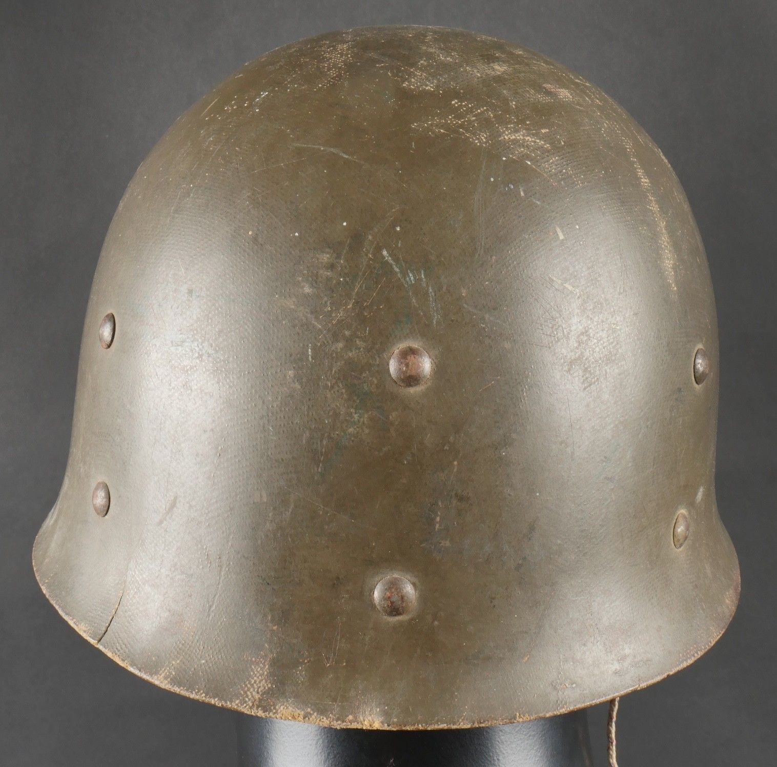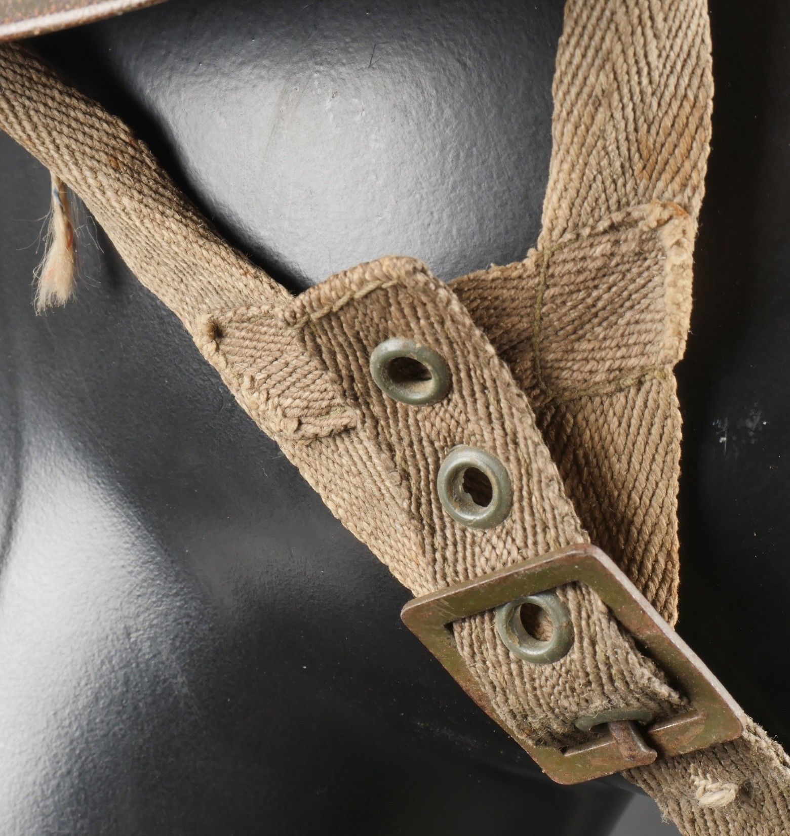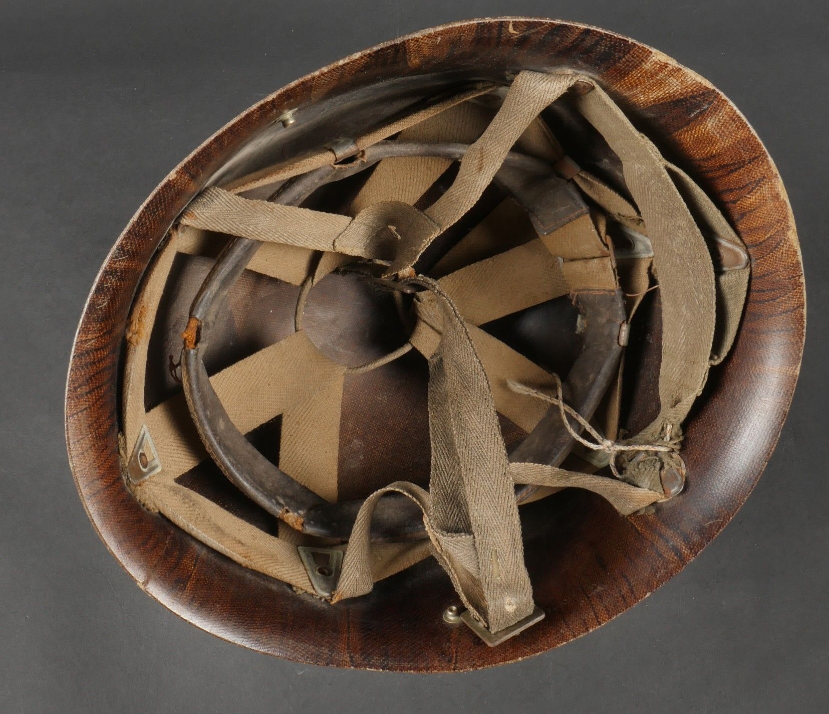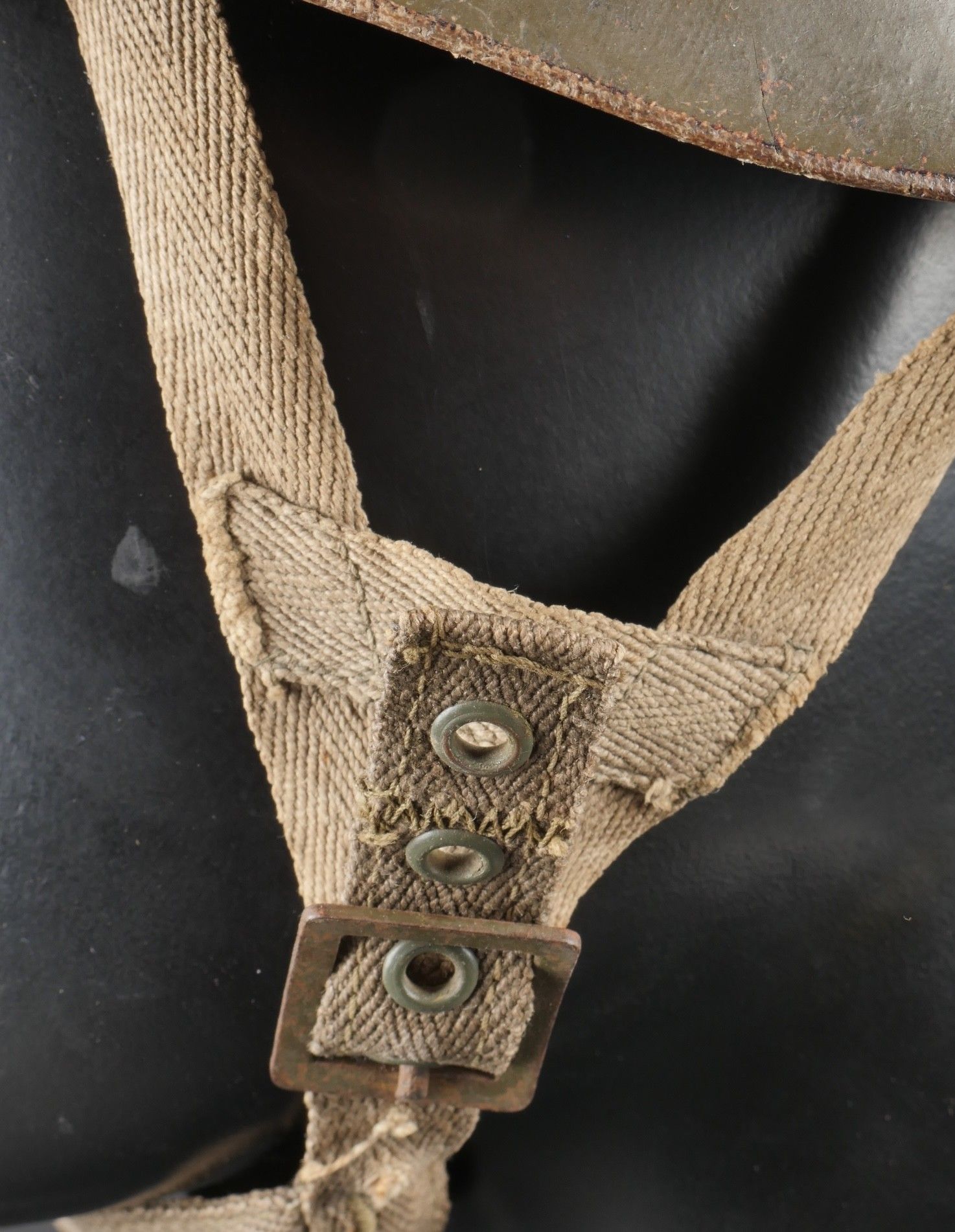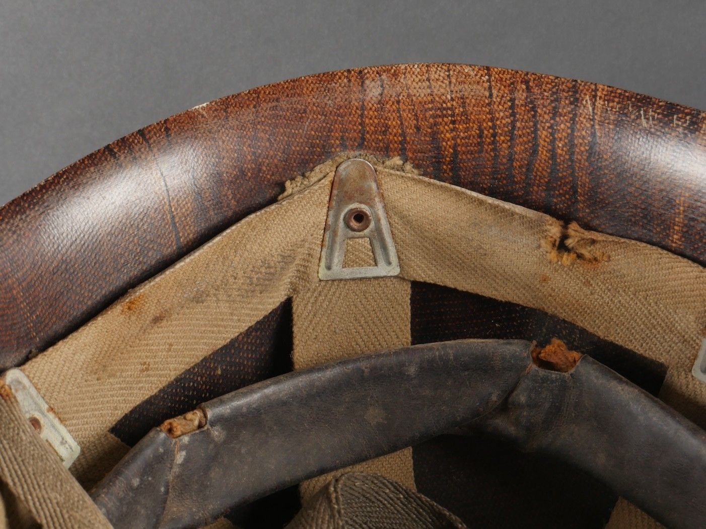 Nice under helmet model TAP 1951, 2nd type with a white eagle on the front over the number 10 Commando Parachutiste de l'Air 10 . Under helmet made of vulcanised celoron fibre by FD and dated 1954. Second type neck protector, sewn in, with a small repair. Adjustment buckle in khaki paint. Leather headband present but two staples missing. Chin strap in khaki canvas specific to the TAP model. An unusual item. This helmet can be seen in the book Paras Français Algérie 1954 1962, page 154. Fine TAP 1951 liner second type bearing at front a white eagle above number 10 Commando Parachutiste de l'Air 10 made of vulcanized fiber by FD dated 1954. Secondtype neckband with small period repair adjustment buckle khaki paint leather sweatband with two clips missing khaki web chinstrap specific to TAP model rare piece referenced in Paras Français Algérie 1954-1962 page 154.